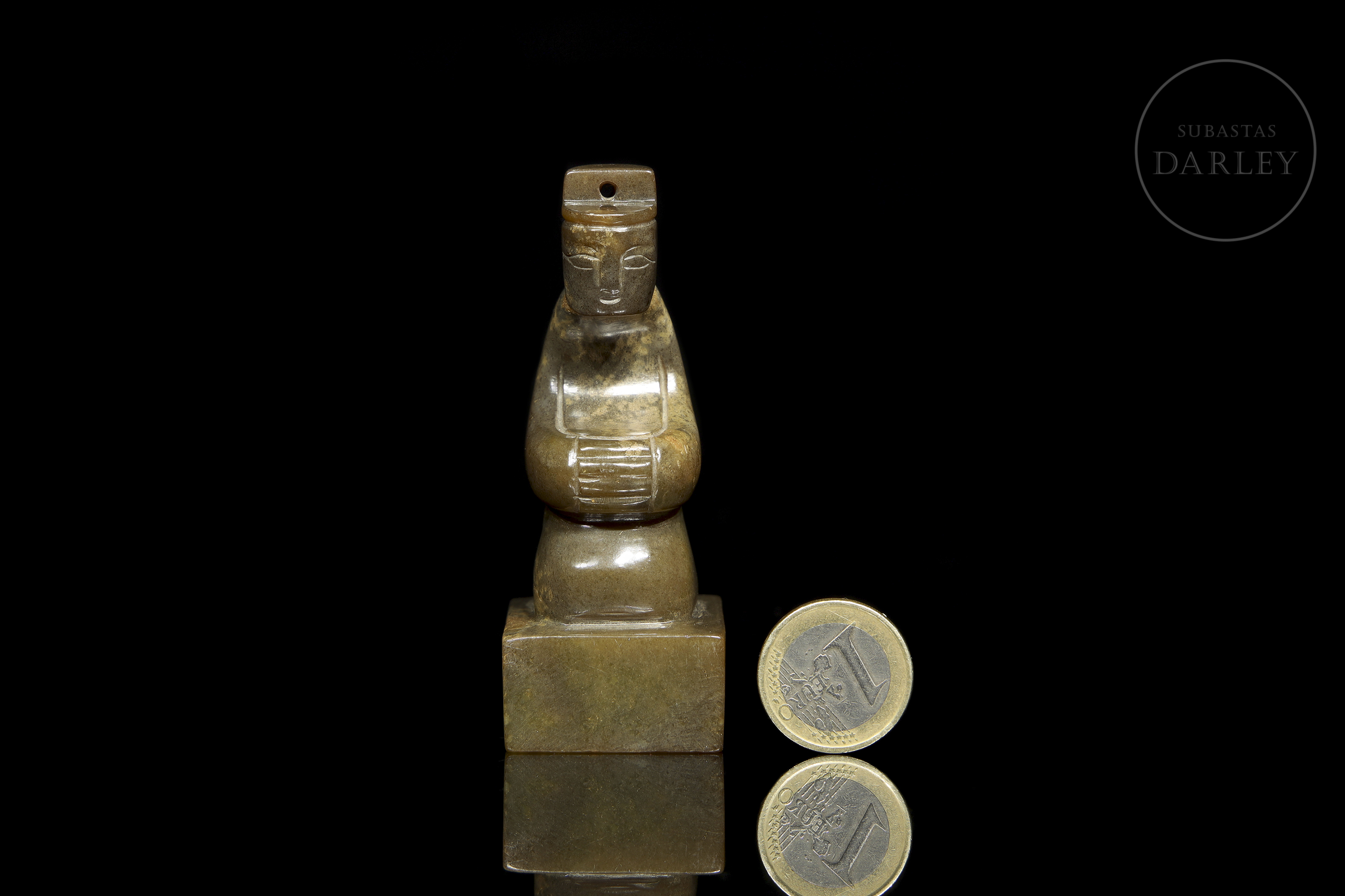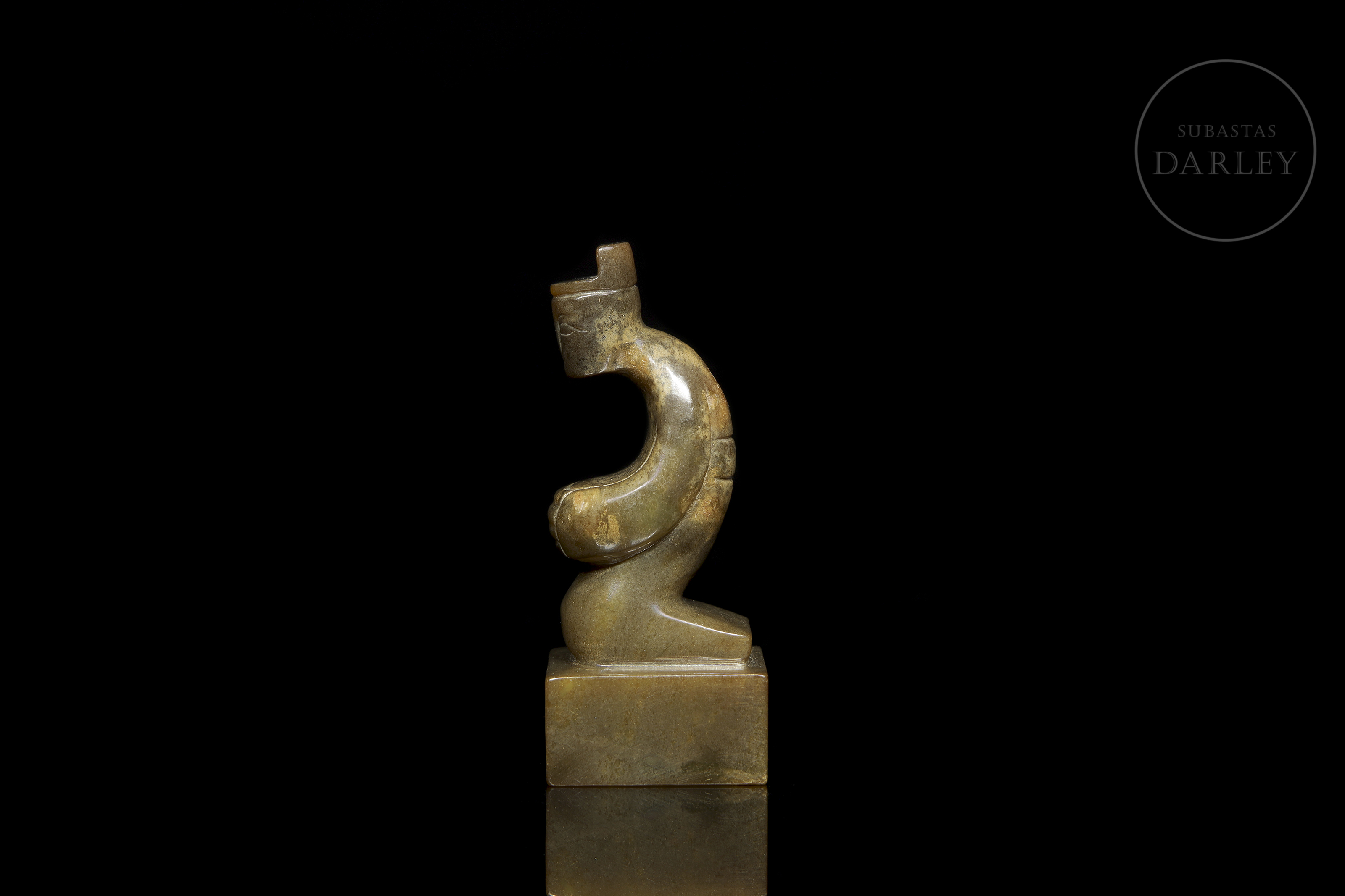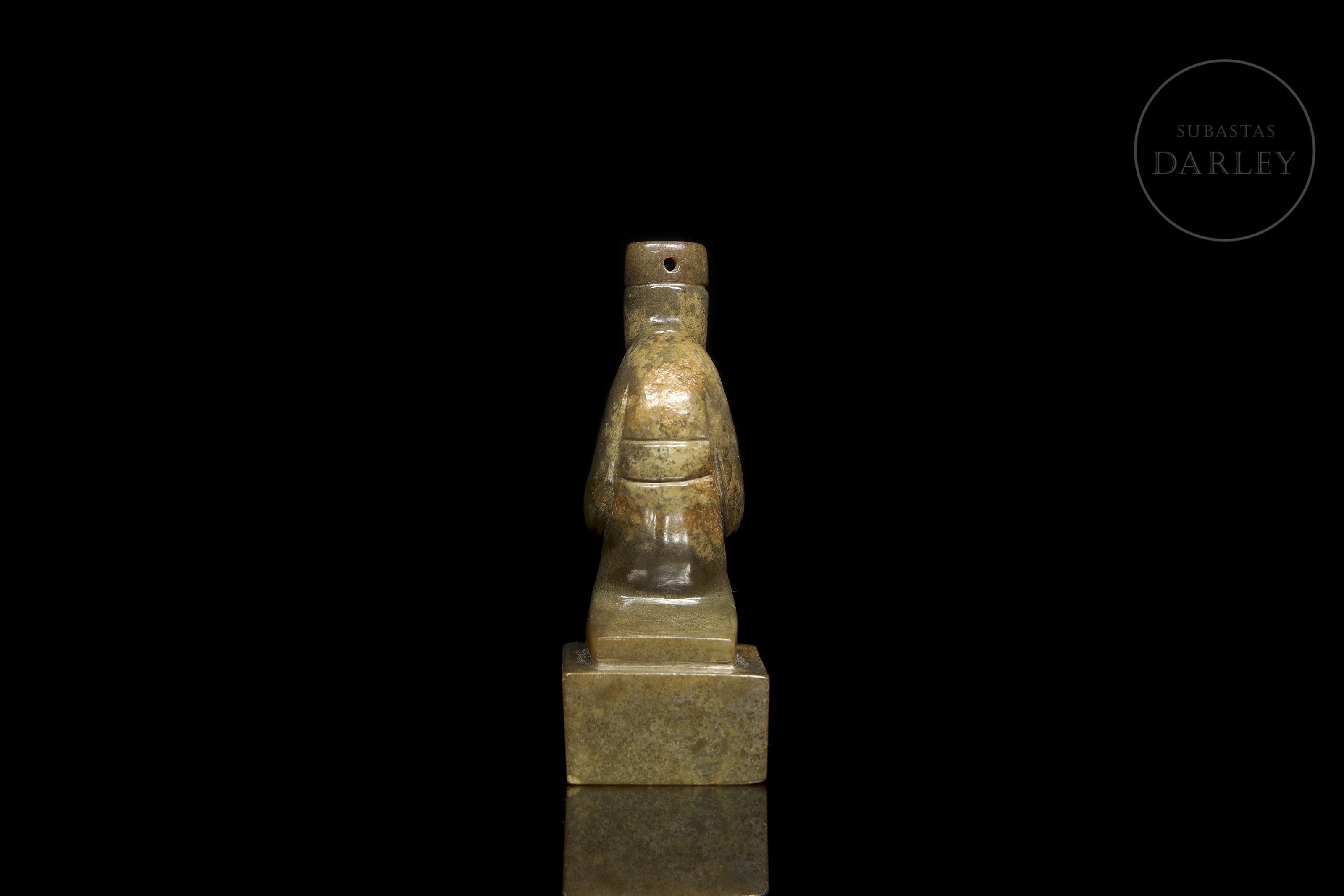 Jade tallado de una tonalidad verde amarillenta con pátina en tonos ocre y marrón. Muestra una figura de un dignatario en posición arrodillada sobre una base cuadrangular. Viste una túnica de largas mangas que ocultan sus manos, entrelazadas, dispuestas sobre el regazo y un tocado con una perforación. La expresión del rostro es serena y solemne. En la base se disponen caracteres incisos en bajo relieve. Dinastía Han (206 a.C. – 220 d.C.) o posterior.