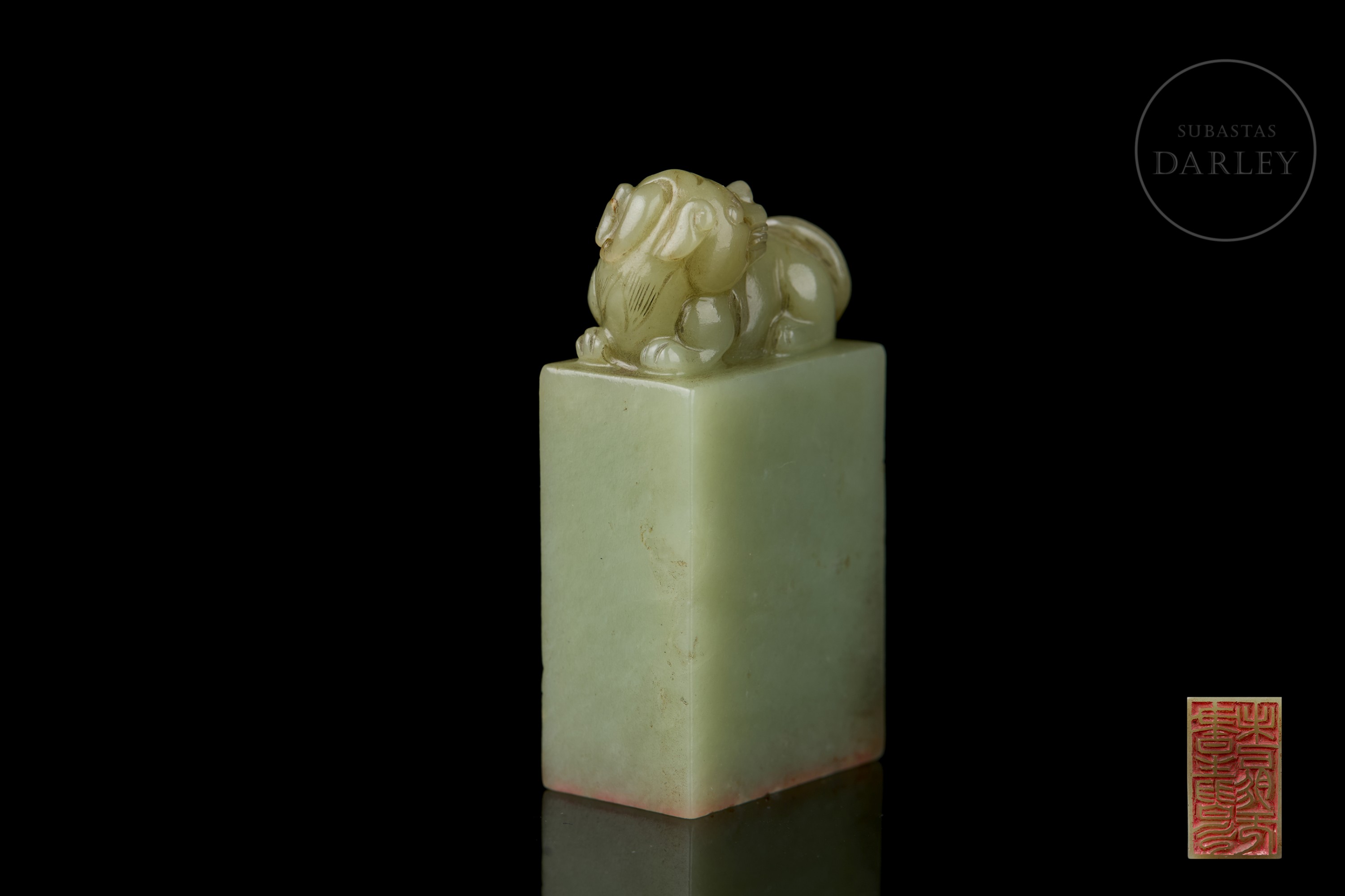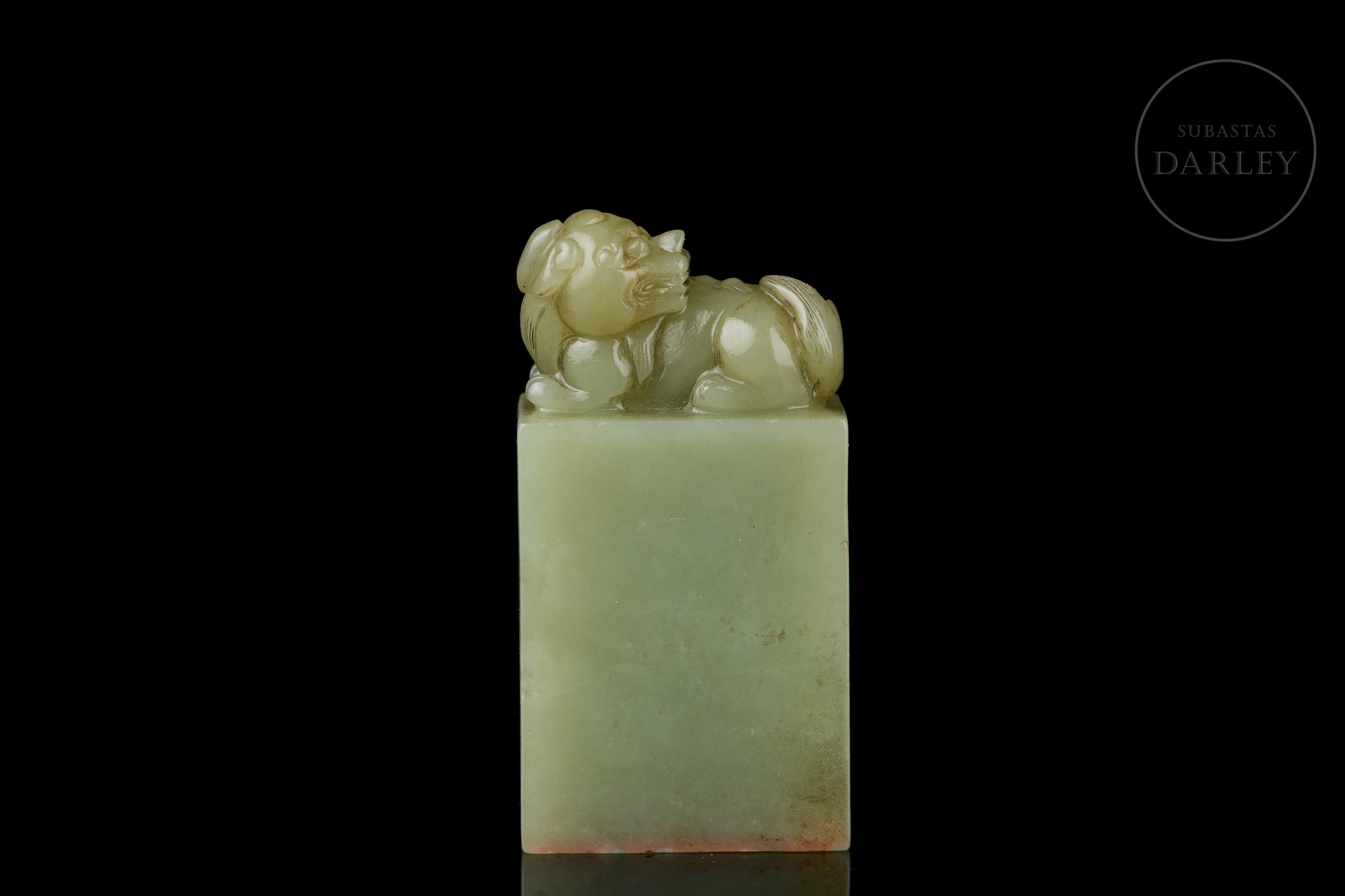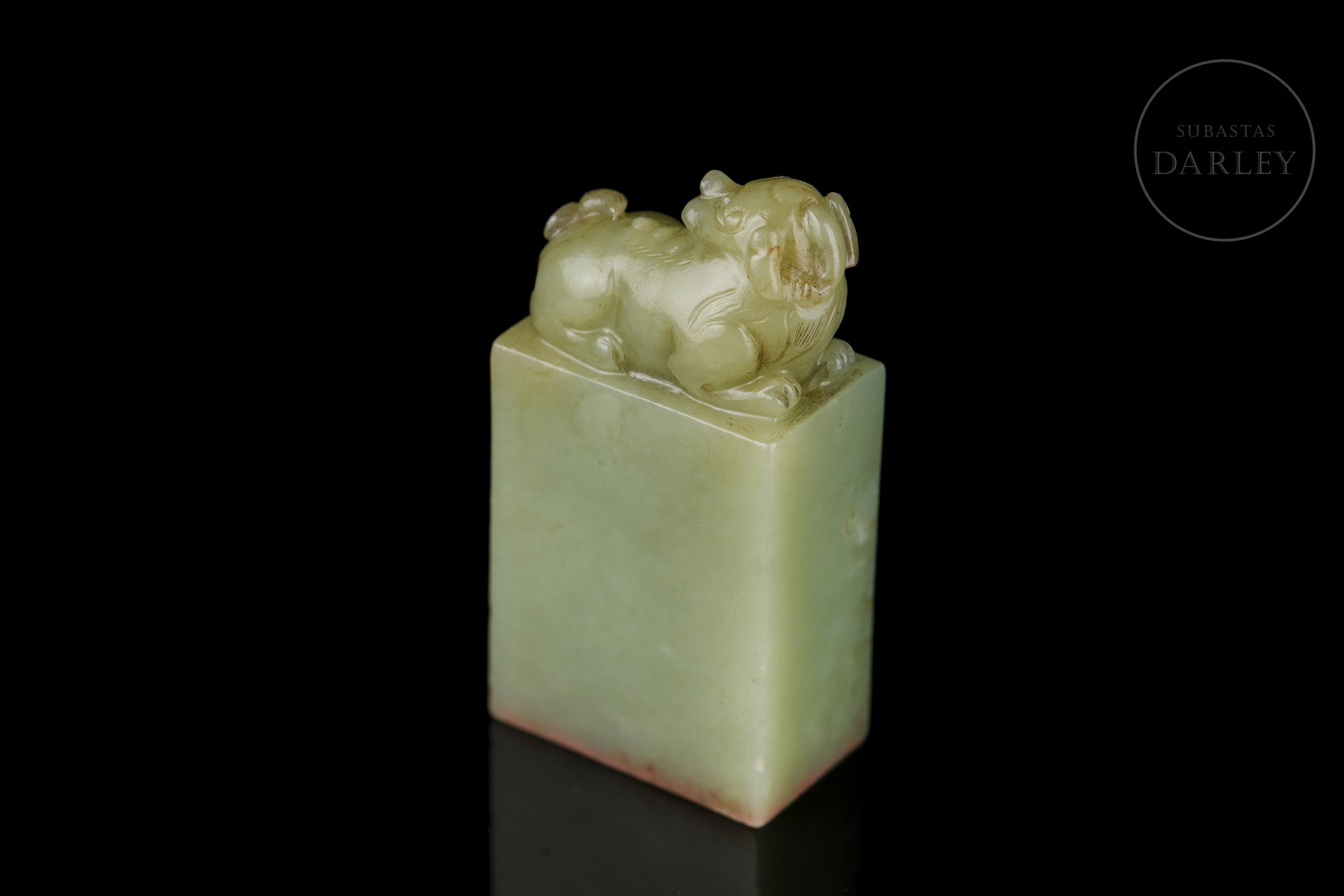 Sello rectangular elaborado en jade de tonalidad verdosa con restos de lacre rojo en la base. La parte superior está rematada por la talla de un animal recostado, de cuerpo alargado y cabeza vuelta, trabajado con detalles incisos en la melena y el rostro. La base presenta la inscripción "书生习气未能无".