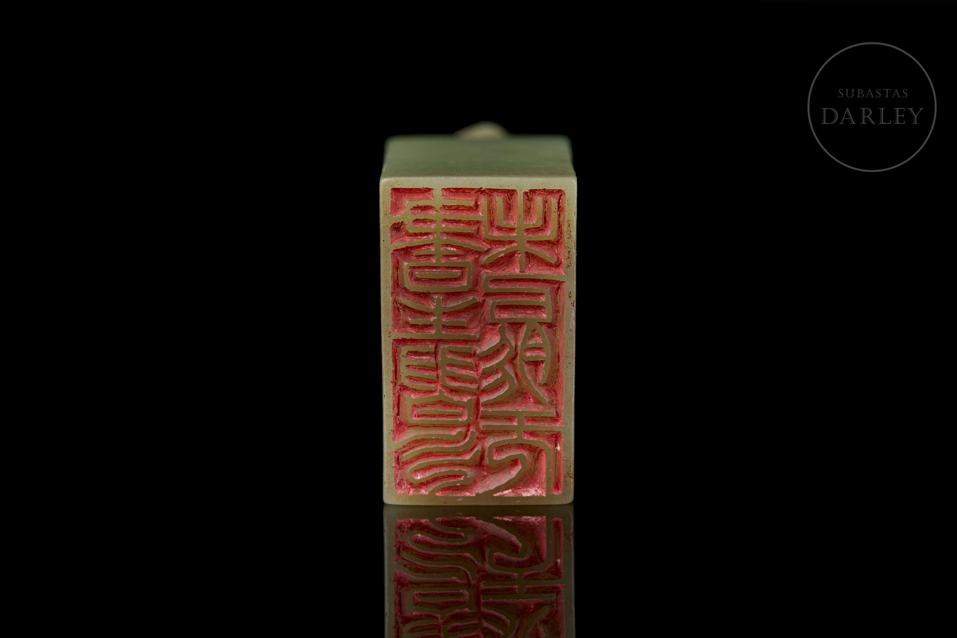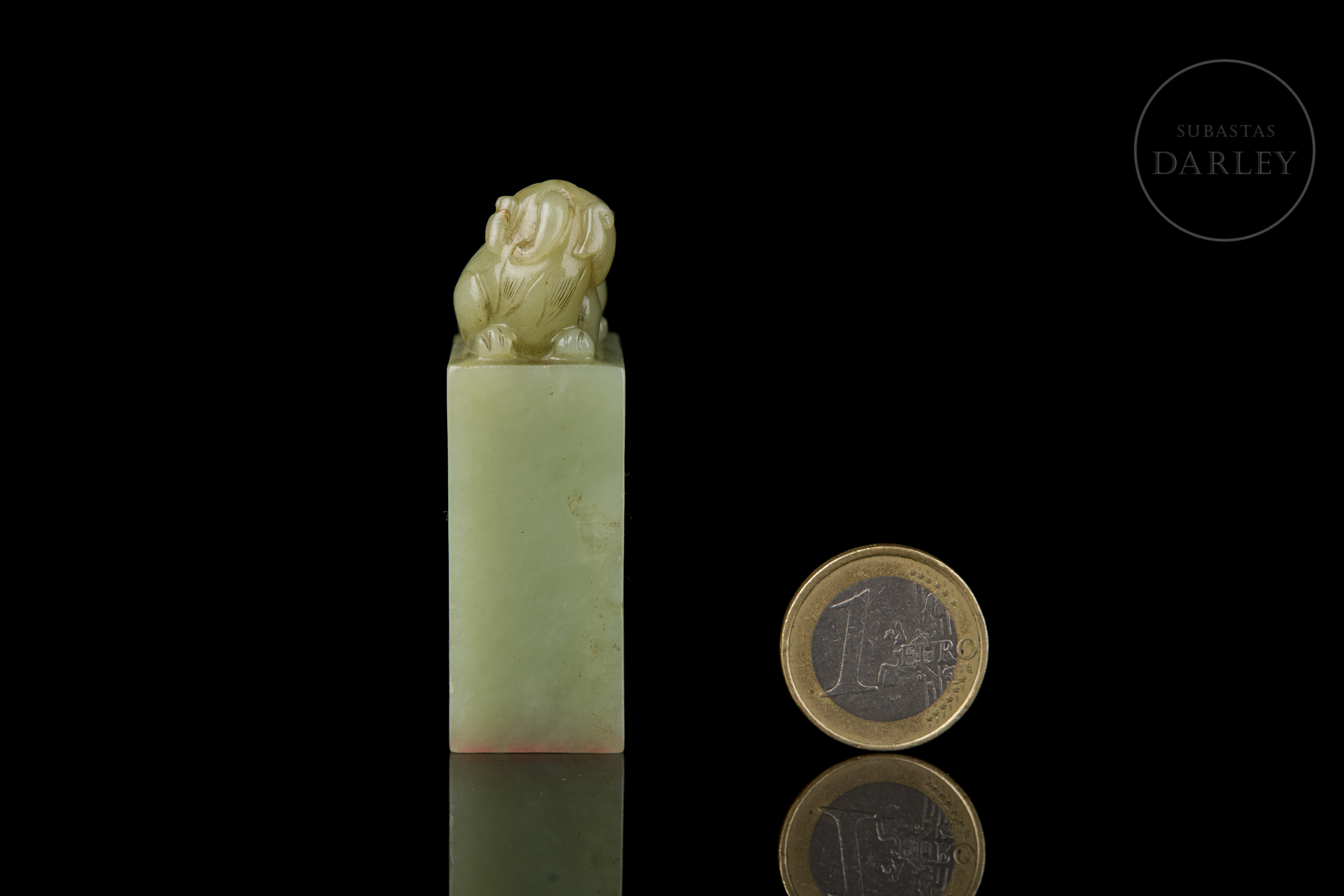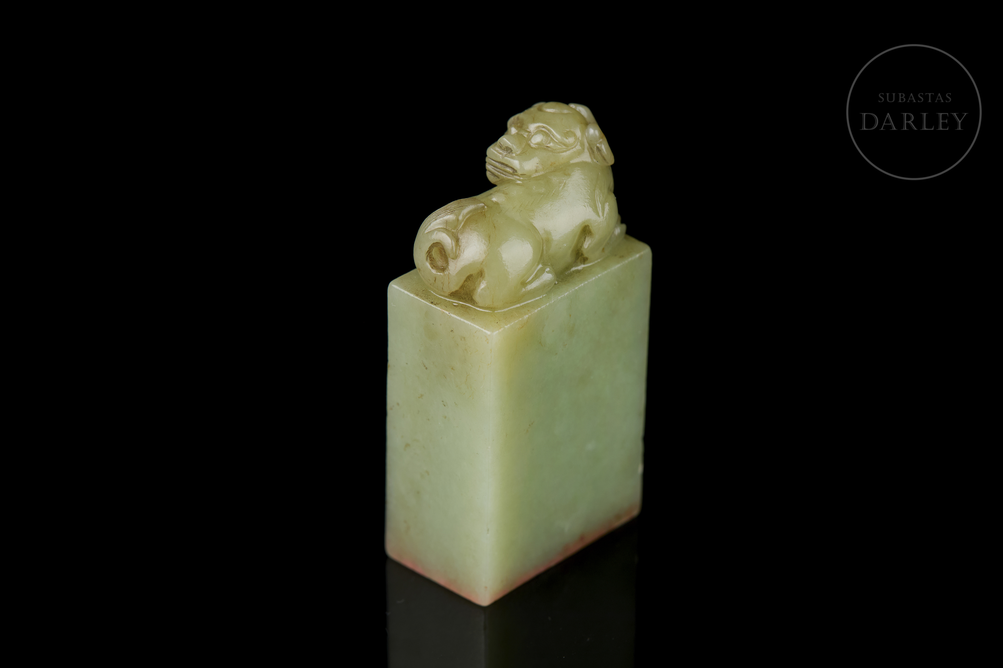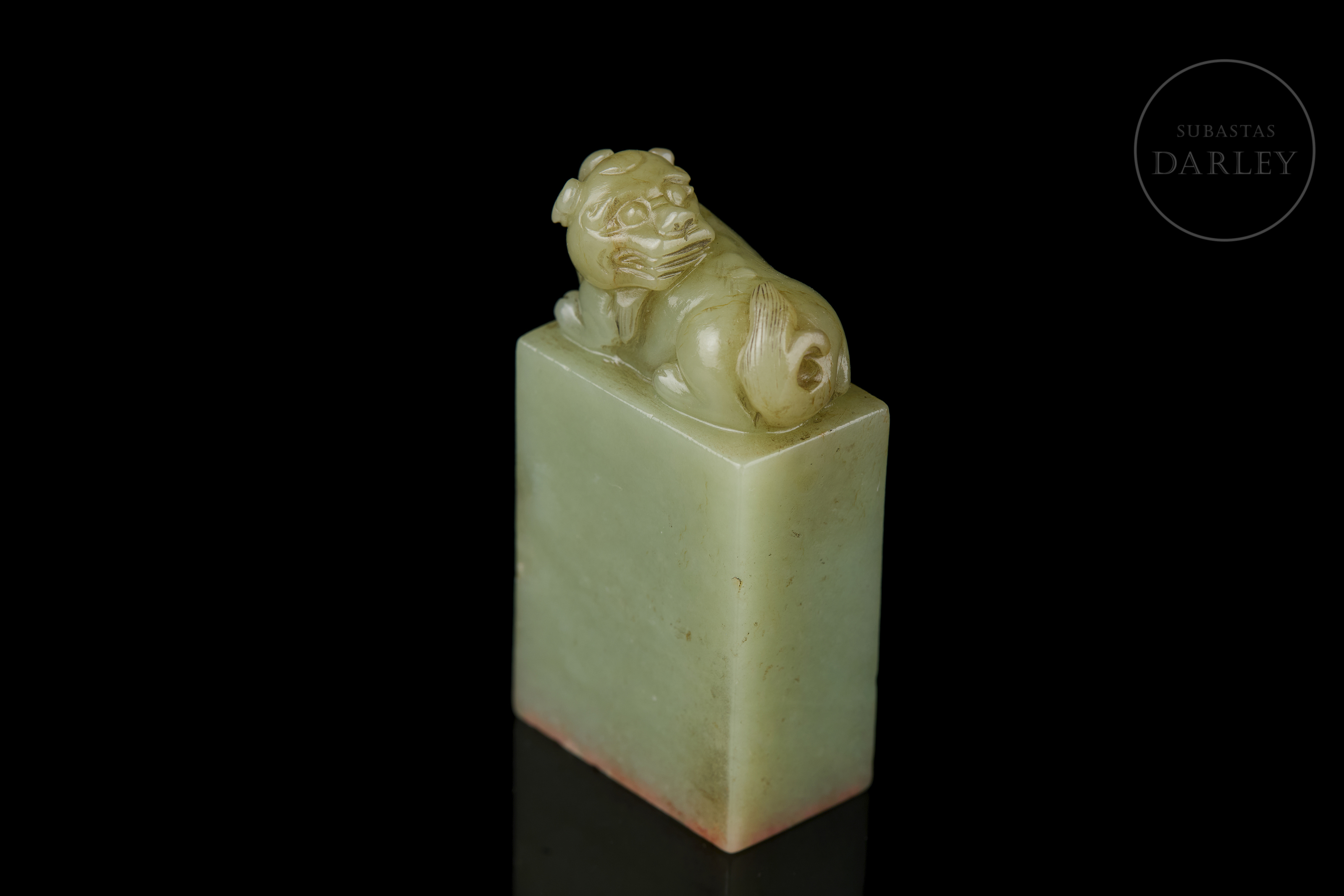 Sello rectangular elaborado en jade de tonalidad verdosa con restos de lacre rojo en la base. La parte superior está rematada por la talla de un animal recostado, de cuerpo alargado y cabeza vuelta, trabajado con detalles incisos en la melena y el rostro. La base presenta la inscripción "书生习气未能无".