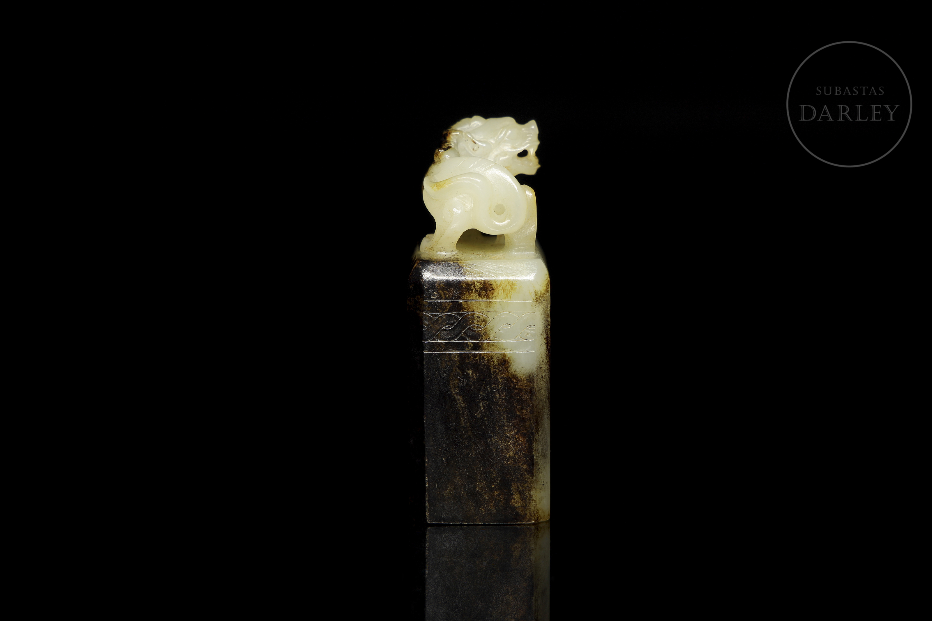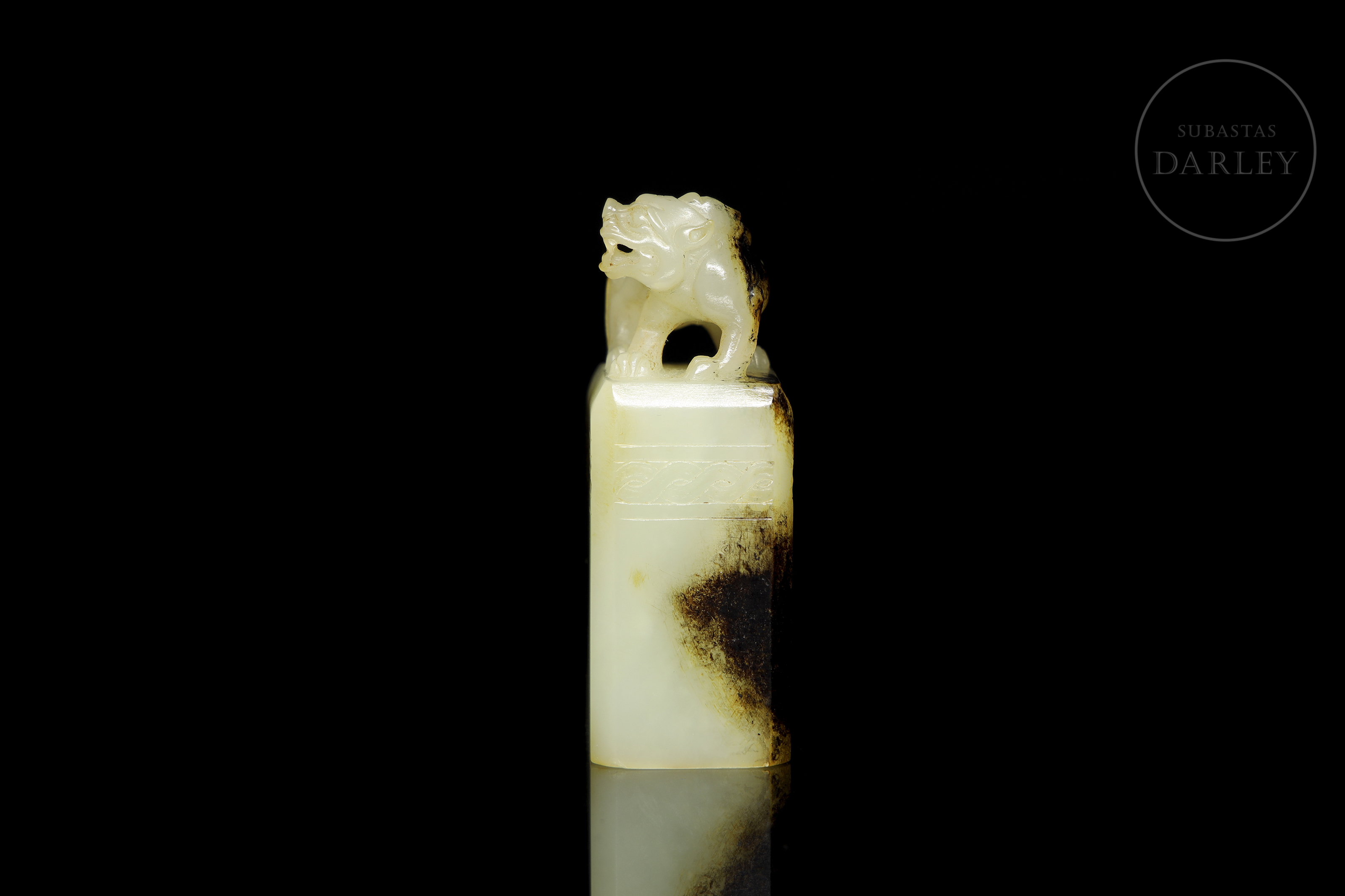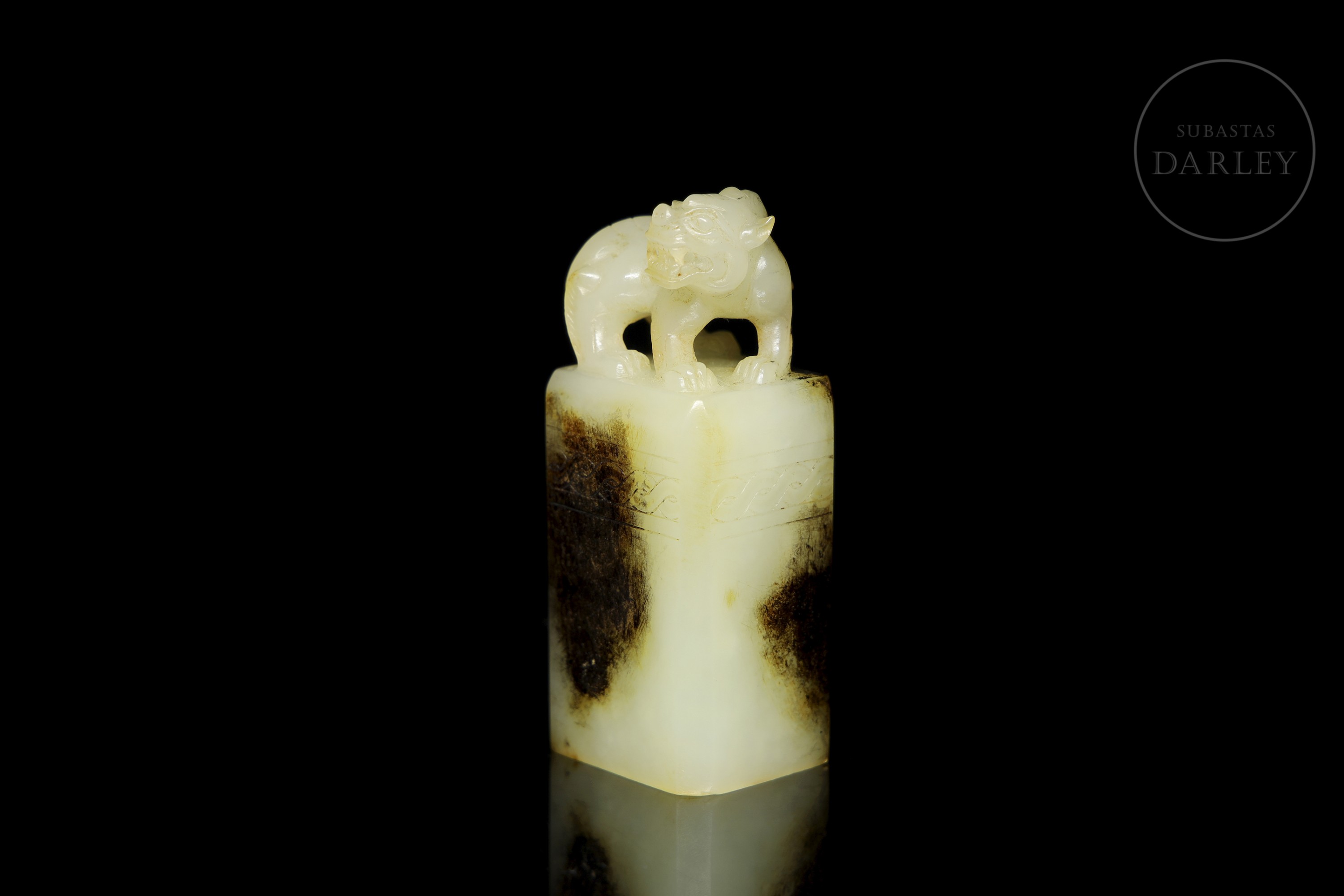 Sello rectangular, tallado en jade blanco. El agarre está esculpido en bulto redondo como una bestia mítica, en pose sedente, con fauces abiertas y una crin detallada. La parte superior del plinto está decorada con una fina cenefa incisa. Muestra áreas de pátina negra o "水银沁", creando un contraste cromático. La matriz del sello revela una talla incisa de dos caracteres "吴汉". Dinastía Han (206 a.C. - 220 d.C.).