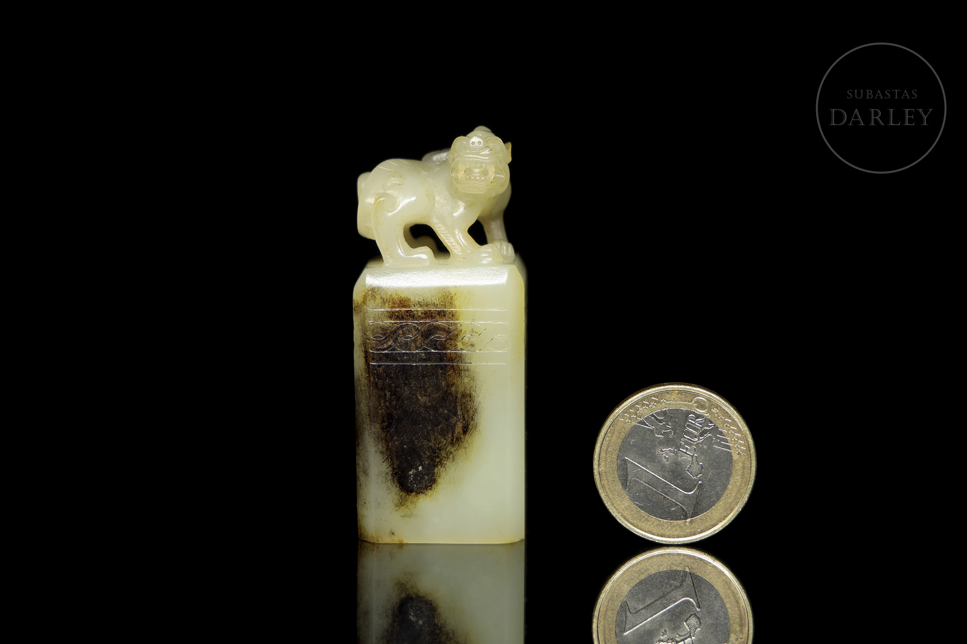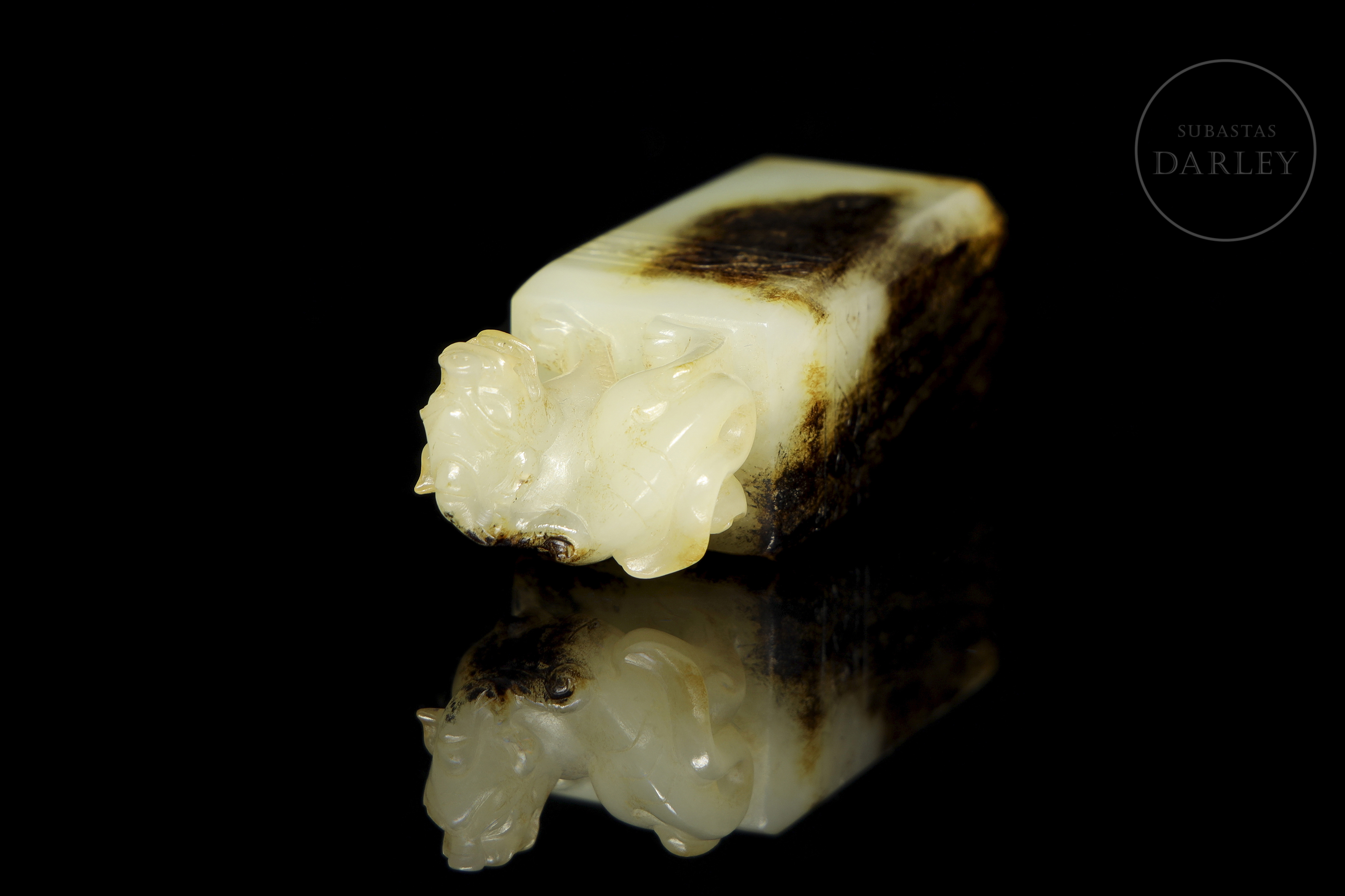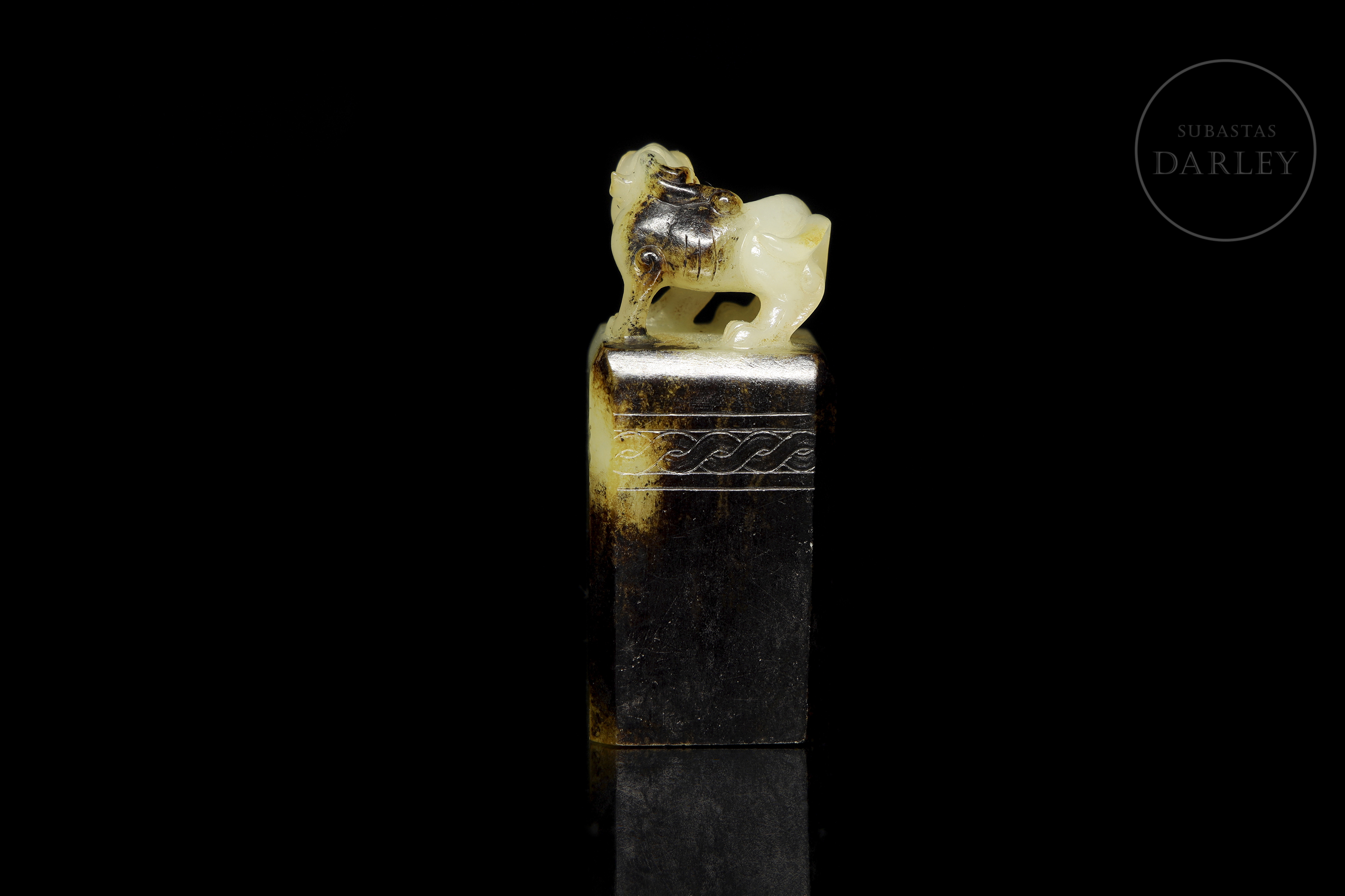 Sello rectangular, tallado en jade blanco. El agarre está esculpido en bulto redondo como una bestia mítica, en pose sedente, con fauces abiertas y una crin detallada. La parte superior del plinto está decorada con una fina cenefa incisa. Muestra áreas de pátina negra o "水银沁", creando un contraste cromático. La matriz del sello revela una talla incisa de dos caracteres "吴汉". Dinastía Han (206 a.C. - 220 d.C.).