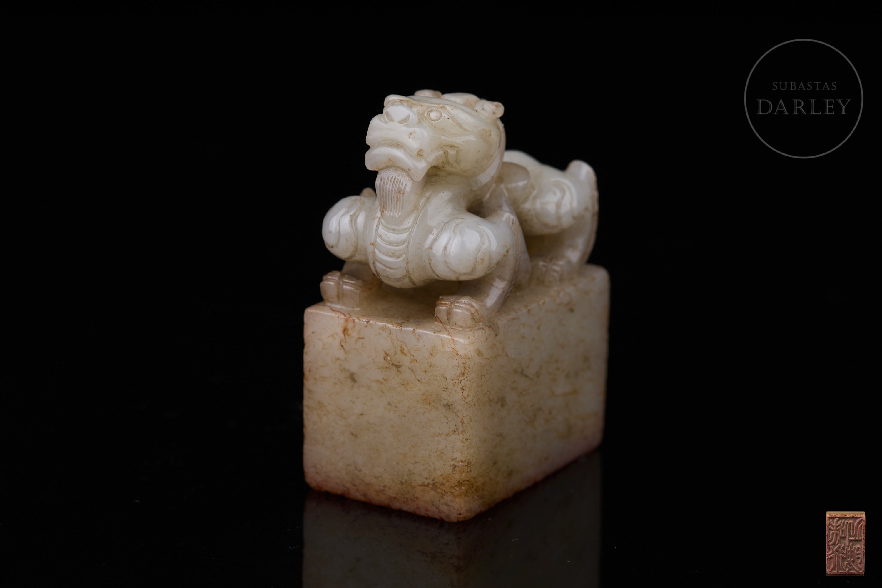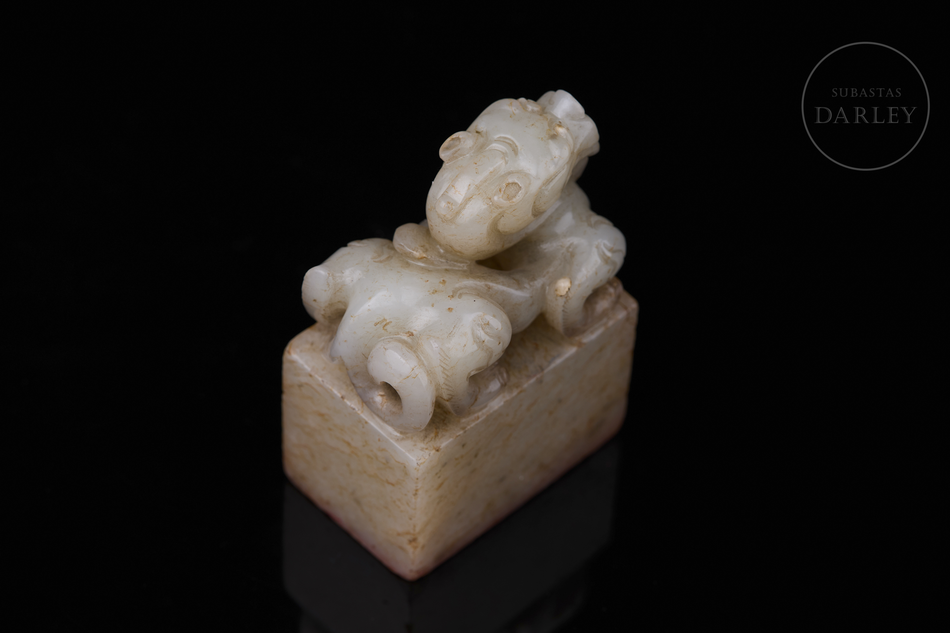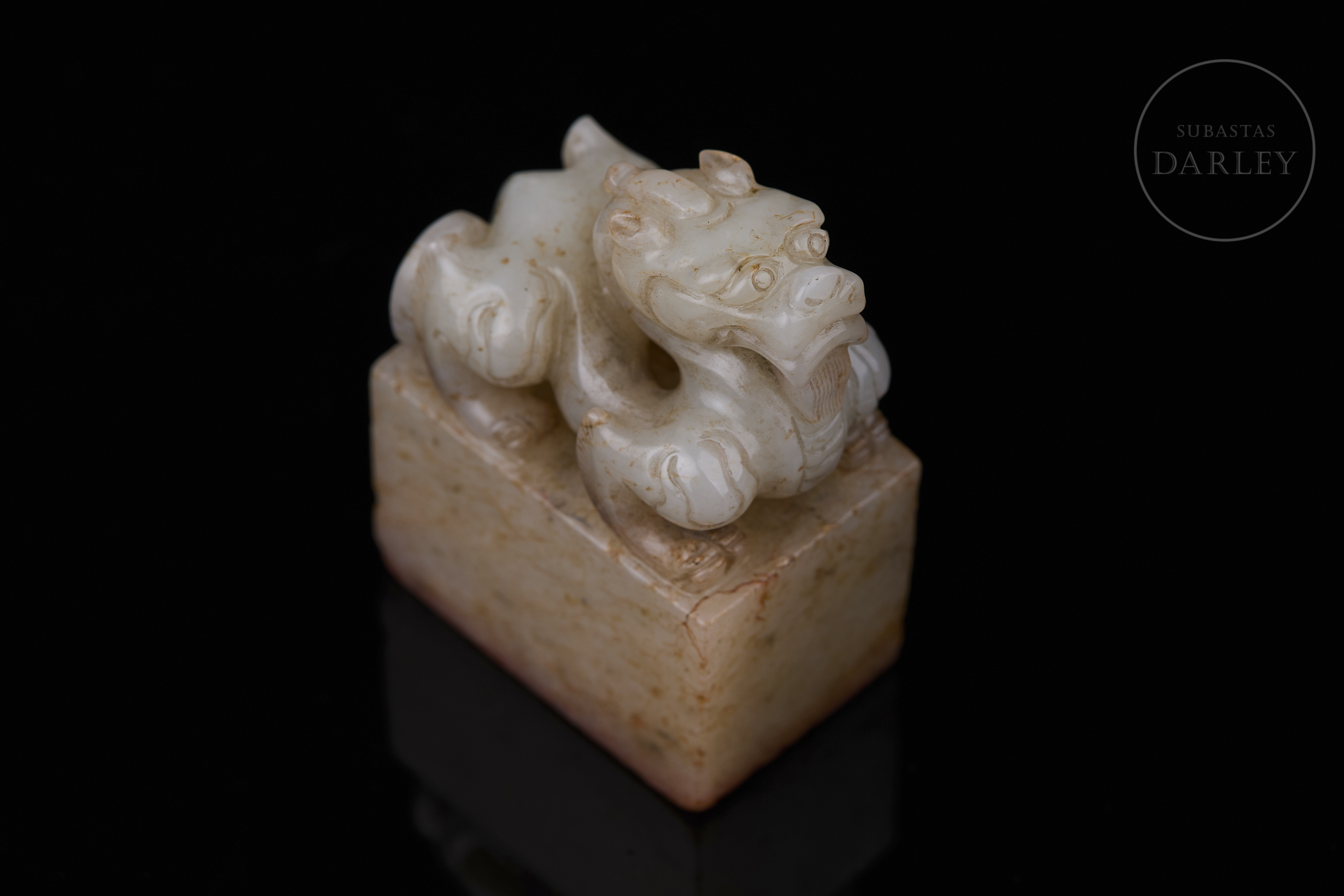 Sello tallado de jade blanco cremoso con vetas de color dorado. Muestra un cuerpo rectangular, coronado por un bixie, de postura tensa, con la cabeza erguida, cuerpo robusto y patas flexionadas, todo ello adornado con detalles incisos. En la base se dispone el sello “味道之腴” grabado. Dinastía Qing (1644-1912).