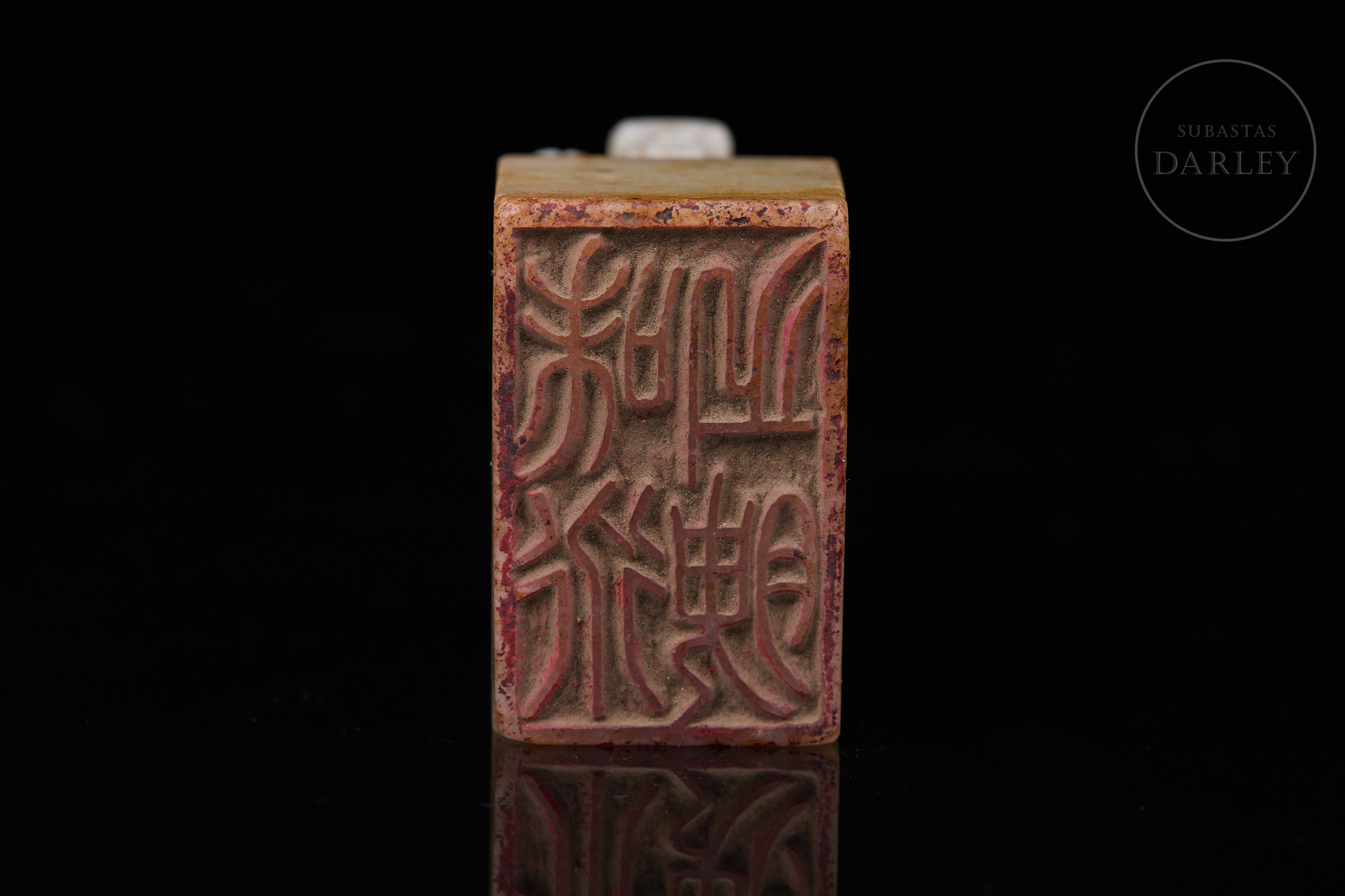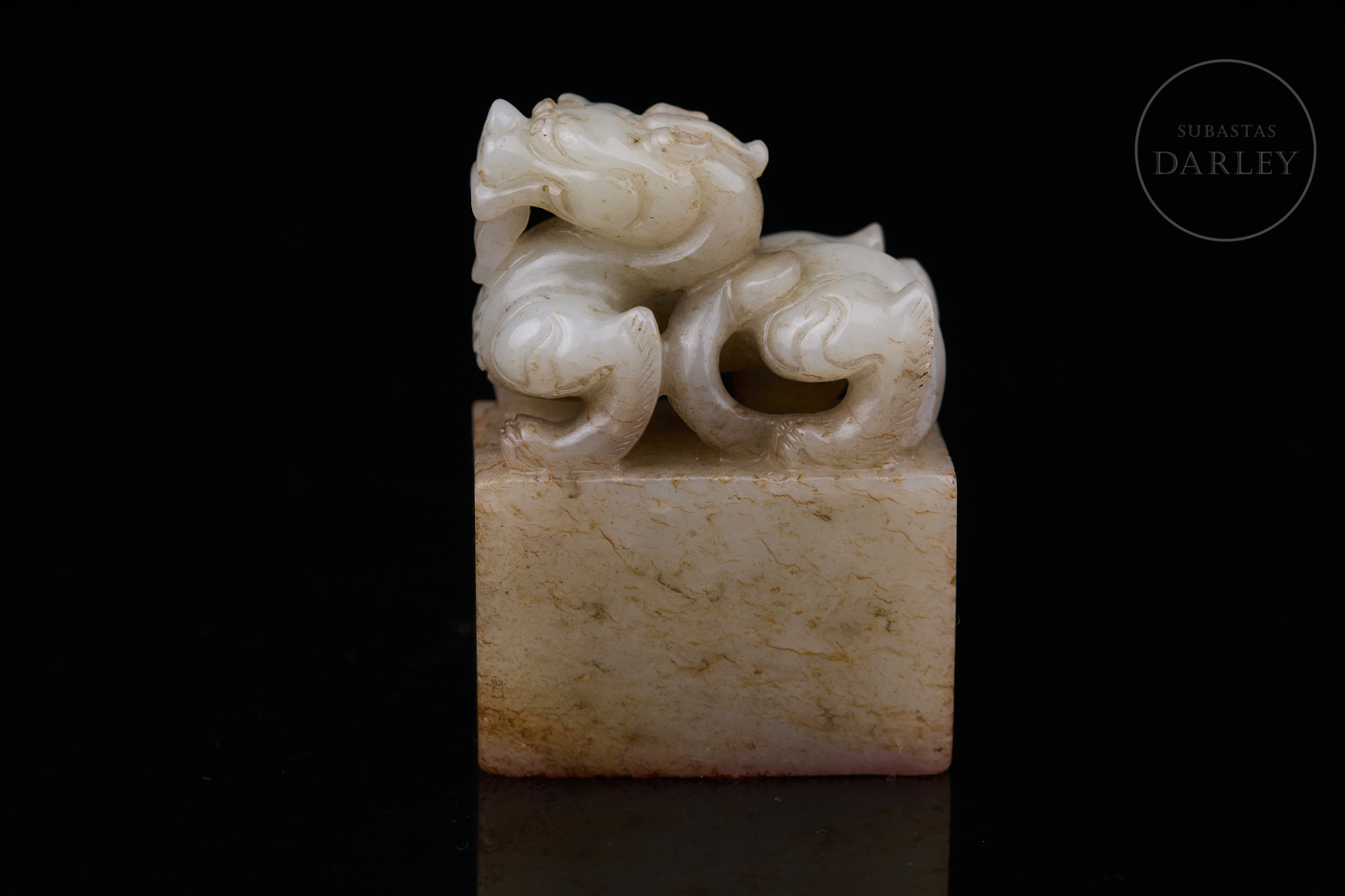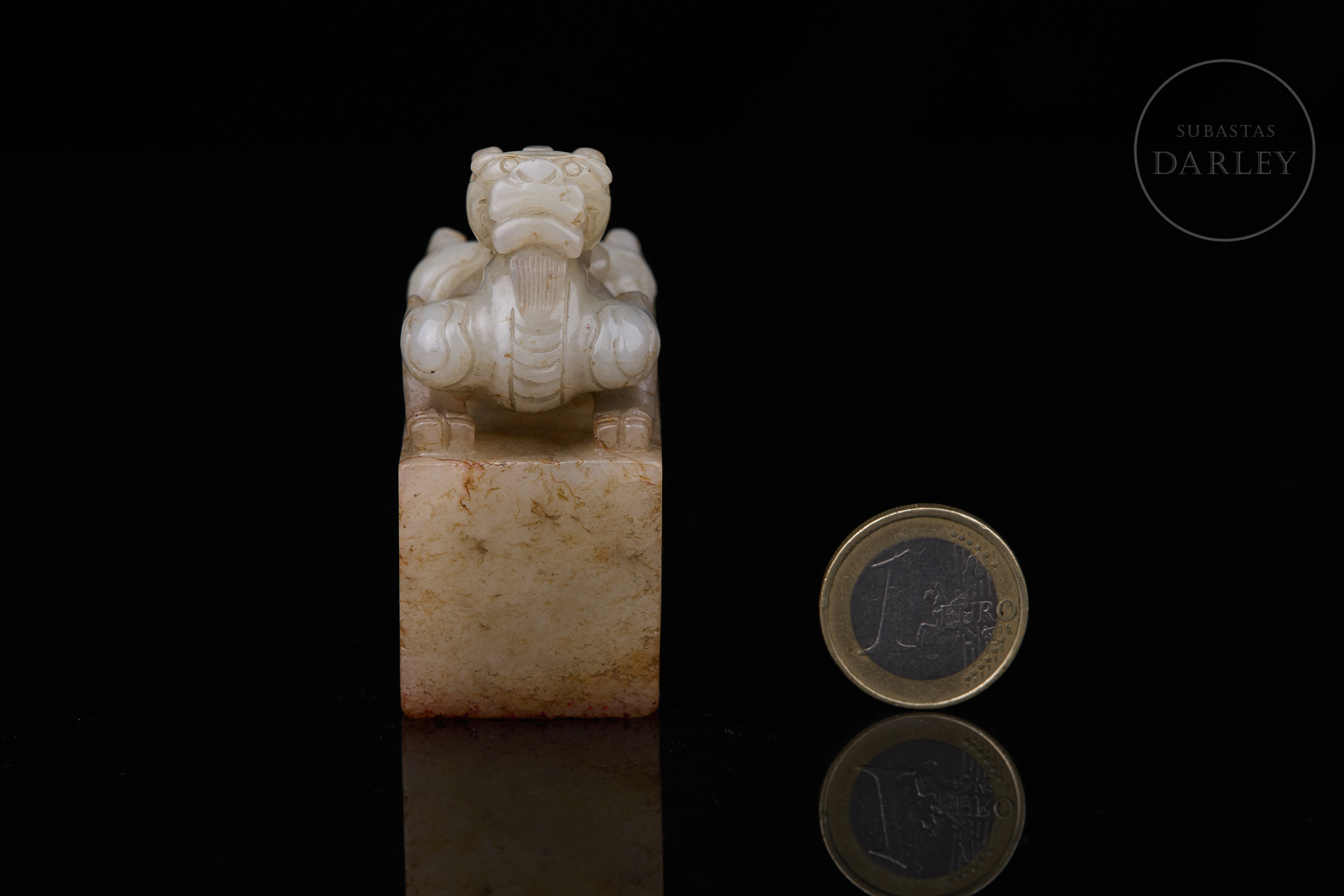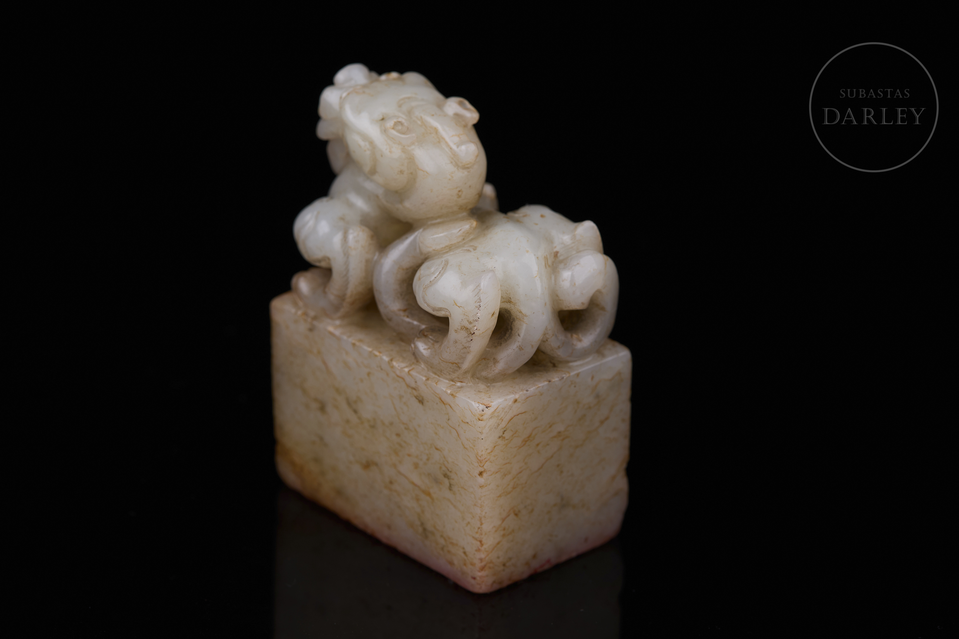 Sello tallado de jade blanco cremoso con vetas de color dorado. Muestra un cuerpo rectangular, coronado por un bixie, de postura tensa, con la cabeza erguida, cuerpo robusto y patas flexionadas, todo ello adornado con detalles incisos. En la base se dispone el sello “味道之腴” grabado. Dinastía Qing (1644-1912).
