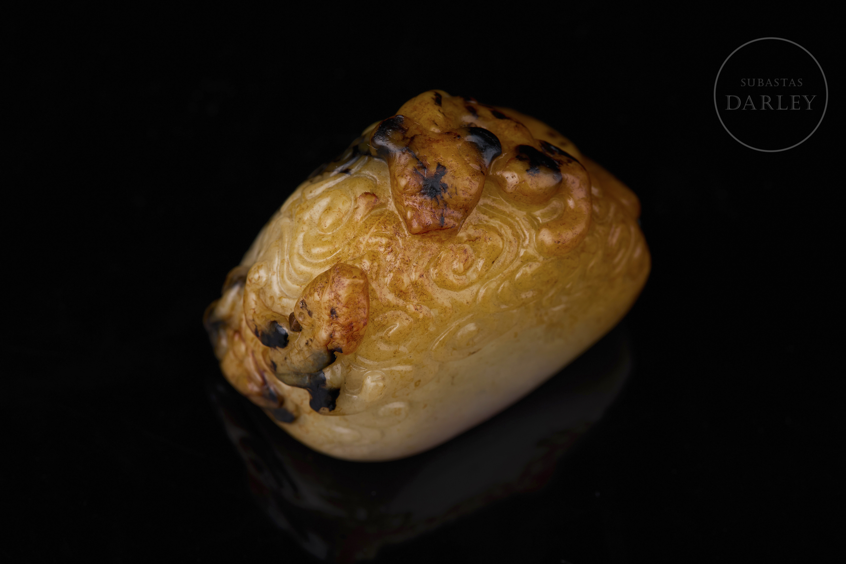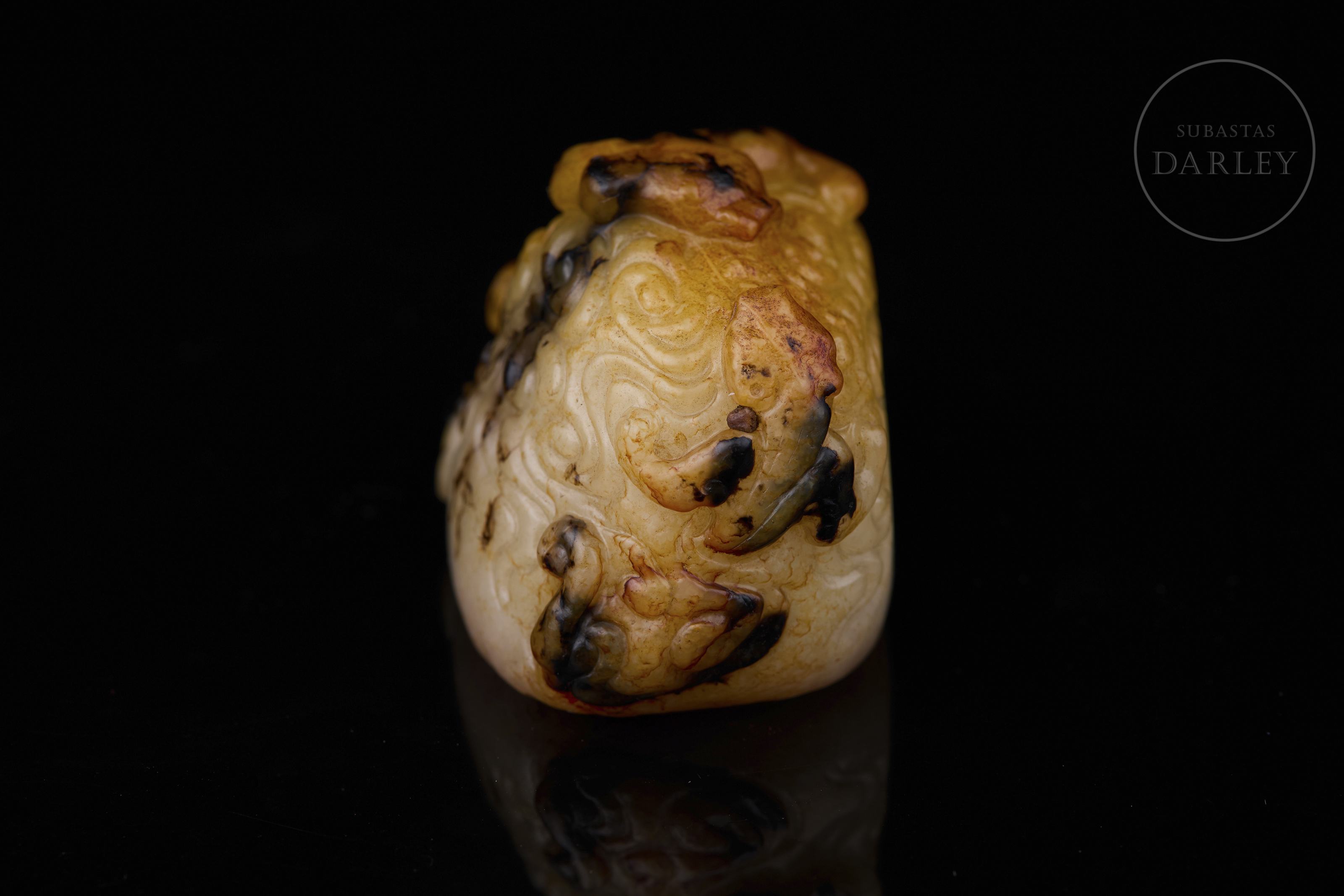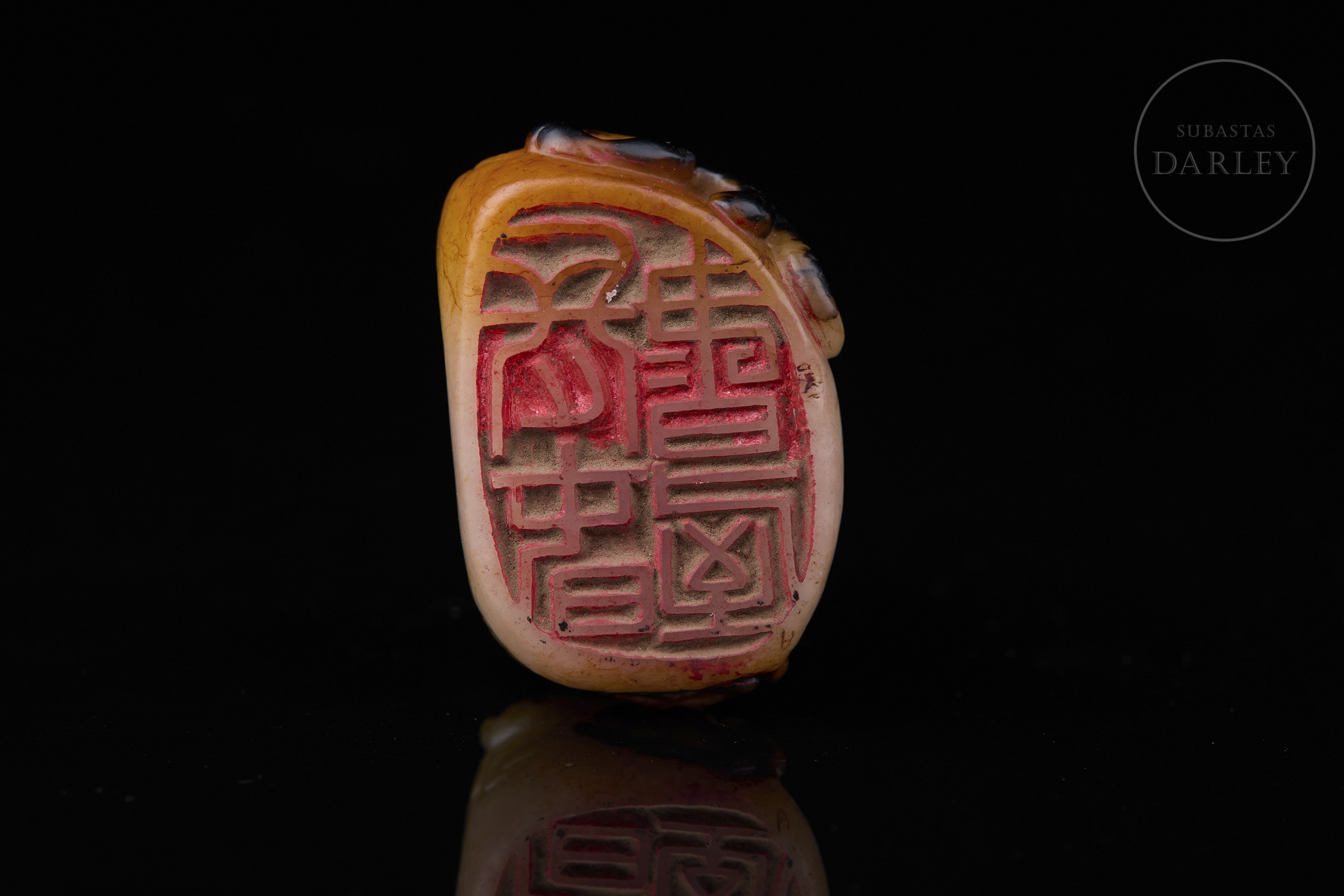 Sello tallado de jade blanco cubierto por una amplia pátina ámbar y de forma ovalada, con cantos redondeados. Se encuentra adornado por dragones entrelazados entre volutas de nubes que cubren el área superior. La matriz muestra grabado "长春书屋" y restos de lacre rojo. Dinastía Qing (1644–1912).
