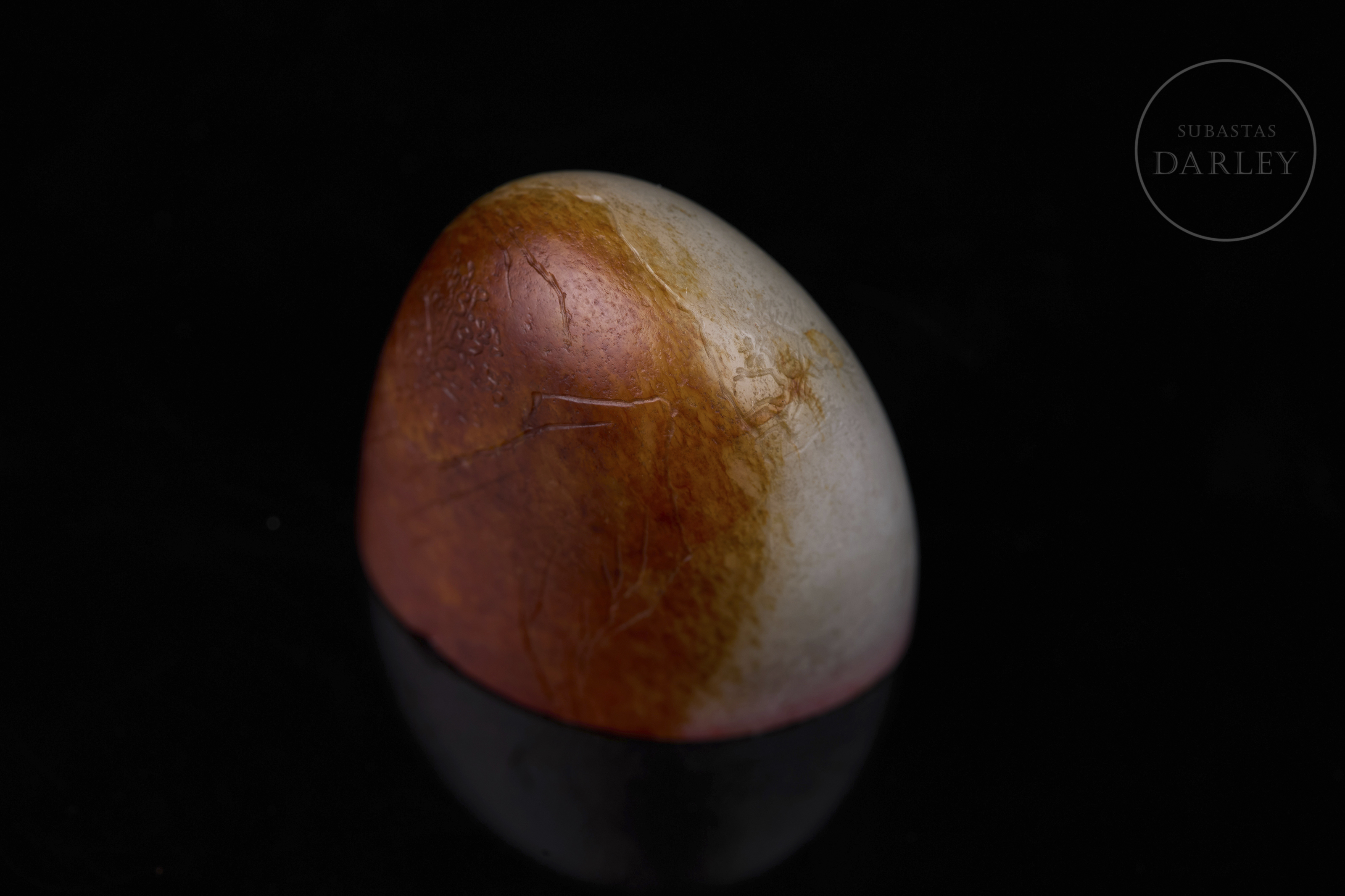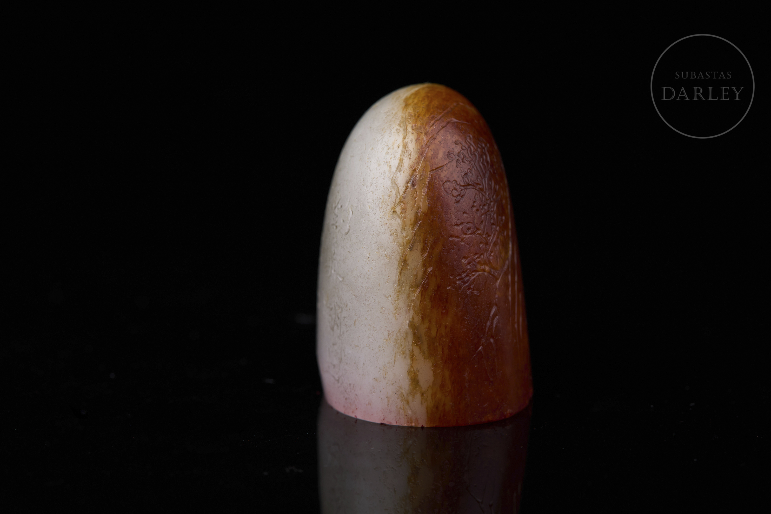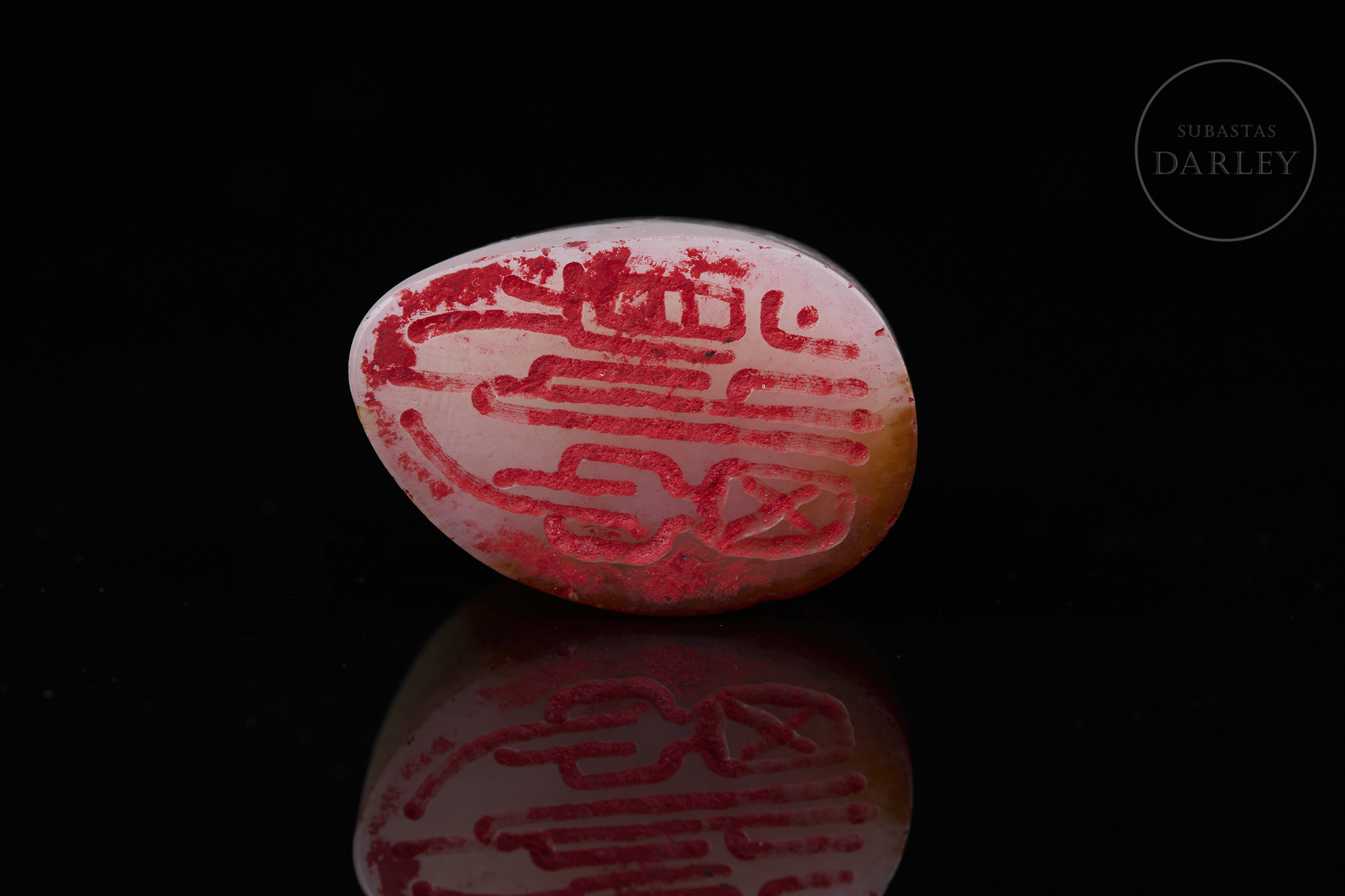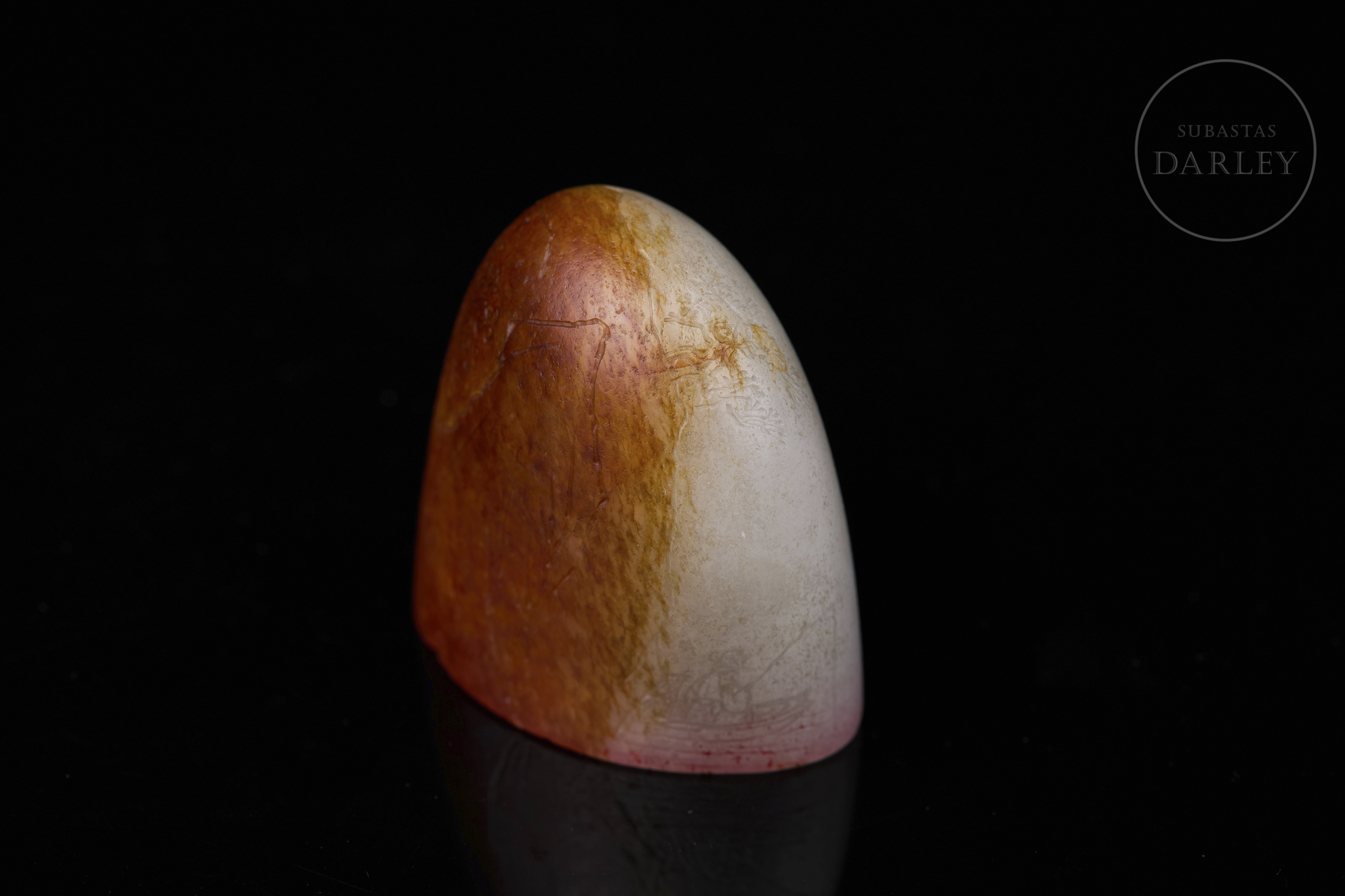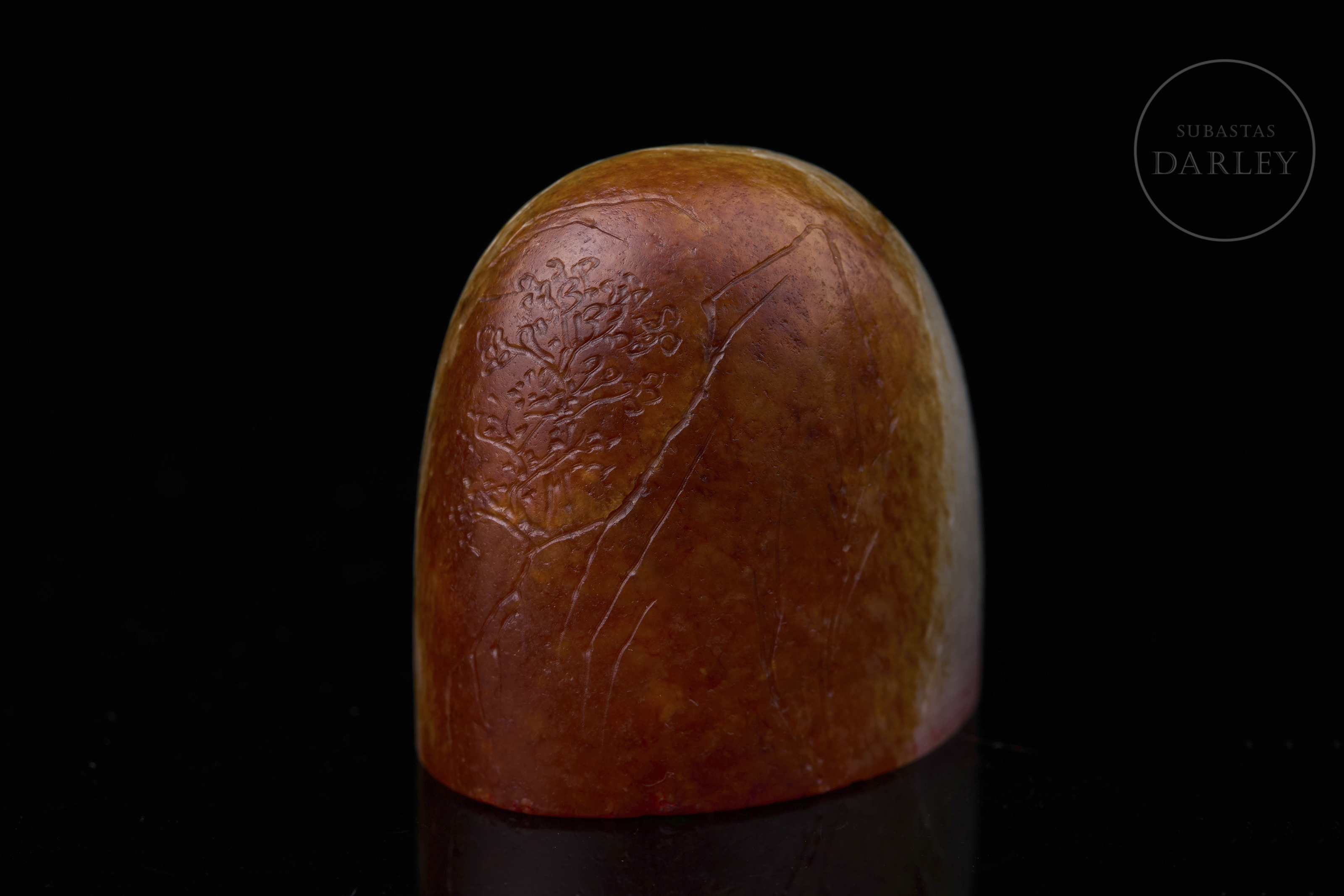 Sello de jade blanco, con forma de canto rodado y de color blanco lechoso con pátina marrón rojiza que cubre la mitad de la superficie. La decoración muestra, en una de sus caras, un delicado grabado de un árbol junto a una montaña. En el lado opuesto, se encuentra inscrito un corto poema. La matriz muestra caracteres grabados "慎思". Dinastía Qing (1644–1912).