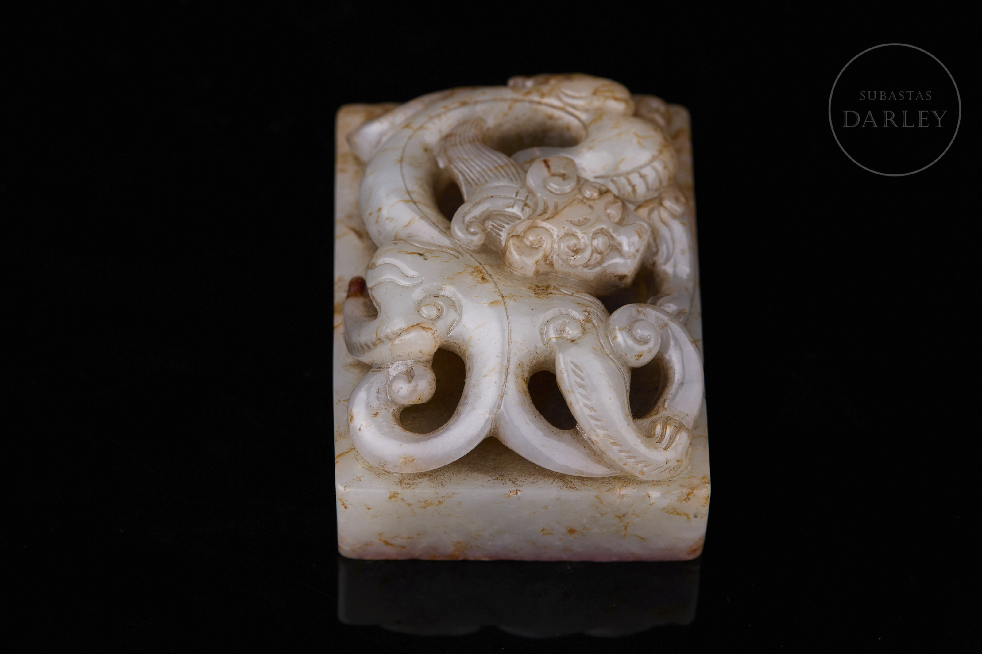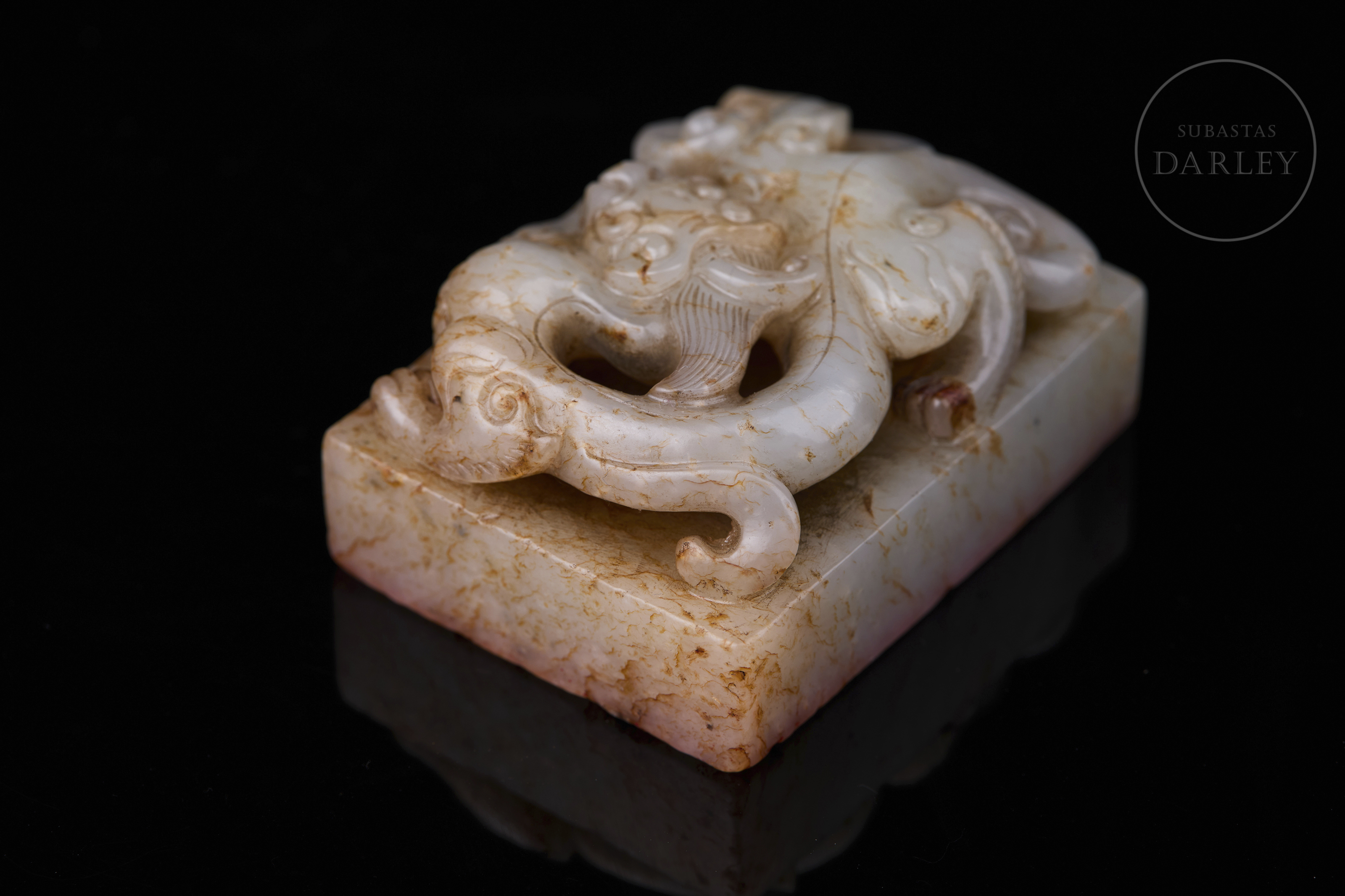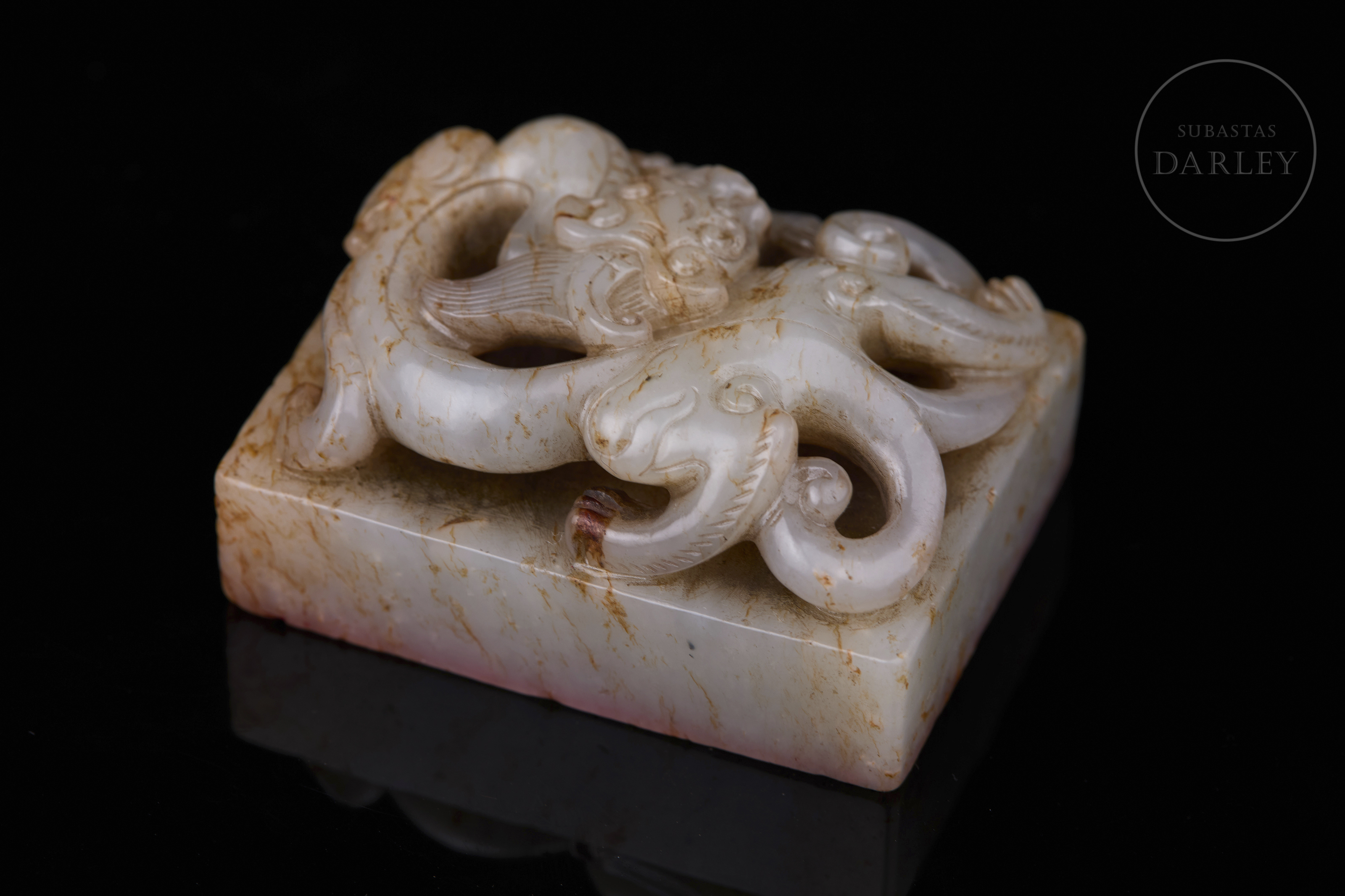 Sello tallado en jade blanco con vetas de tonalidad ámbar, y base rectangular. Presenta un remate en forma de dragón agazapado en posición retorcida, con el cuerpo entrelazado y la cabeza orientada hacia adelante, adornado con una fina melena, volutas y ojos saltones. La base muestra la inscripción "响用五福" grabada. Dinastía Qing (1644–1912).
