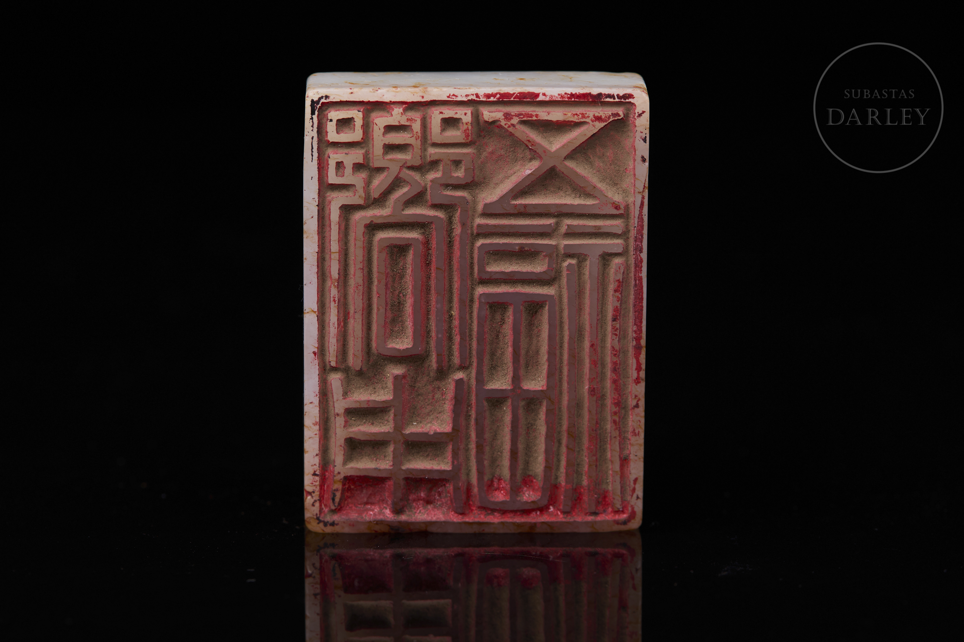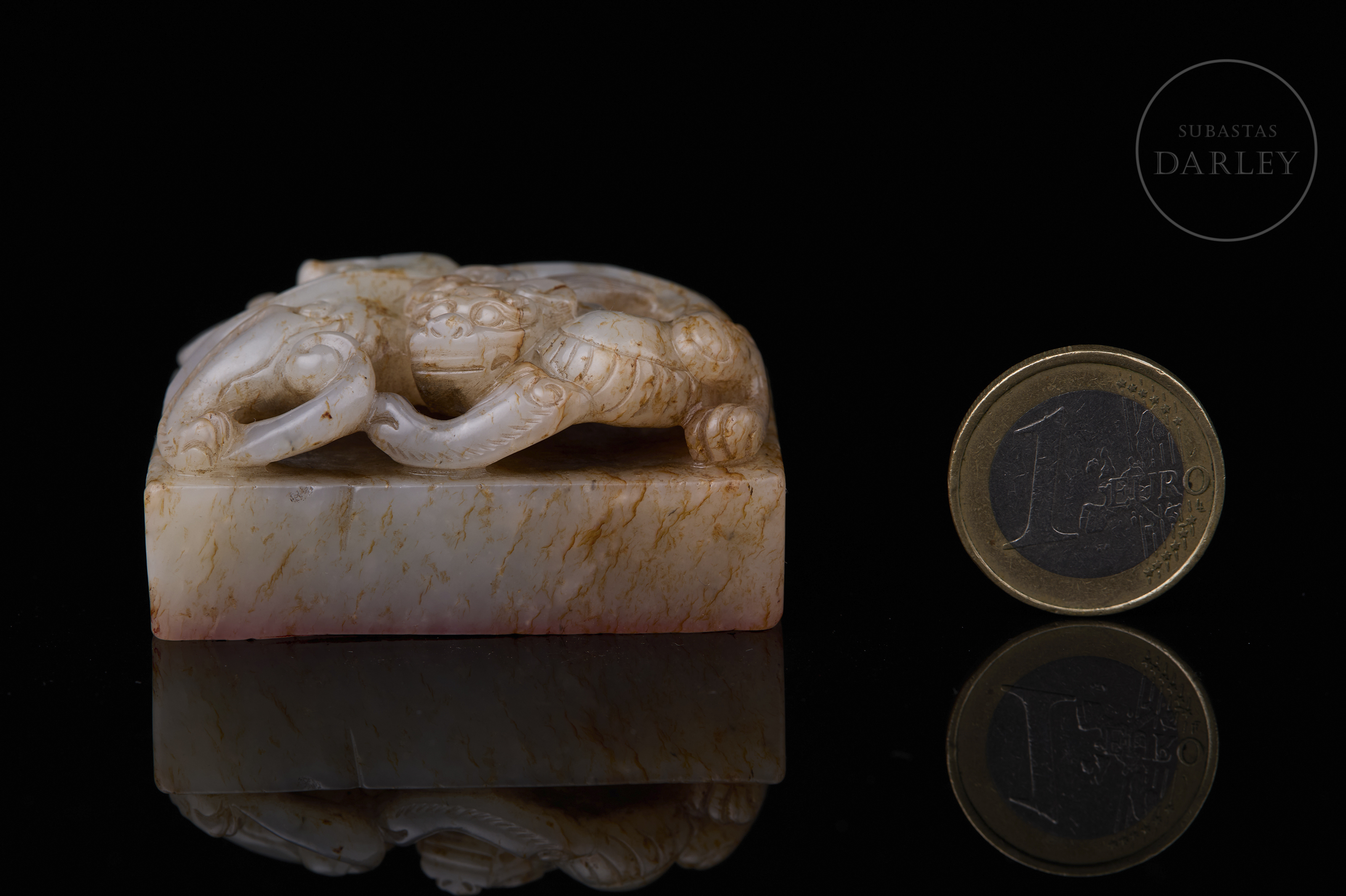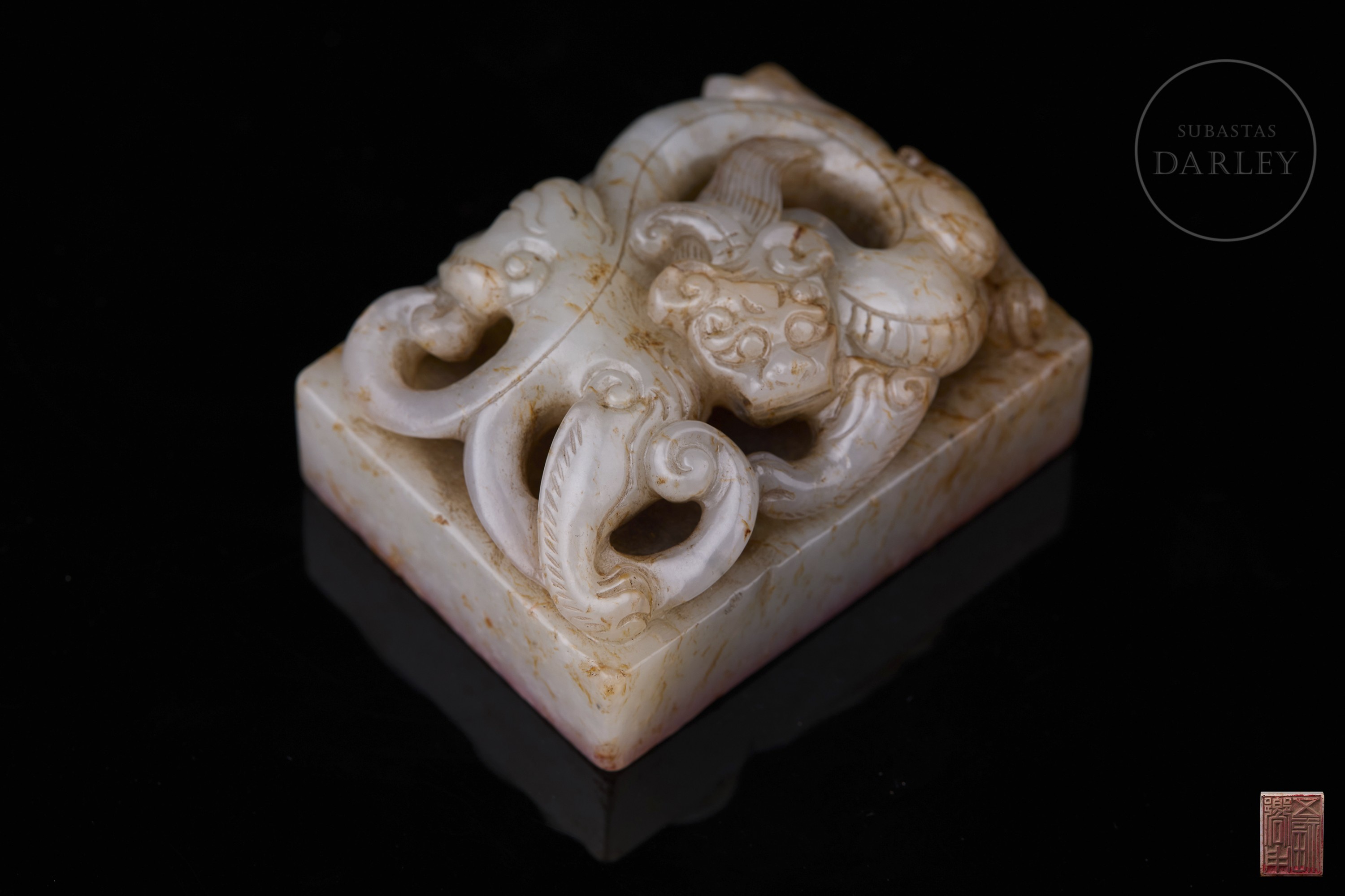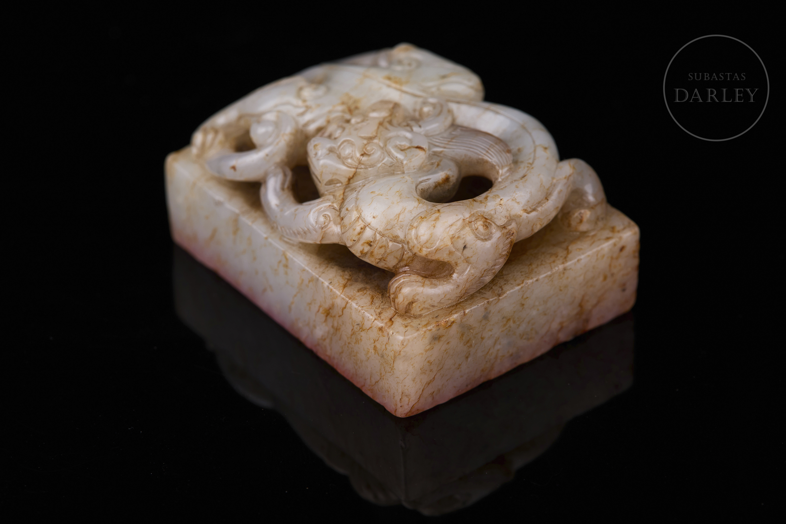Sello tallado en jade blanco con vetas de tonalidad ámbar, y base rectangular. Presenta un remate en forma de dragón agazapado en posición retorcida, con el cuerpo entrelazado y la cabeza orientada hacia adelante, adornado con una fina melena, volutas y ojos saltones. La base muestra la inscripción "响用五福" grabada. Dinastía Qing (1644–1912).
