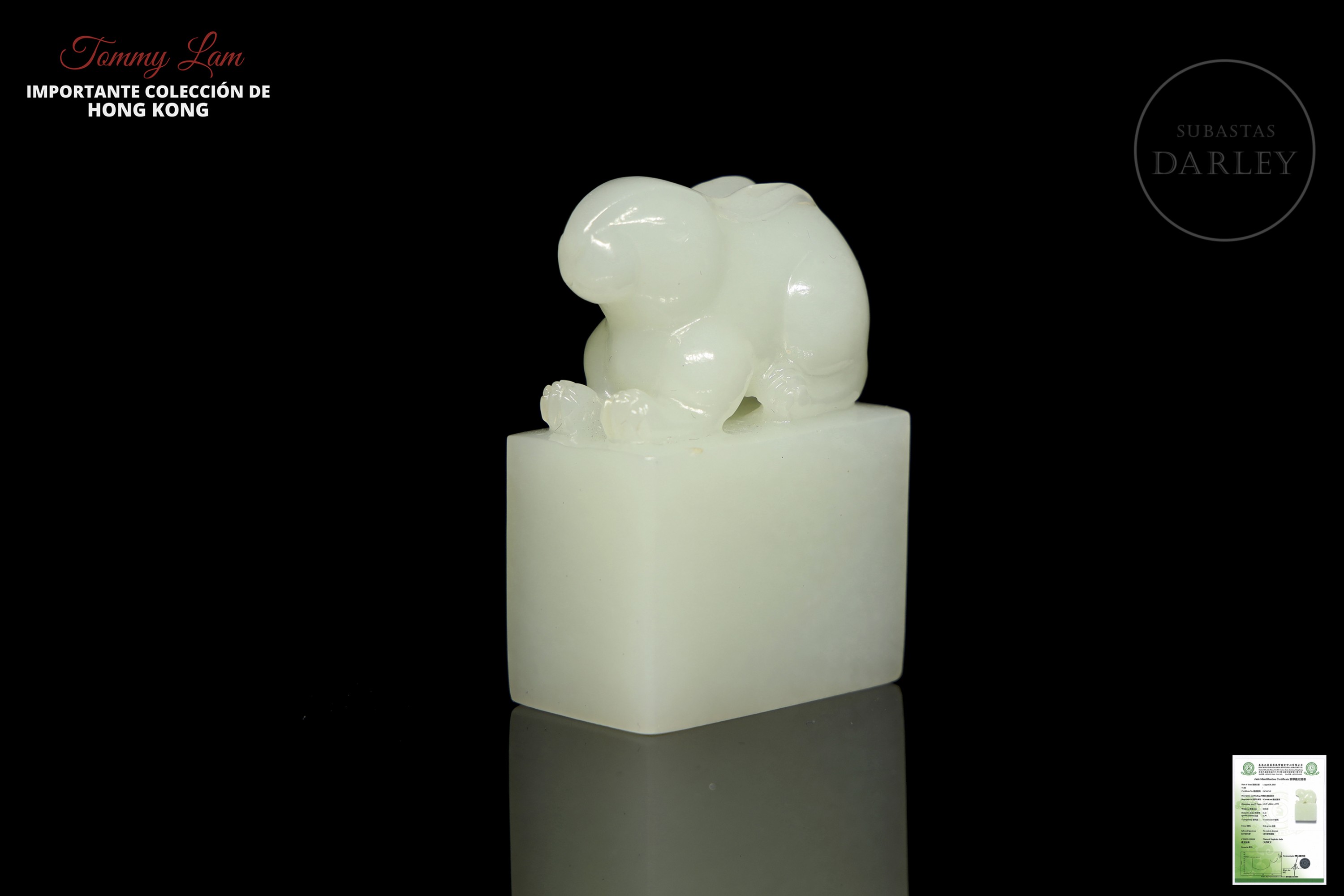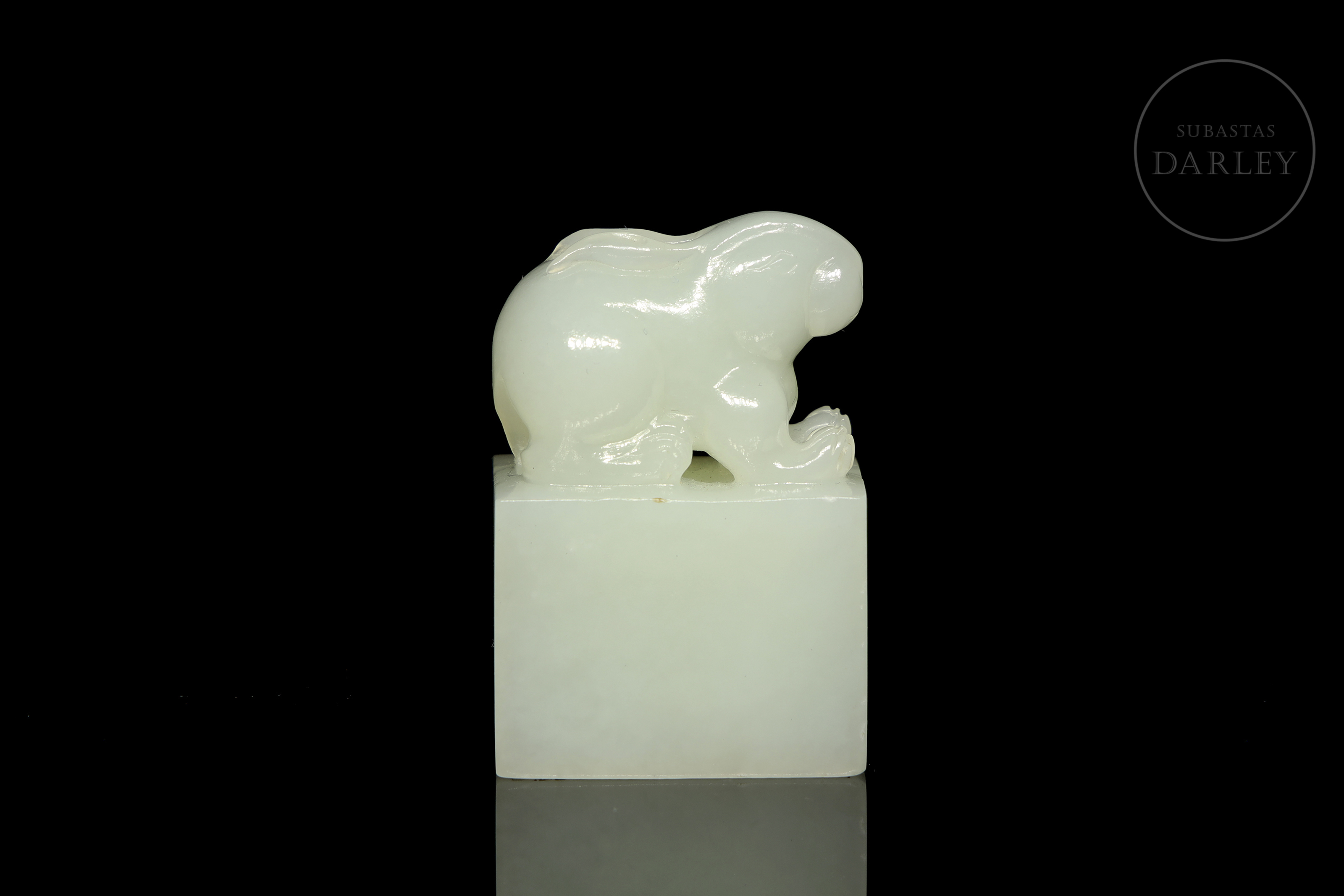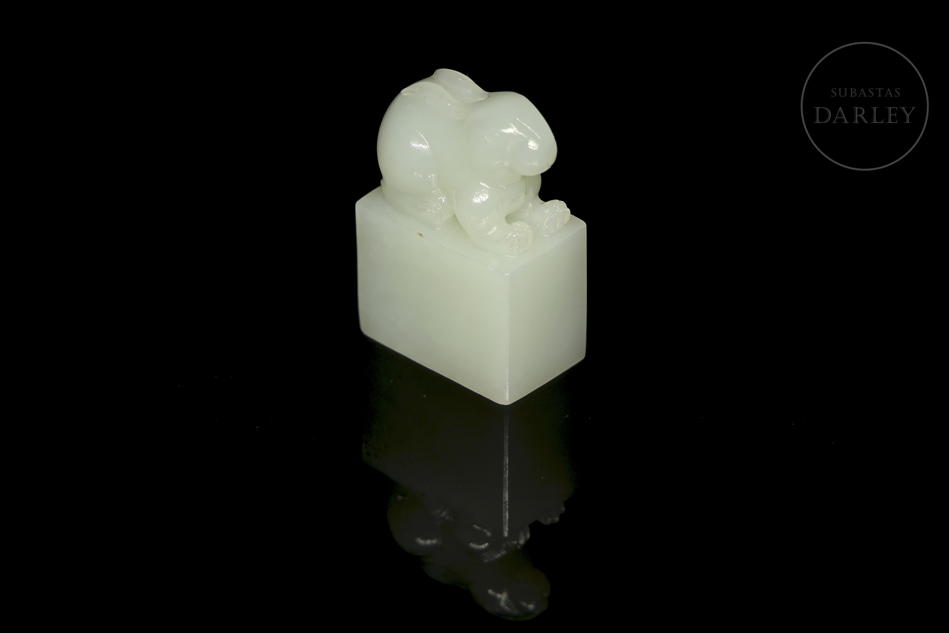 Sello rectangular, tallado en jade blanco. El agarre está esculpido en bulto redondo como una liebre en una pose recostada y compacta, con las orejas hacia atrás y patas flexionadas bajo el cuerpo. La matriz del sello revela una talla incisa de tres caracteres: "昔閣印". Dinastía Qing (1644-1912), periodo Qianlong (1736-1795).