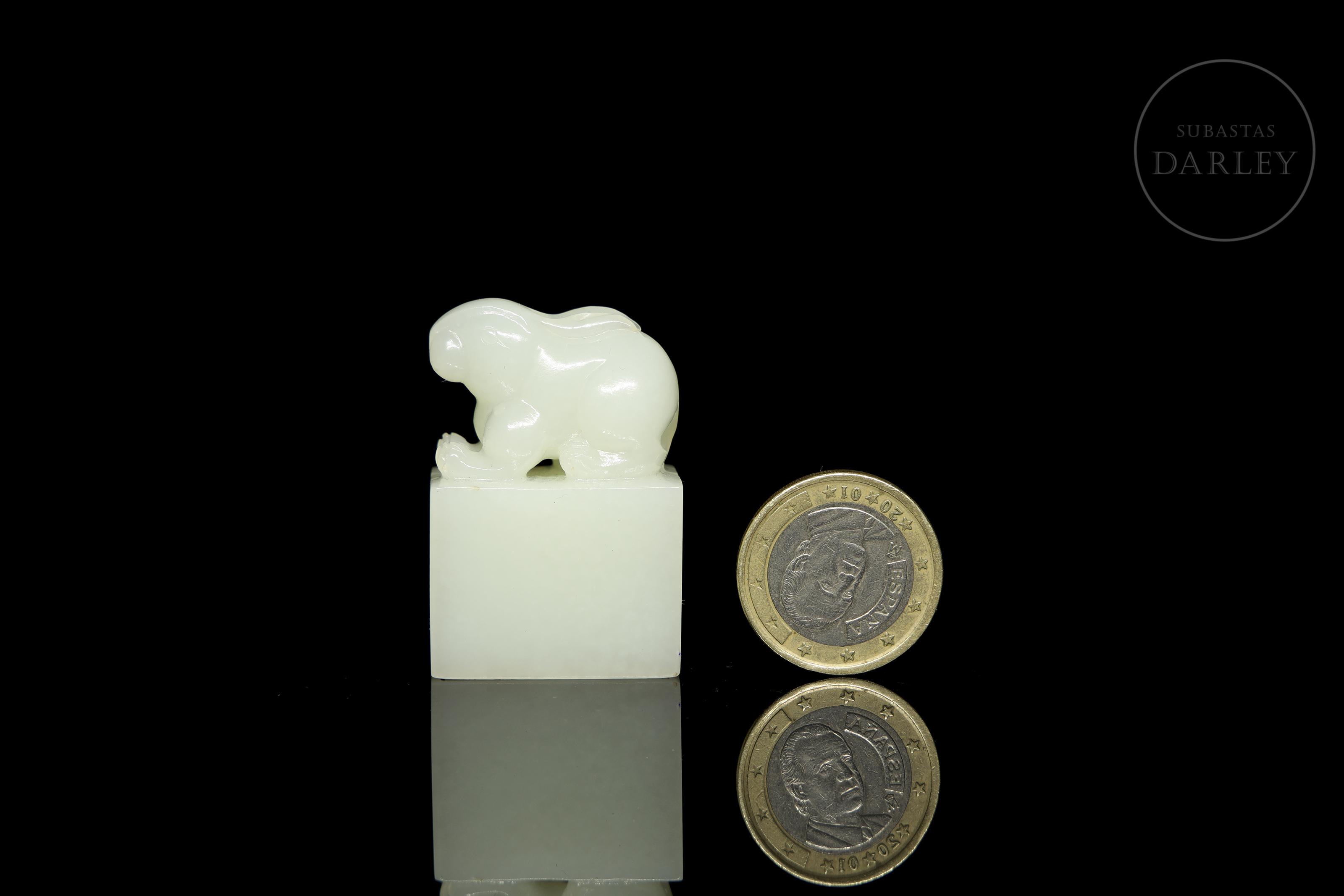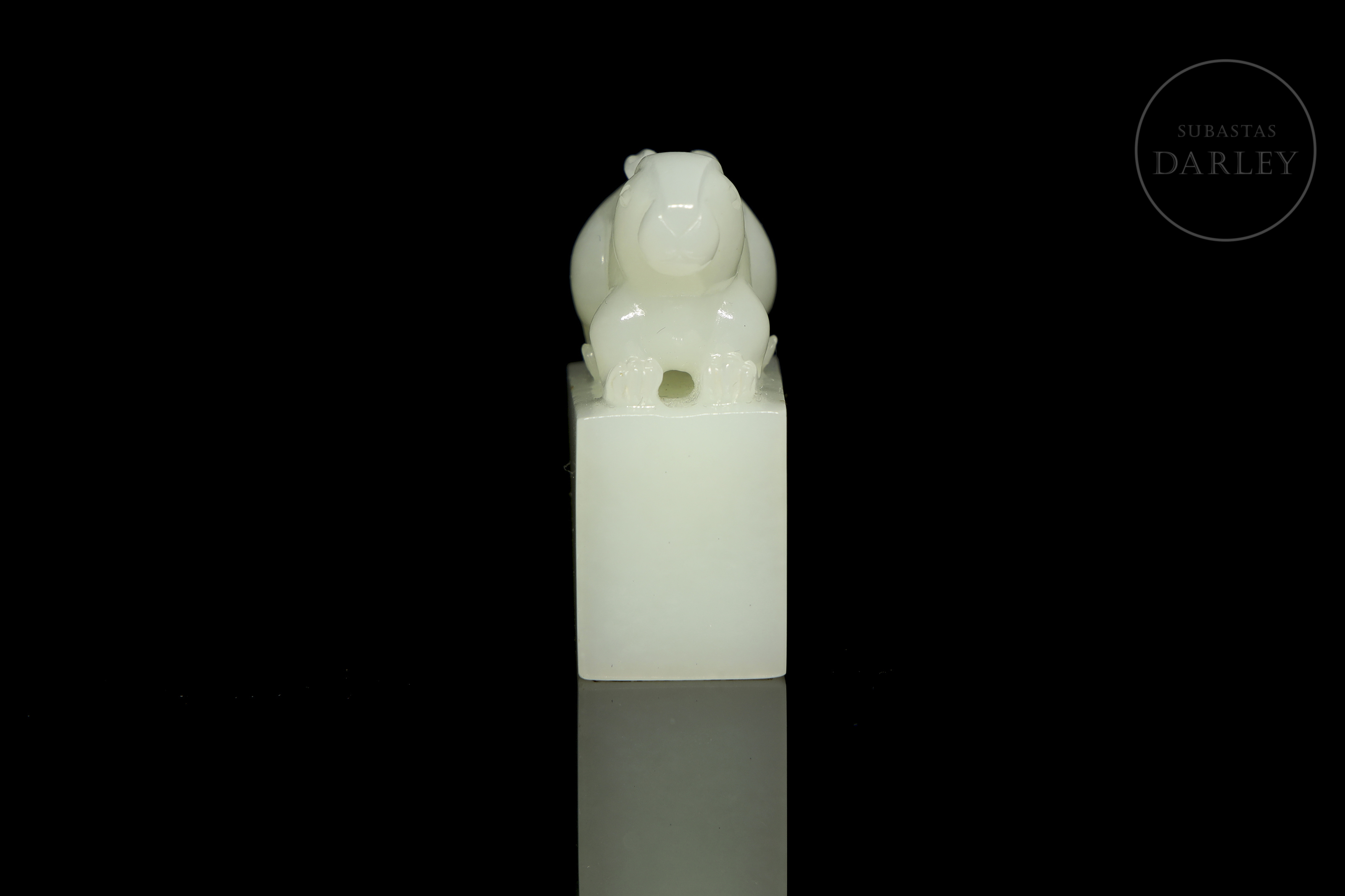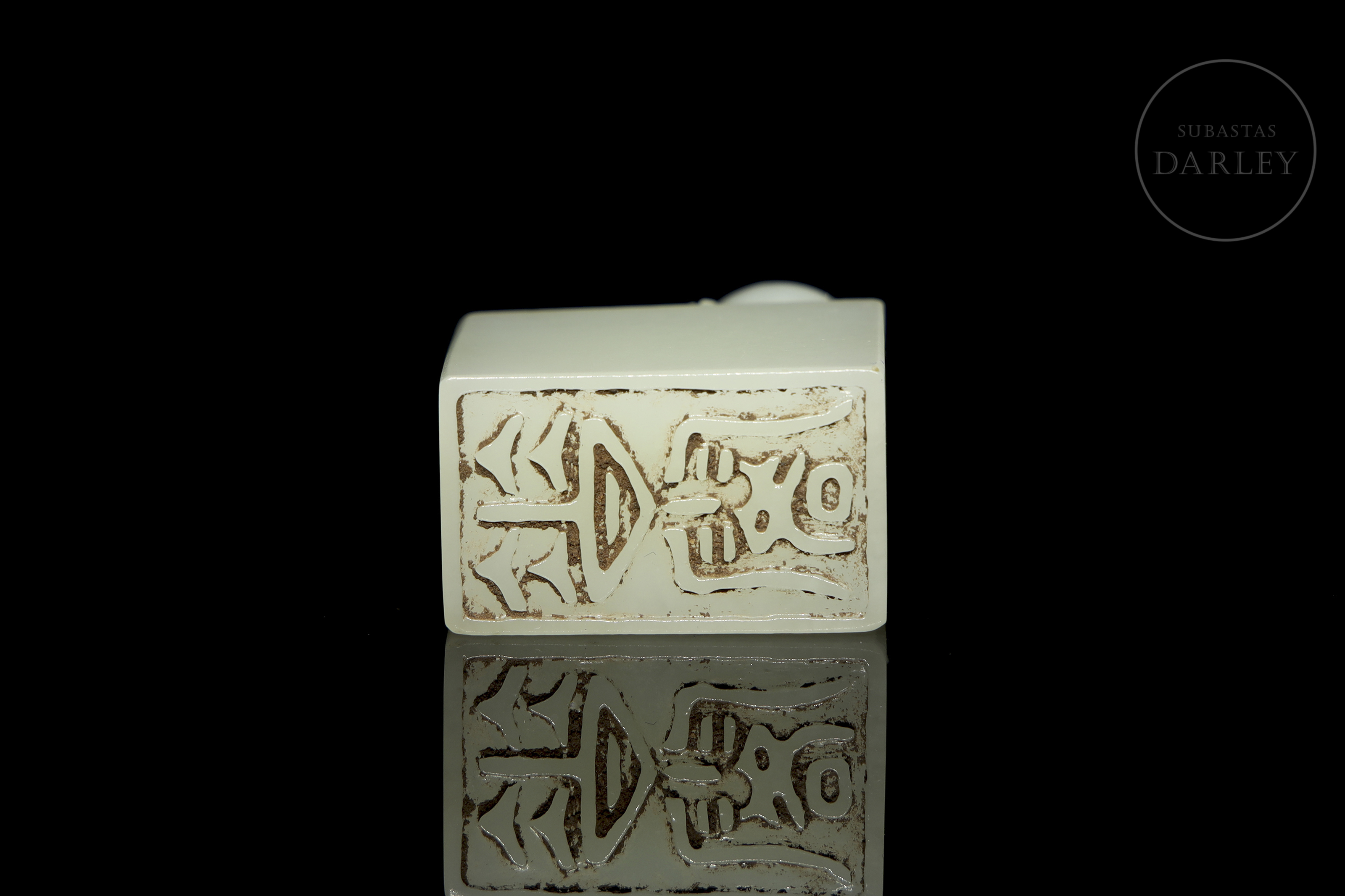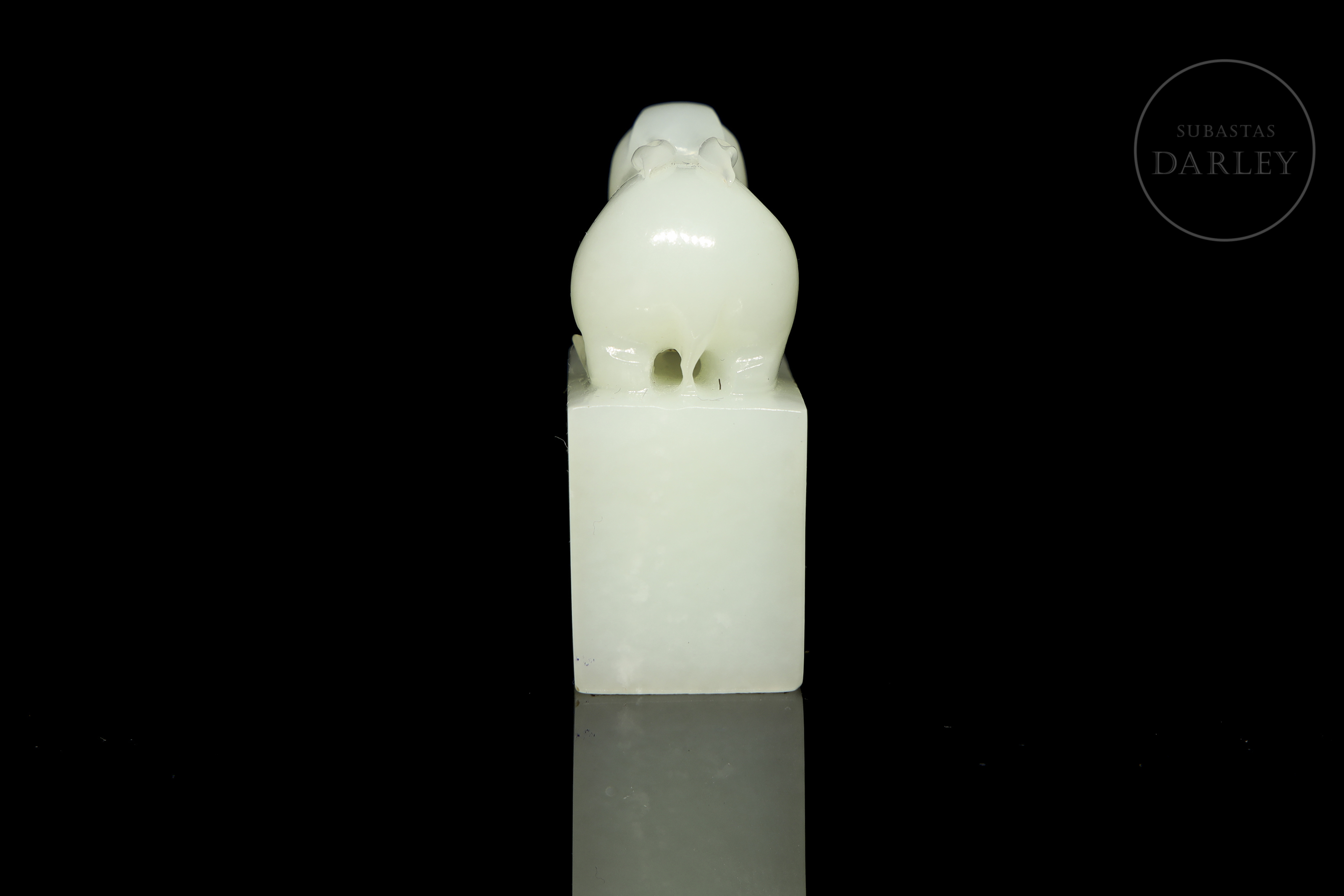 Sello rectangular, tallado en jade blanco. El agarre está esculpido en bulto redondo como una liebre en una pose recostada y compacta, con las orejas hacia atrás y patas flexionadas bajo el cuerpo. La matriz del sello revela una talla incisa de tres caracteres: "昔閣印". Dinastía Qing (1644-1912), periodo Qianlong (1736-1795).
