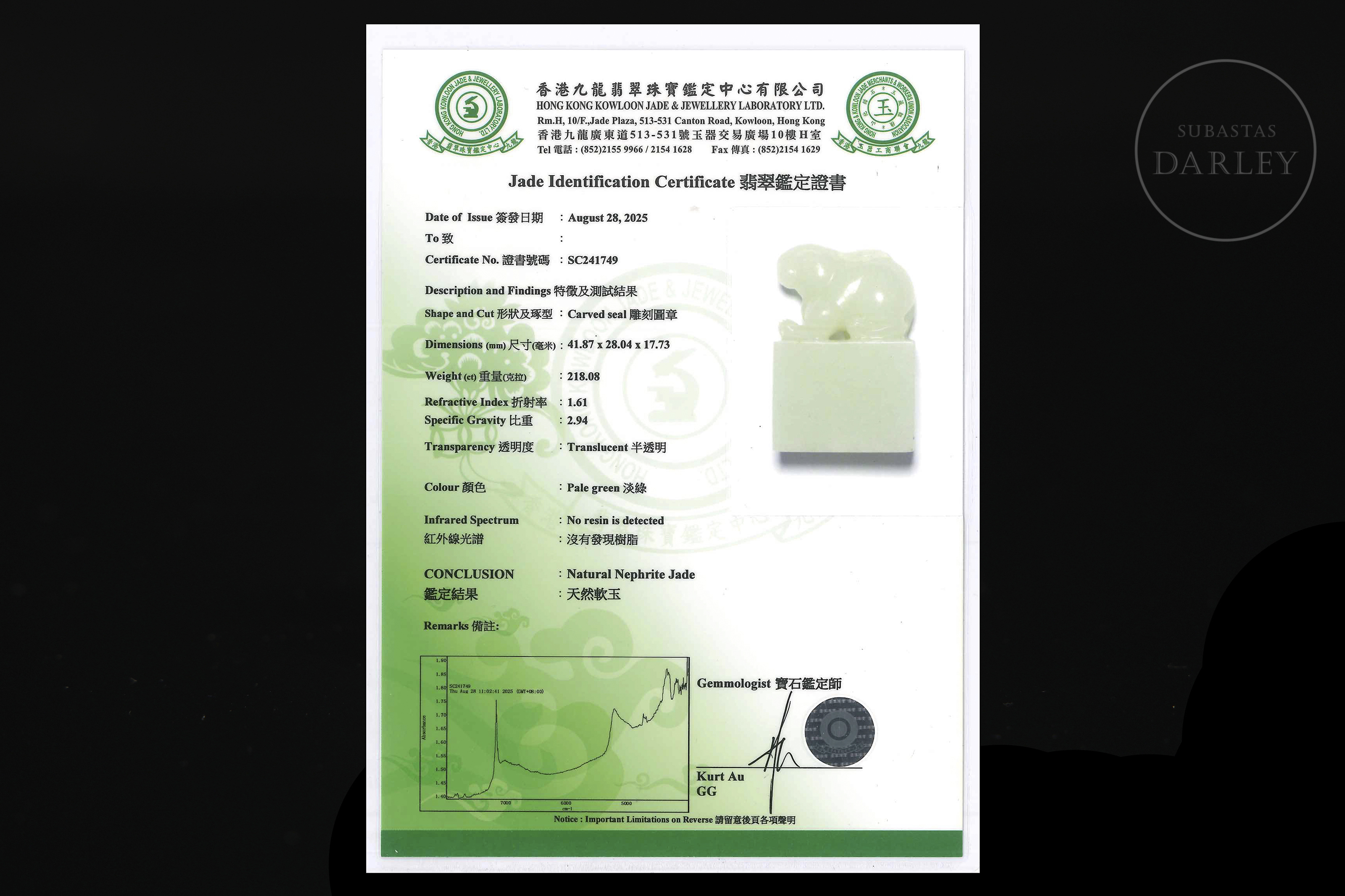 La pieza se acompaña de un certificado gemológico emitido por Hong Kong Kowloon Jade & Jewellery Laboratory LTD en el año 2025. SC241749.