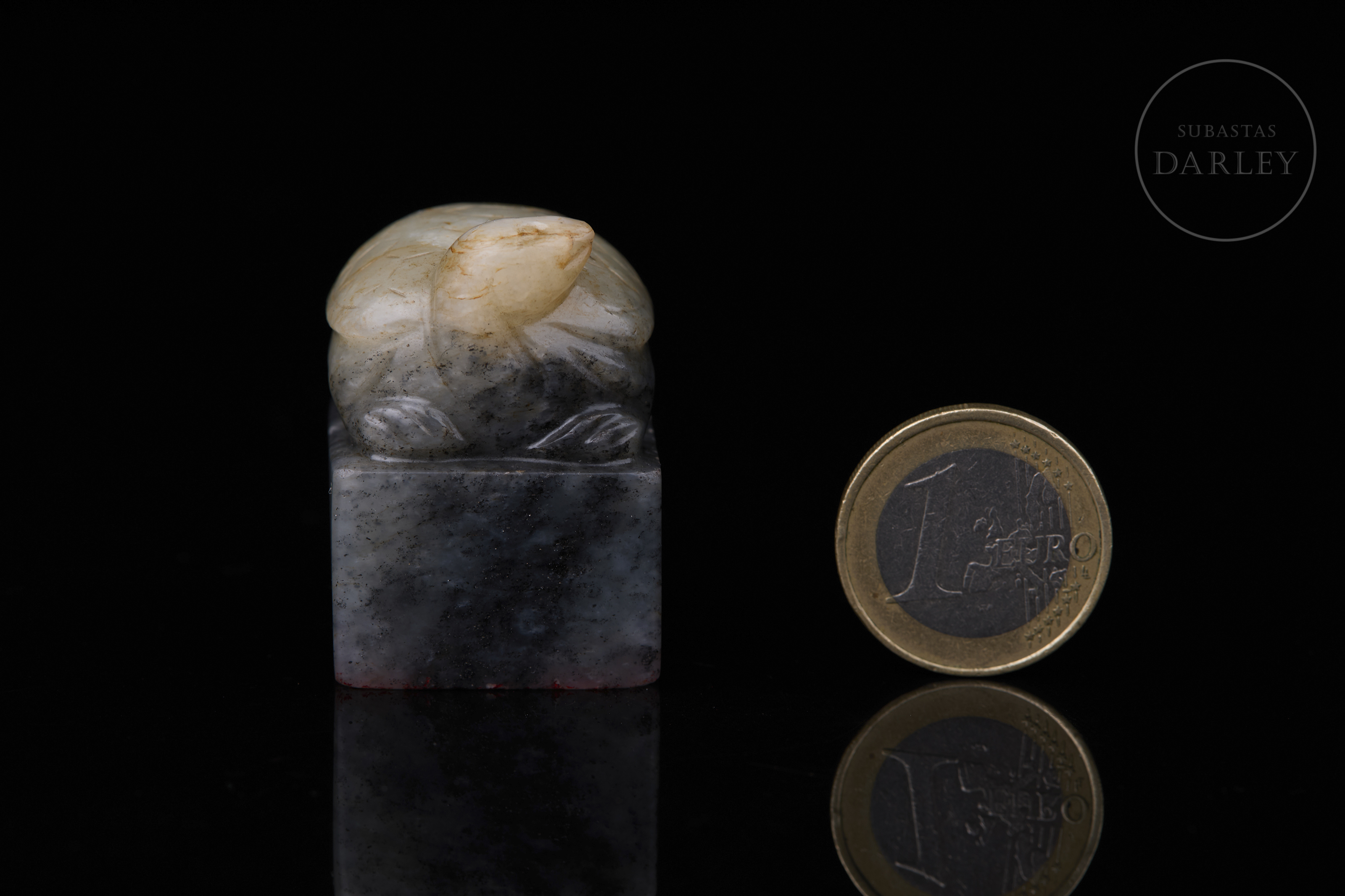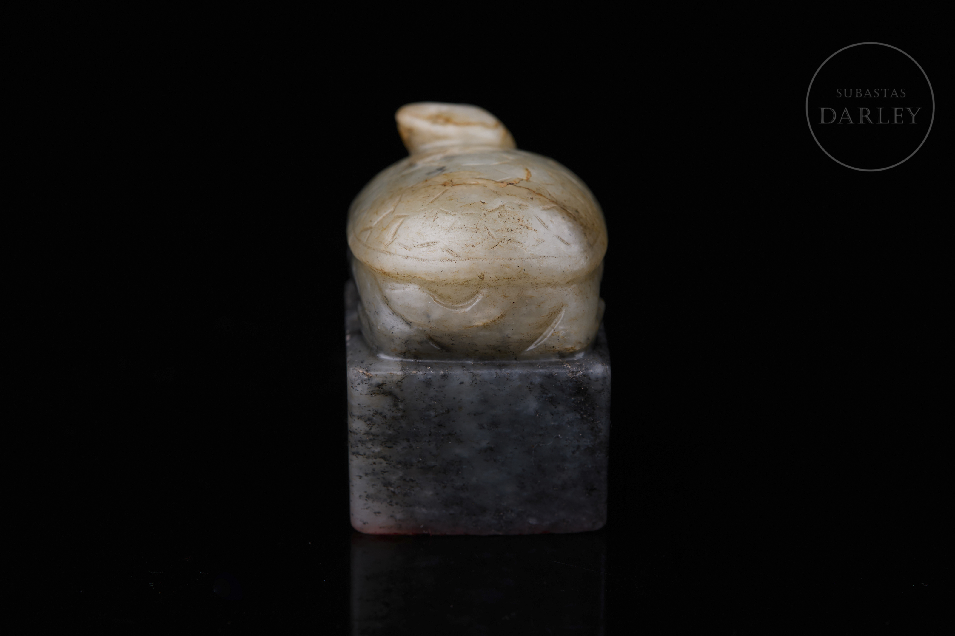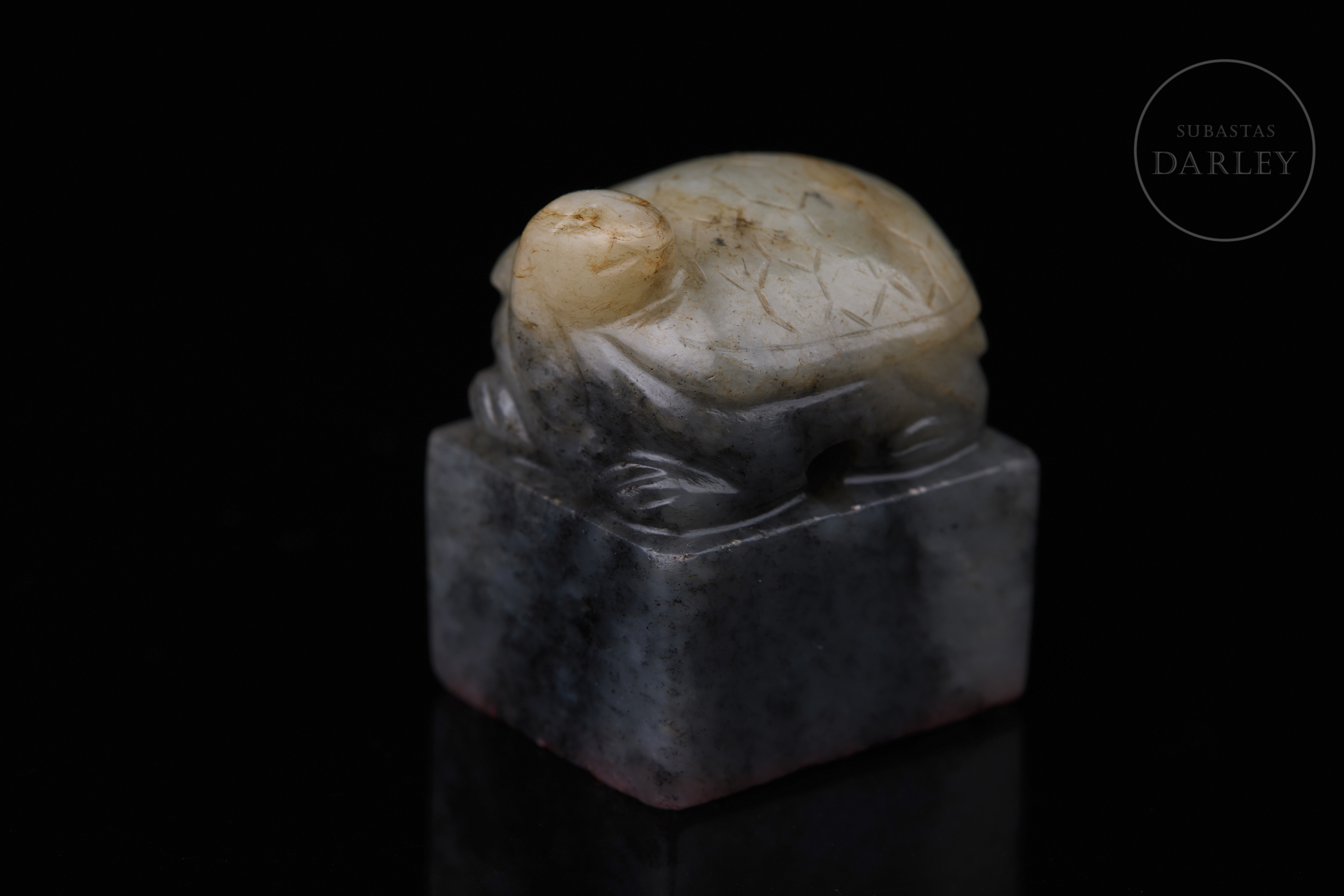 Sello tallado de jade de color gris oscuro jaspeado con vetas negras y blancas. Posee una base rectangular, rematada por una tortuga, de cabeza ladeada y caparazón adornado con patrones geométricos incisos. En la base se dispone un el sello "熙春物见升平" inciso. Dinastía Qing (1644-1912).