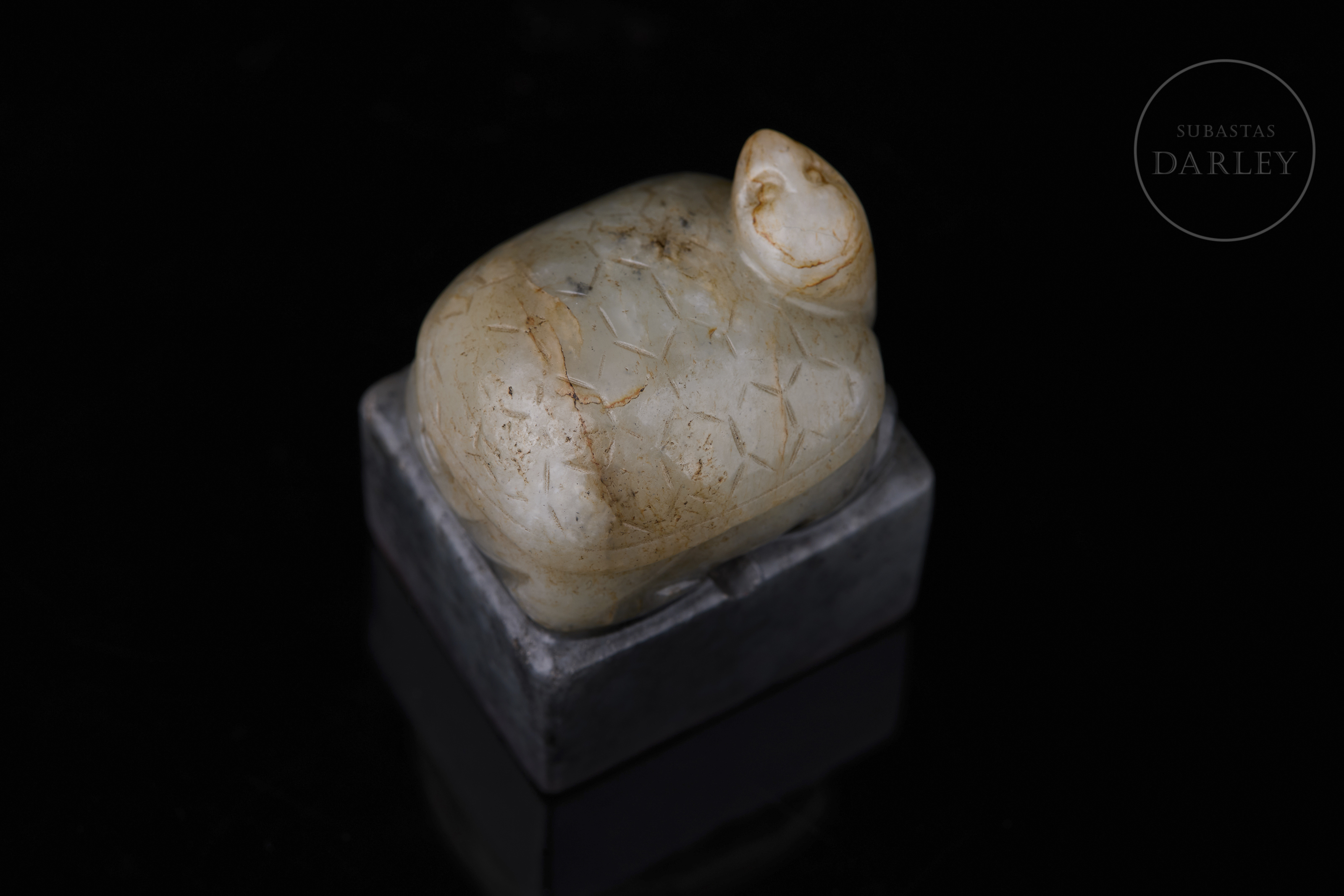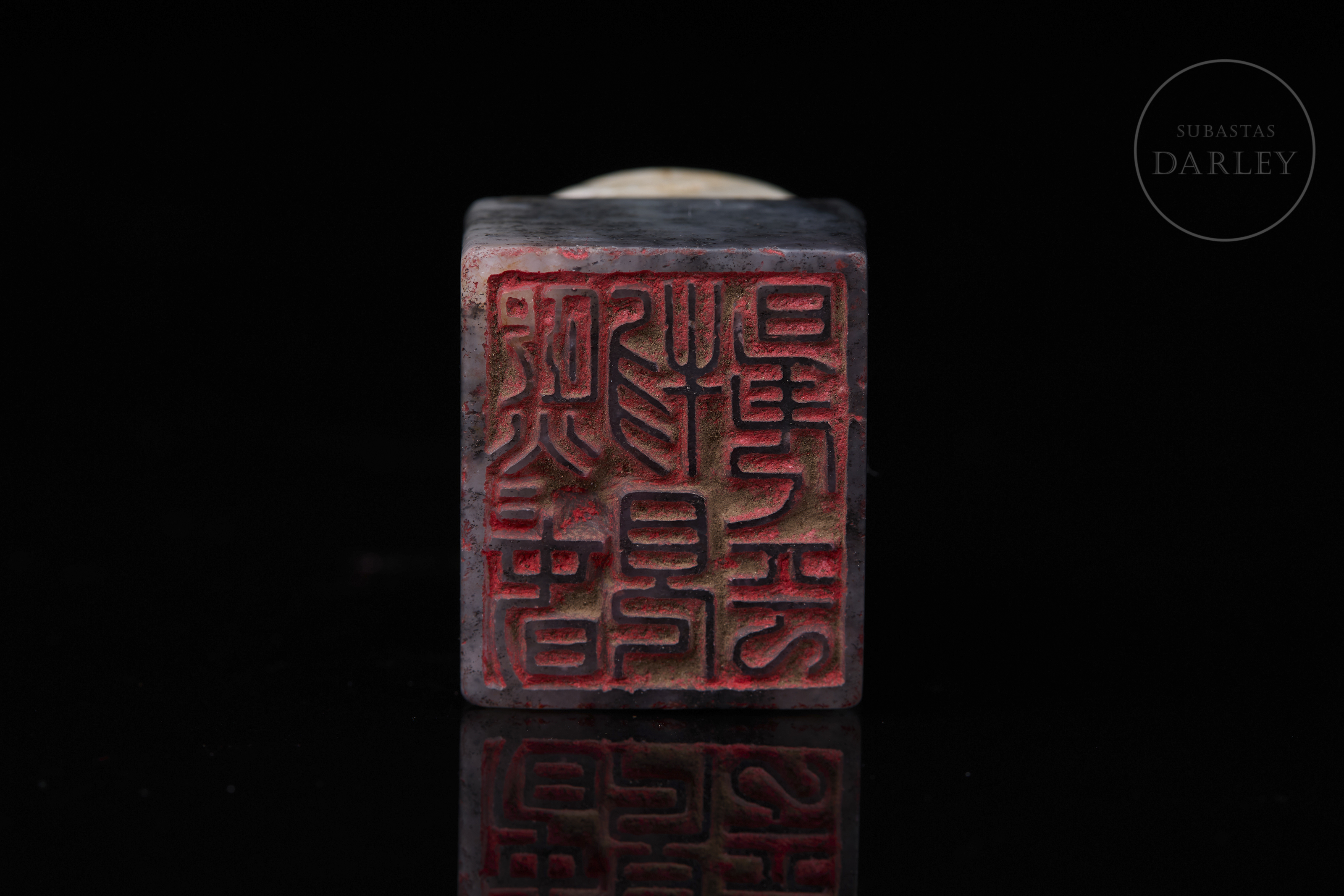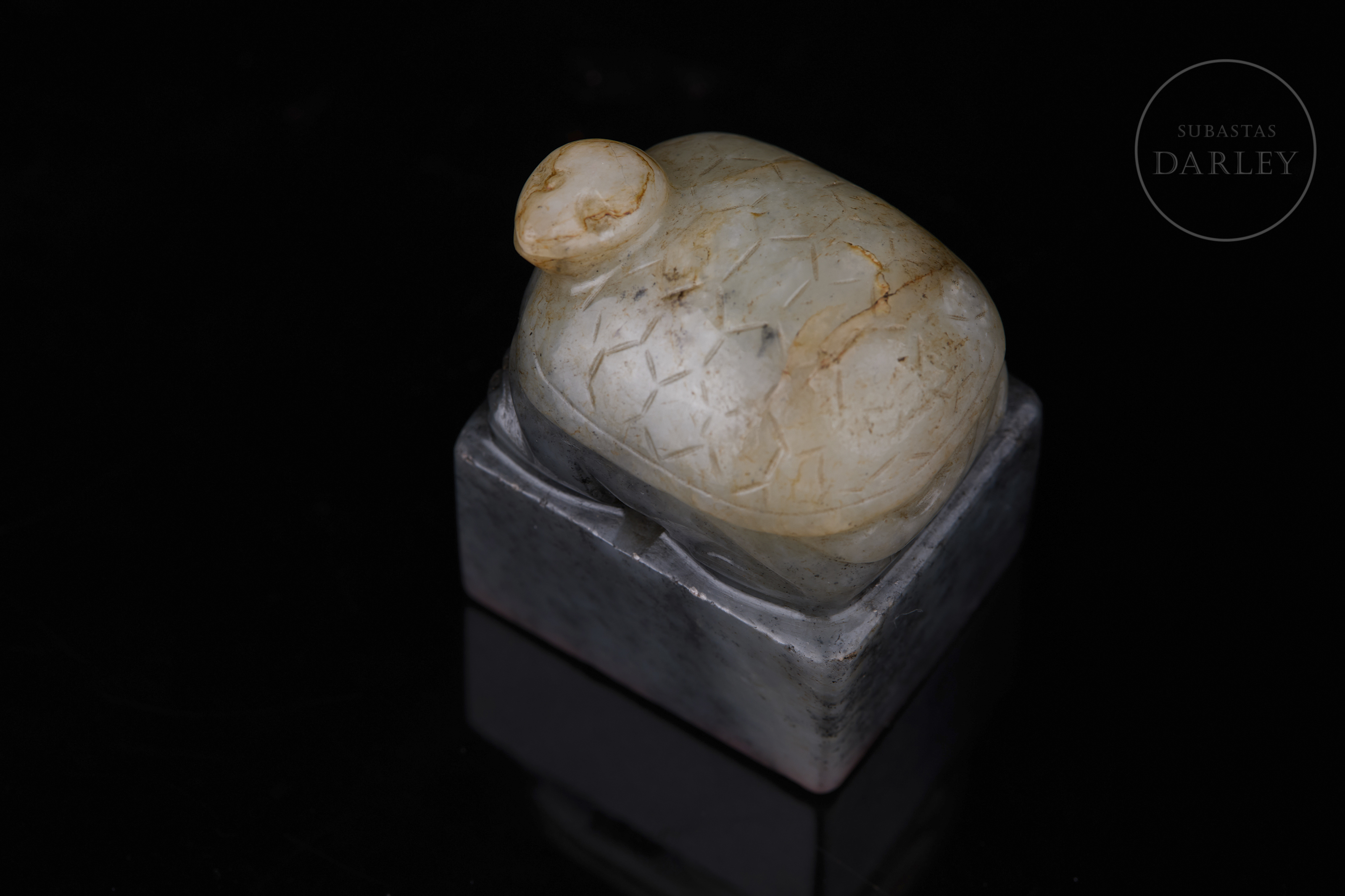 Sello tallado de jade de color gris oscuro jaspeado con vetas negras y blancas. Posee una base rectangular, rematada por una tortuga, de cabeza ladeada y caparazón adornado con patrones geométricos incisos. En la base se dispone un el sello "熙春物见升平" inciso. Dinastía Qing (1644-1912).