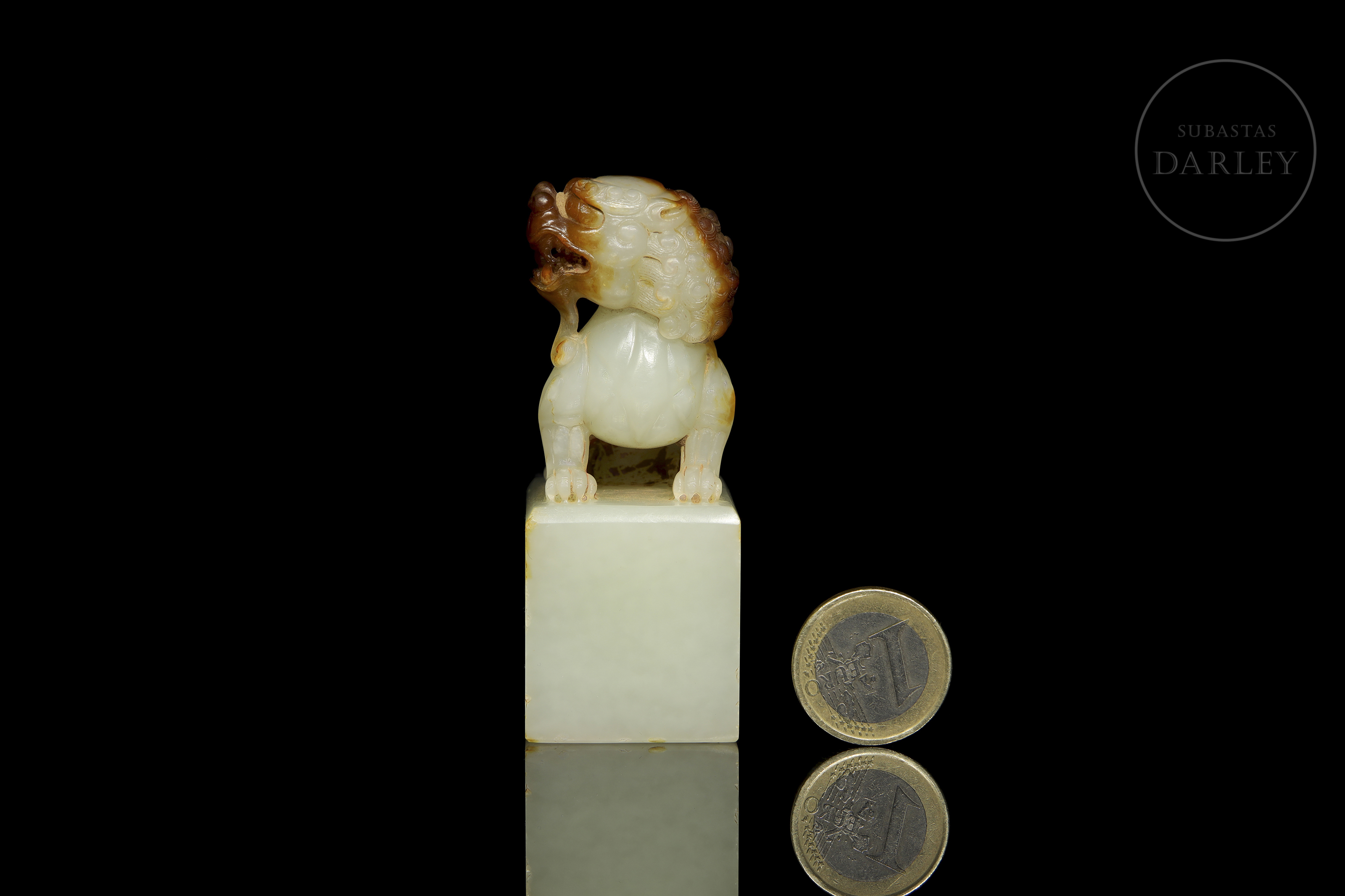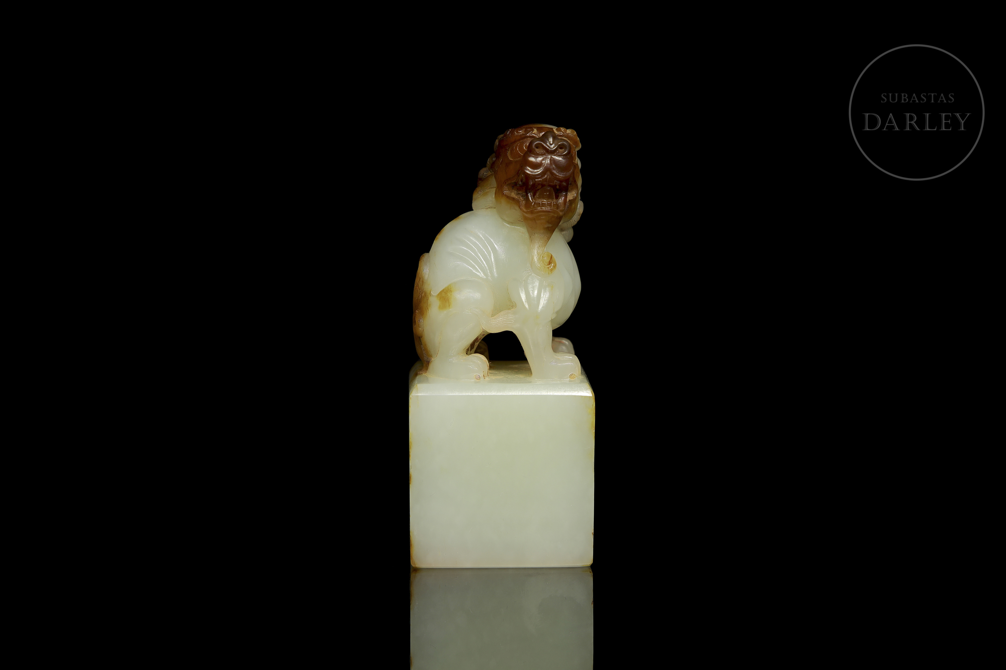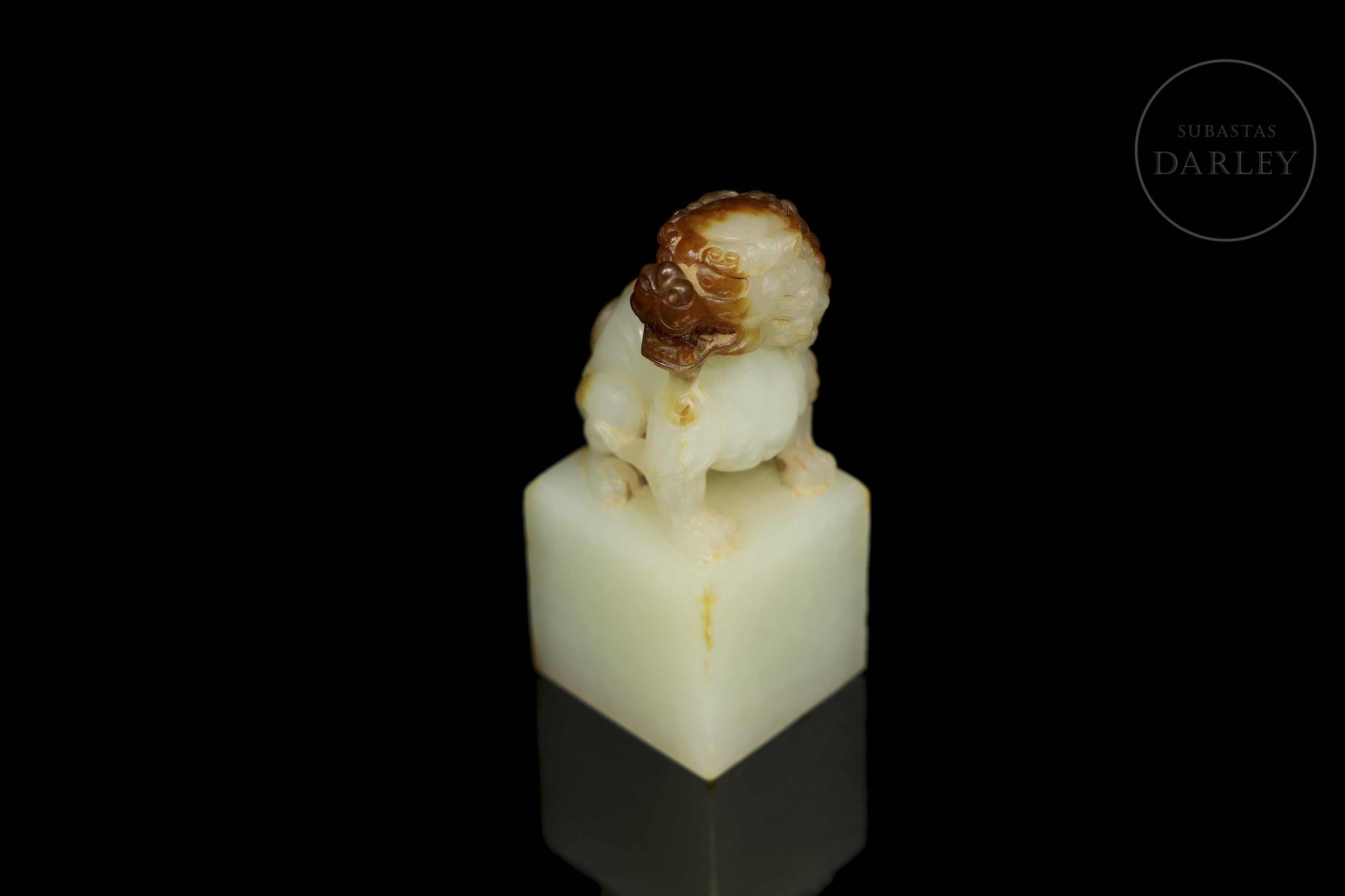 Realizado en nefrita de una tonalidad verde pálido, con zonas en tonos marrón y ámbar. La pieza está tallada con la figura de un "León Foo" sentado sobre una base cuadrangular. La criatura exhibe una expresión poderosa, con melena rizada, expresión feroz y fauces abiertas. En la base, presenta la inscripción incisa "平东大将军印". Con pátina por antigüedad. Dinastía Ming (1368–1644).