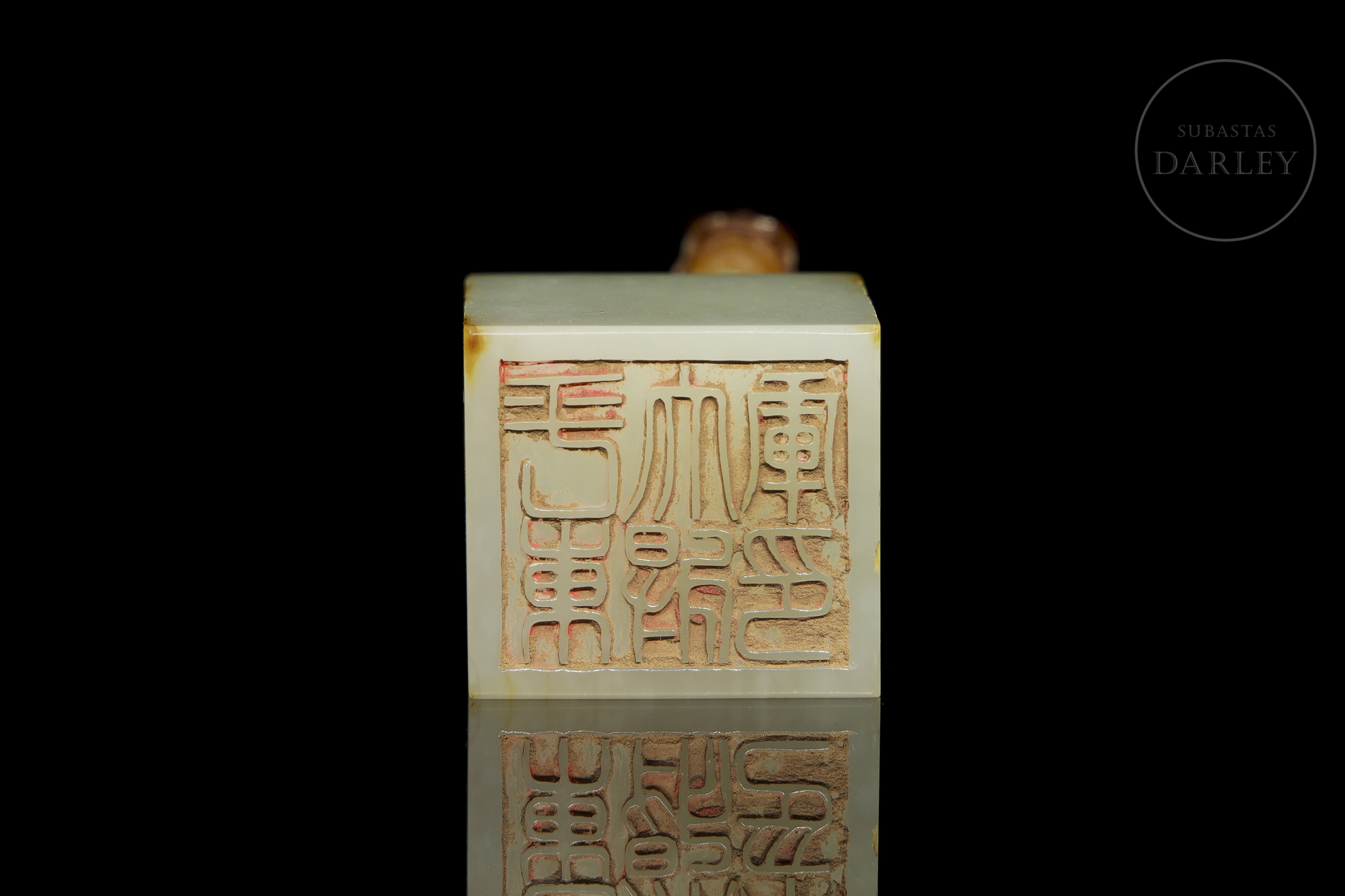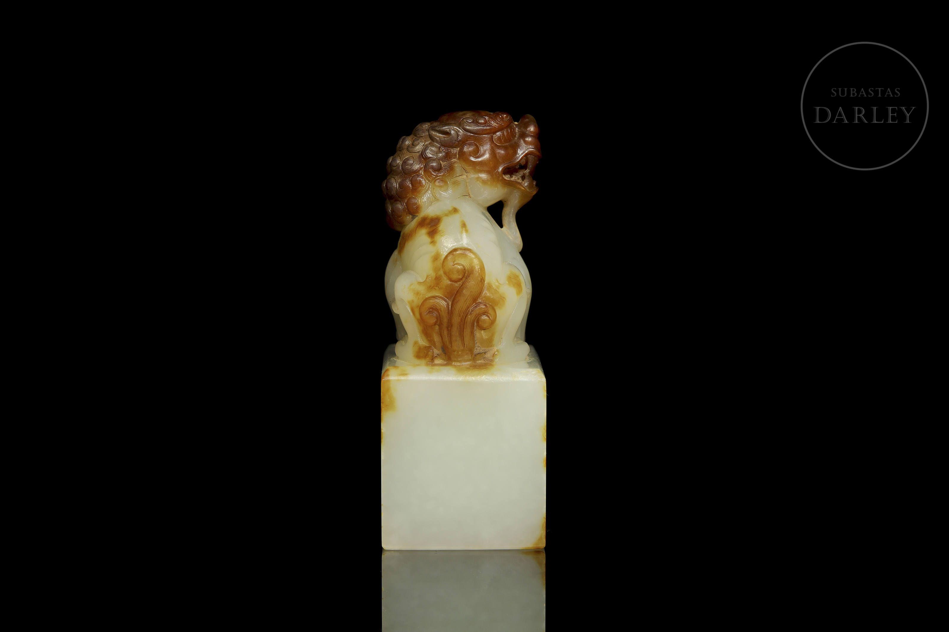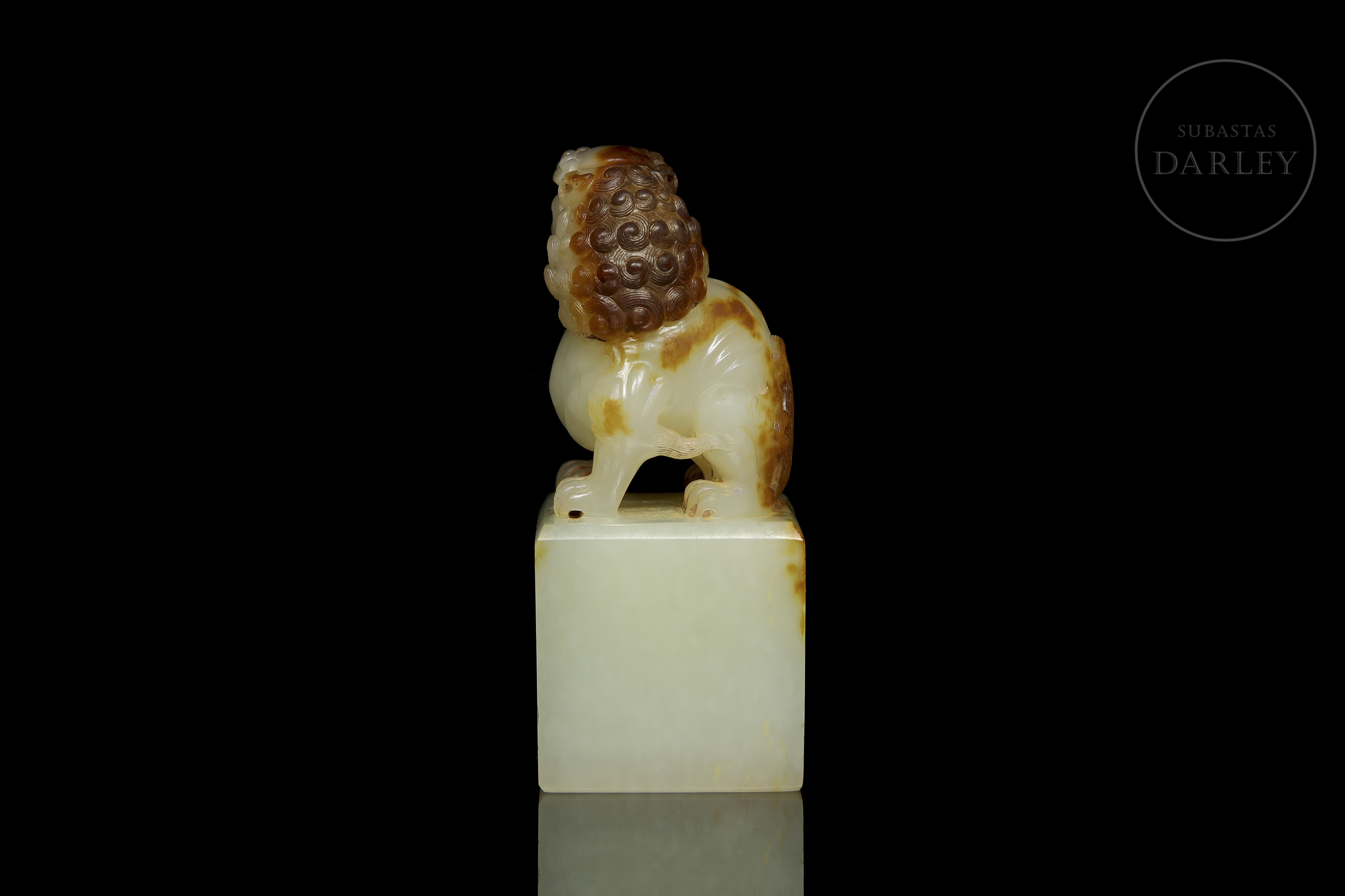 Realizado en nefrita de una tonalidad verde pálido, con zonas en tonos marrón y ámbar. La pieza está tallada con la figura de un "León Foo" sentado sobre una base cuadrangular. La criatura exhibe una expresión poderosa, con melena rizada, expresión feroz y fauces abiertas. En la base, presenta la inscripción incisa "平东大将军印". Con pátina por antigüedad. Dinastía Ming (1368–1644).