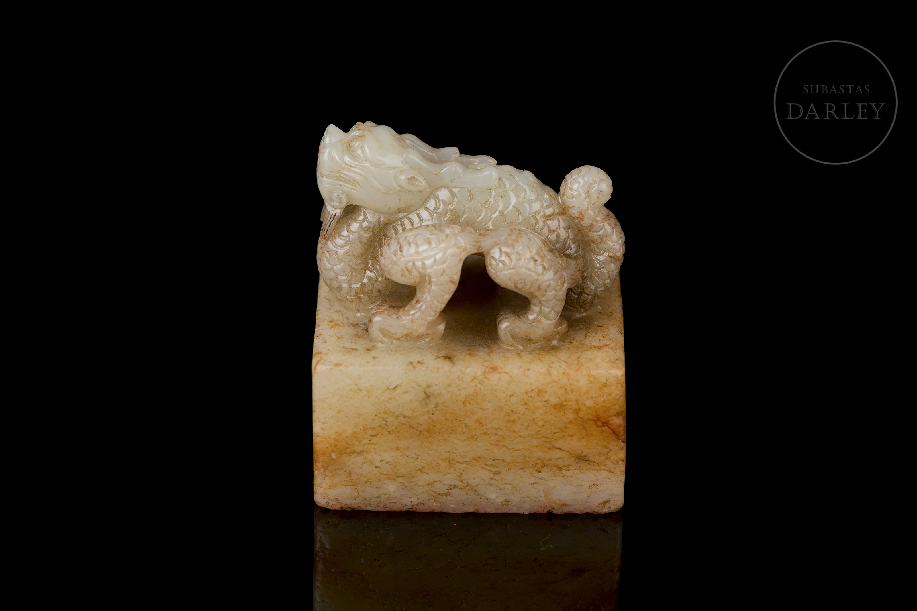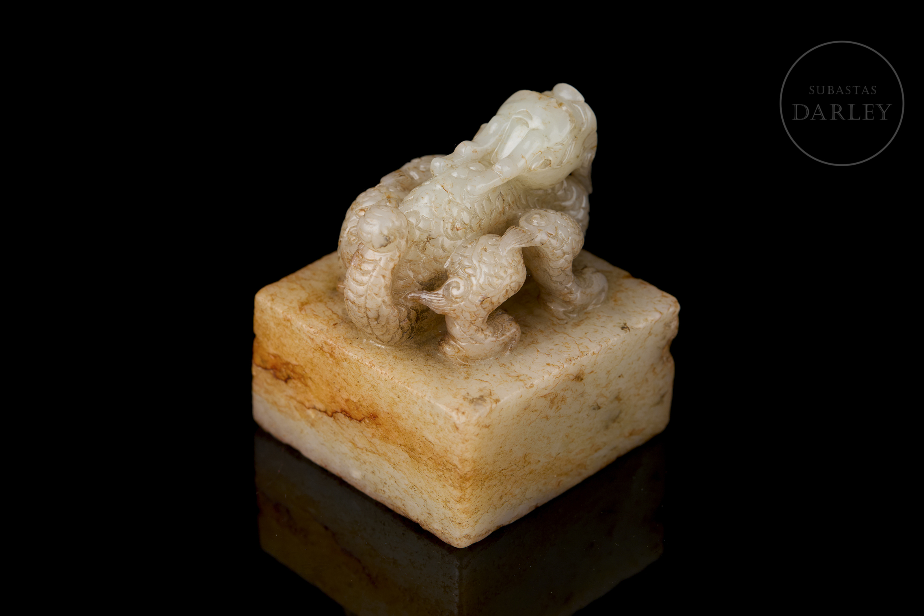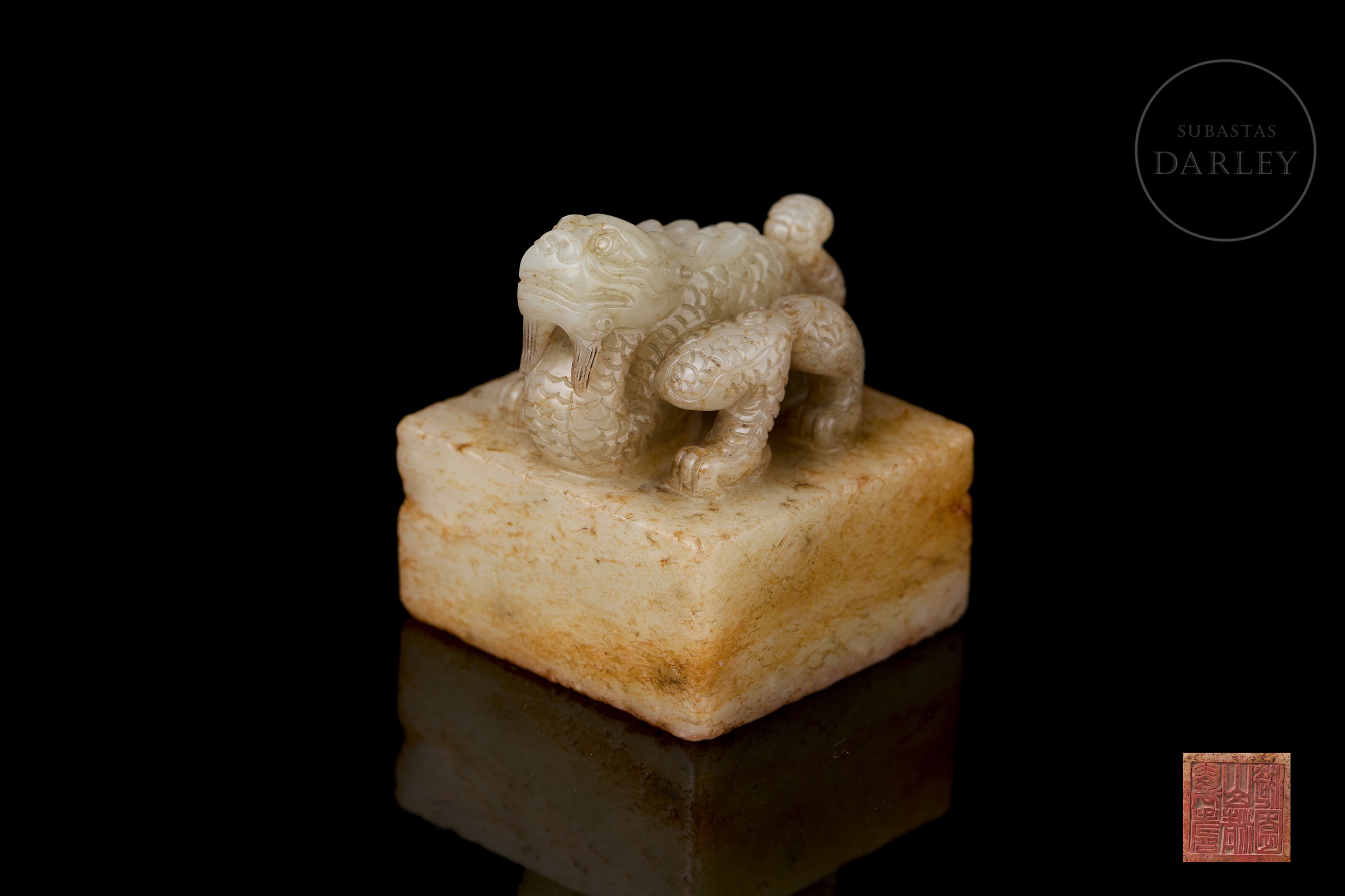 Sello de jade de base cuadrada, tallado en una piedra de color ocre de buena translucidez, con vetas rojizas. El remate superior está potentemente esculpido con la figura de un dragón imperial de cuerpo sinuoso y escamado, y expresión feroz. La base presenta un sello de seis caracteres realizado en bajorrelieve "万寿山清漪园".