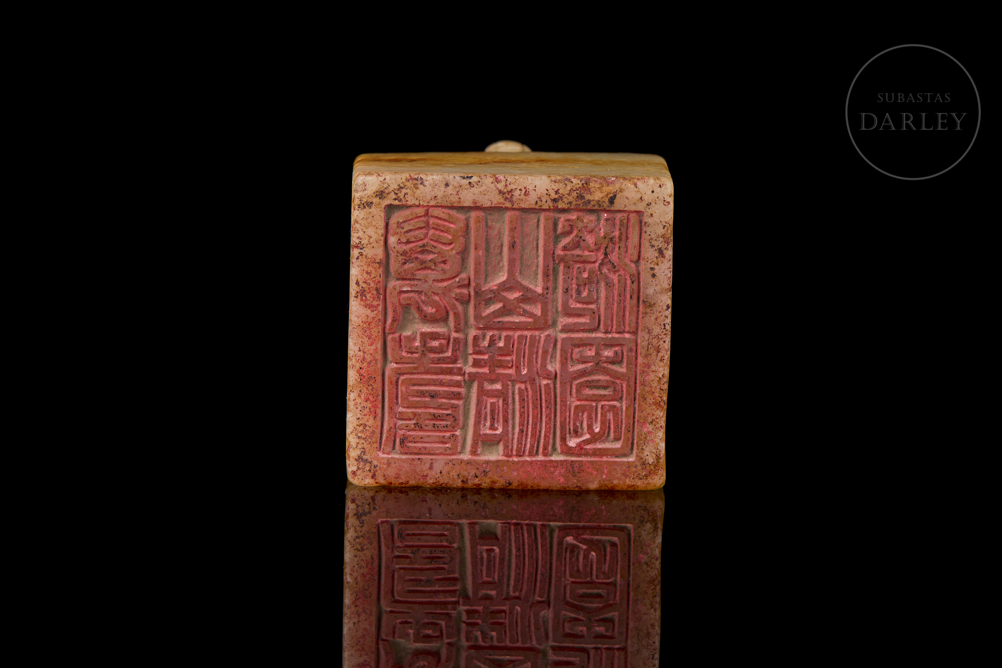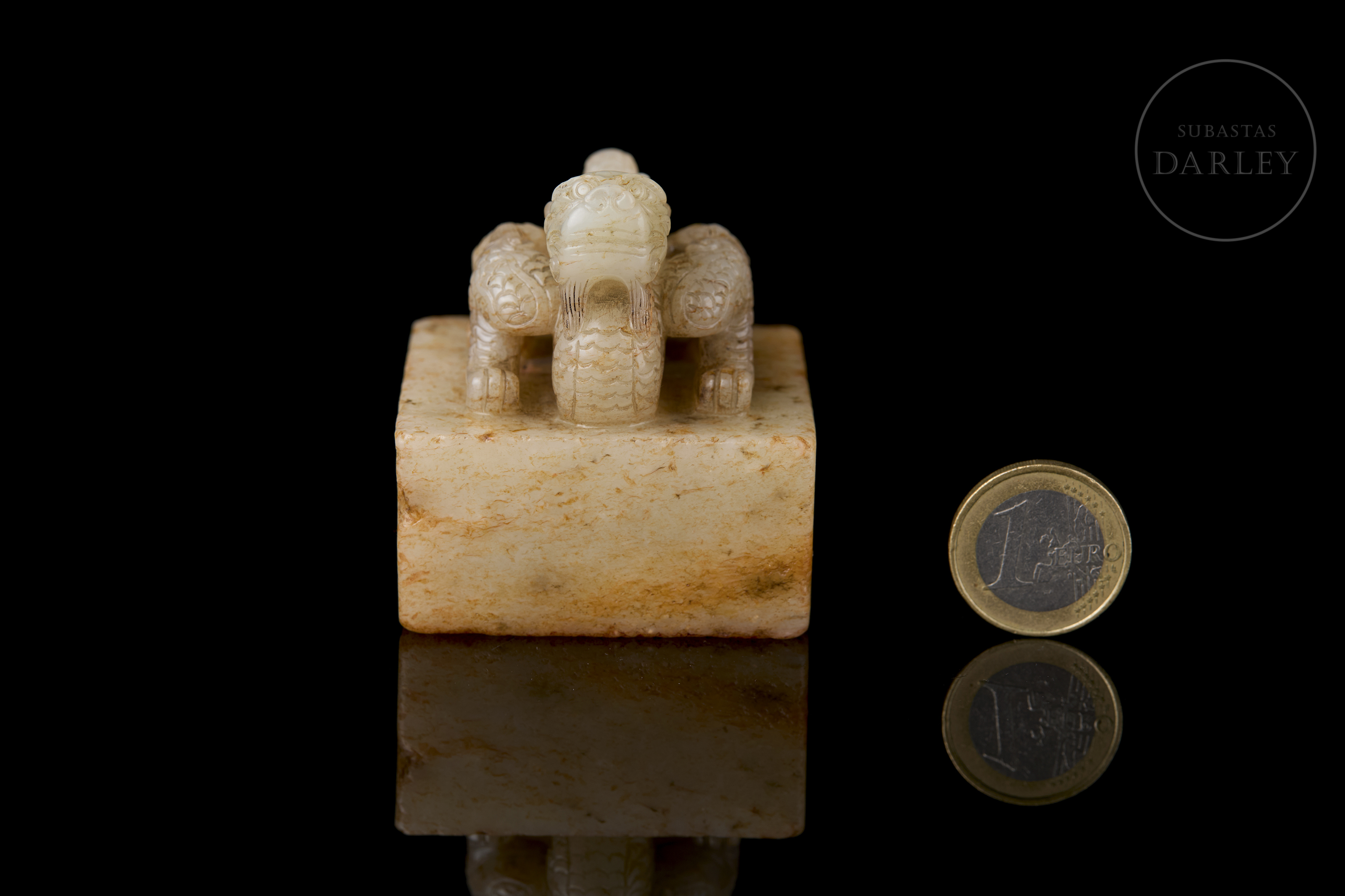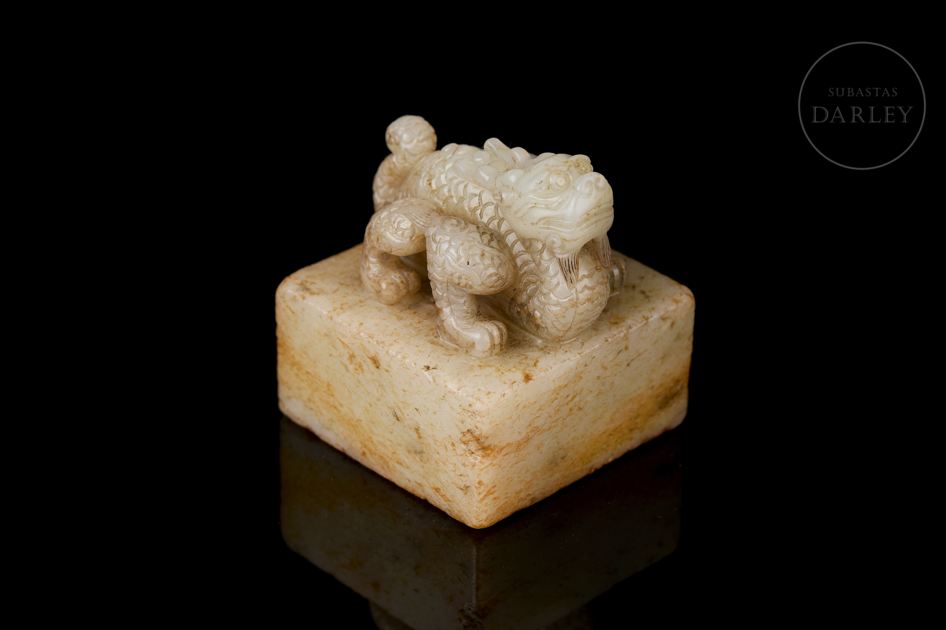 Sello de jade de base cuadrada, tallado en una piedra de color ocre de buena translucidez, con vetas rojizas. El remate superior está potentemente esculpido con la figura de un dragón imperial de cuerpo sinuoso y escamado, y expresión feroz. La base presenta un sello de seis caracteres realizado en bajorrelieve "万寿山清漪园".