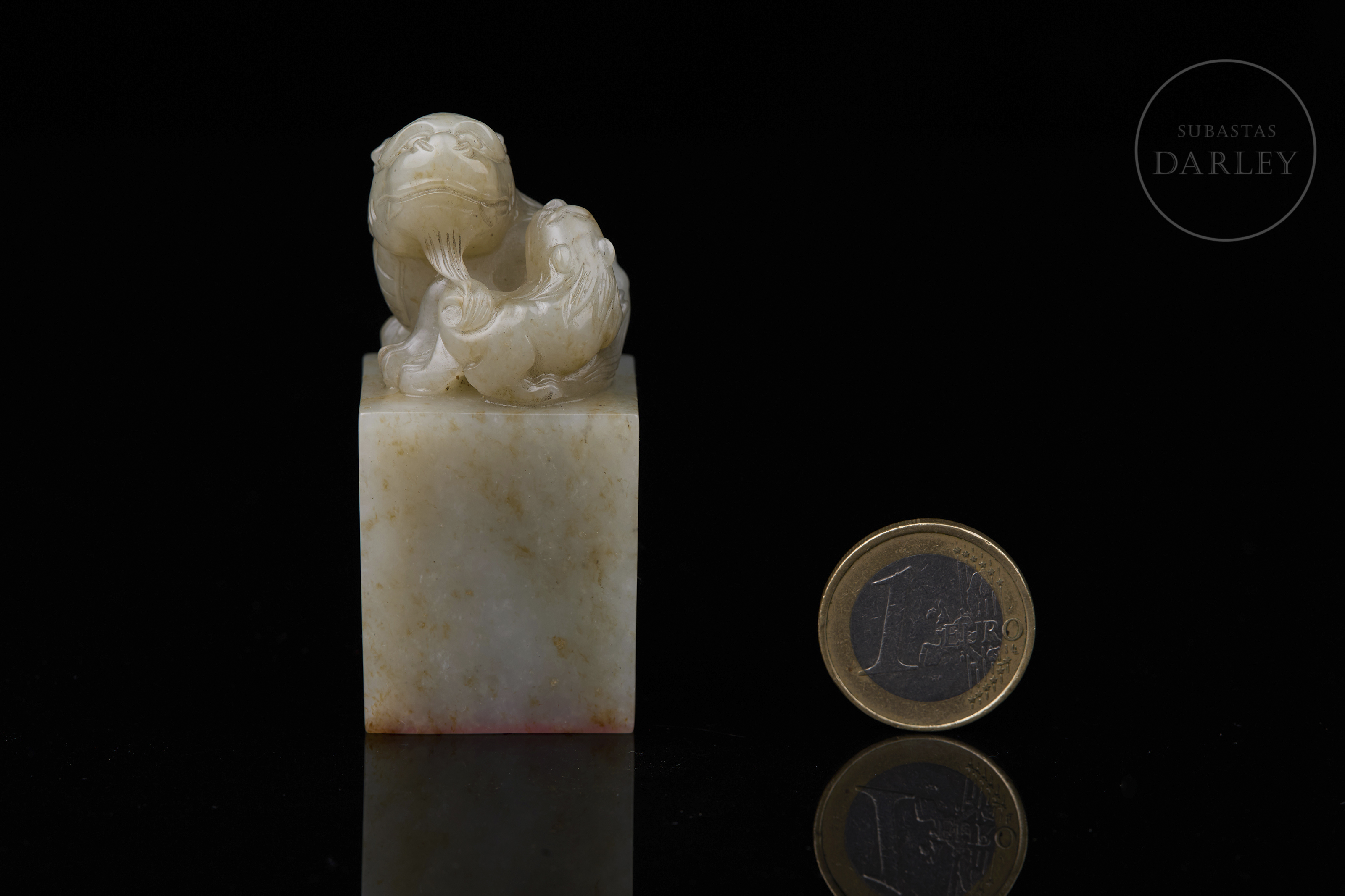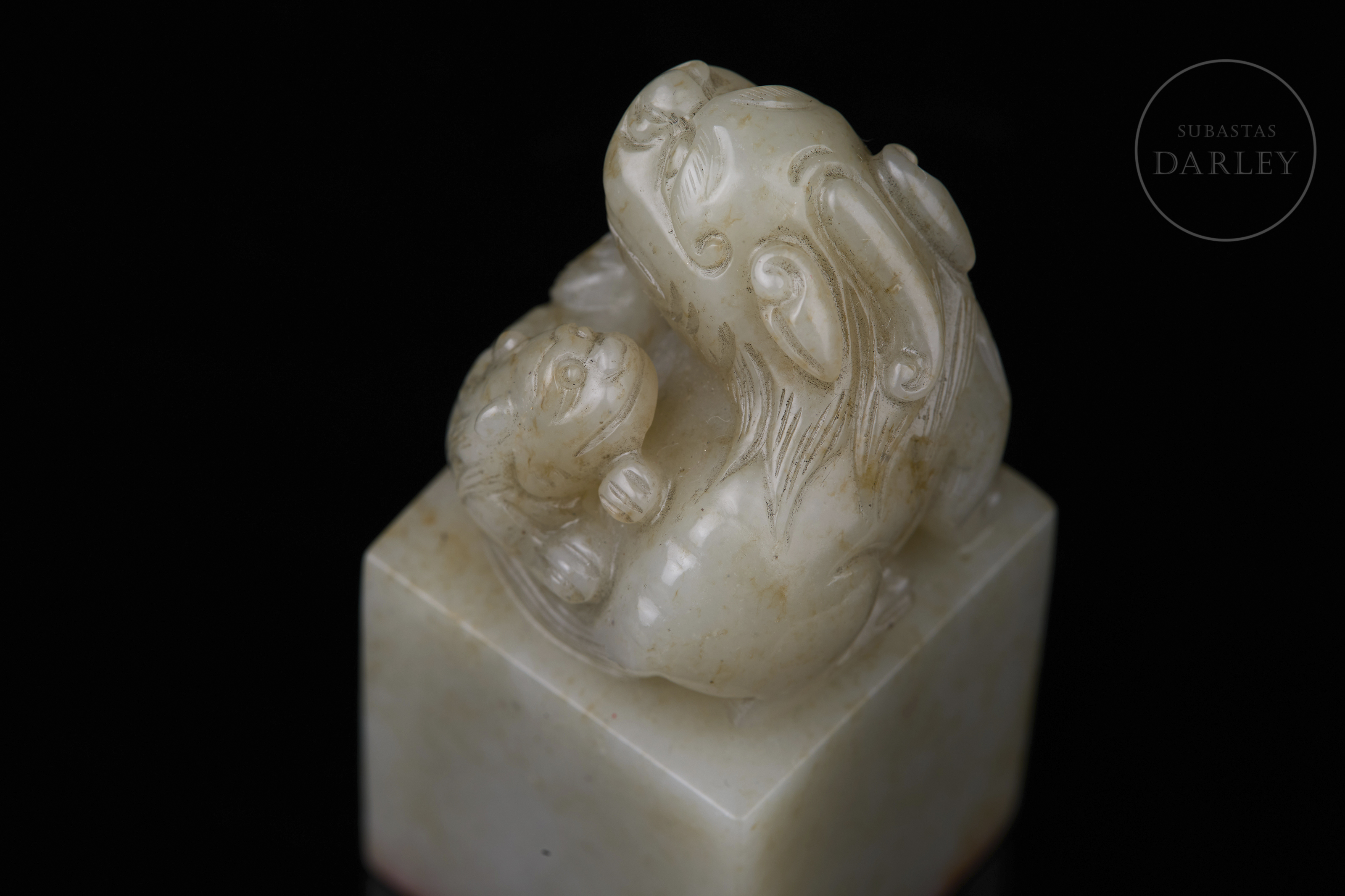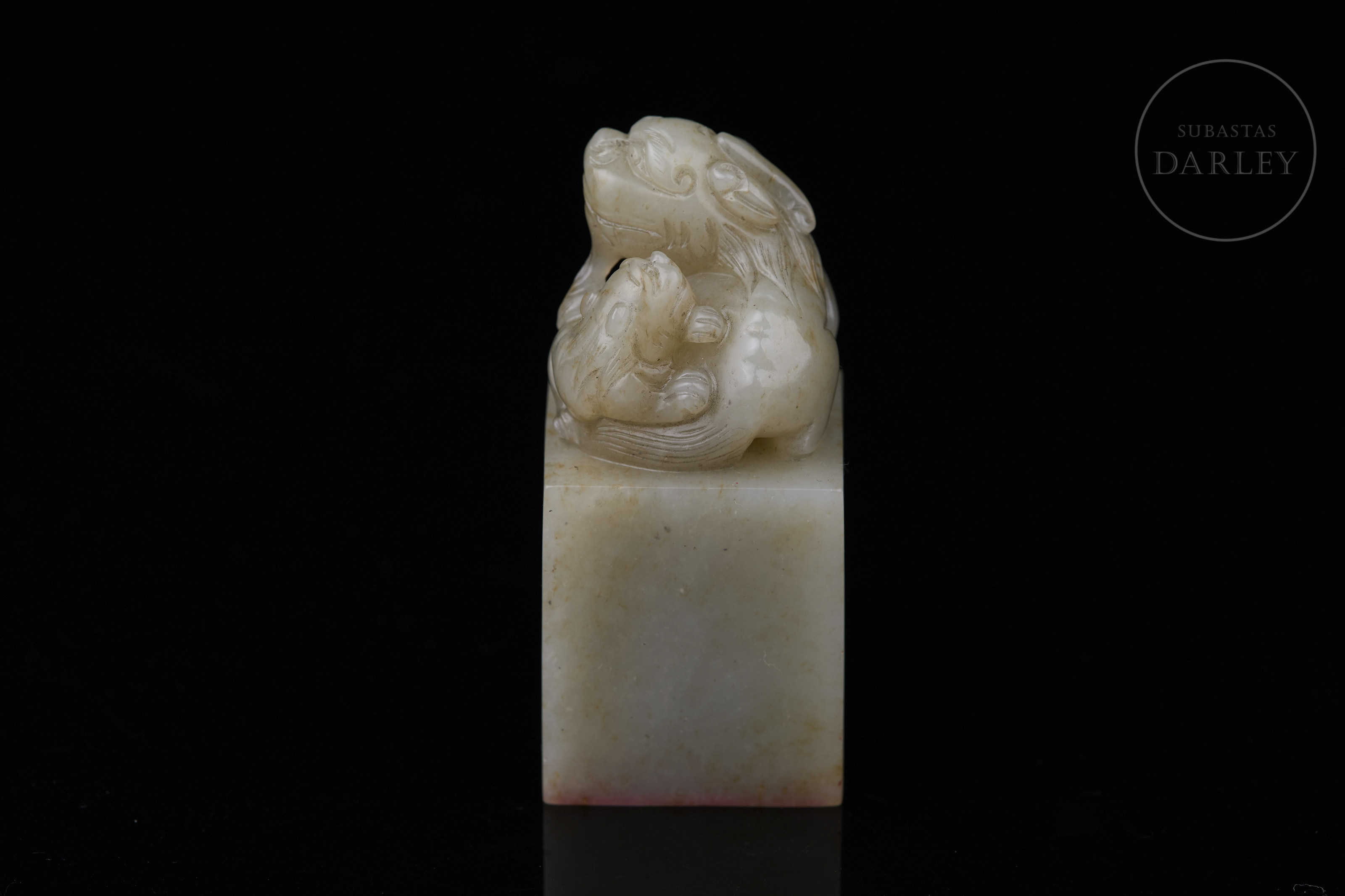 Sello tallado de jade de color grisáceo, y base rectangular. Se encuentra adornado por un león con su cría. El león adulto se sienta erguido, con una frondosa melena, y una pequeña cría trepa por su lomo. La matriz muestra una inscripción de caracteres grabados y restos de lacre rojo. Dinastía Qing (1644–1912).