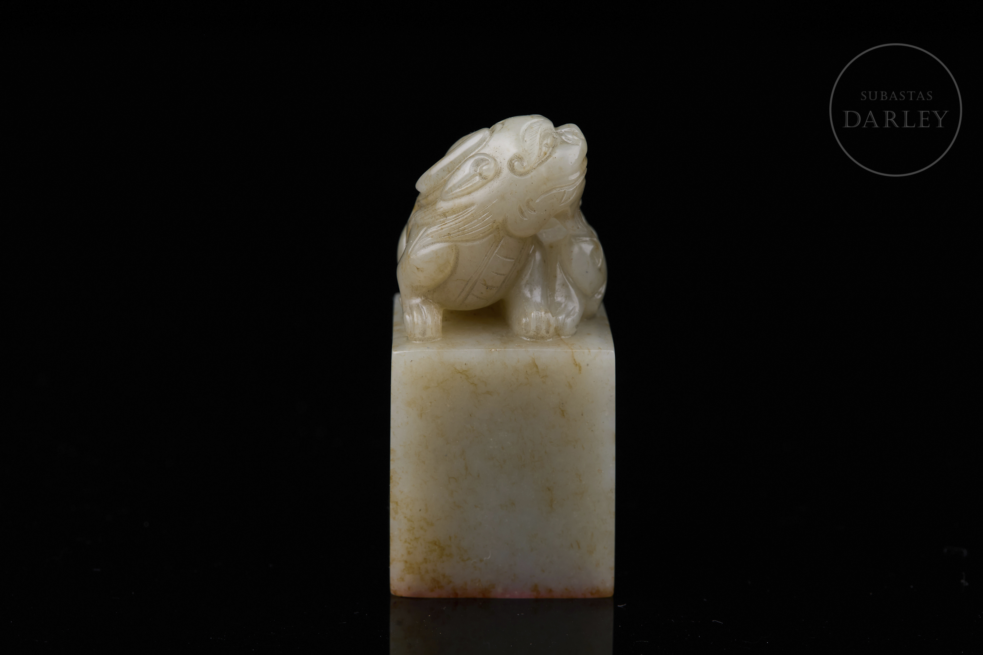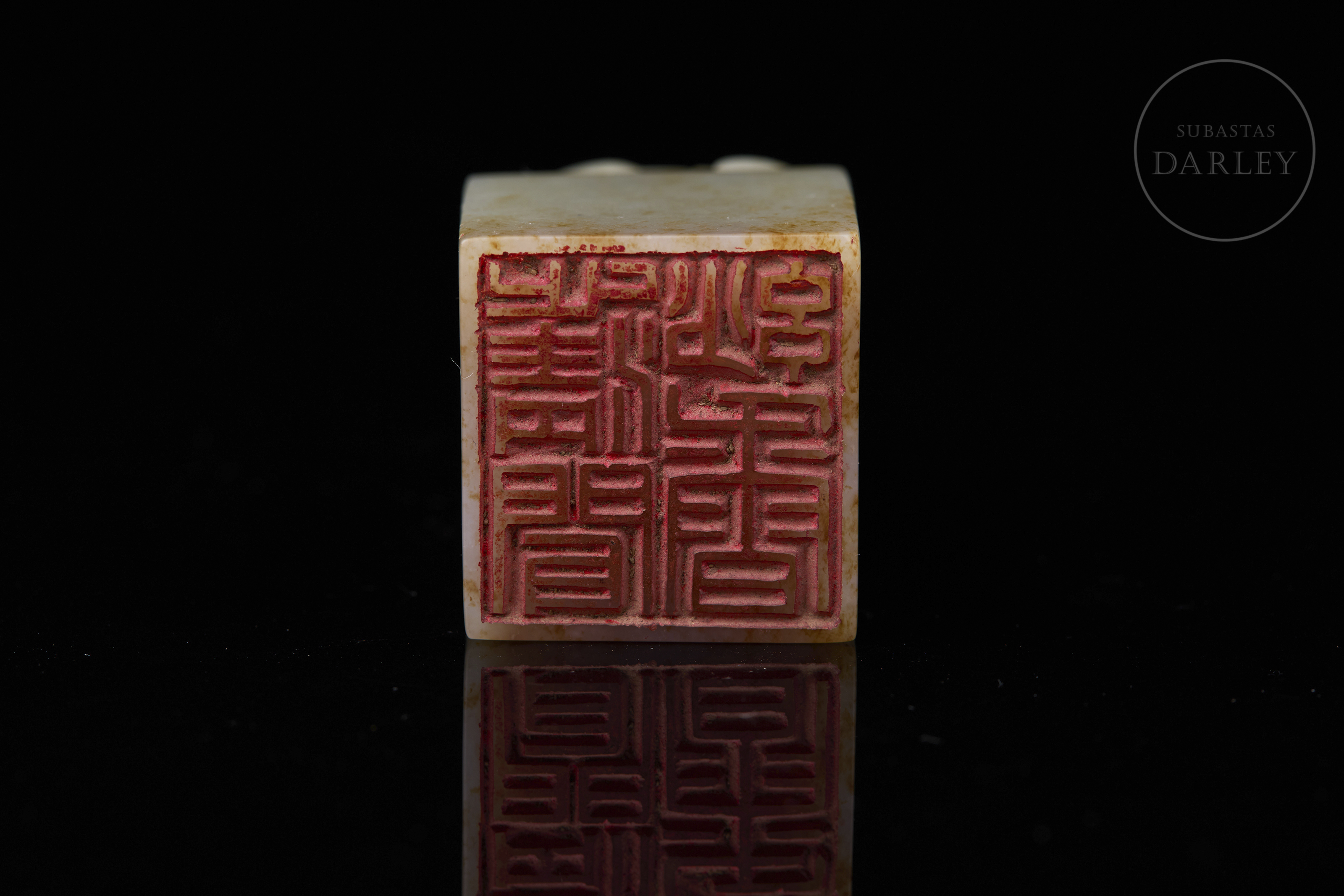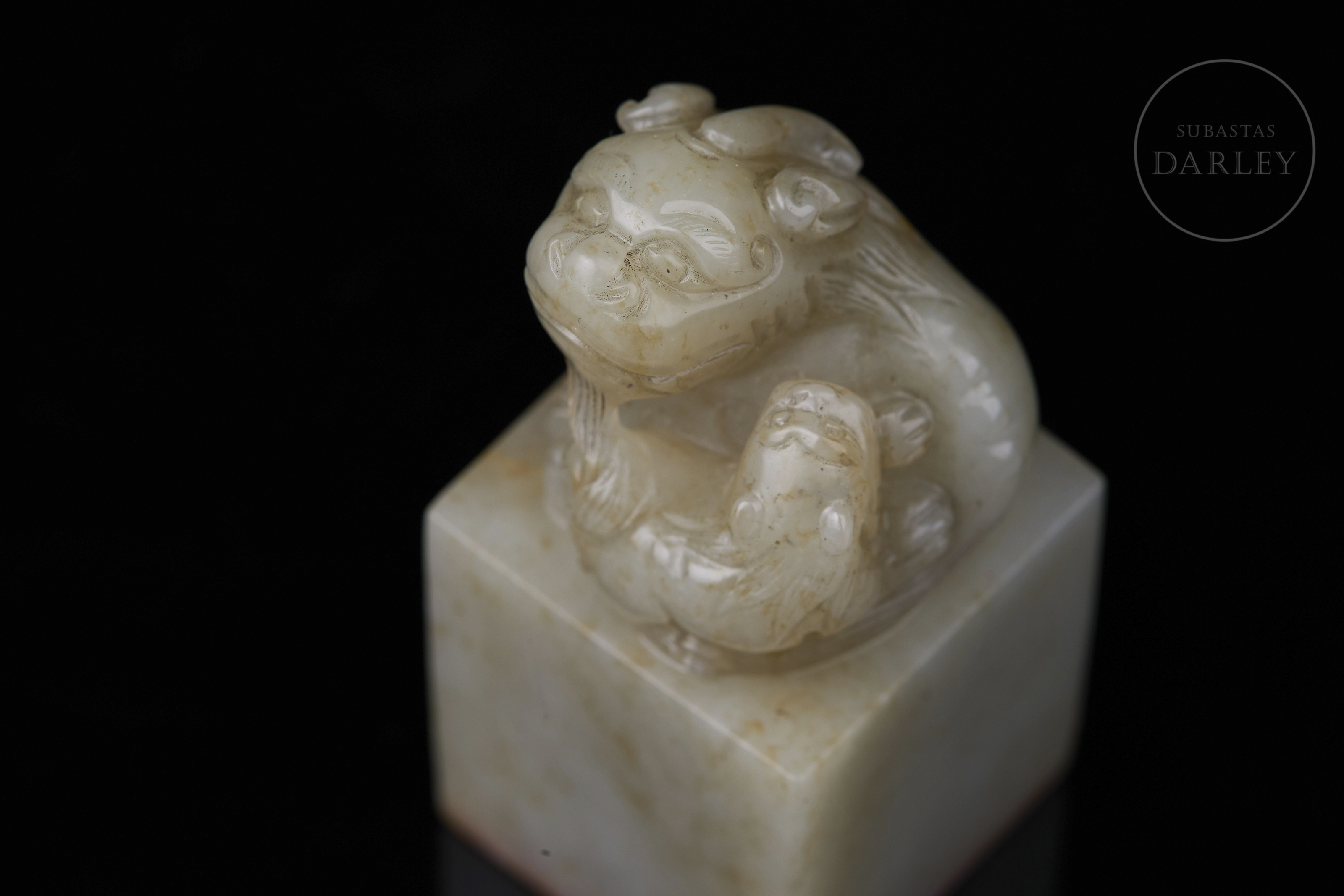 Sello tallado de jade de color grisáceo, y base rectangular. Se encuentra adornado por un león con su cría. El león adulto se sienta erguido, con una frondosa melena, y una pequeña cría trepa por su lomo. La matriz muestra una inscripción de caracteres grabados y restos de lacre rojo. Dinastía Qing (1644–1912).
