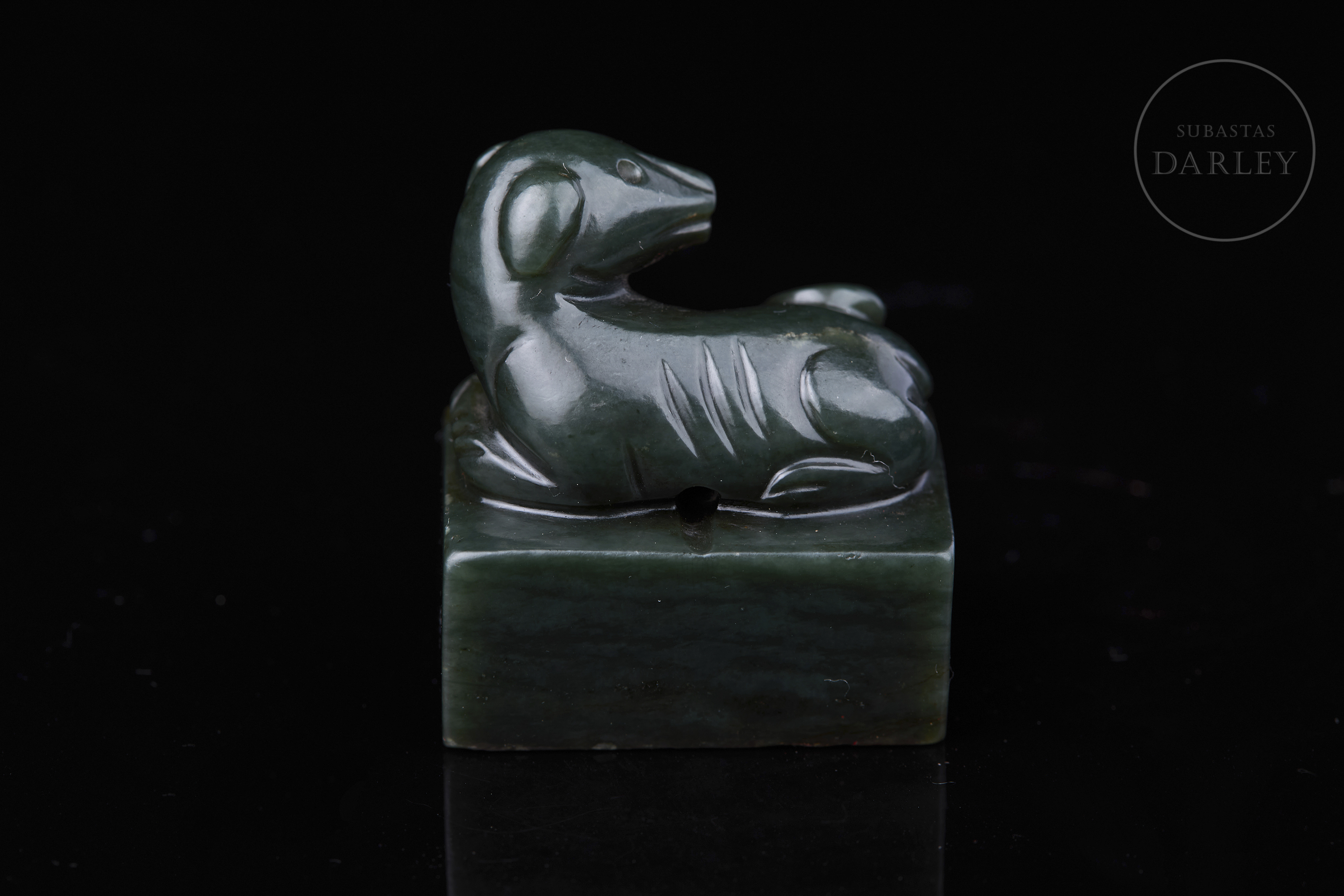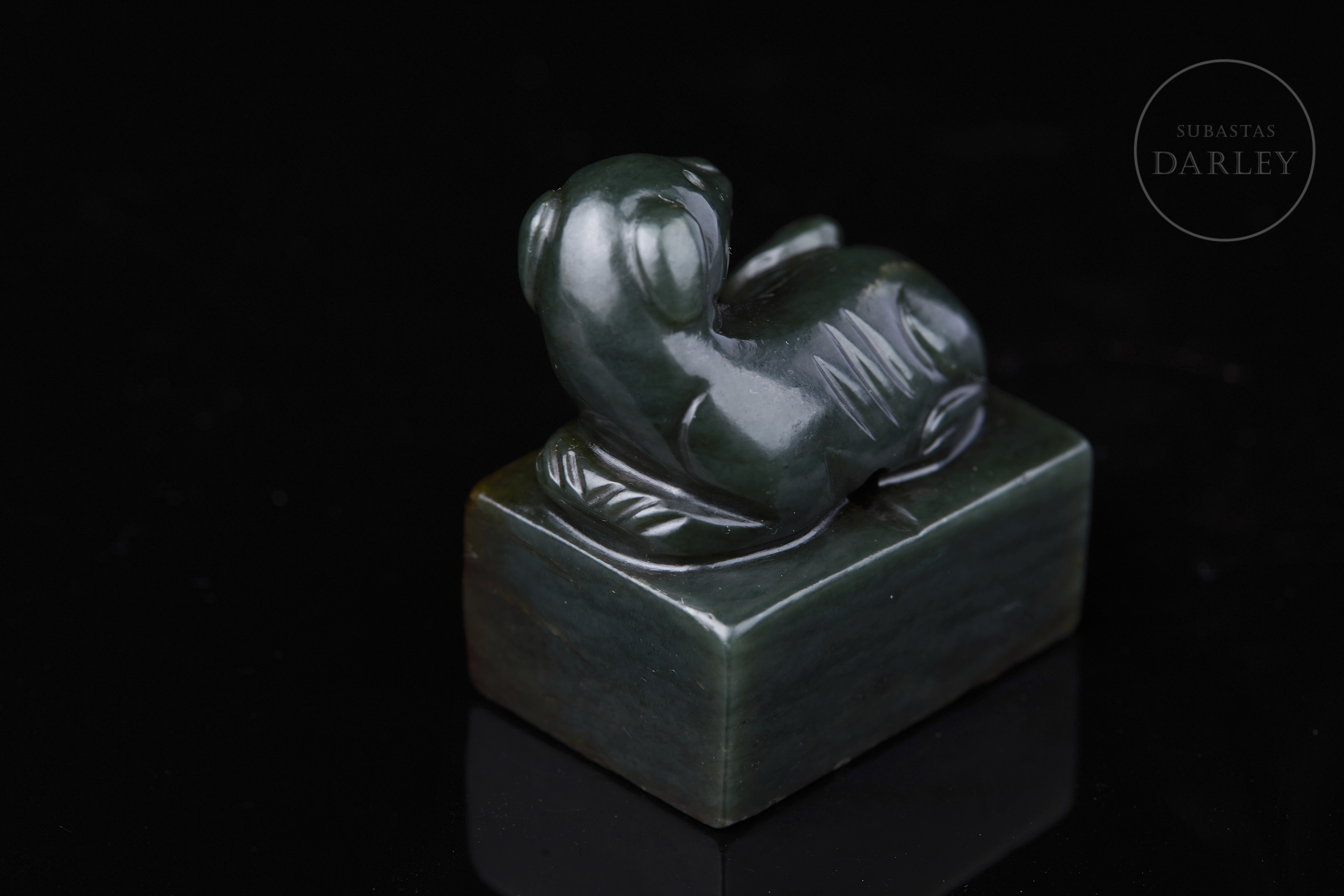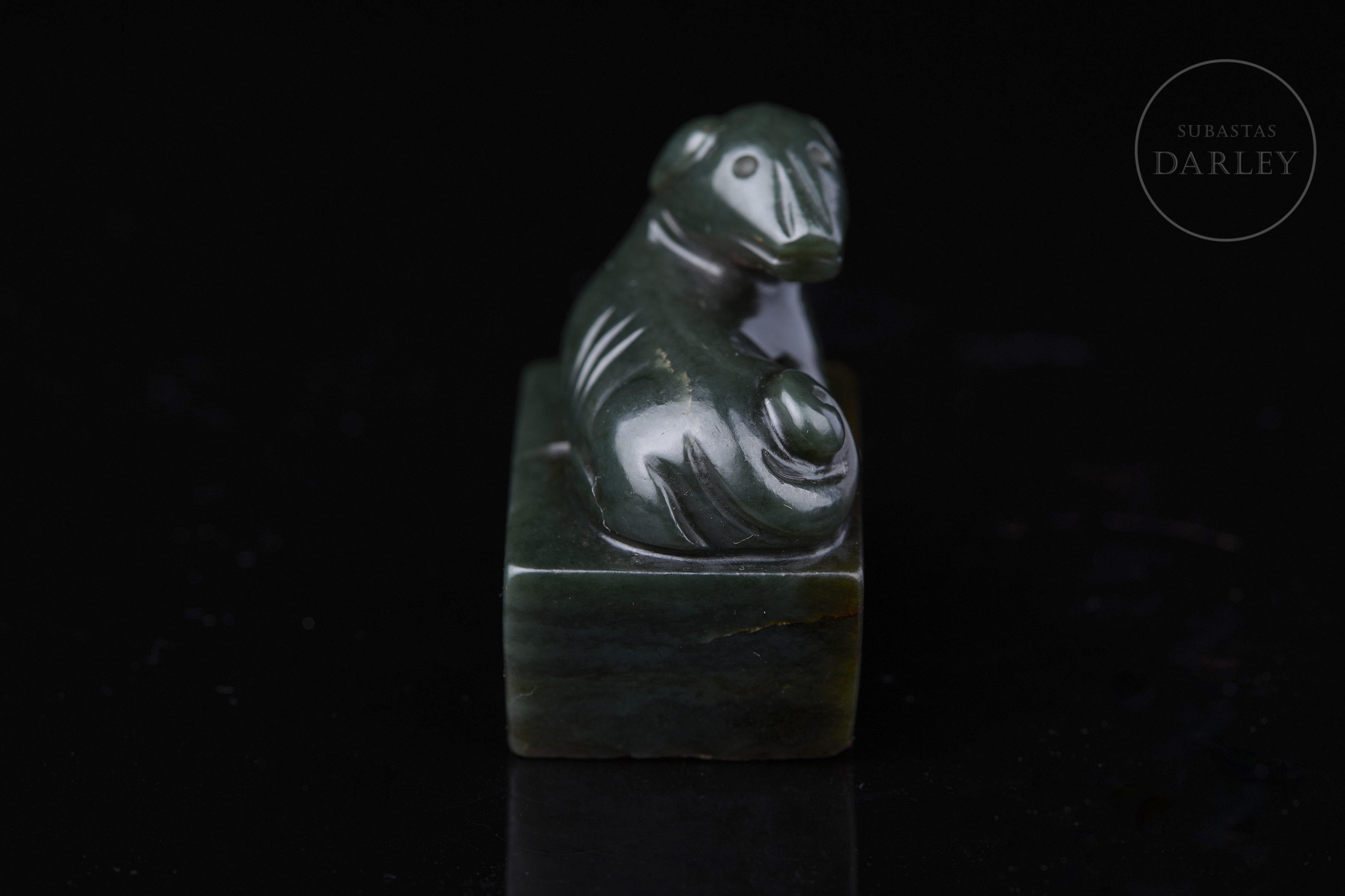 Sello tallado de jade de color verde intenso y formato rectangular. Se encuentra adornado por un perro que reposa sobre la base, con la cabeza girada hacia el lomo y la cola enroscada, todo realizado mediante detalles incisos. La base muestra los caracteres "惟酒可忘忧" grabados. Dinastía Qing (1644–1912).
