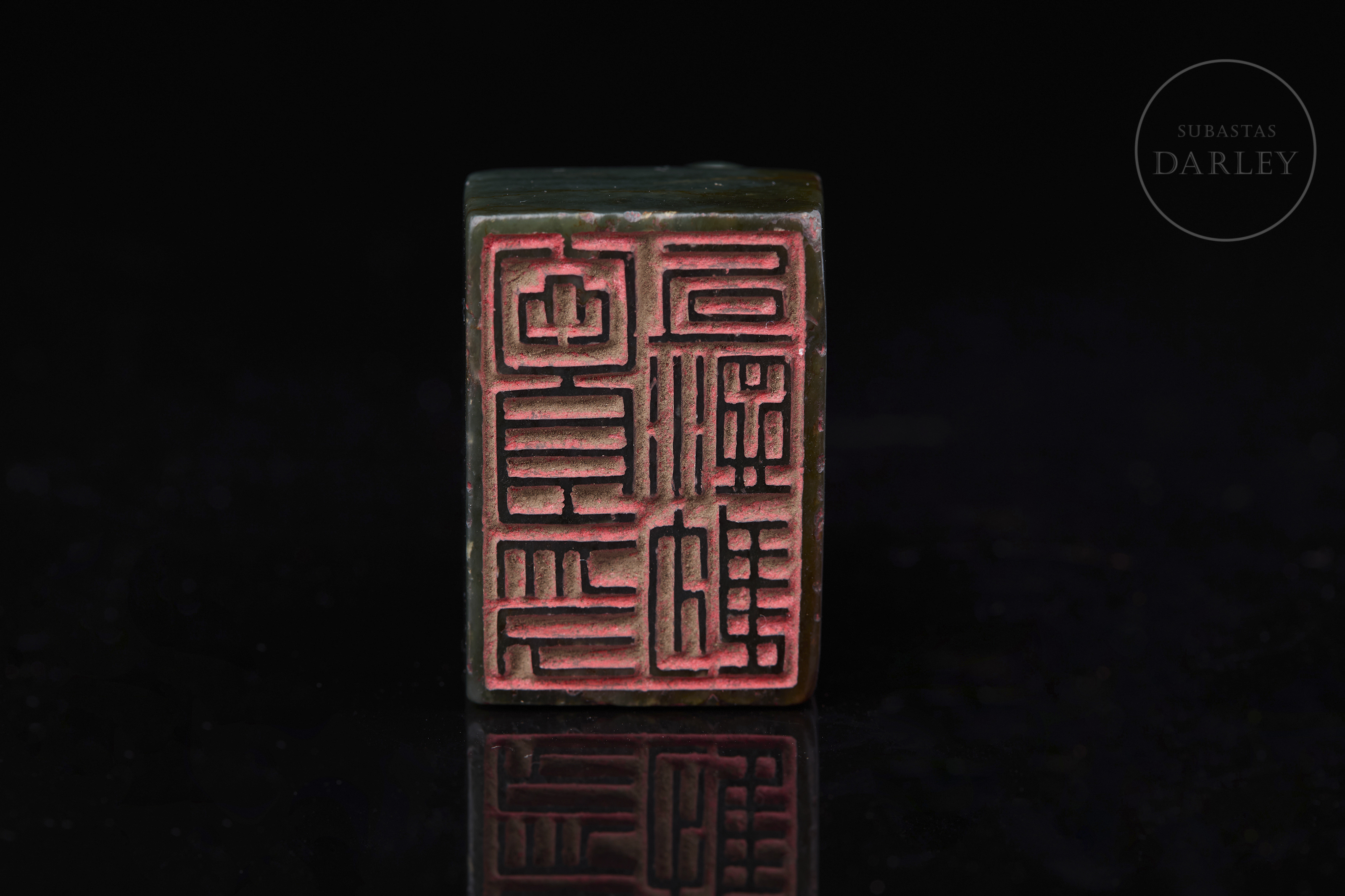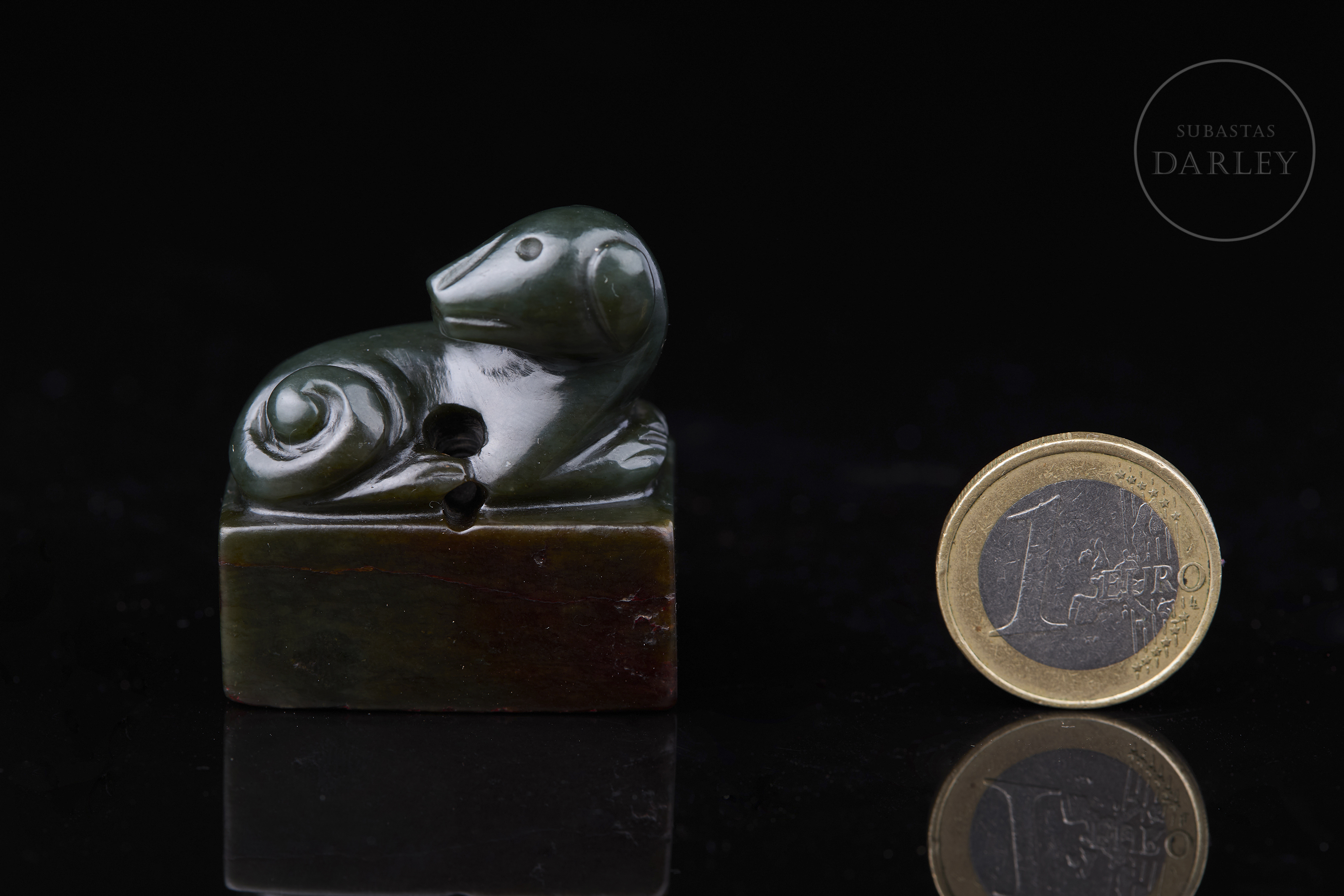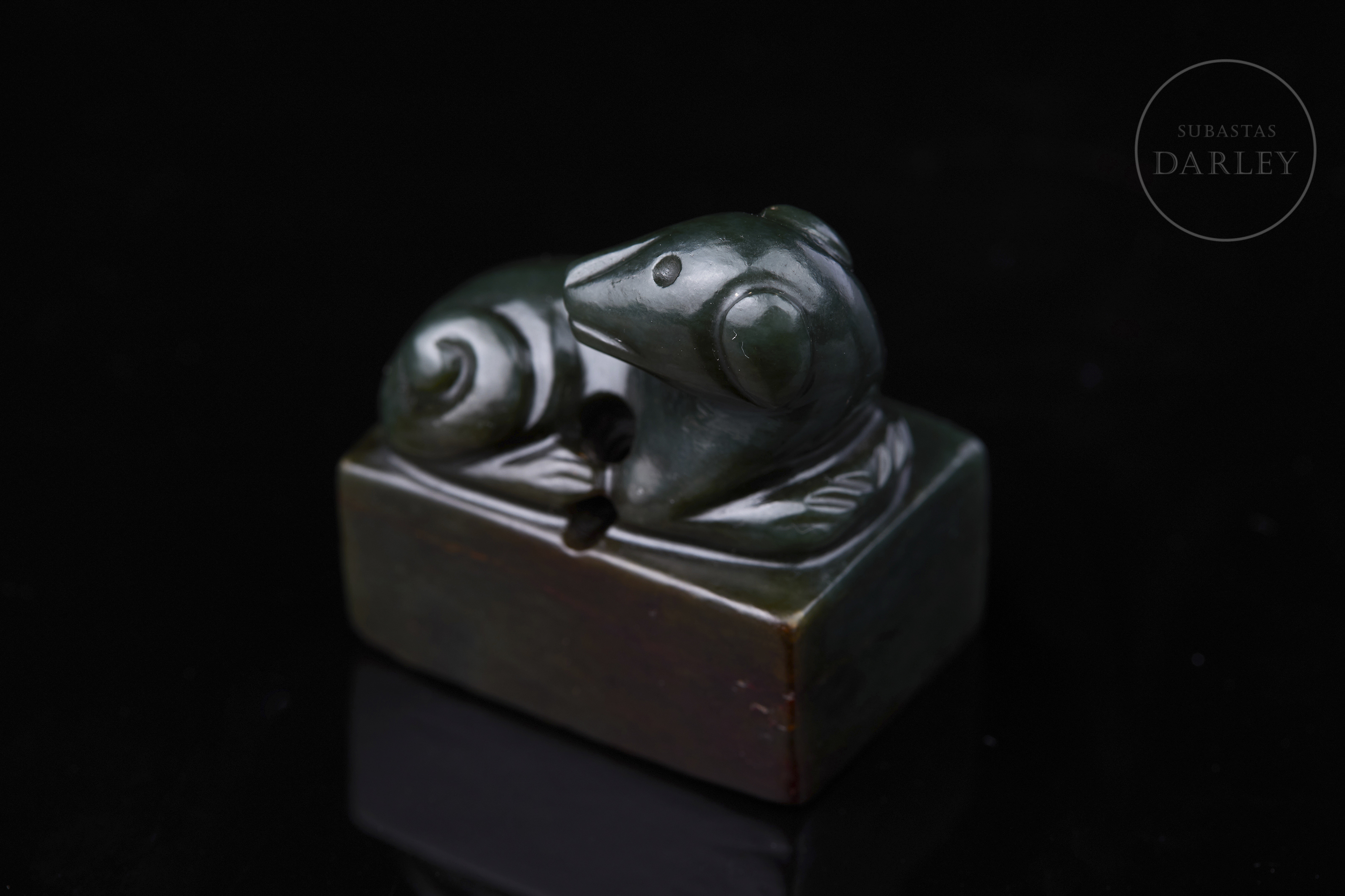 Sello tallado de jade de color verde intenso y formato rectangular. Se encuentra adornado por un perro que reposa sobre la base, con la cabeza girada hacia el lomo y la cola enroscada, todo realizado mediante detalles incisos. La base muestra los caracteres "惟酒可忘忧" grabados. Dinastía Qing (1644–1912).