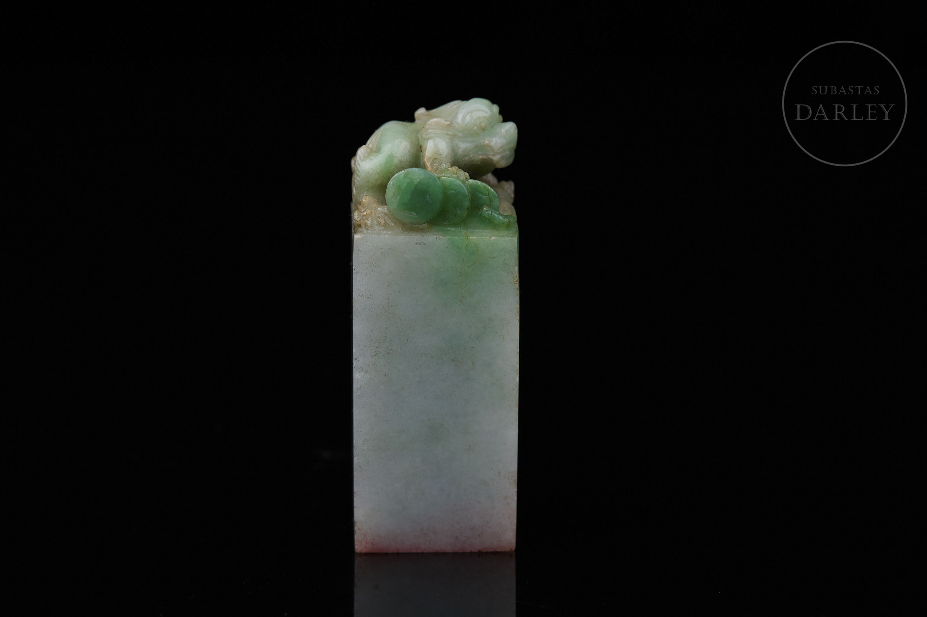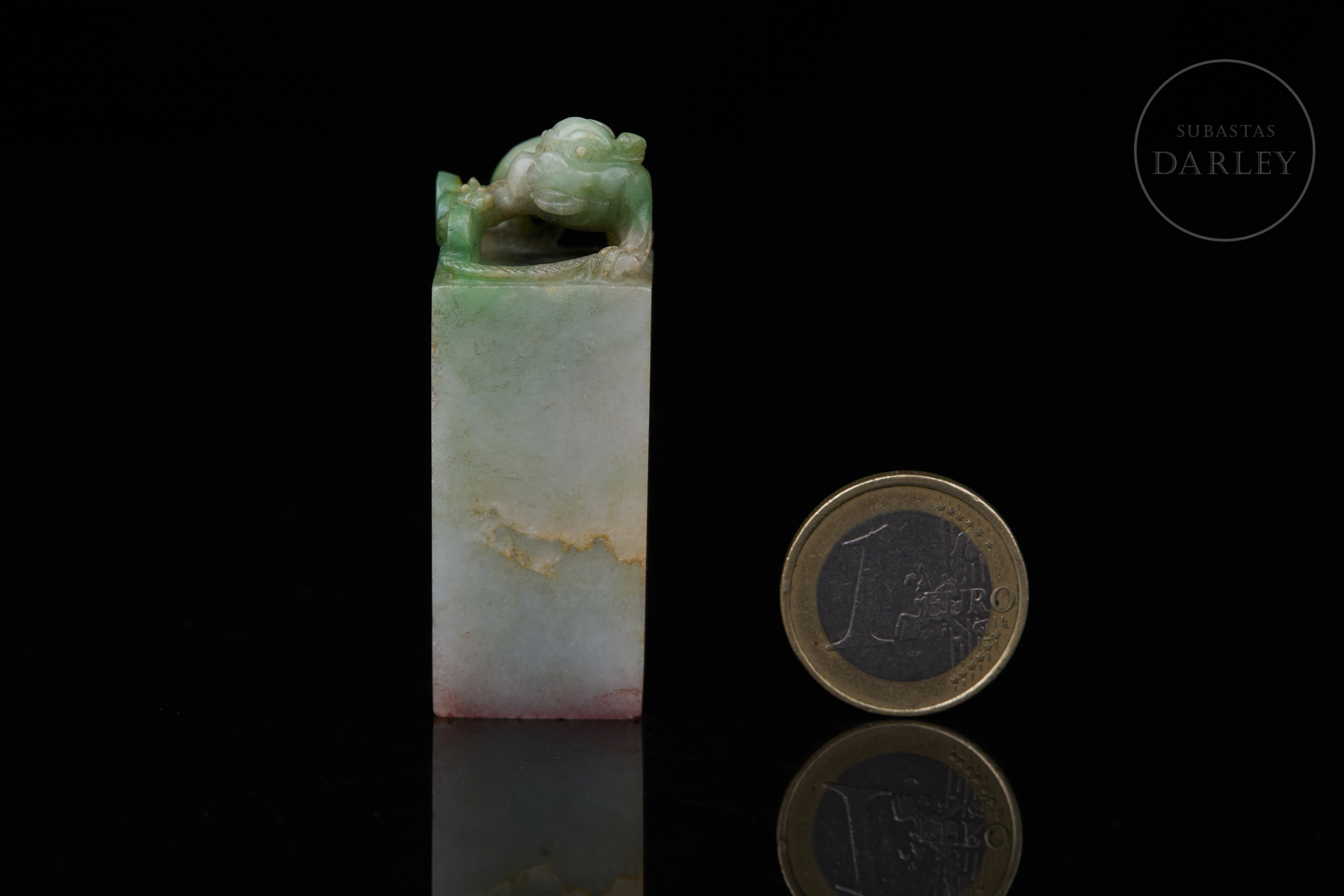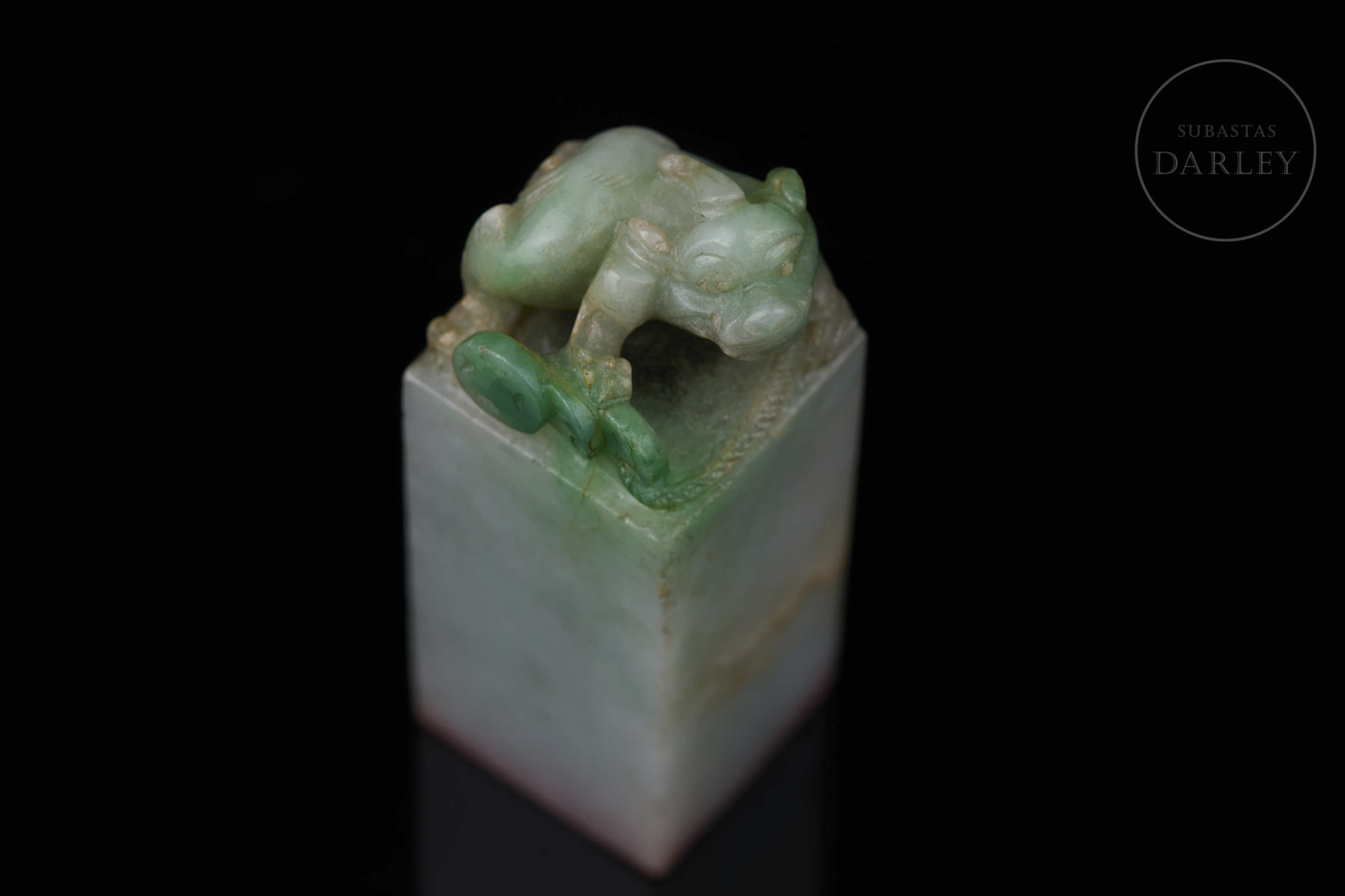 Sello tallado de jadeíta de color con amplias vetas de color blanco, y manchas de verde esmeralda en el remate. Muestra una base rectangular y esbelta, coronado por una bestia mítica junto a una tira de monedas que sostiene con su pata delantera. En la base se dispone el sello "料神仙即我" inciso. Dinastía Qing (1644-1912).