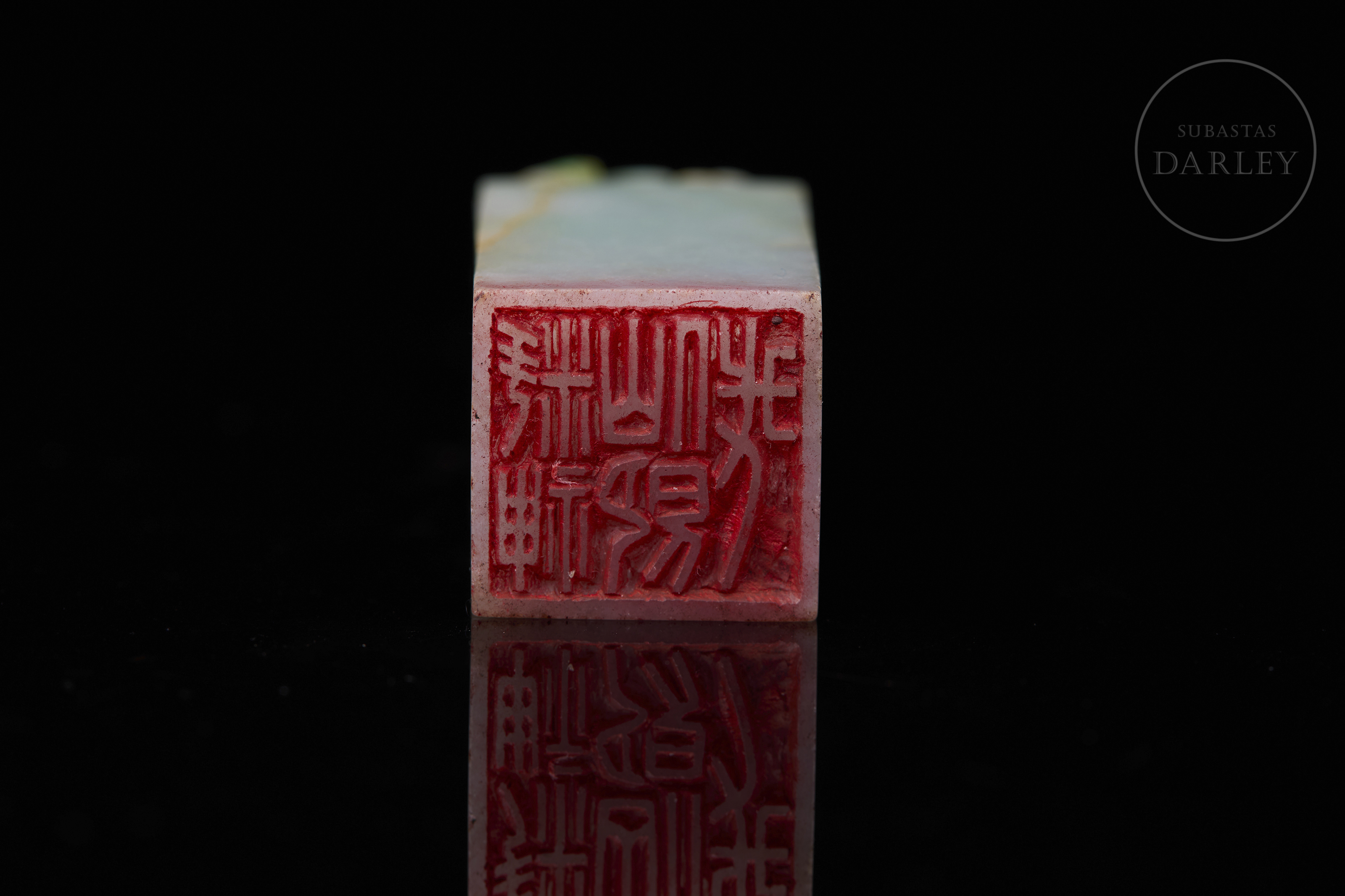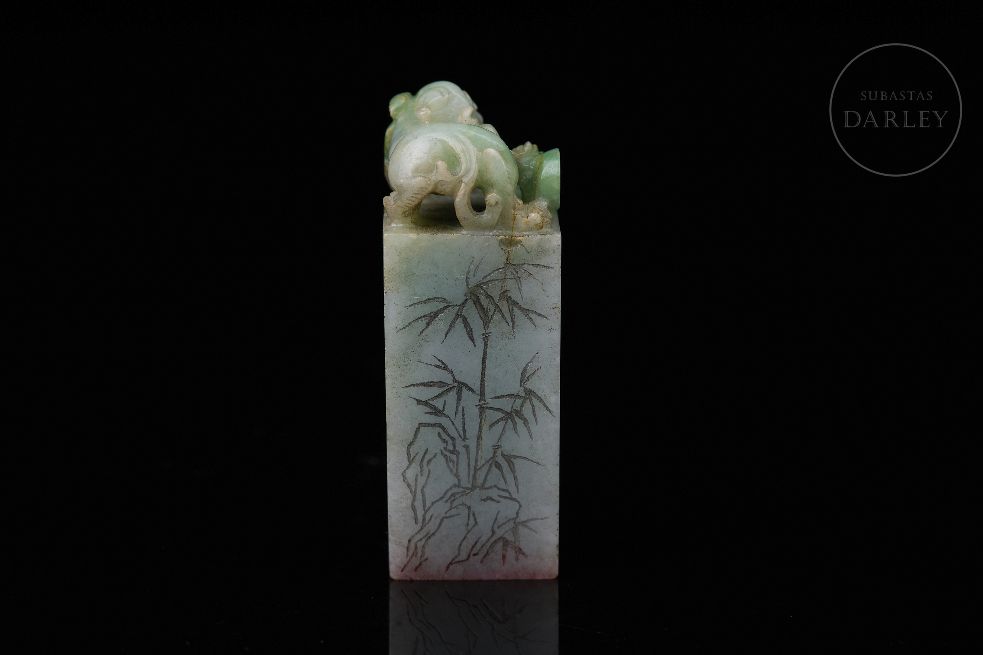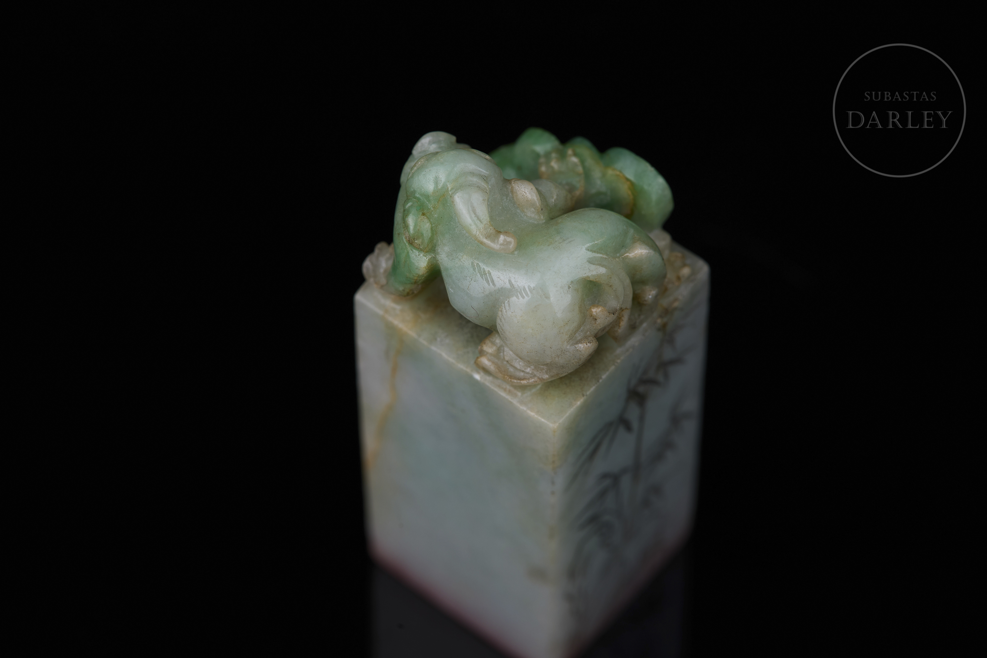 Sello tallado de jadeíta de color con amplias vetas de color blanco, y manchas de verde esmeralda en el remate. Muestra una base rectangular y esbelta, coronado por una bestia mítica junto a una tira de monedas que sostiene con su pata delantera. En la base se dispone el sello "料神仙即我" inciso. Dinastía Qing (1644-1912).