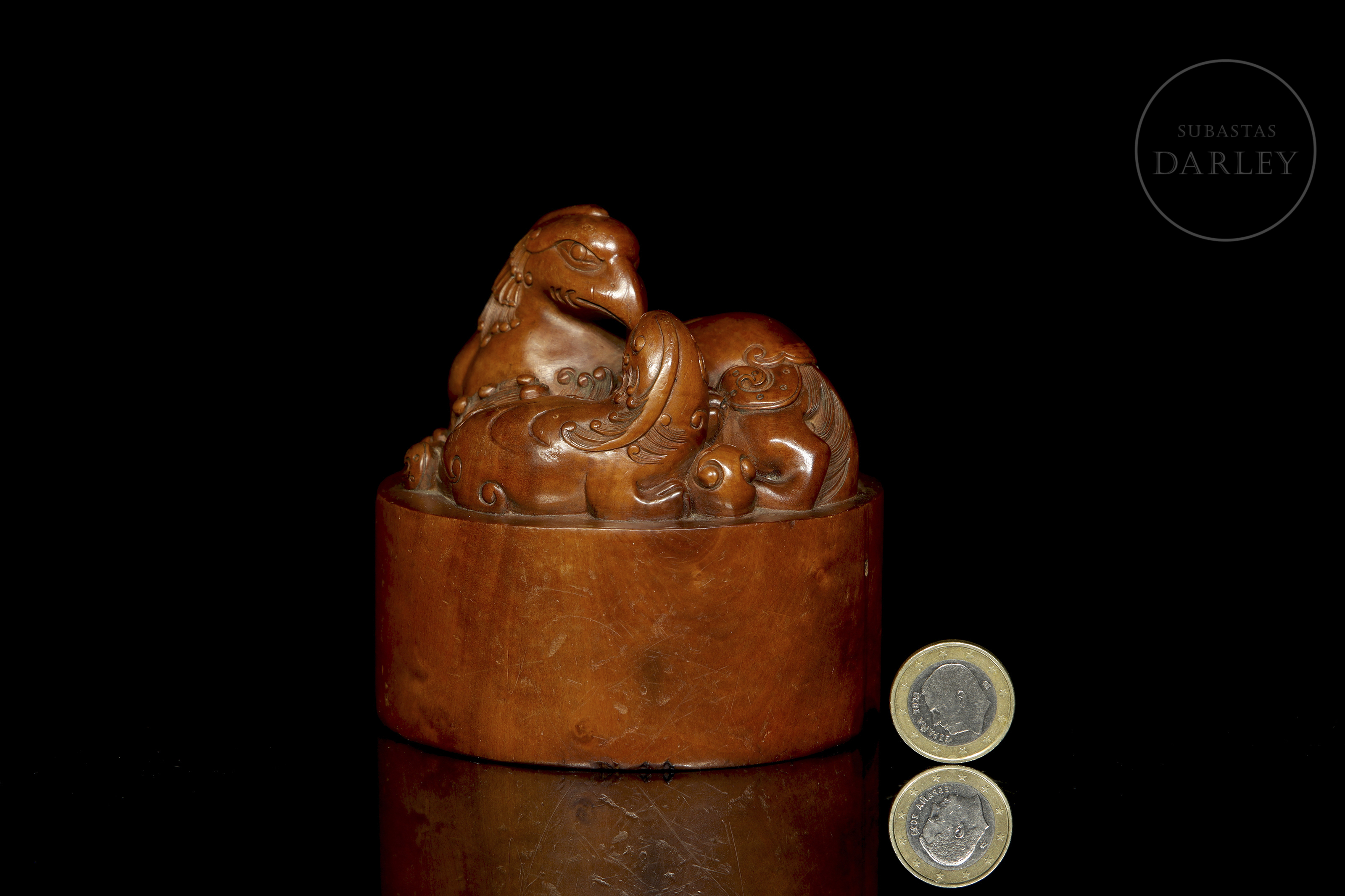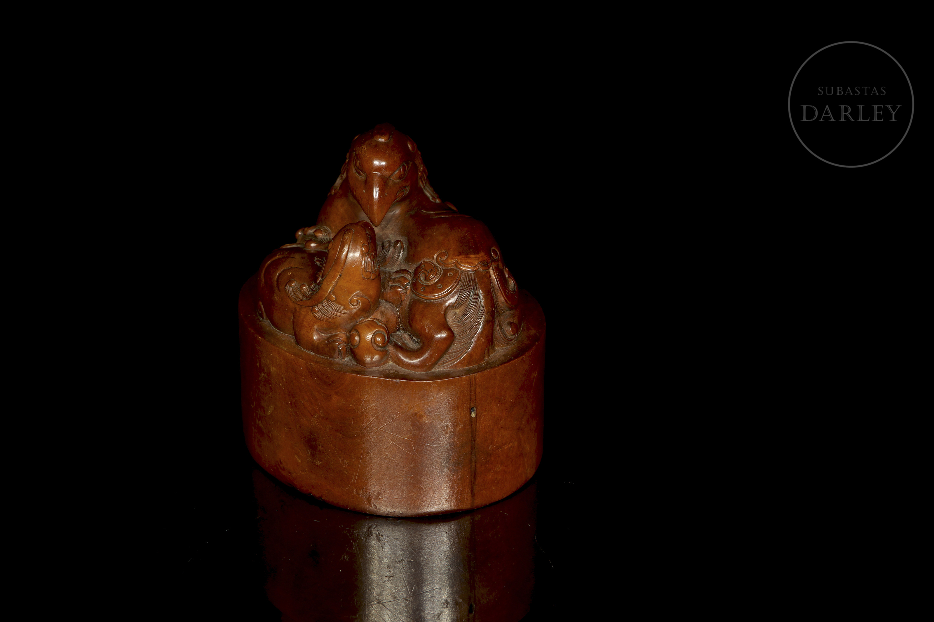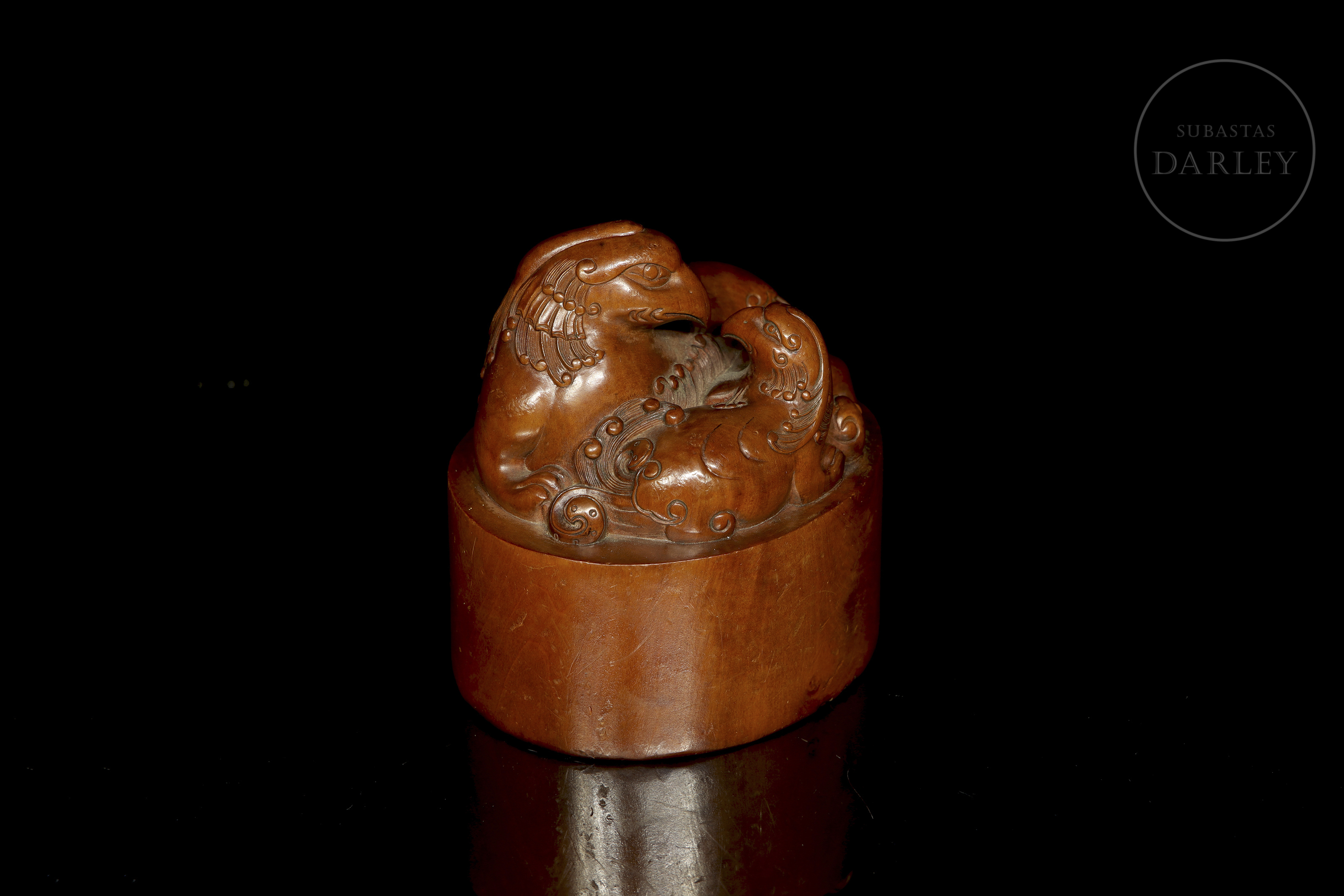 Realizado en madera de tonalidad rojiza. La pieza posee un formato elíptico rematado por una talla en que muestra dos grifos, criaturas míticas con cabeza de águila y cuerpo de león. Destaca por el vigor de sus volúmenes, el detalle en el plumaje y los elementos ornamentales. La base contiene una intrincada inscripción grabada con restos de pigmento rojo. Dinastía Qing (1644–1912).