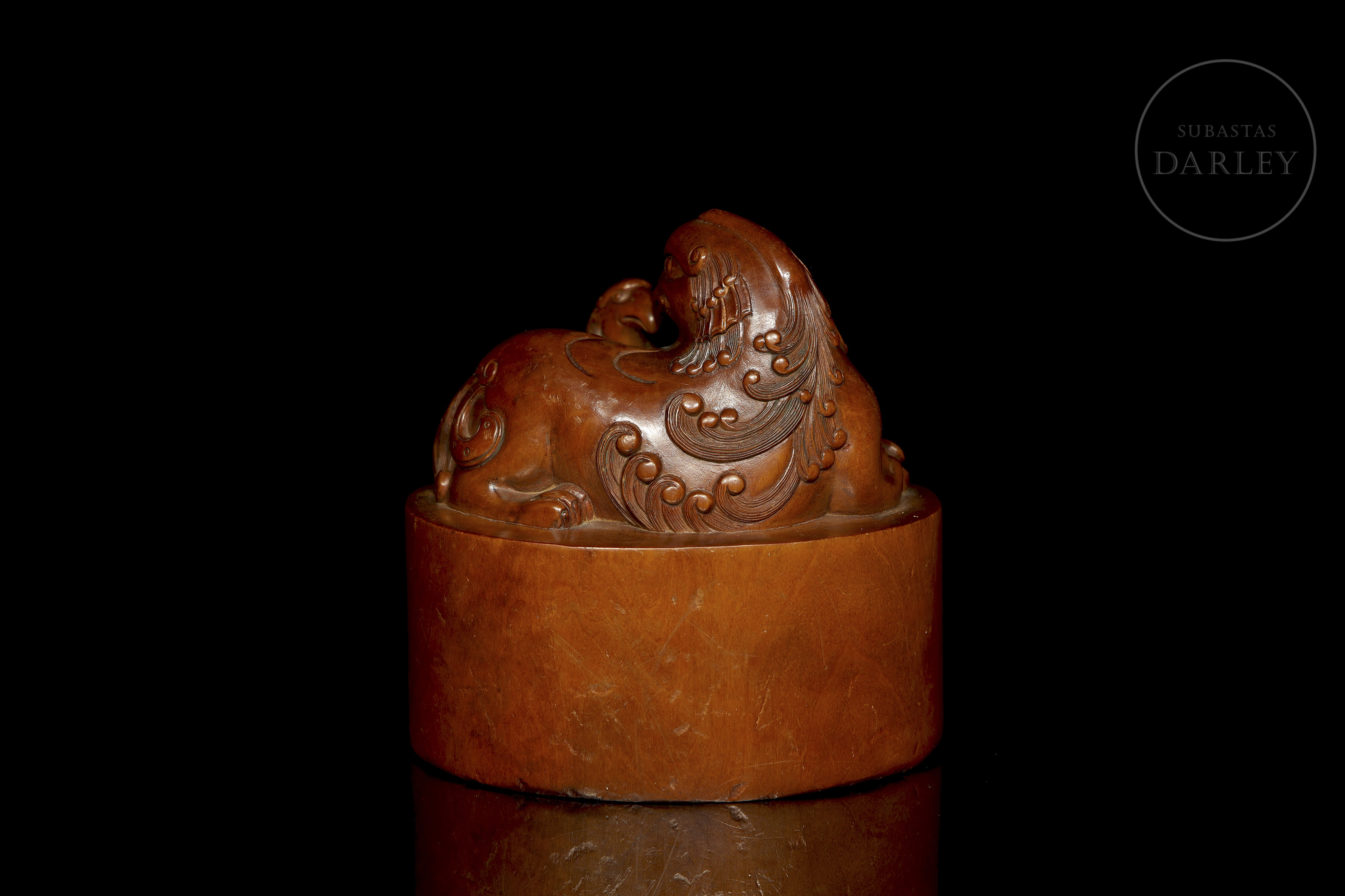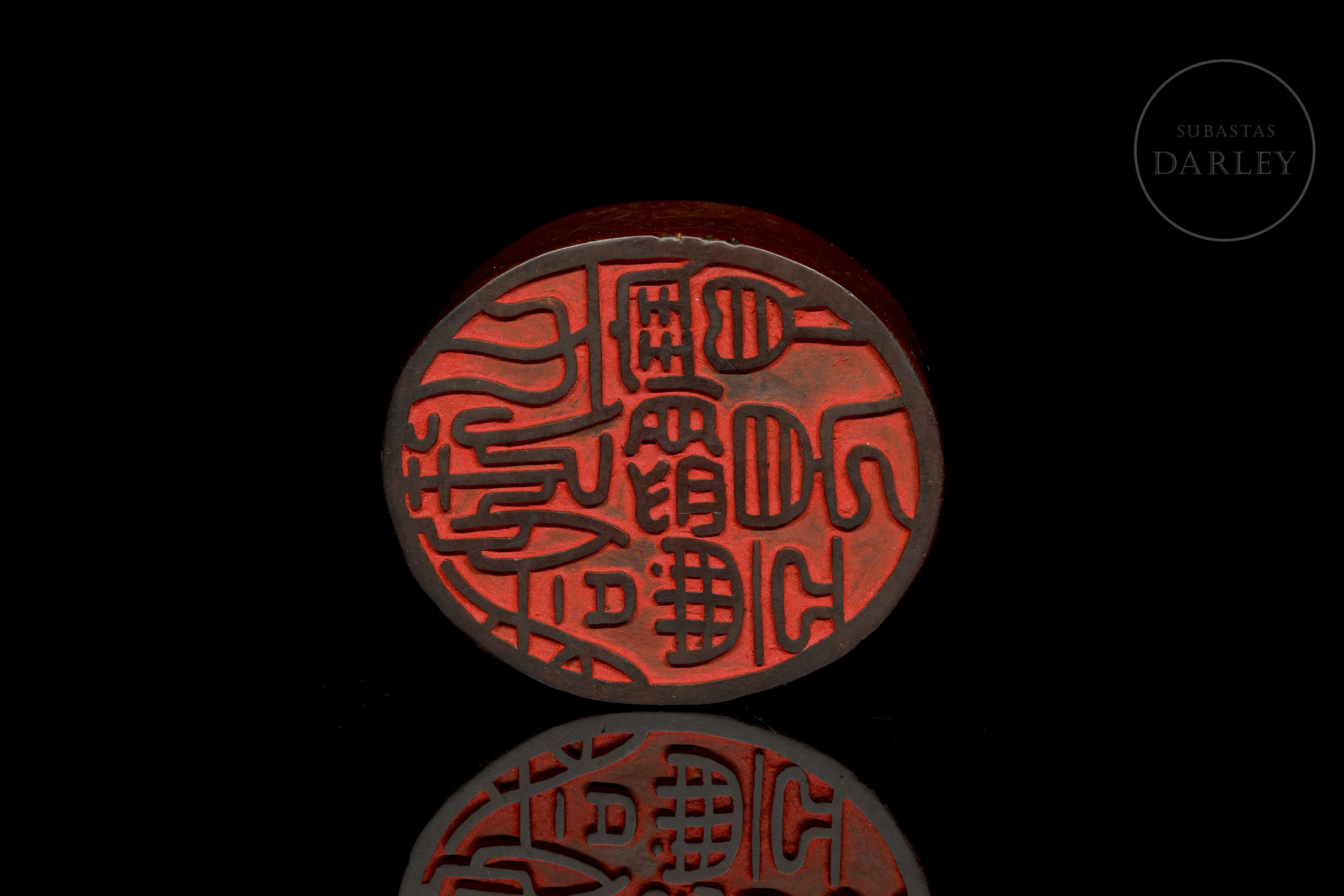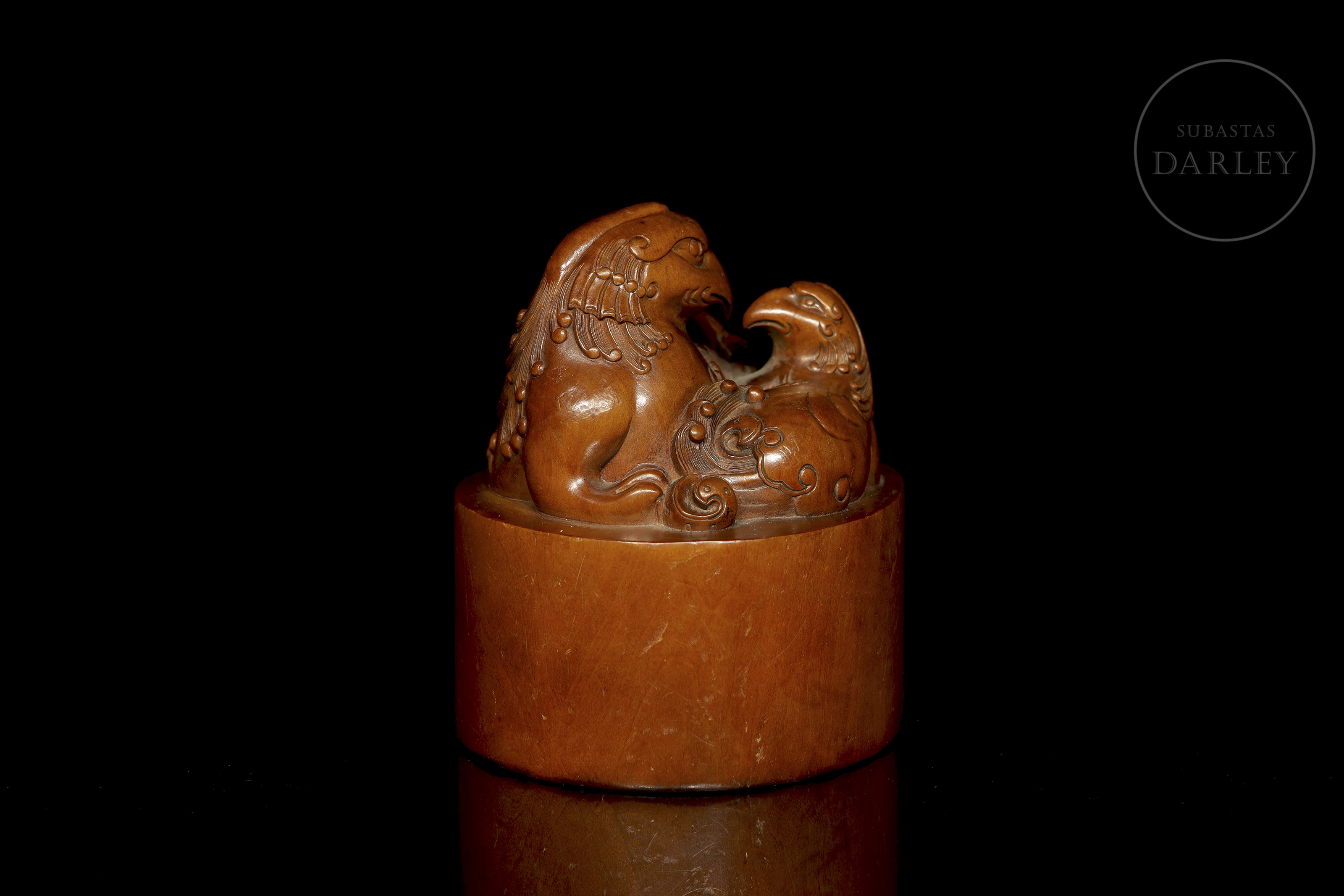 Realizado en madera de tonalidad rojiza. La pieza posee un formato elíptico rematado por una talla en que muestra dos grifos, criaturas míticas con cabeza de águila y cuerpo de león. Destaca por el vigor de sus volúmenes, el detalle en el plumaje y los elementos ornamentales. La base contiene una intrincada inscripción grabada con restos de pigmento rojo. Dinastía Qing (1644–1912).