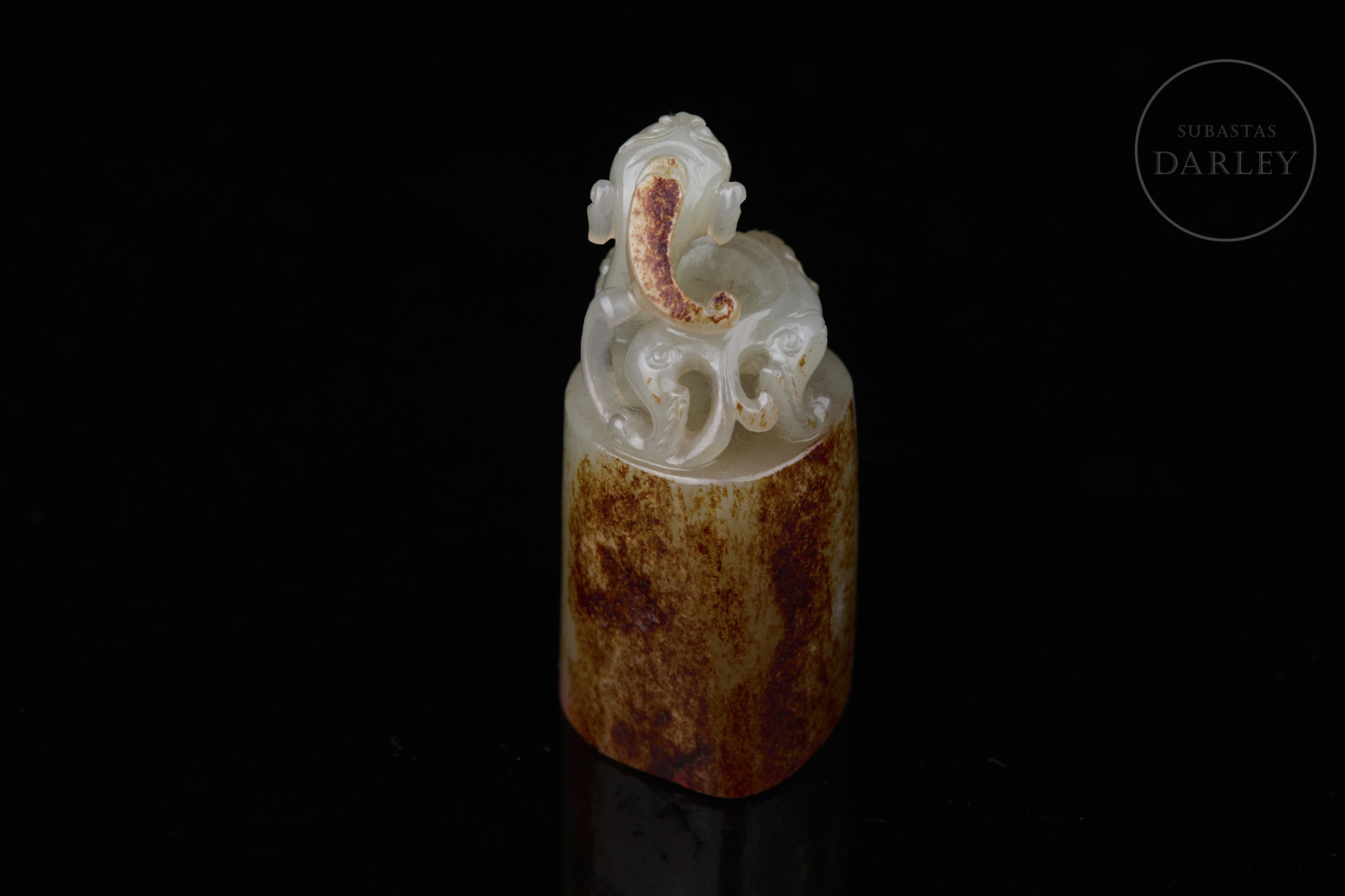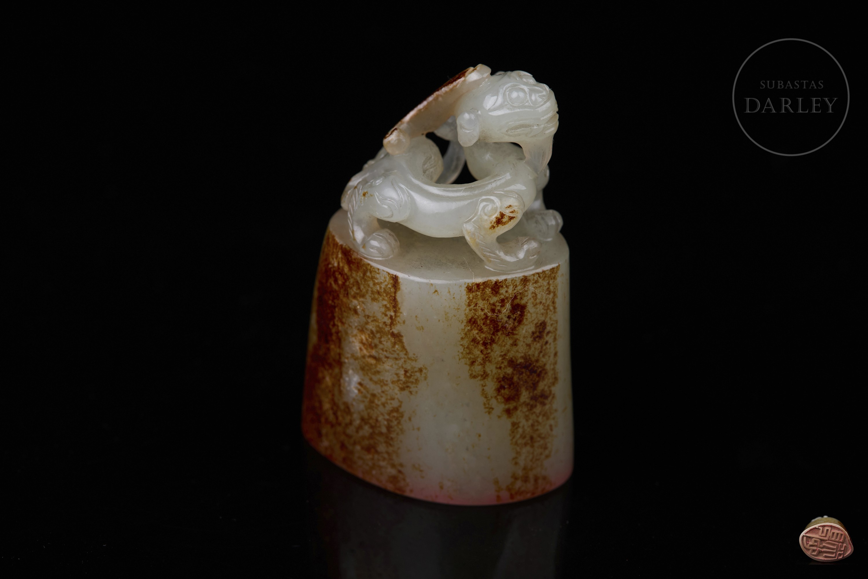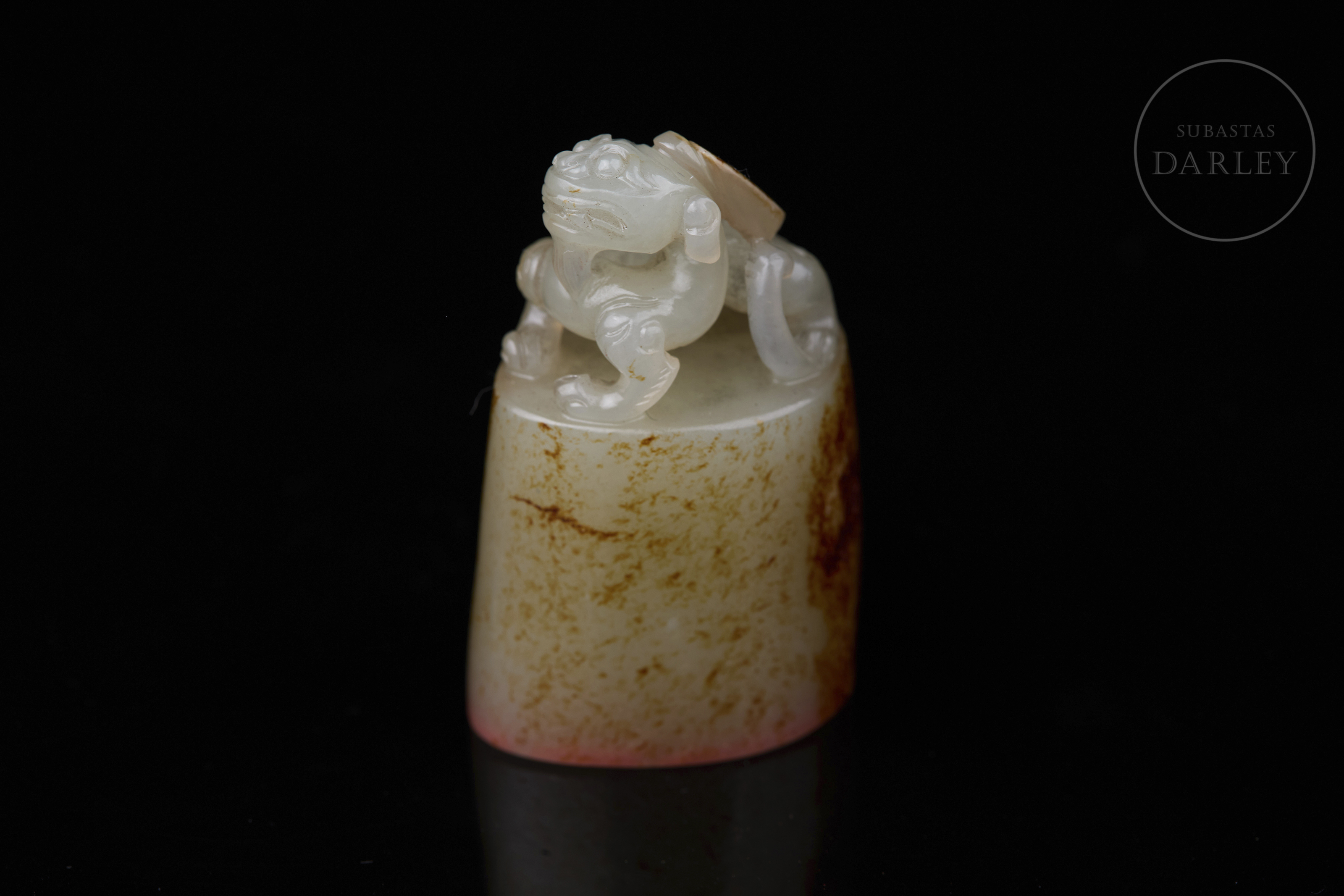 Sello tallado de jade de color blanco, de base ovalada y cuerpo cilíndrico. Presenta un remate escultórico en forma de bixie en una pose dinámica, con mirada feroz, patas robustas y cola girada. El jade exhibe una notable pátina natural de color marrón rojizo y ocre que cubre gran parte de la base y el cuerpo. La base posee caracteres "见天心" y restos de lacre. Dinastía Qing (1644–1912).