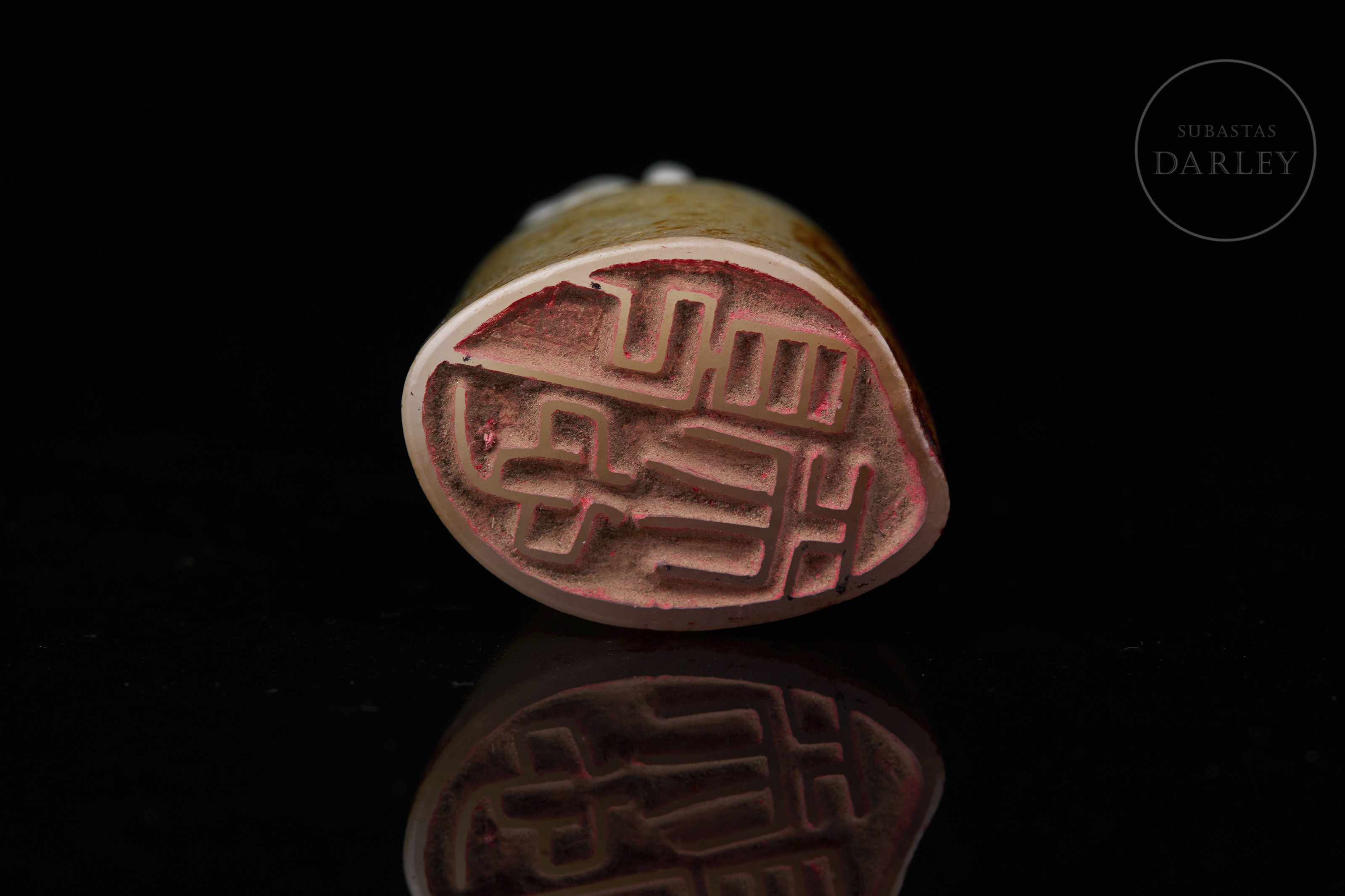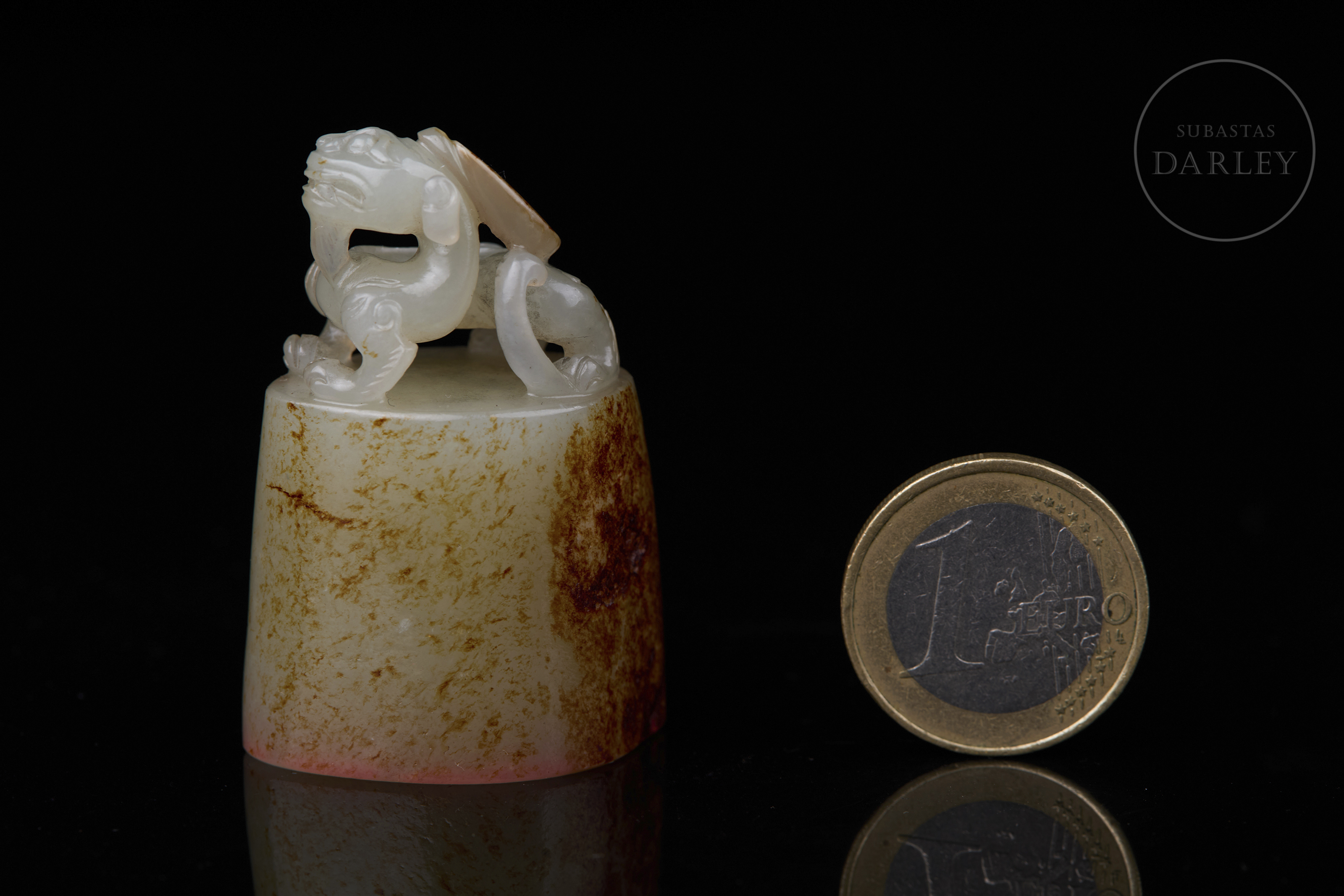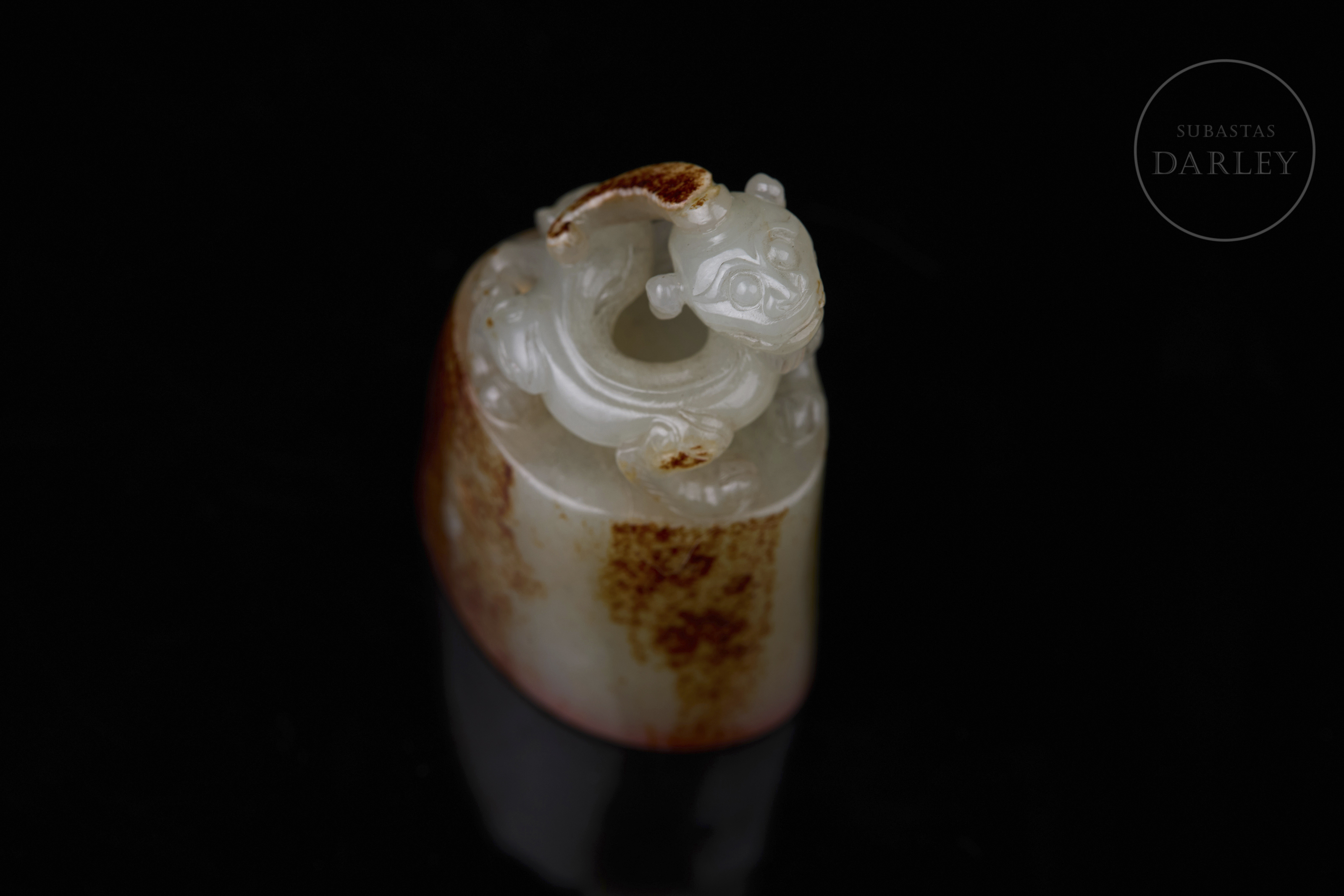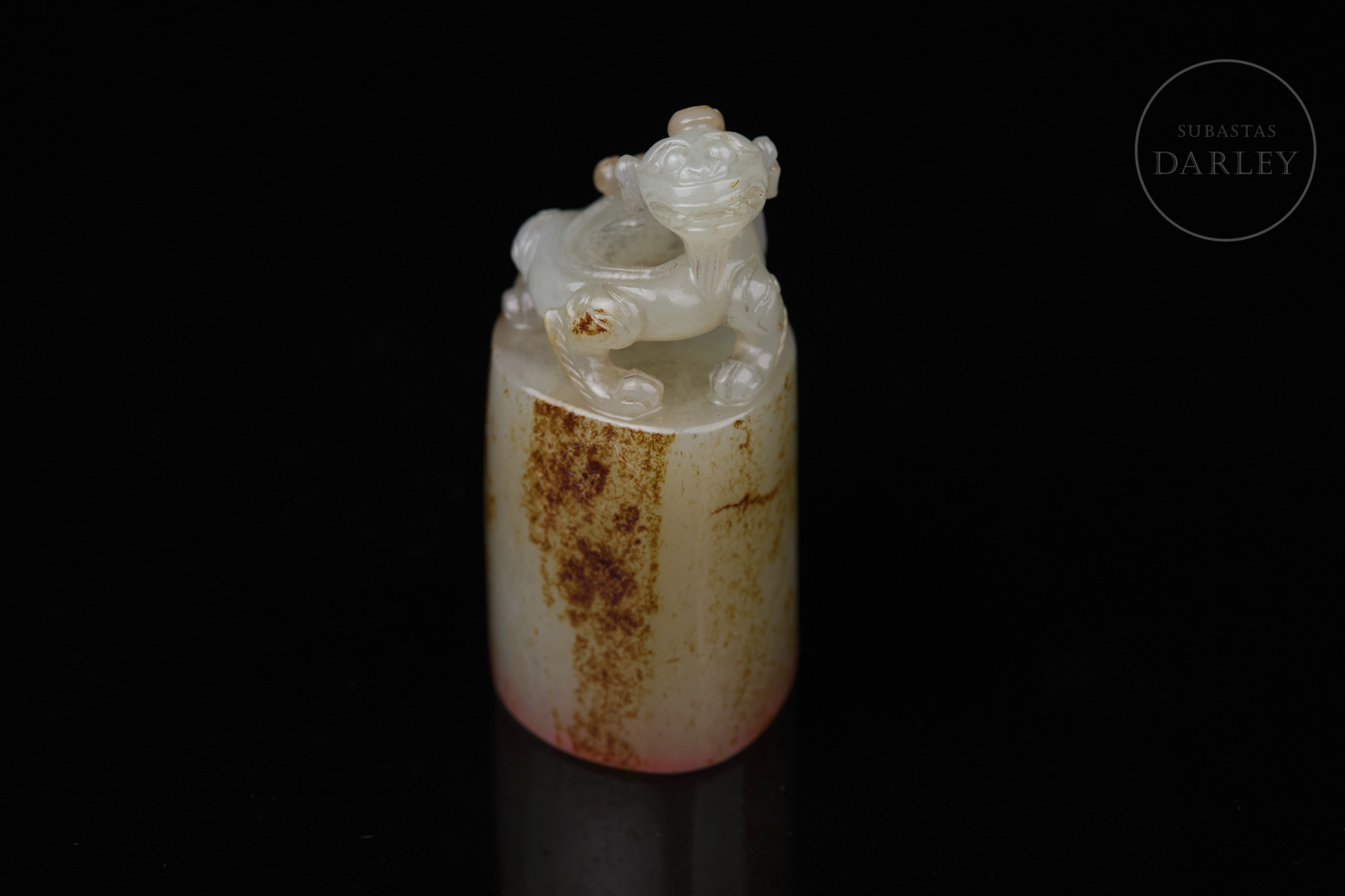 Sello tallado de jade de color blanco, de base ovalada y cuerpo cilíndrico. Presenta un remate escultórico en forma de bixie en una pose dinámica, con mirada feroz, patas robustas y cola girada. El jade exhibe una notable pátina natural de color marrón rojizo y ocre que cubre gran parte de la base y el cuerpo. La base posee caracteres "见天心" y restos de lacre. Dinastía Qing (1644–1912).
