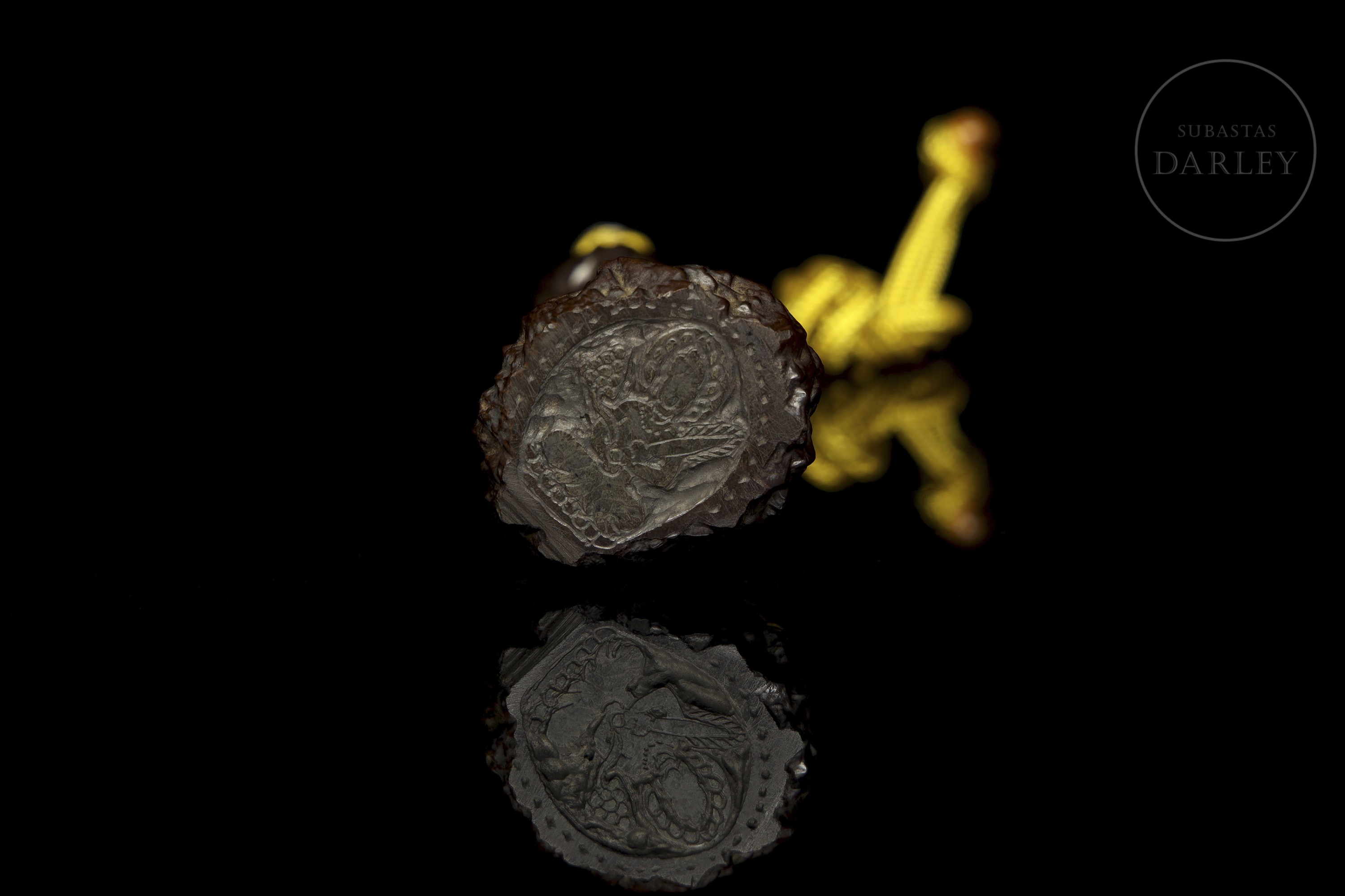 Sello de piedra de color marrón con vetas claras. El cuerpo, cilíndrico, presenta una textura rugosa y una base que se ensancha. La parte superior está perforada para dar paso a un cordón decorativo. La base circular está grabada con una deidad sedente, que sujeta dos objetos rituales.