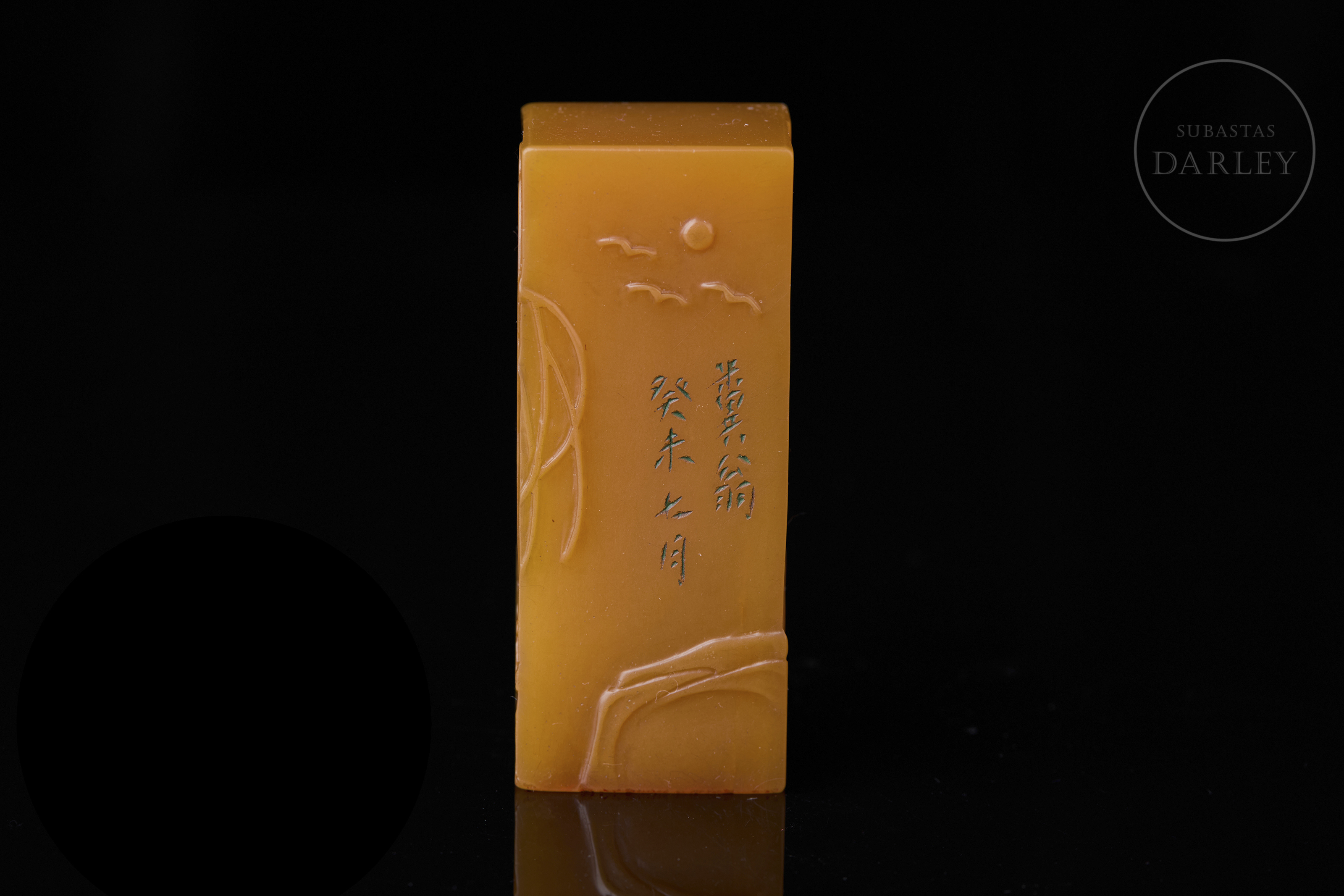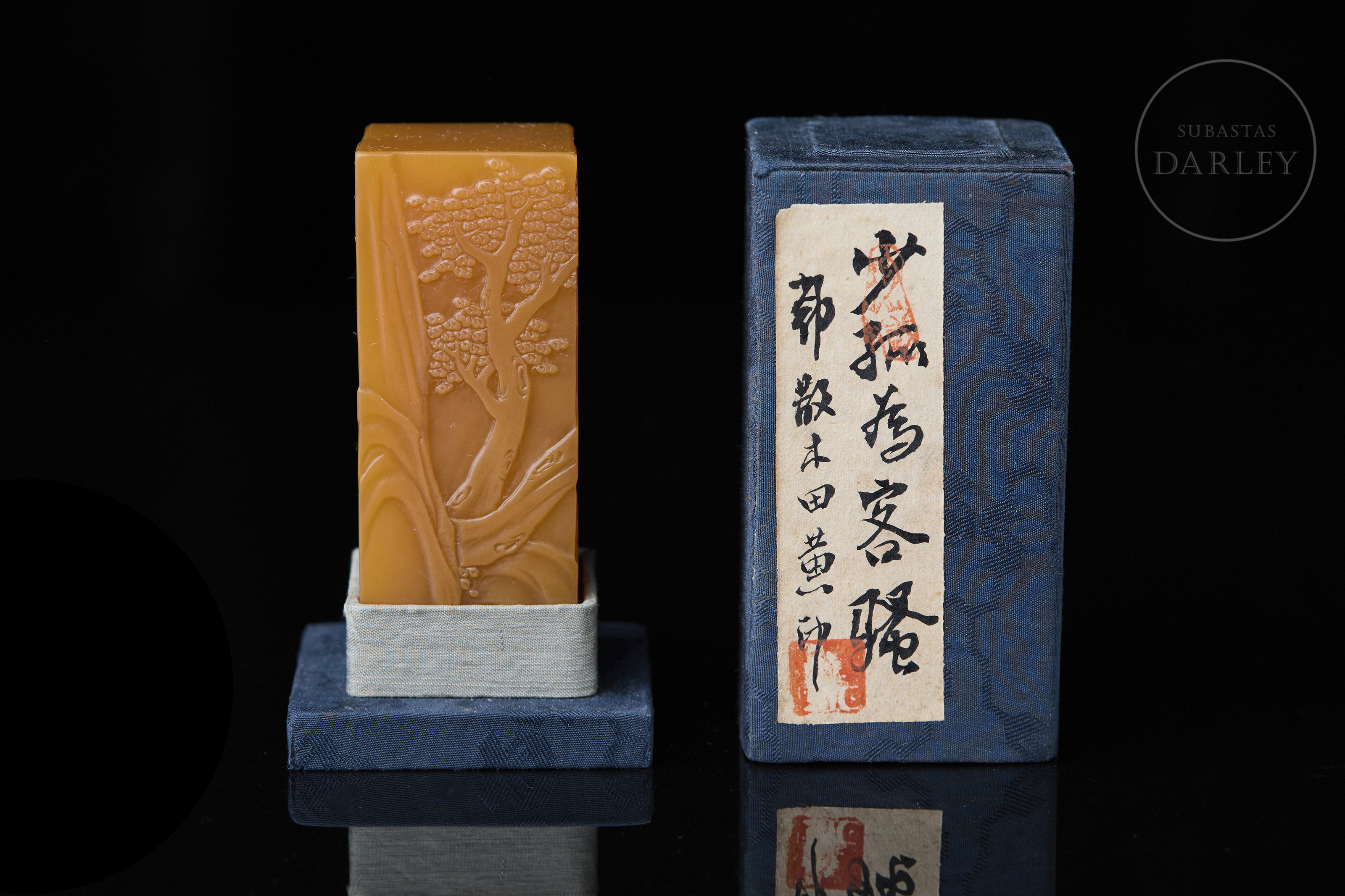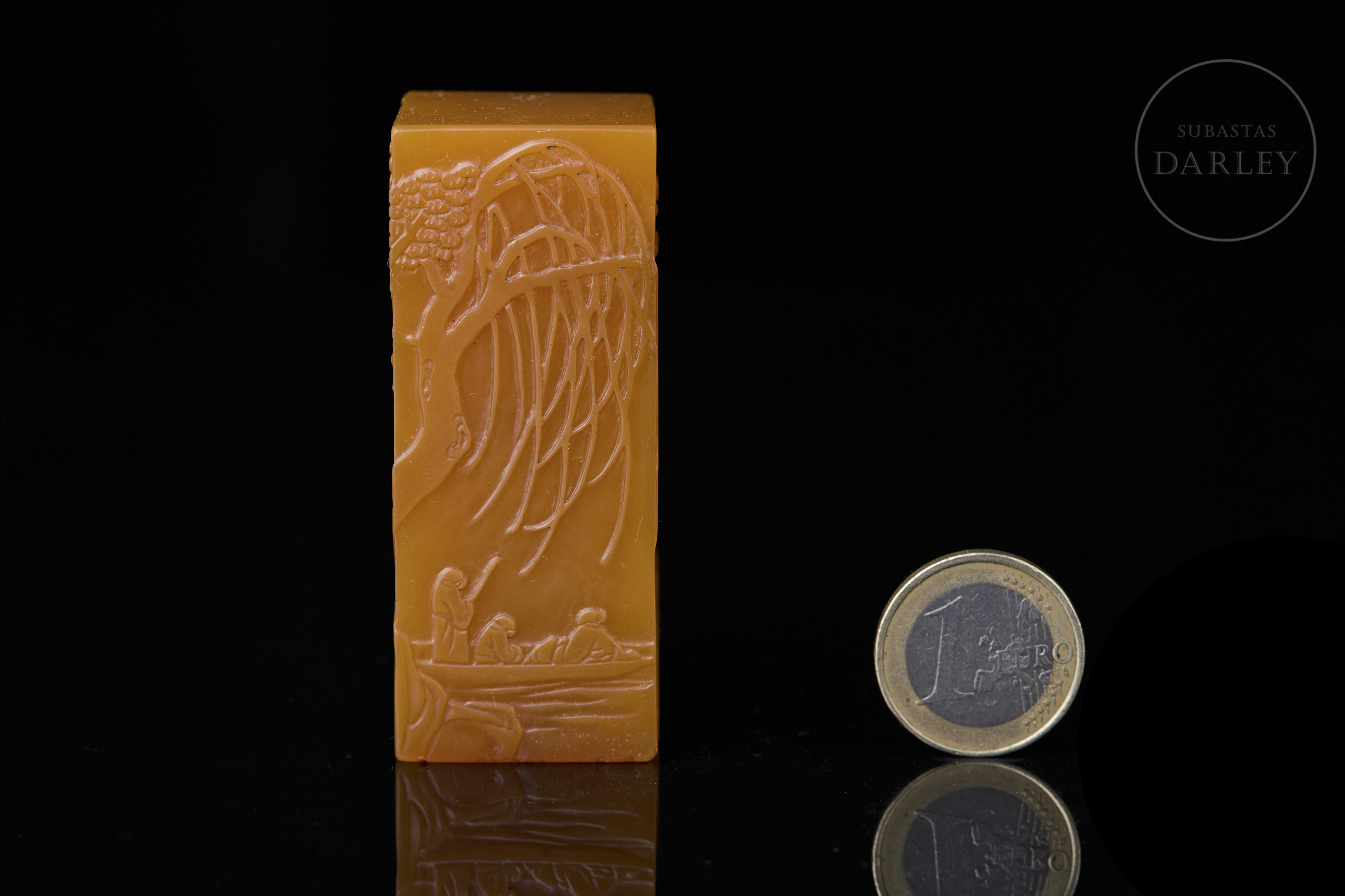 Piedra Shoushan tallada, de tonalidad miel intensa. Posee un formato rectangular, decorado mediante relieves de una escena de un sauce llorón, cuyas ramas caen con elegancia sobre una pequeña barca con personajes; todo rodeado por montañas y aves en vuelo. En uno de los laterales, se aprecia una inscripción caligráfica incisa. La base del sello contiene caracteres para estampado con restos de cinabrio rojo. Se presenta sobre una peana textil y con su caja original forrada. Dinastía Qing (1644–1912).