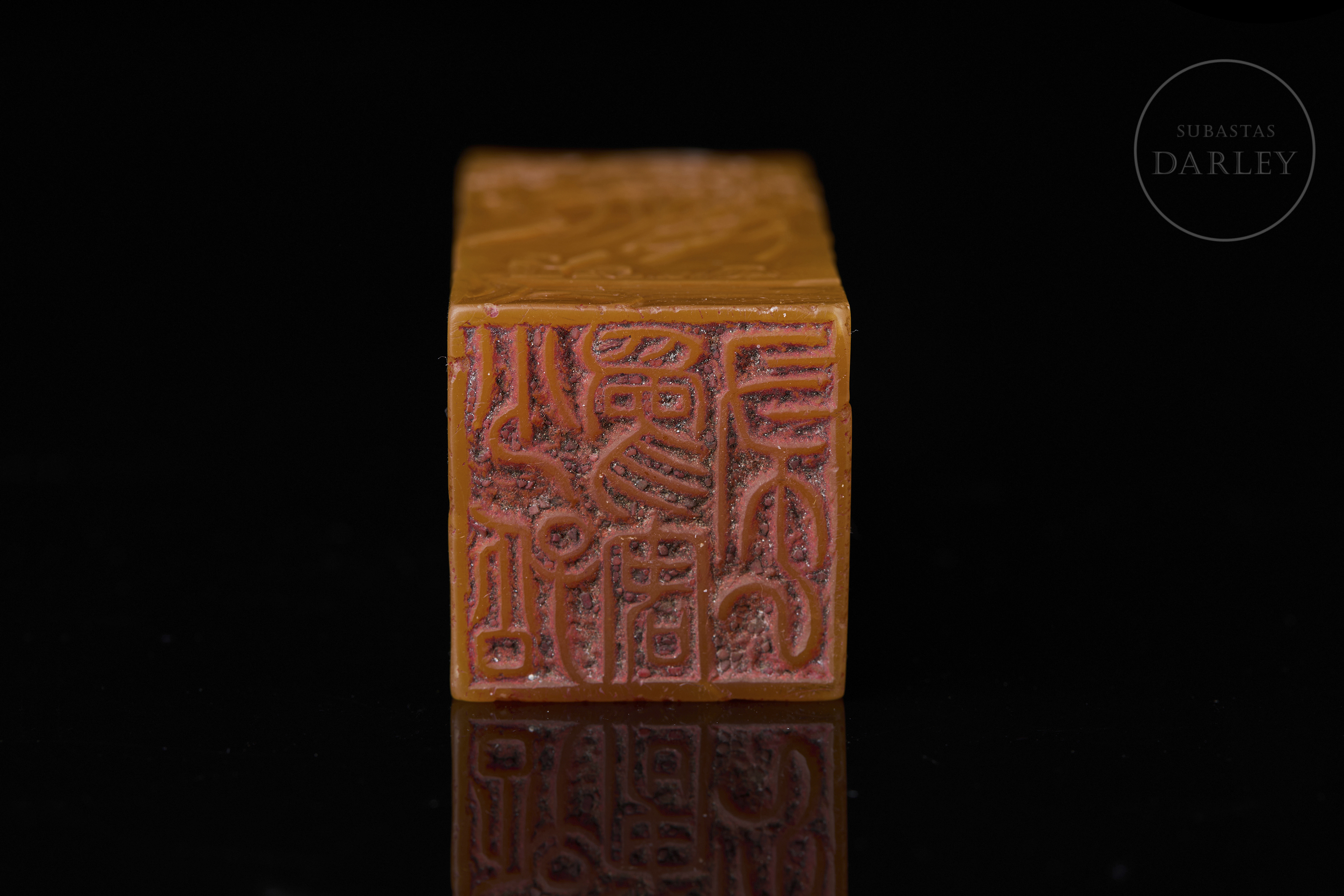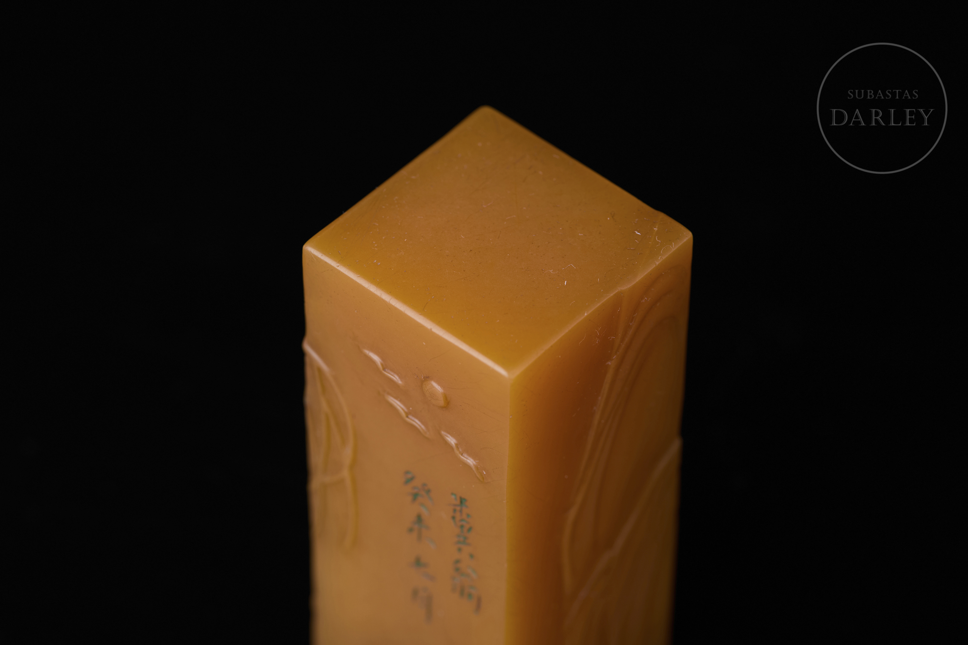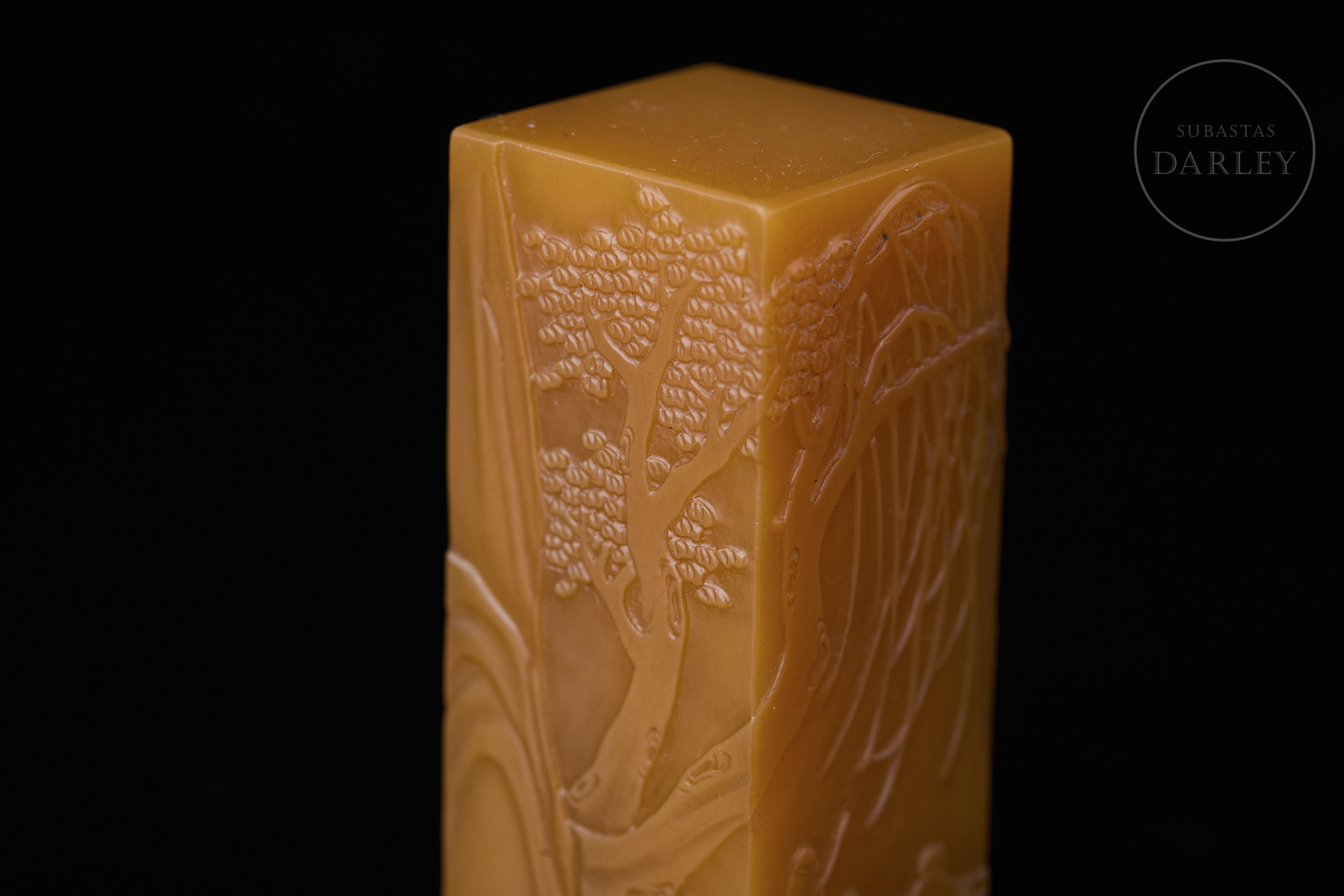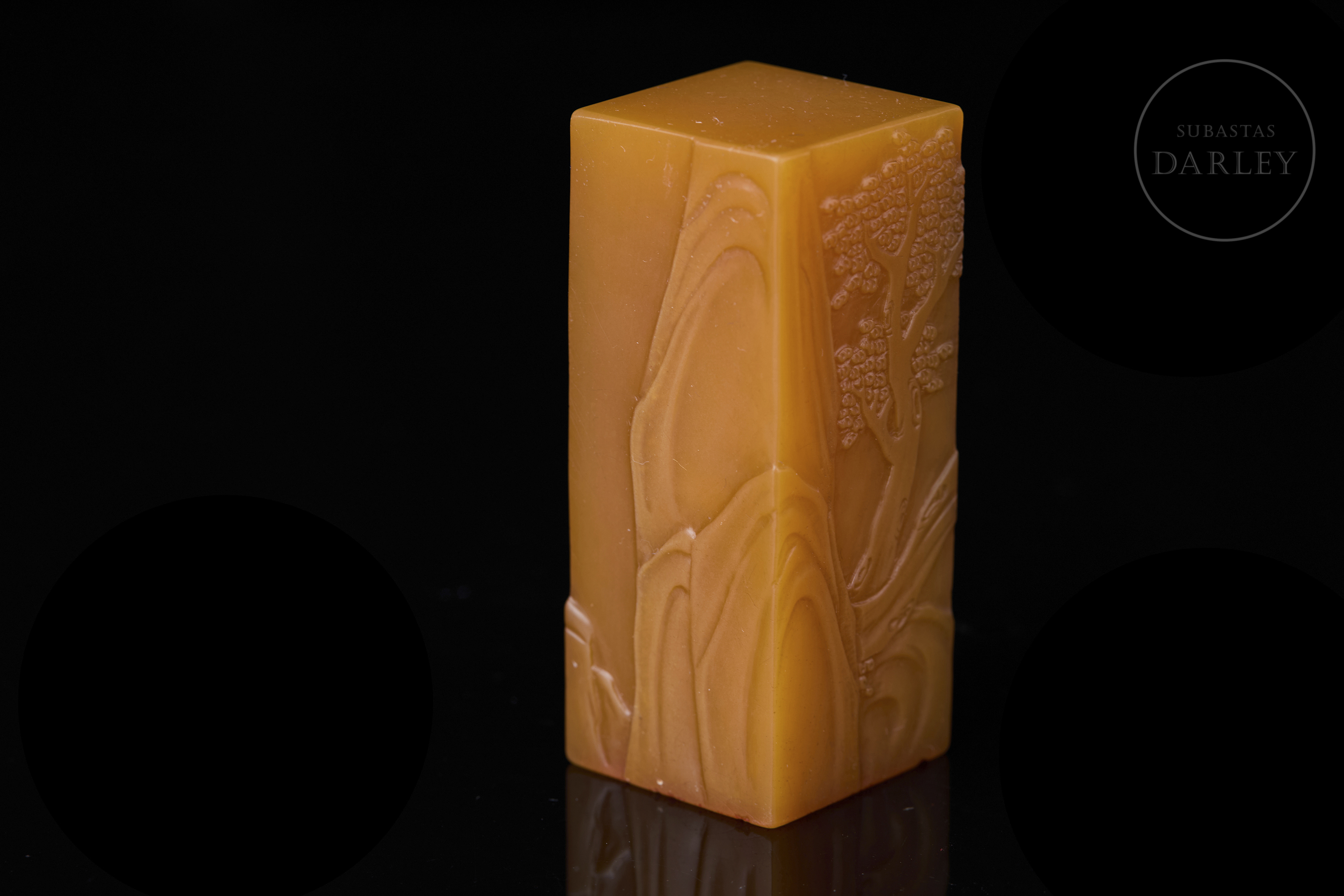 Piedra Shoushan tallada, de tonalidad miel intensa. Posee un formato rectangular, decorado mediante relieves de una escena de un sauce llorón, cuyas ramas caen con elegancia sobre una pequeña barca con personajes; todo rodeado por montañas y aves en vuelo. En uno de los laterales, se aprecia una inscripción caligráfica incisa. La base del sello contiene caracteres para estampado con restos de cinabrio rojo. Se presenta sobre una peana textil y con su caja original forrada. Dinastía Qing (1644–1912).