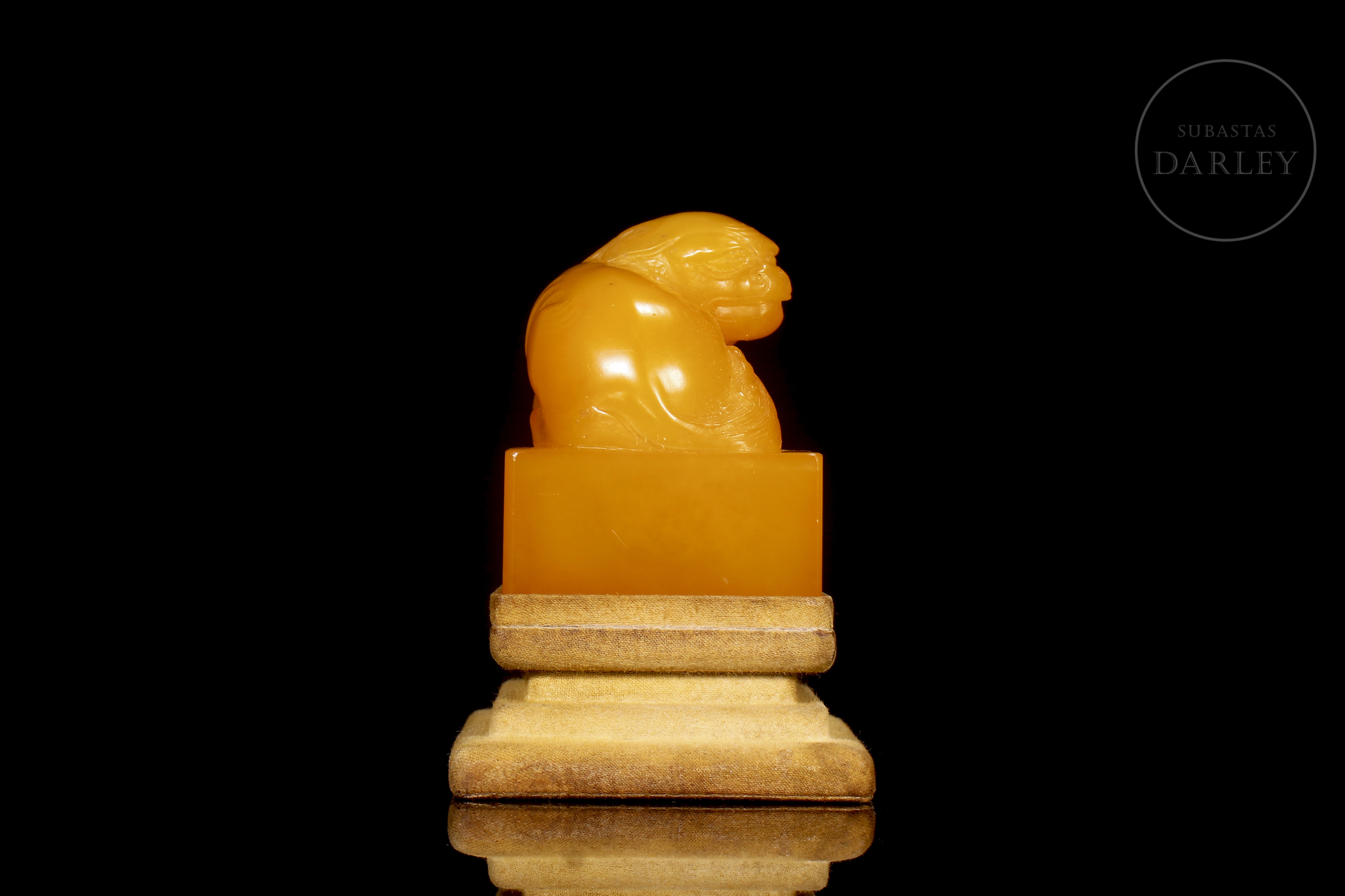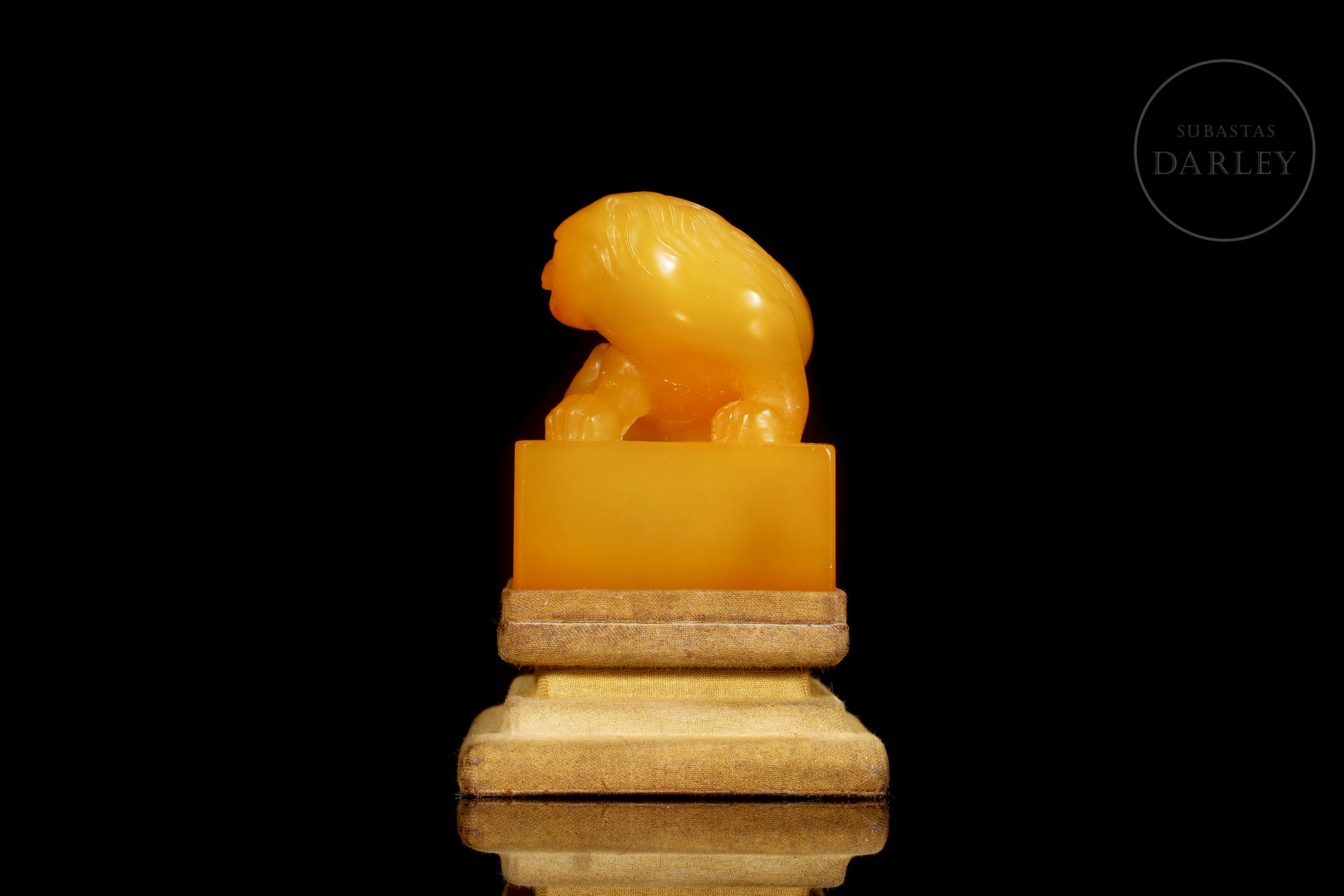 Sello de piedra Shoushan de una tonalidad miel translúcida con vetas rojizas y anaranjadas. La pieza presenta un formato de sello de base cuadrangular, coronado por una talla en bulto redondo de una bestia celestial mítica en actitud vigilante, con el cuerpo recogido, una pata avanzada y la cabeza ligeramente ladeada. La figura se muestra con un minucioso trabajo de talla en la musculatura, pelaje y rasgos faciales.En la base se dispone un sello tallado en bajo relieve. Dinastía Qing (1644–1911).