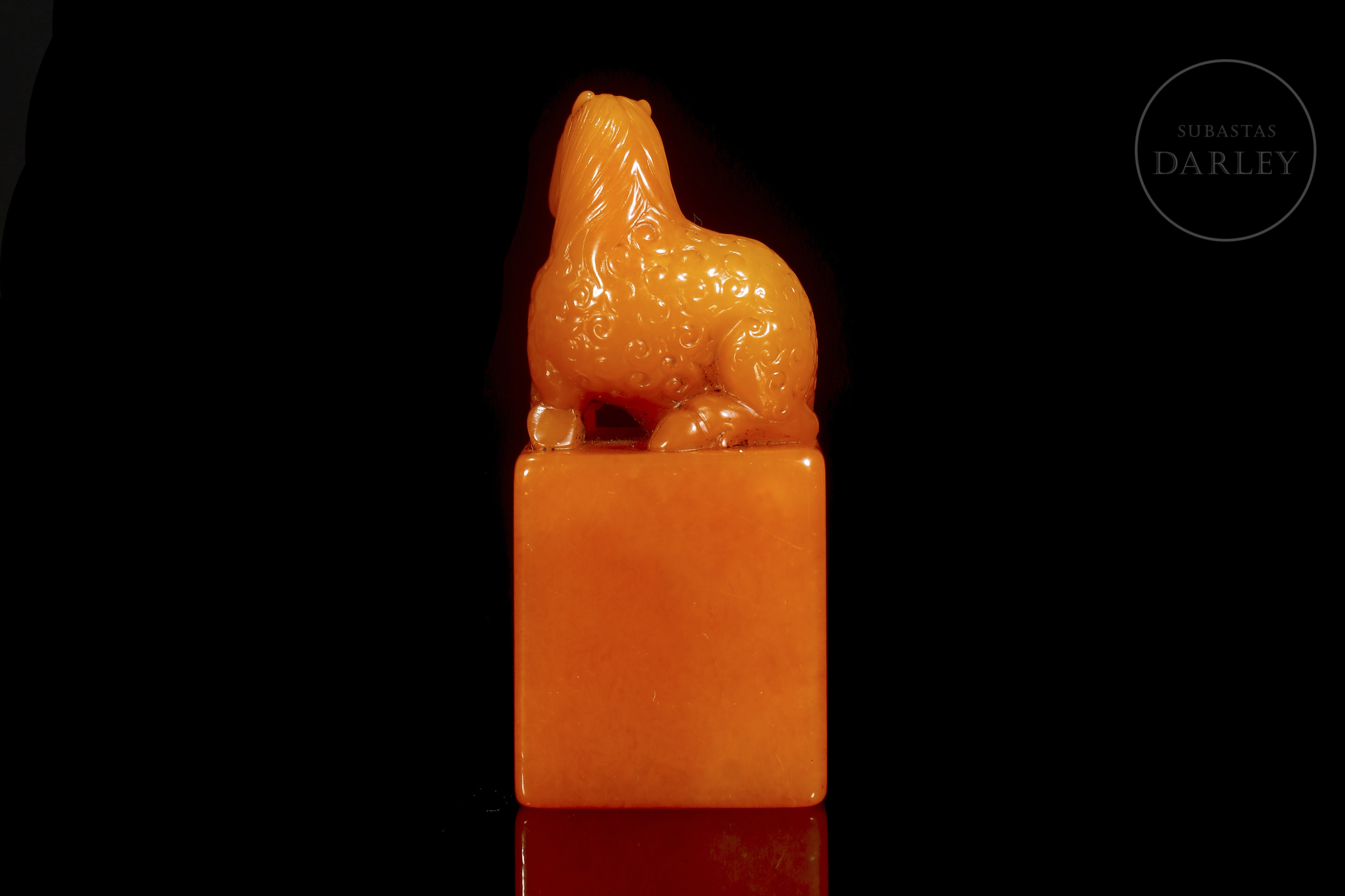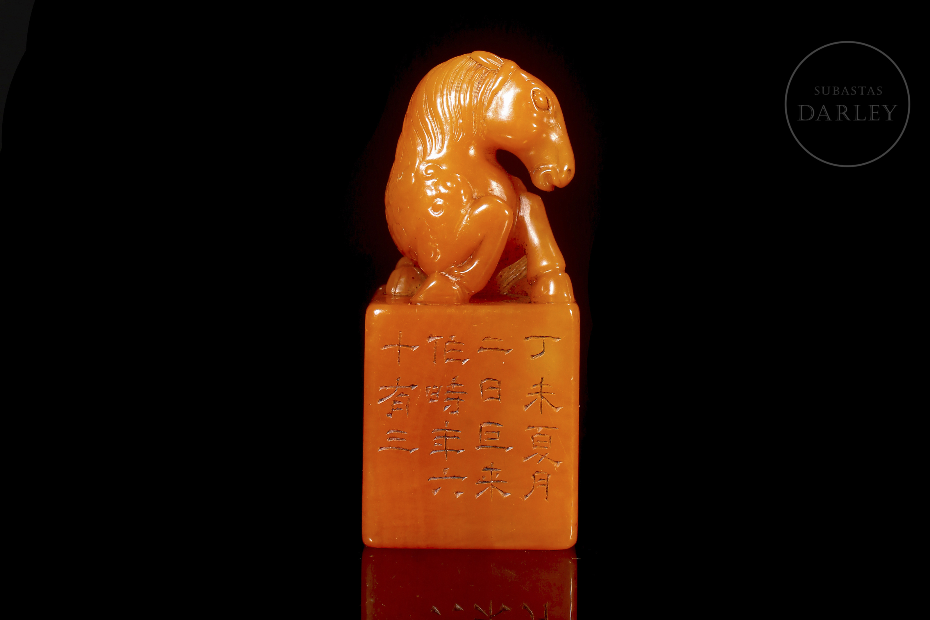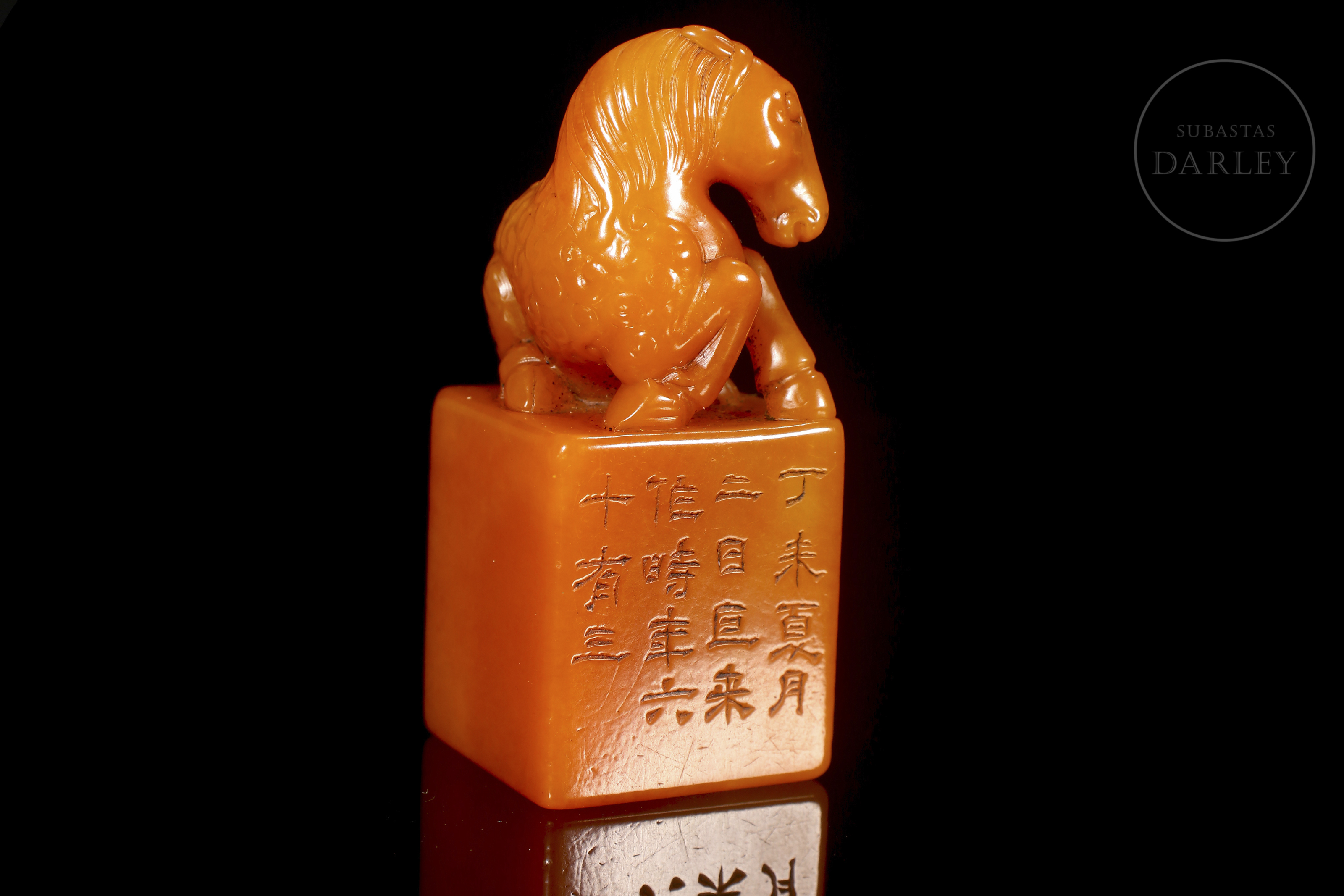 Tallado en piedra Shoushan de tonalidad anaranjada, coronado por la figura de un caballo en posición sedente, con la cabeza girada hacia el lomo, trabajado con atención al detalle en las crines y el pelaje, resuelto en volutas ondulantes. En uno de los laterales, presenta una inscripción caligráfica incisa. La base del sello conserva el grabado original para su estampado. Con caja a medida forrada en tela.