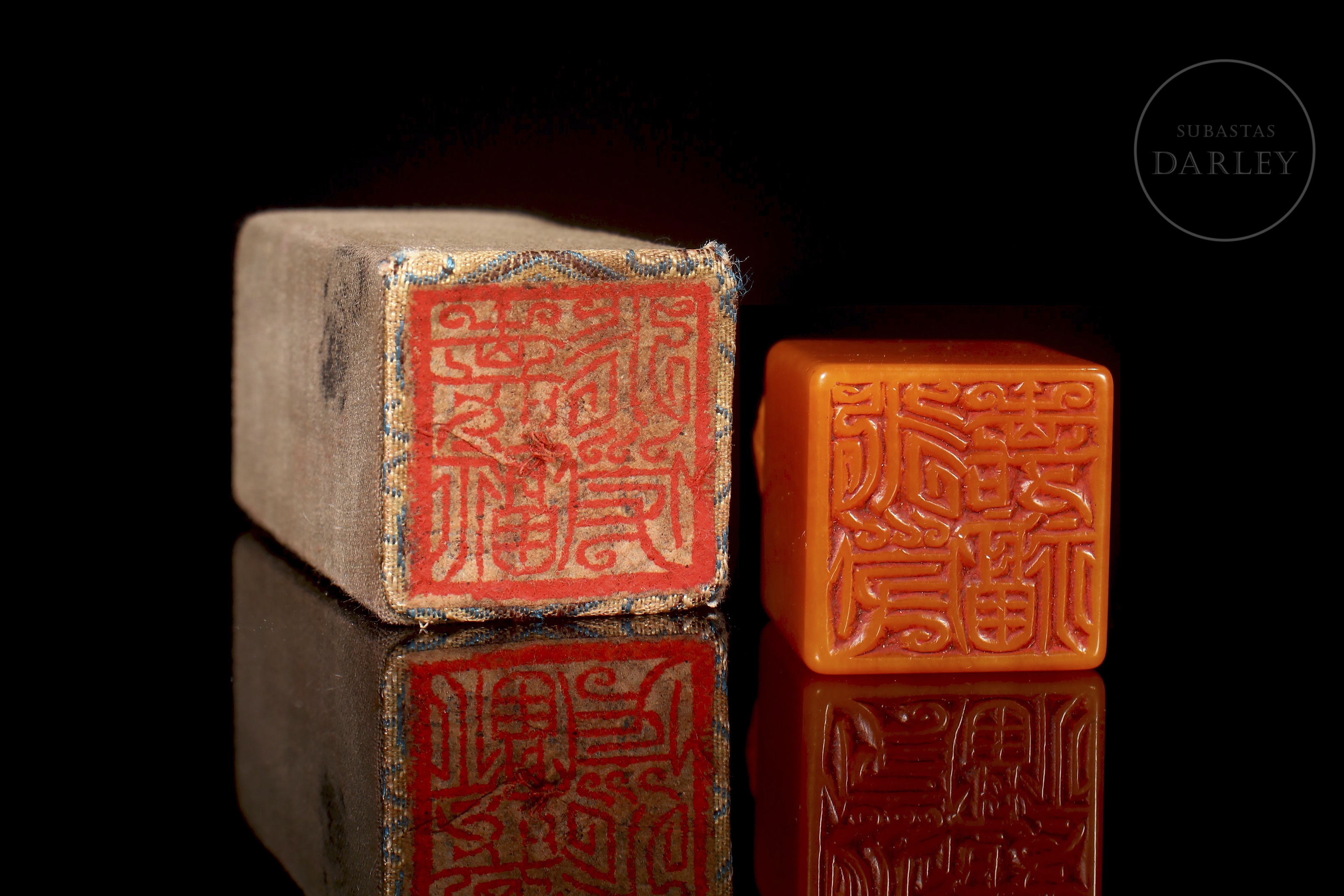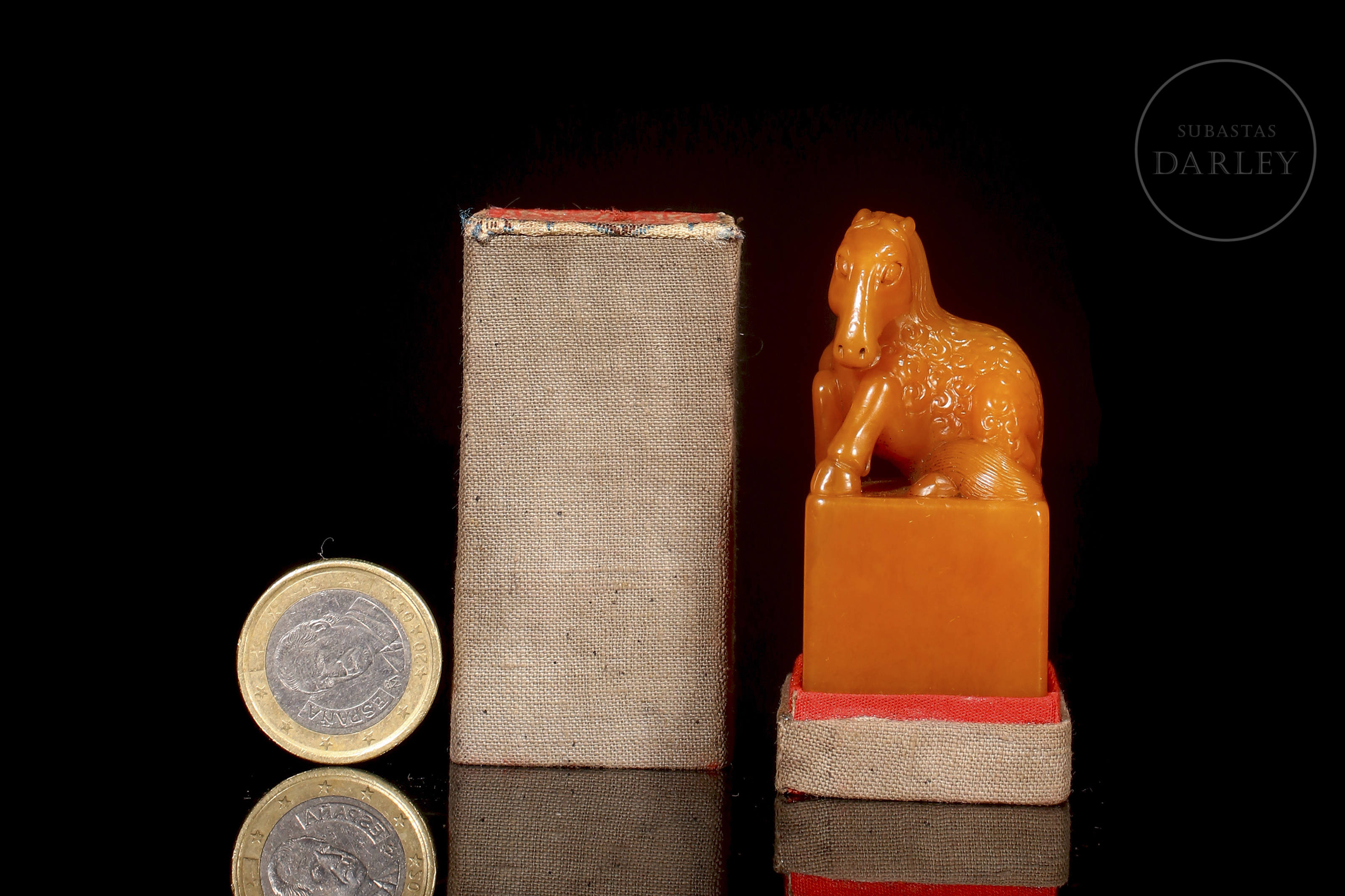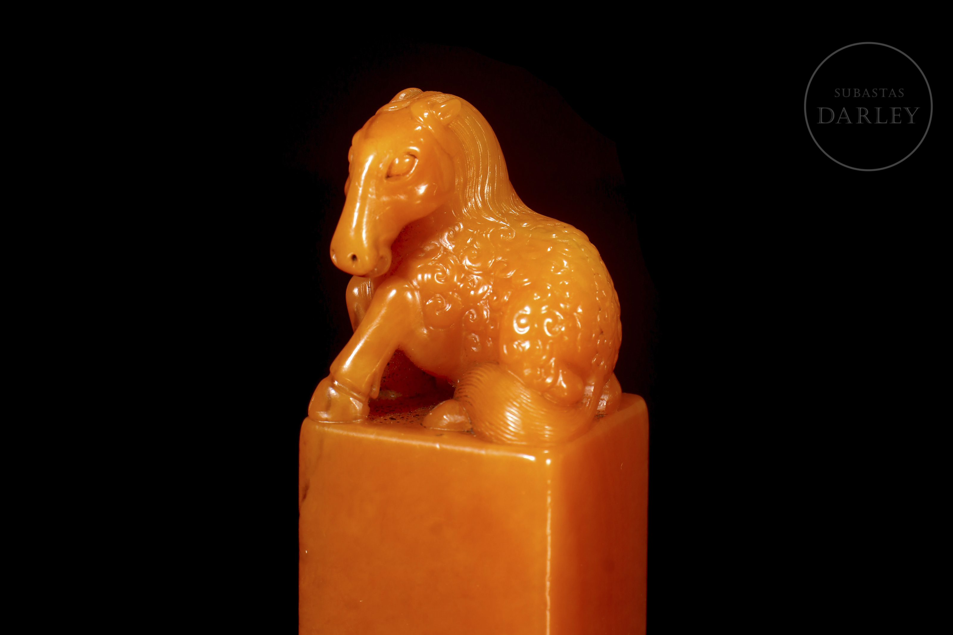 Tallado en piedra Shoushan de tonalidad anaranjada, coronado por la figura de un caballo en posición sedente, con la cabeza girada hacia el lomo, trabajado con atención al detalle en las crines y el pelaje, resuelto en volutas ondulantes. En uno de los laterales, presenta una inscripción caligráfica incisa. La base del sello conserva el grabado original para su estampado. Con caja a medida forrada en tela.