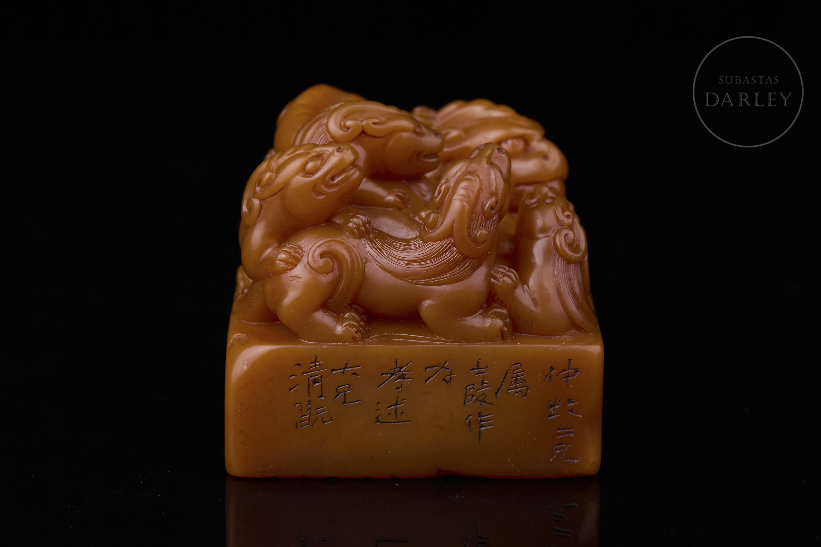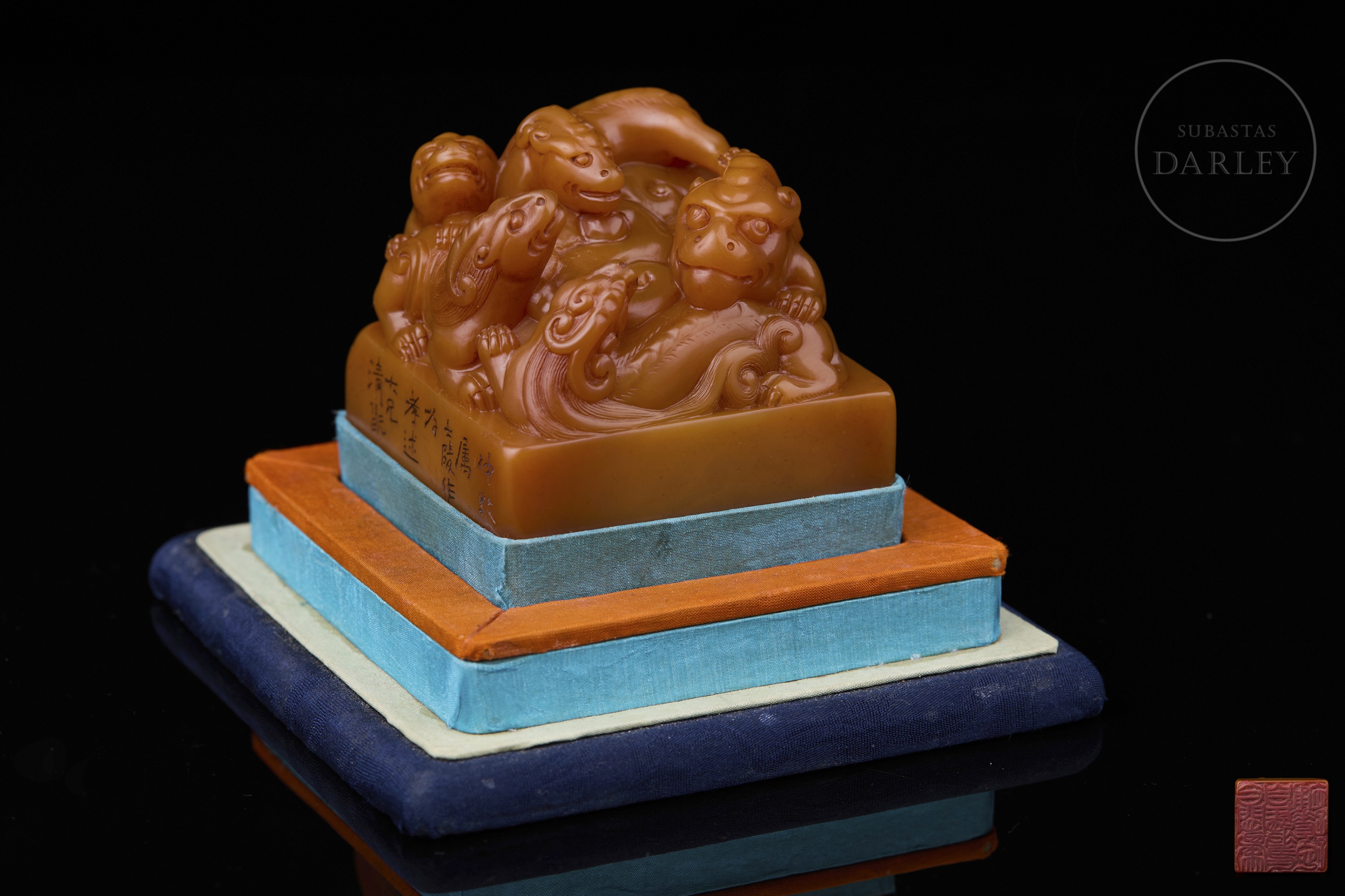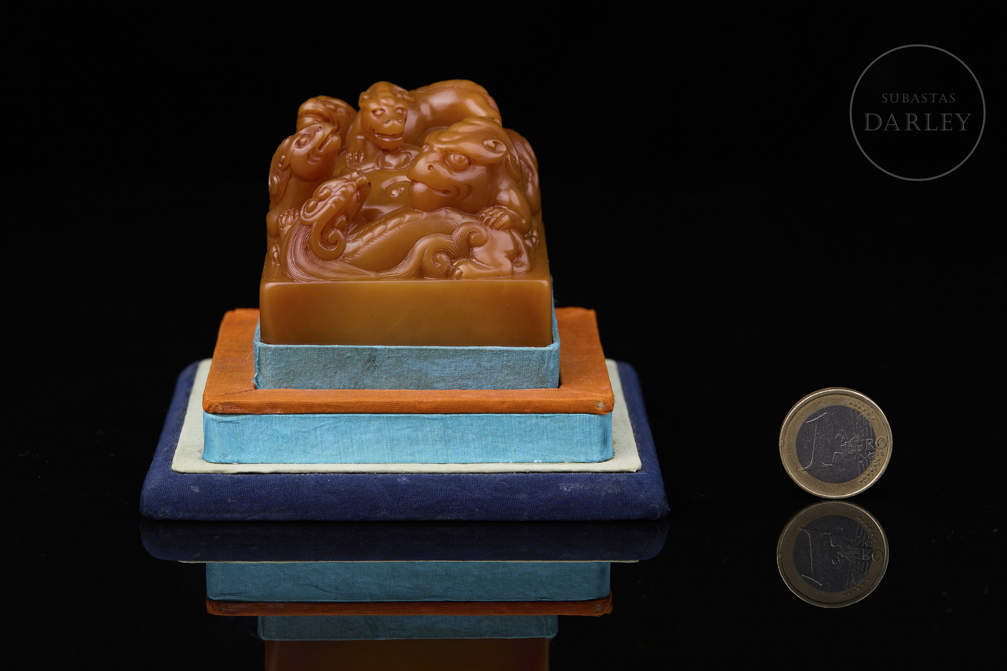 Sello tallado de piedra Tianhuang, de color ámbar intenso, y forma cuadrada. Se encuentra adornado por una composición de una bestia mítica con sus crías, en pose dinámica y protectora, destacando el alto nivel de detalle en pelaje, rostros y patas. En el lateral se aprecia un poema inciso. La matriz muestra caracteres grabados y restos de lacre rojo. Con soporte textil a medida. Dinastía Qing (1644–1912).