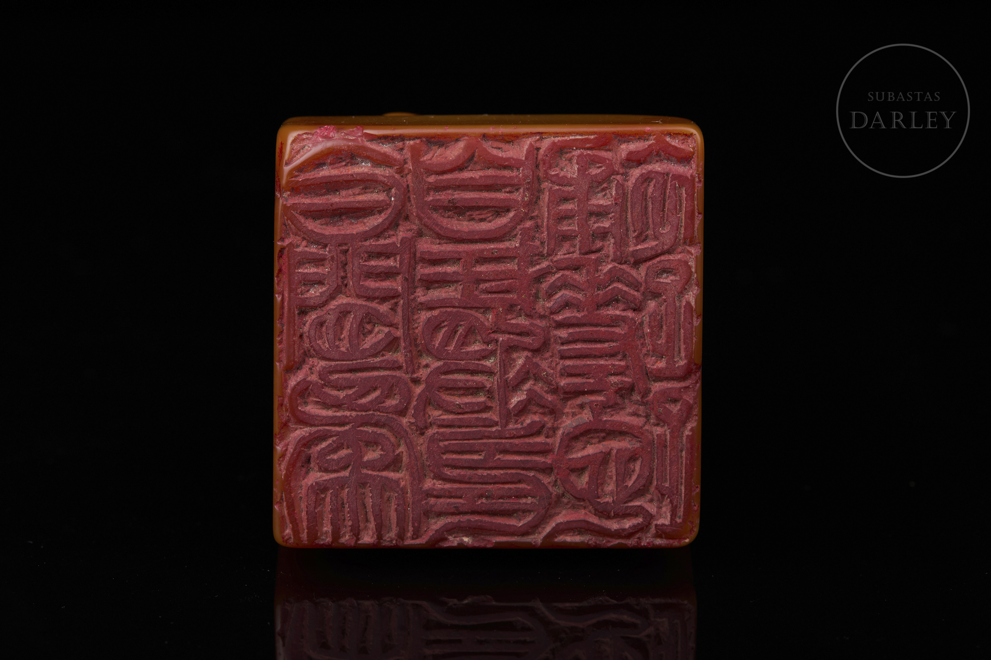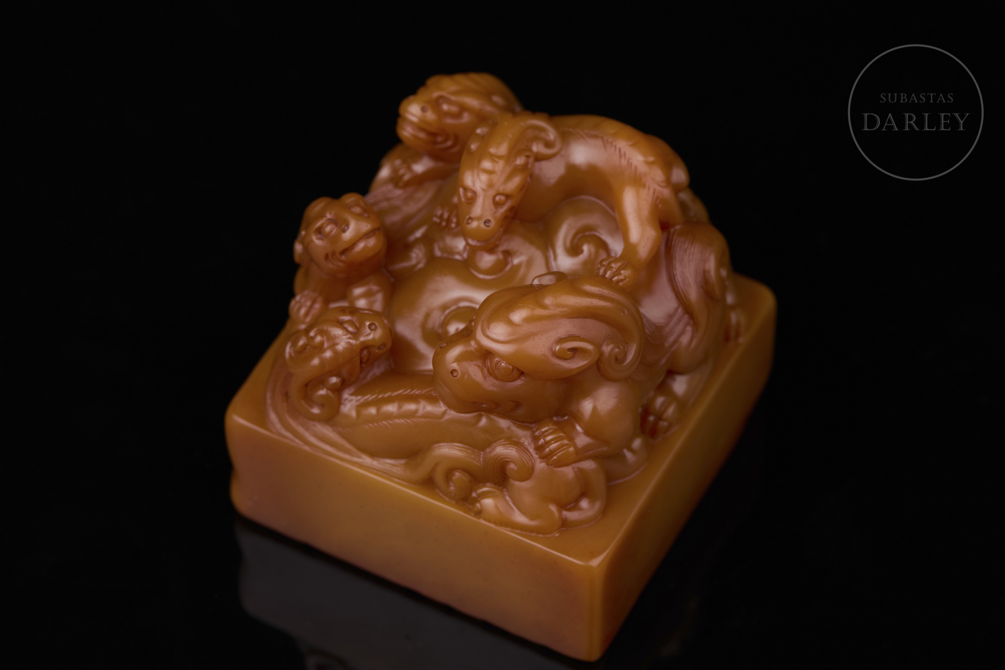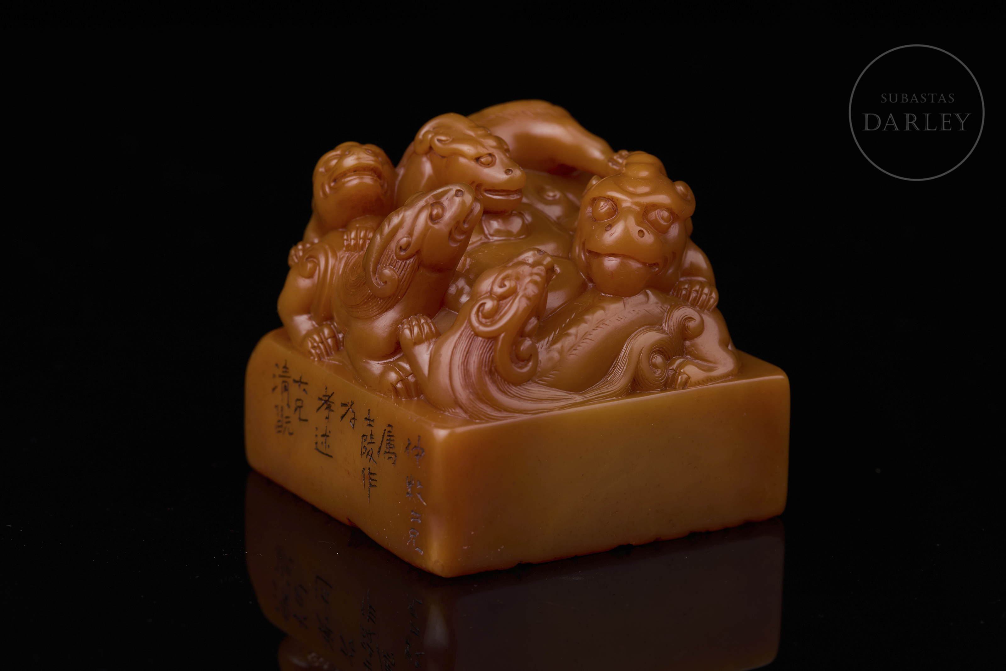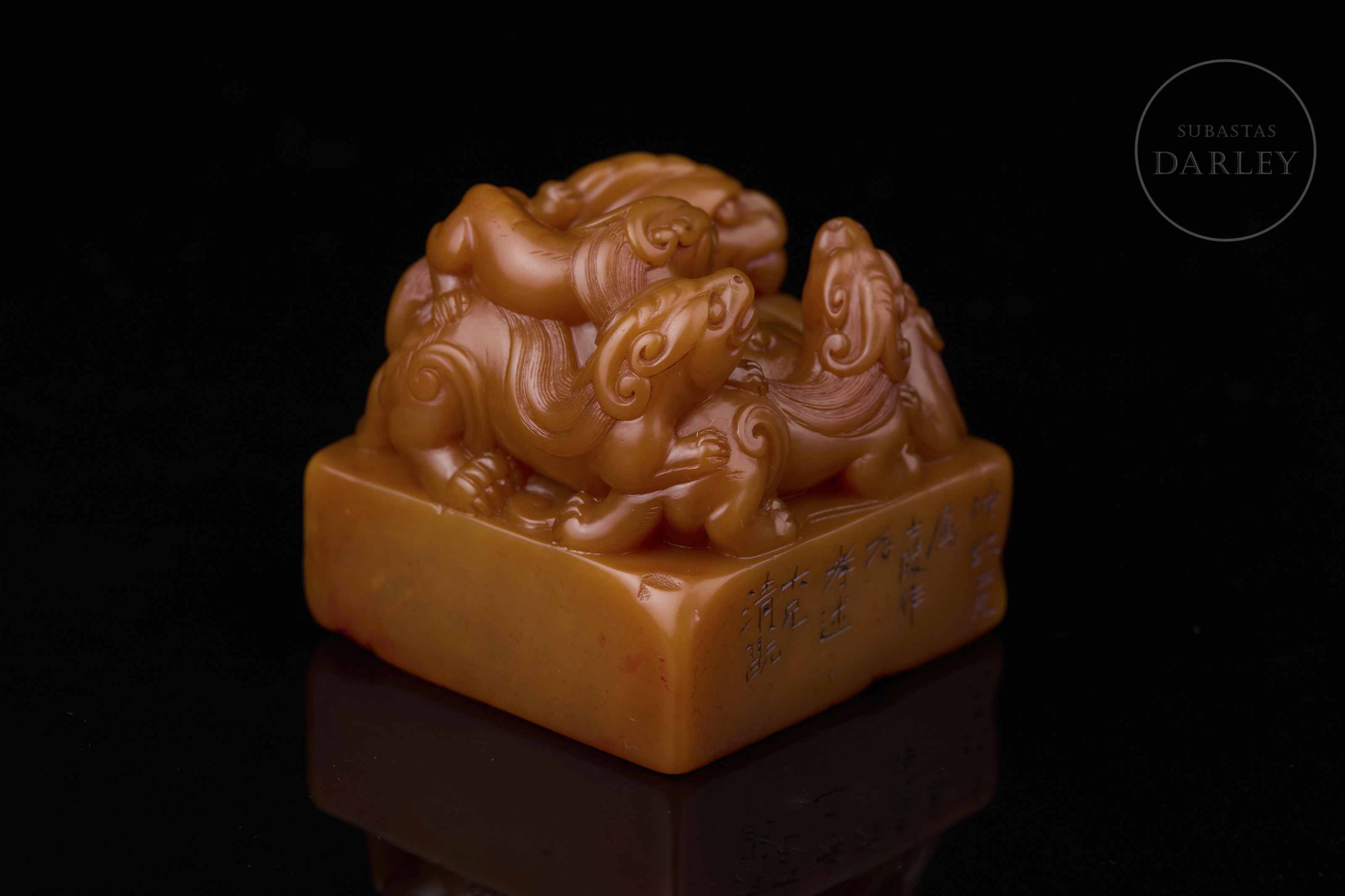 Sello tallado de piedra Tianhuang, de color ámbar intenso, y forma cuadrada. Se encuentra adornado por una composición de una bestia mítica con sus crías, en pose dinámica y protectora, destacando el alto nivel de detalle en pelaje, rostros y patas. En el lateral se aprecia un poema inciso. La matriz muestra caracteres grabados y restos de lacre rojo. Con soporte textil a medida. Dinastía Qing (1644–1912).