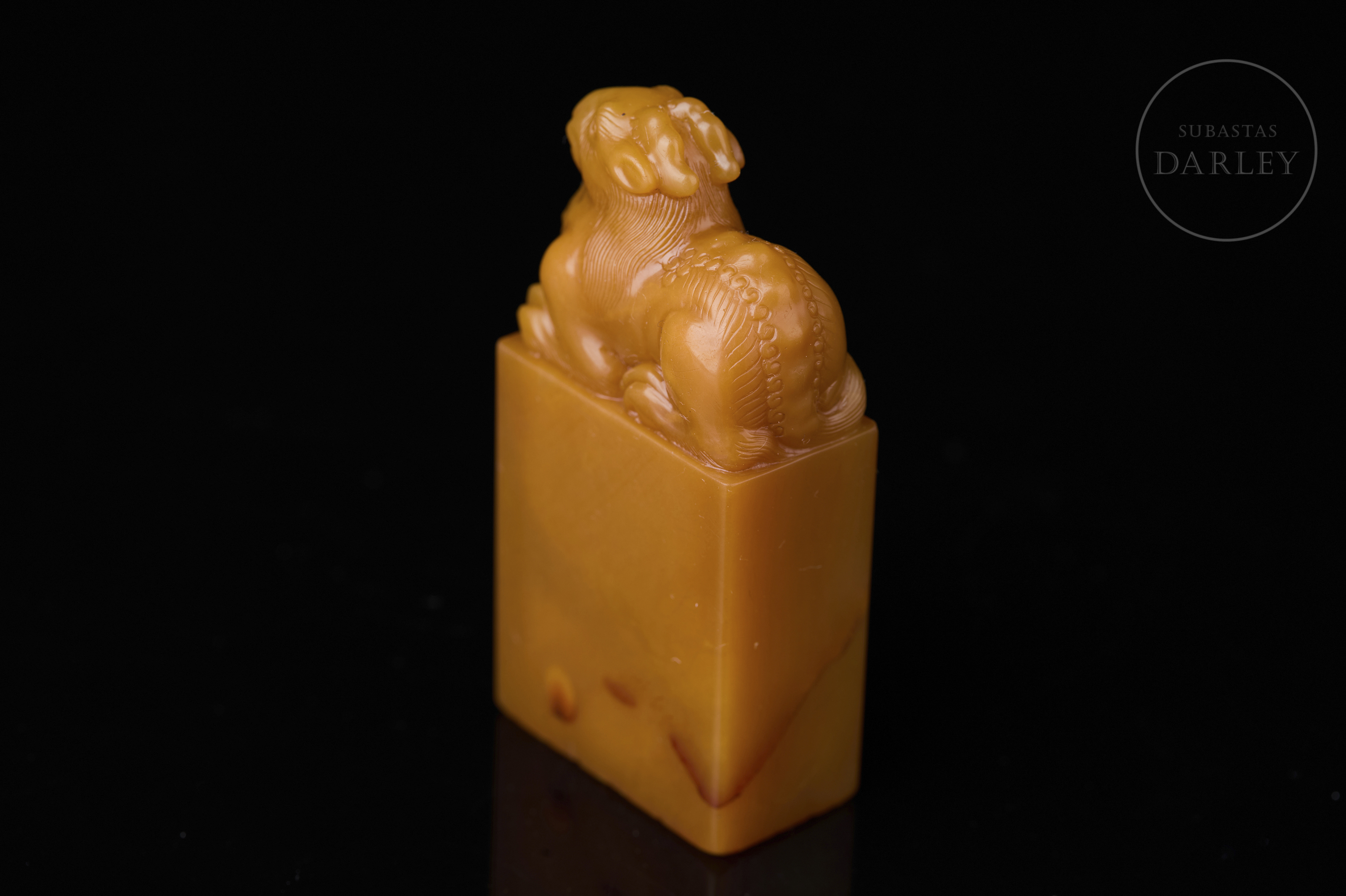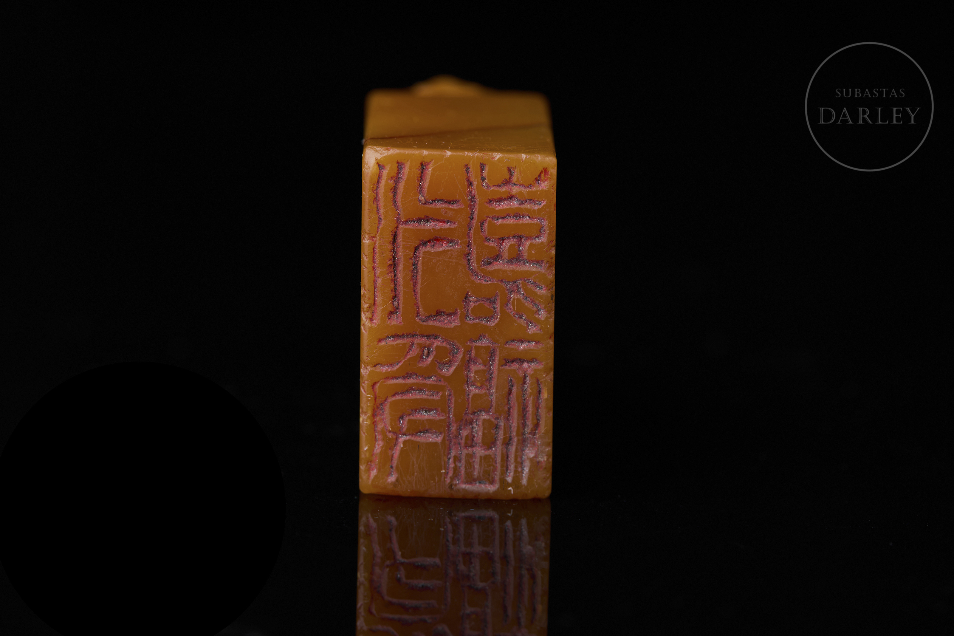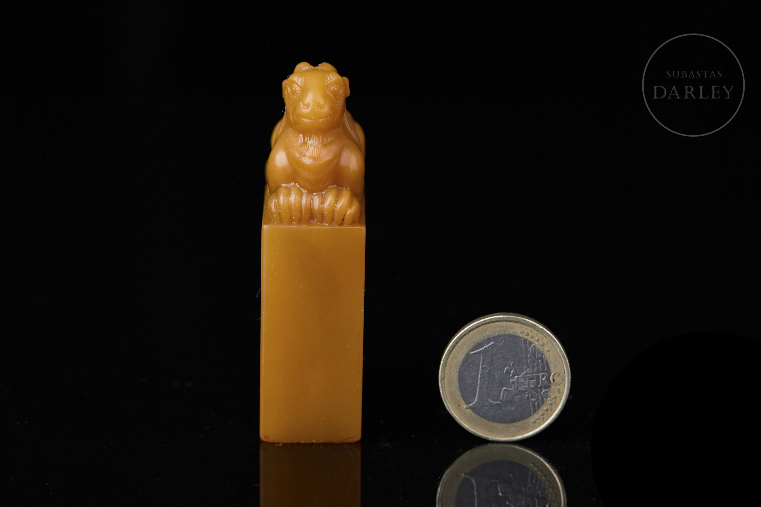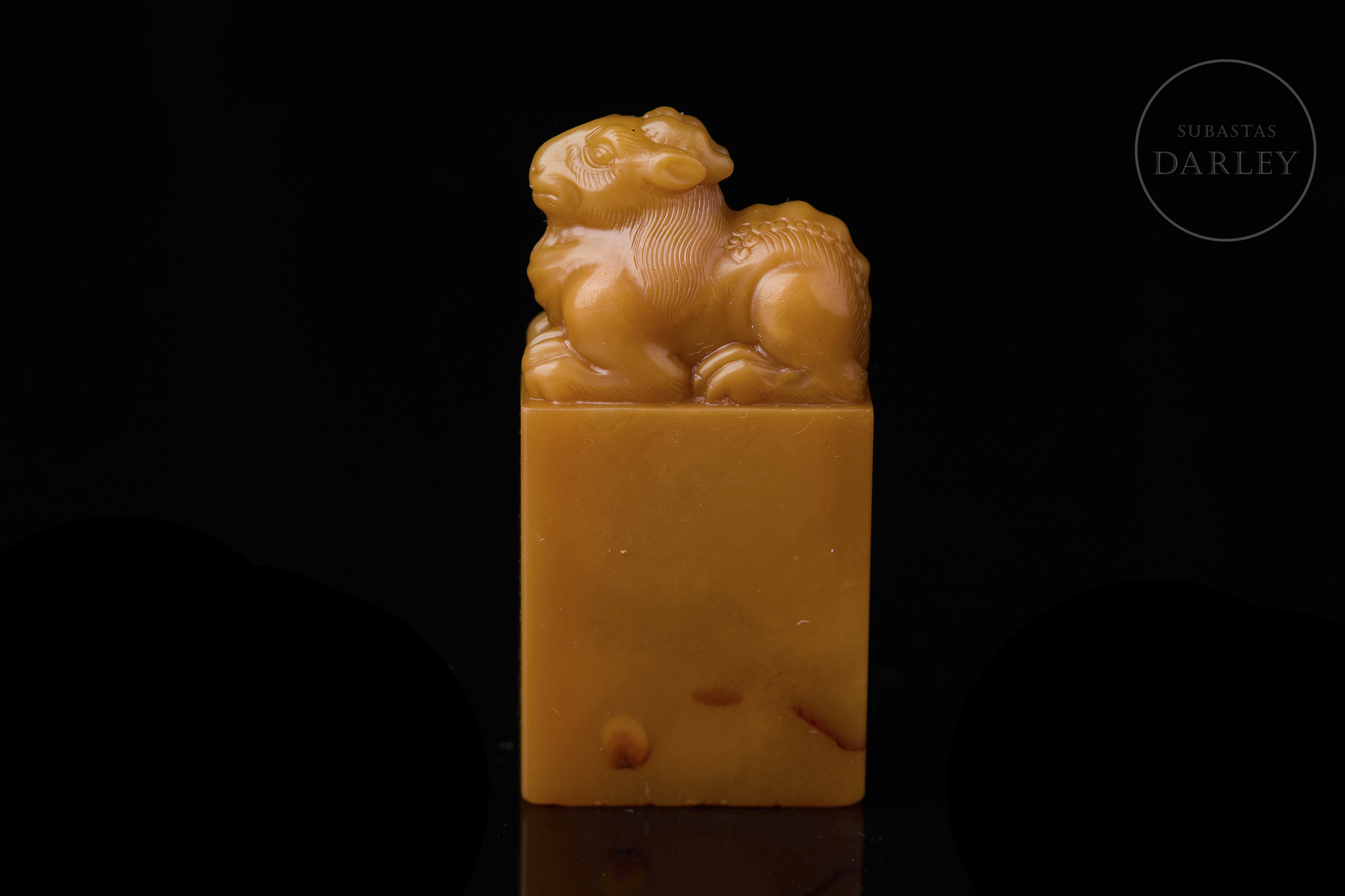 Piedra Shoushan tallada. Presenta un formato rectangular rematado por la imagen de un carnero recostado, en pose de serenidad, con las patas replegadas bajo su cuerpo y detalles en relieve en el pelaje, la melena y los cuernos curvos. En una de las caras se aprecia una inscripción caligráfica incisa. La base contiene caracteres grabados para su estampado con restos de pigmento de cinabrio. Se acompaña de una peana y caja a medida. Dinastía Qing (1644-1912).