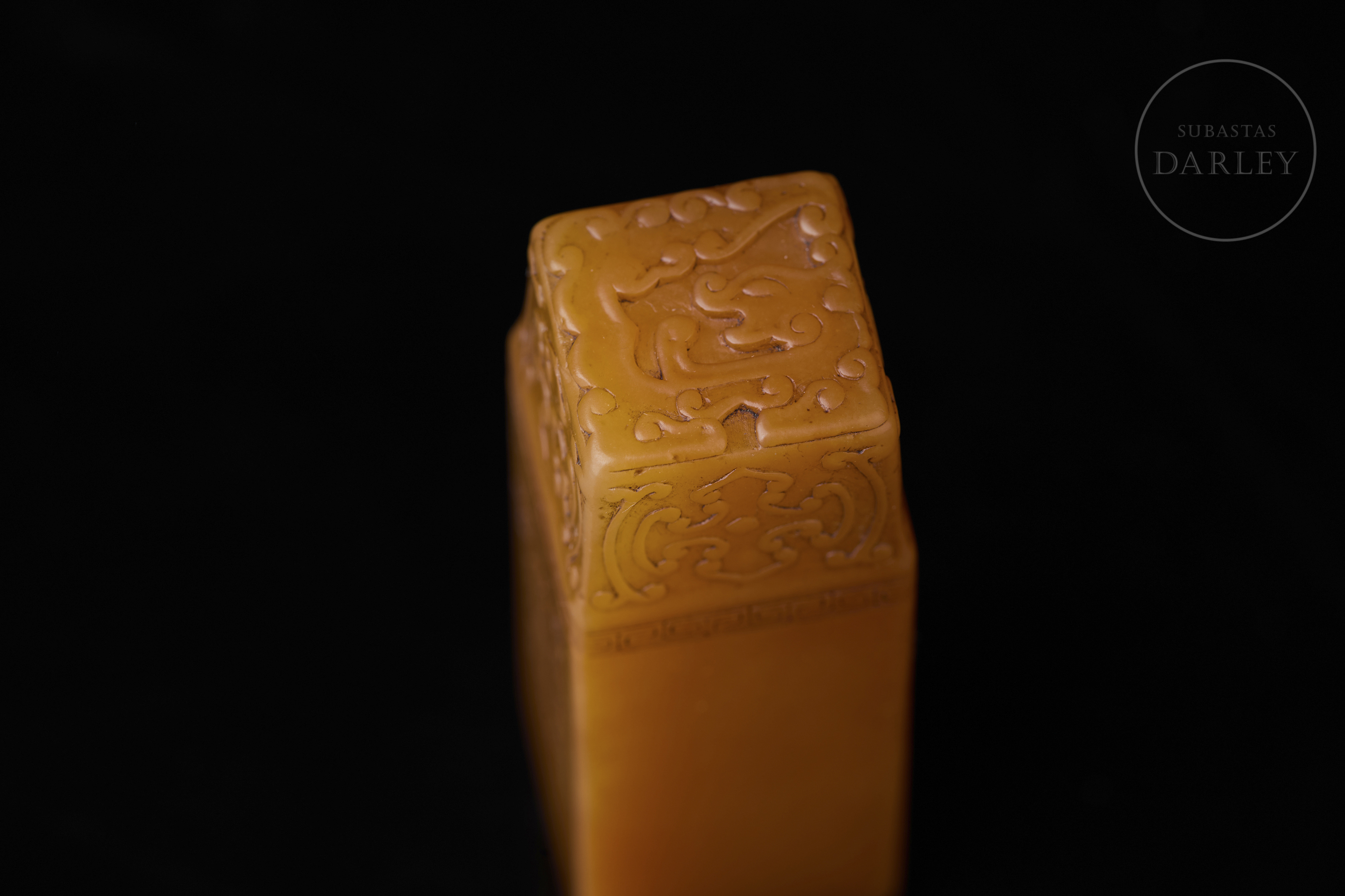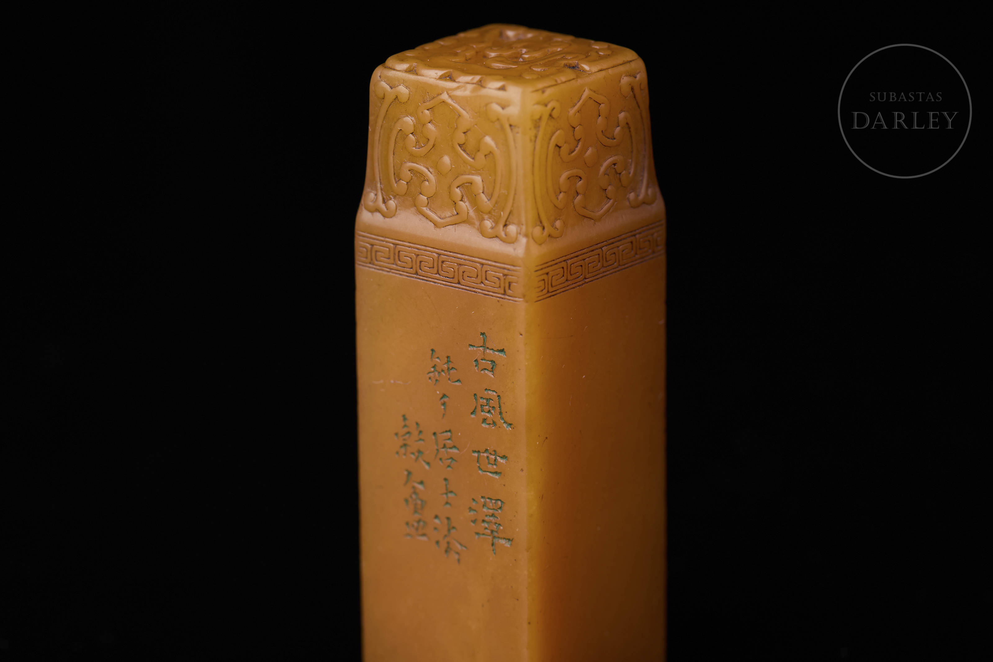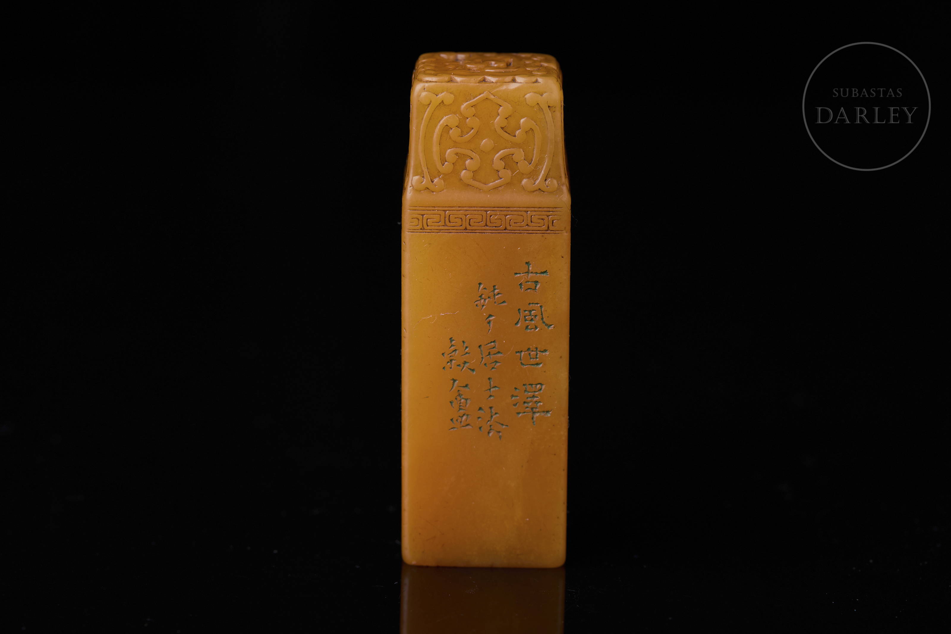 Piedra Shoushan tallada. Posee forma rectangular con los hombros rebajados, rematado por la imagen en bajorrelieve de un dragón chilong arcaizante. Bajo este, una banda de grecas y cruces en relieve adorna la zona superior, seguida por una inscripción caligráfica incisa. La base contiene una inscripción grabada con restos de pigmento de cinabrio. Se acompaña de una peana y caja a medida forradas en seda.