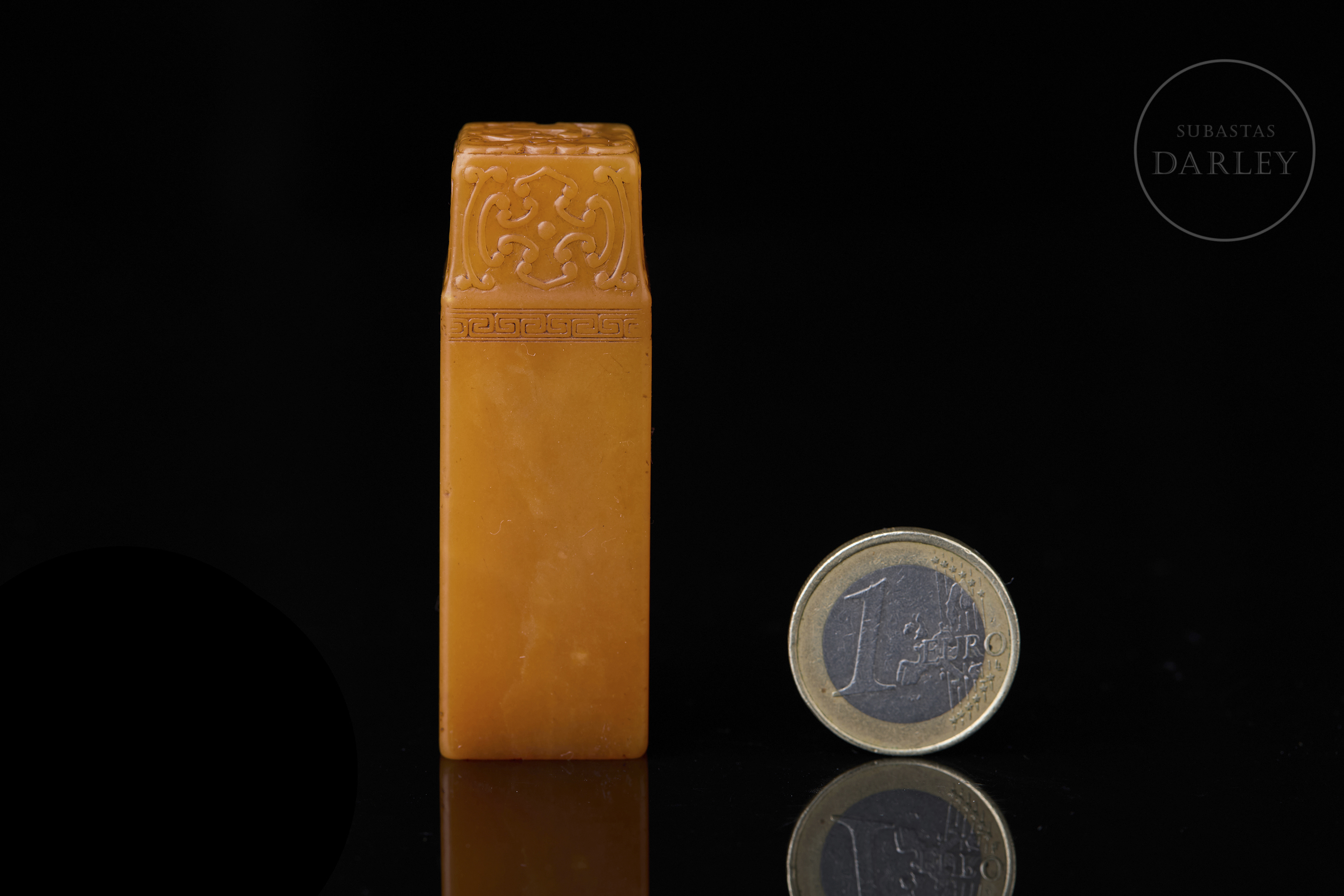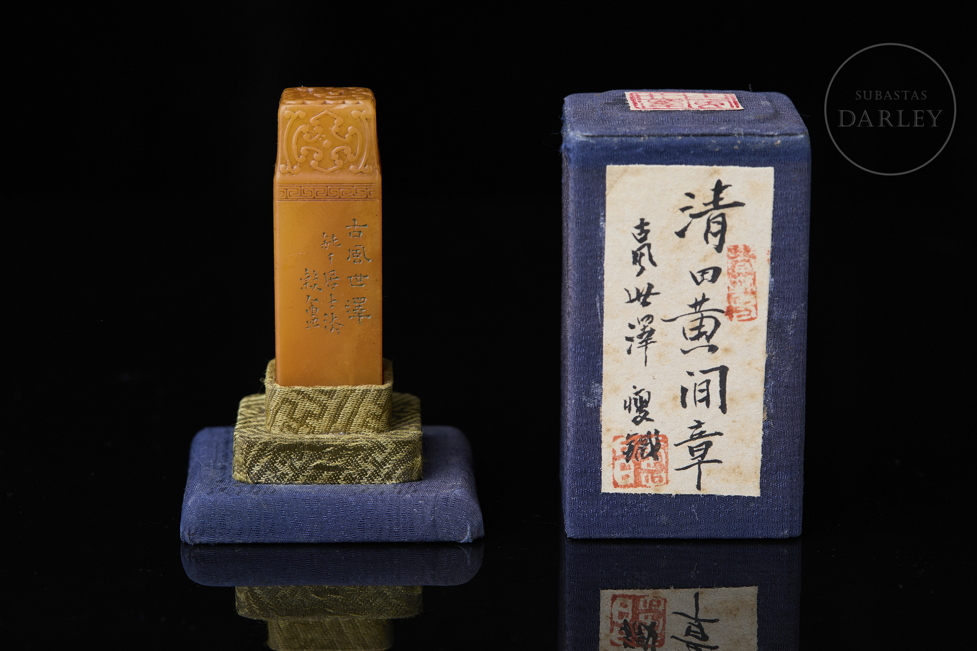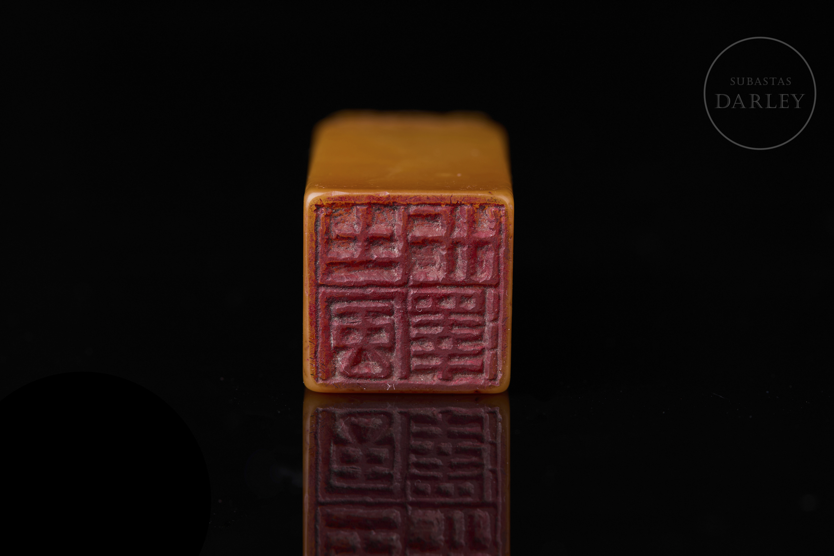 Piedra Shoushan tallada. Posee forma rectangular con los hombros rebajados, rematado por la imagen en bajorrelieve de un dragón chilong arcaizante. Bajo este, una banda de grecas y cruces en relieve adorna la zona superior, seguida por una inscripción caligráfica incisa. La base contiene una inscripción grabada con restos de pigmento de cinabrio. Se acompaña de una peana y caja a medida forradas en seda.