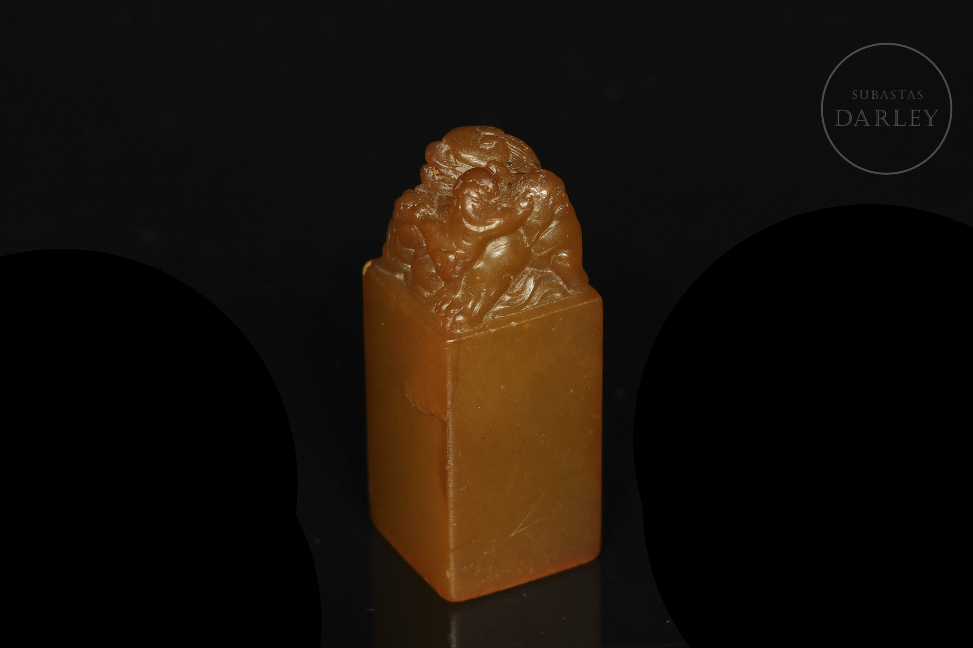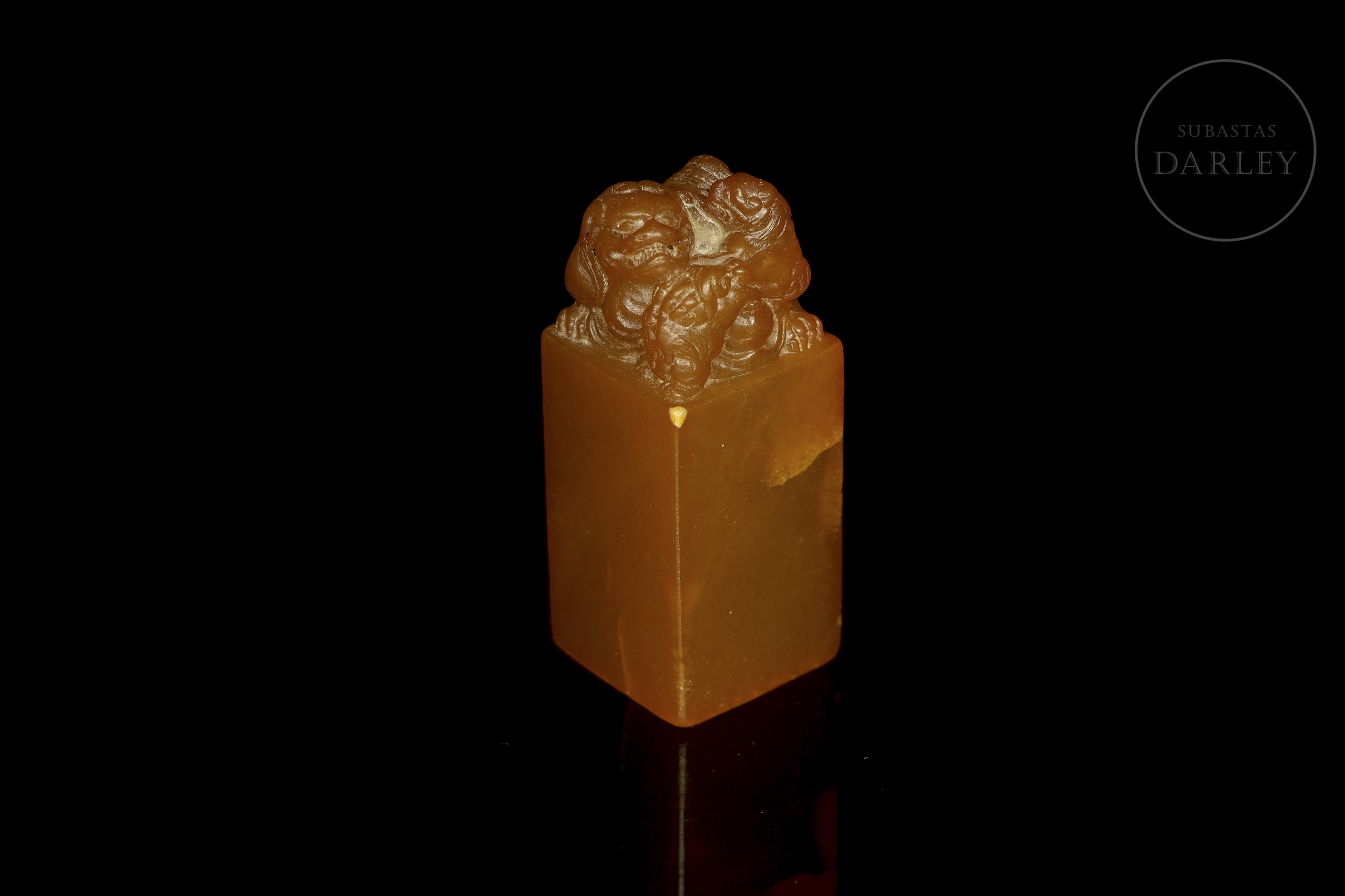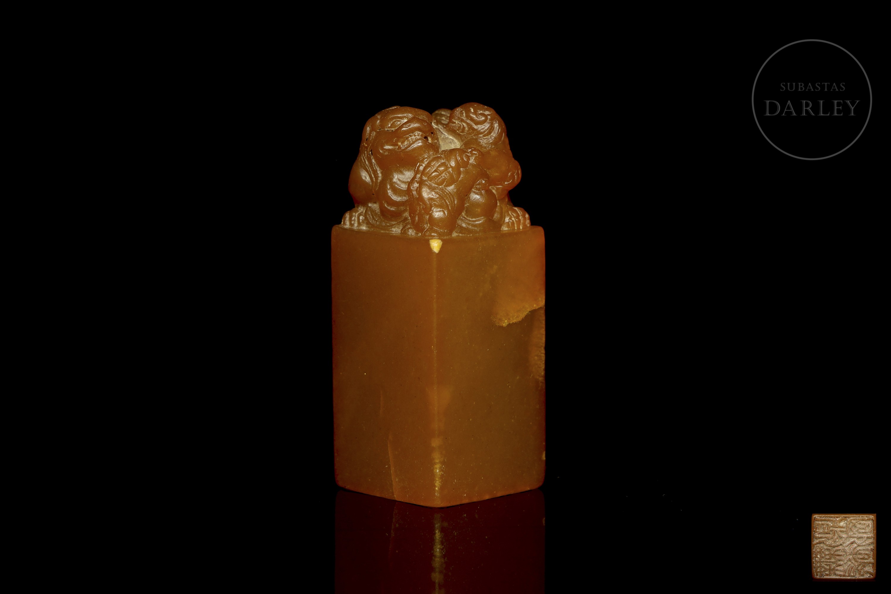 Piedra Shoushan de tonalidad ocre anaranjada. Posee una base rectangular rematada por una compleja talla que representa a una familia de leones junto a su cría, simbolizando la unidad y protección familiar. Se encuentran adornadas por líneas incisas y volúmenes en relieve. La base contiene una inscripción caligráfica grabada para su estampado. Muestra pátina por antigüedad. Dinastía Qing (1644–1912)