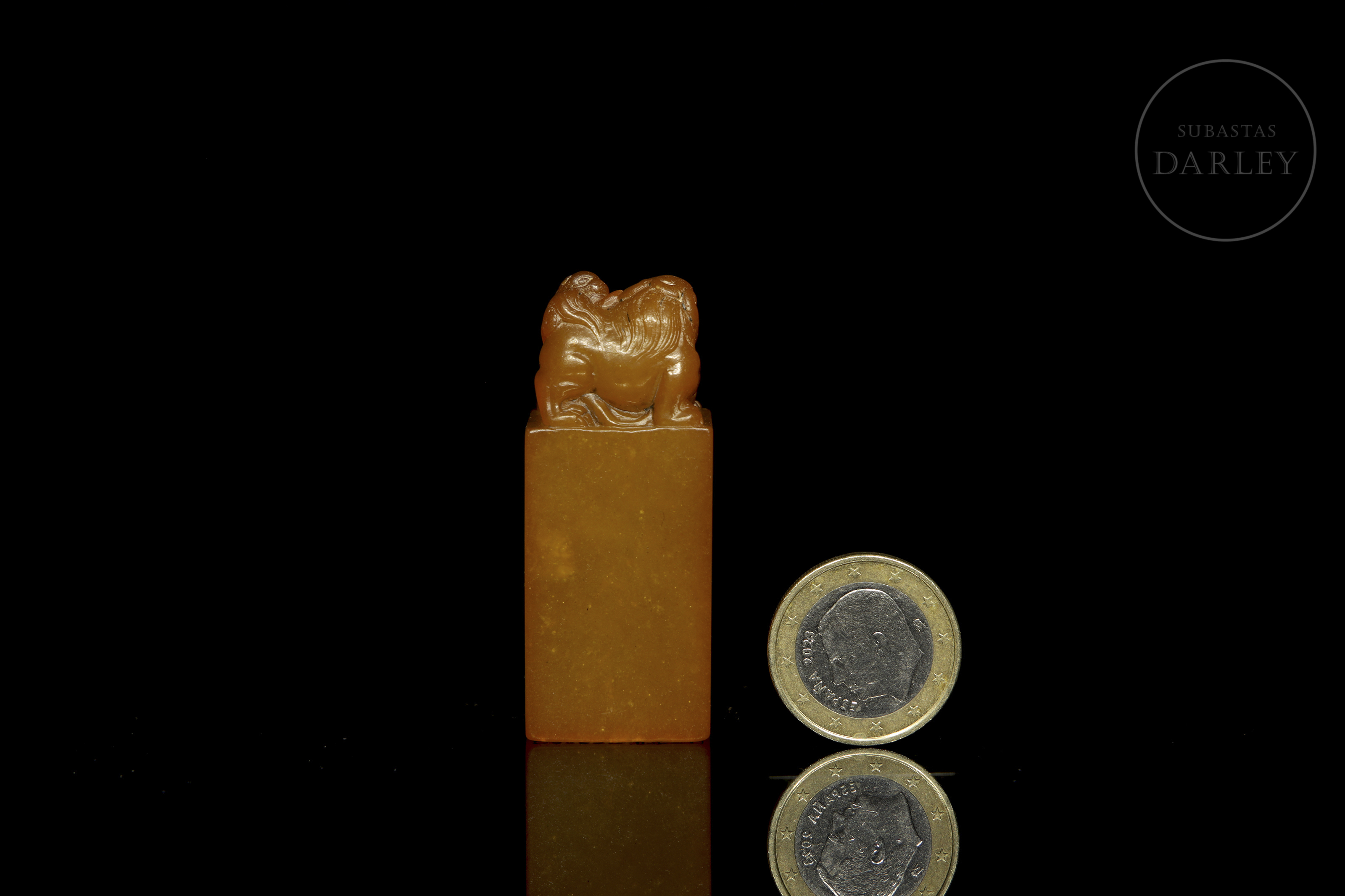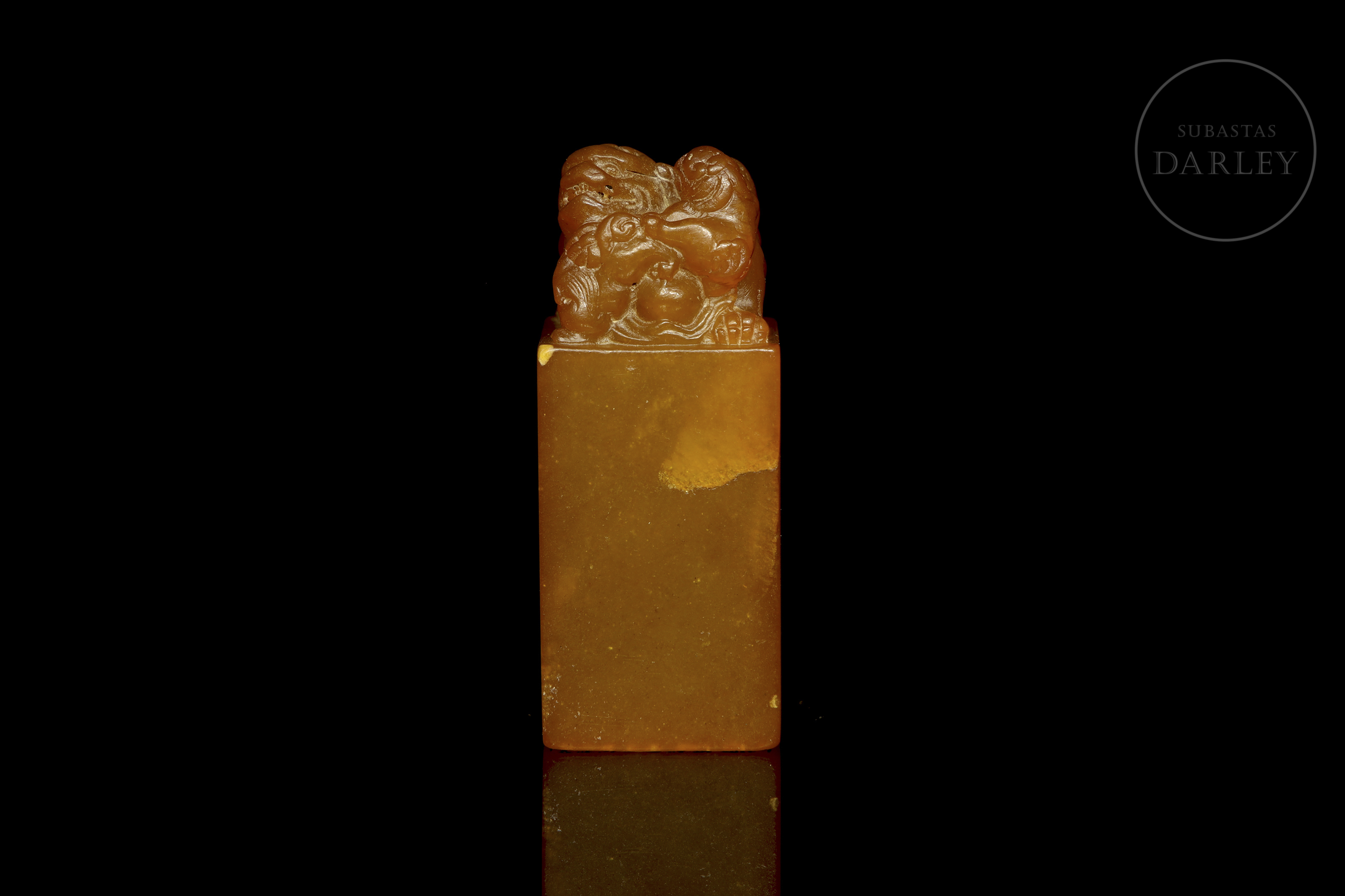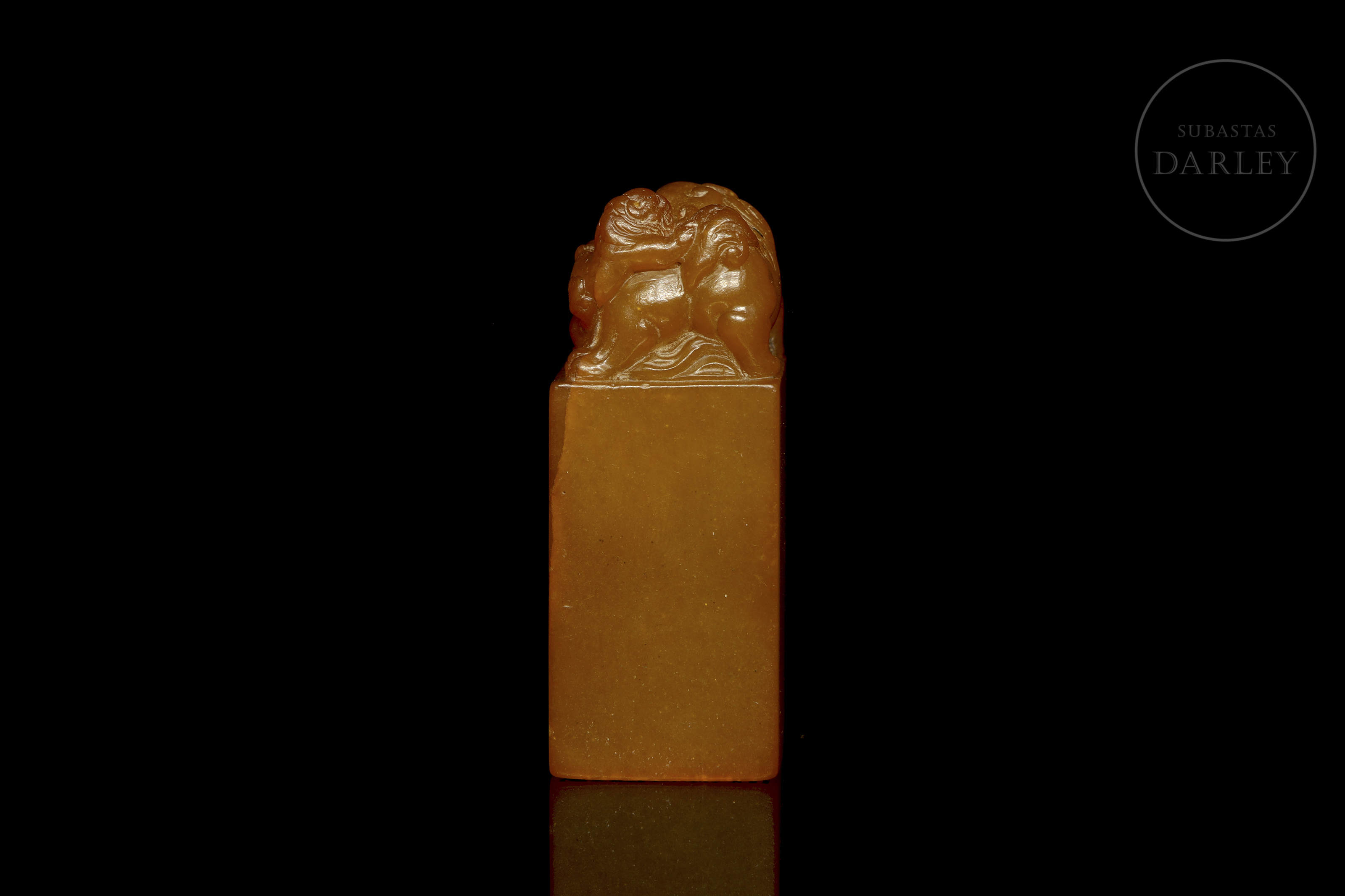 Piedra Shoushan de tonalidad ocre anaranjada. Posee una base rectangular rematada por una compleja talla que representa a una familia de leones junto a su cría, simbolizando la unidad y protección familiar. Se encuentran adornadas por líneas incisas y volúmenes en relieve. La base contiene una inscripción caligráfica grabada para su estampado. Muestra pátina por antigüedad. Dinastía Qing (1644–1912)