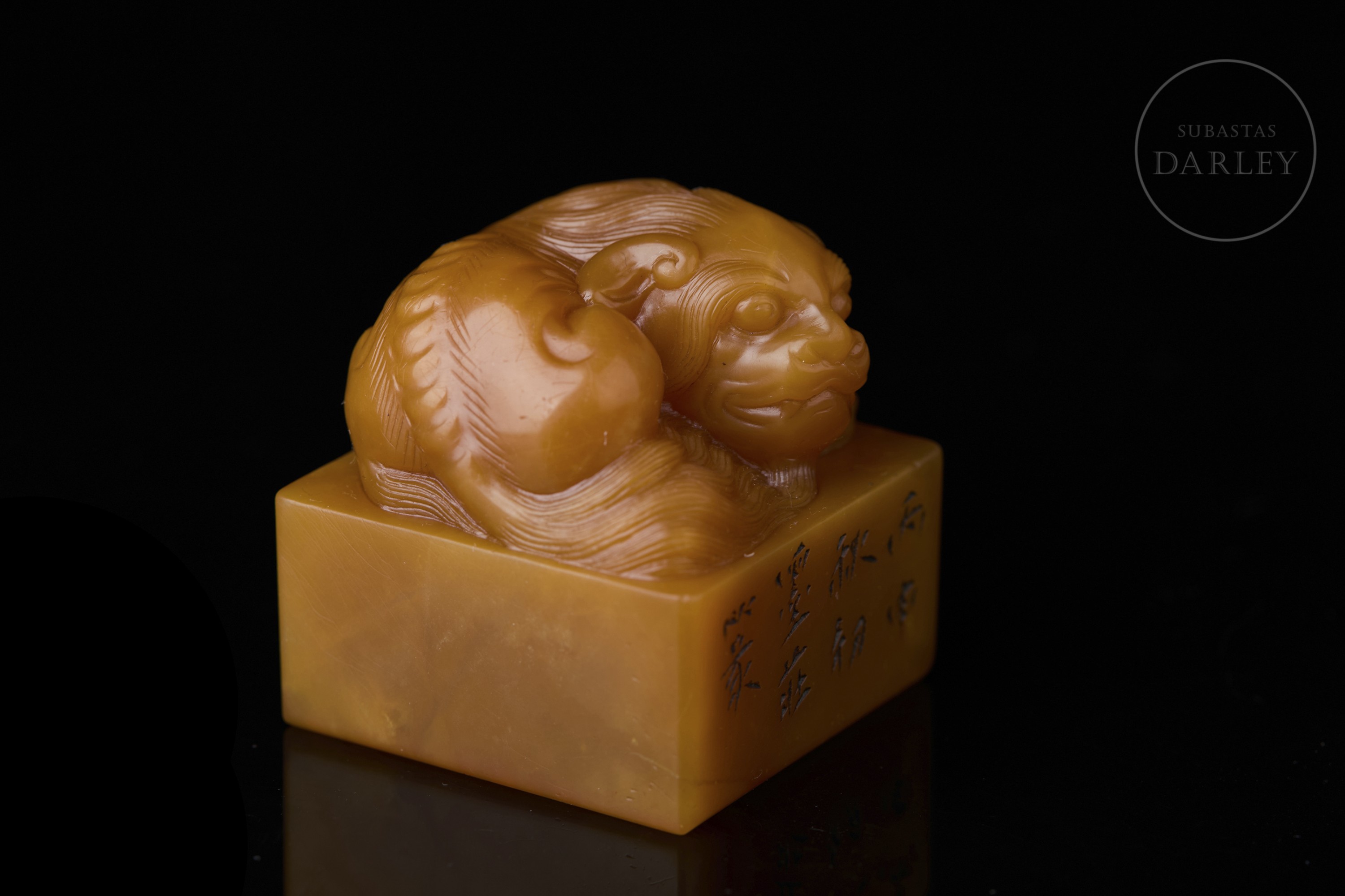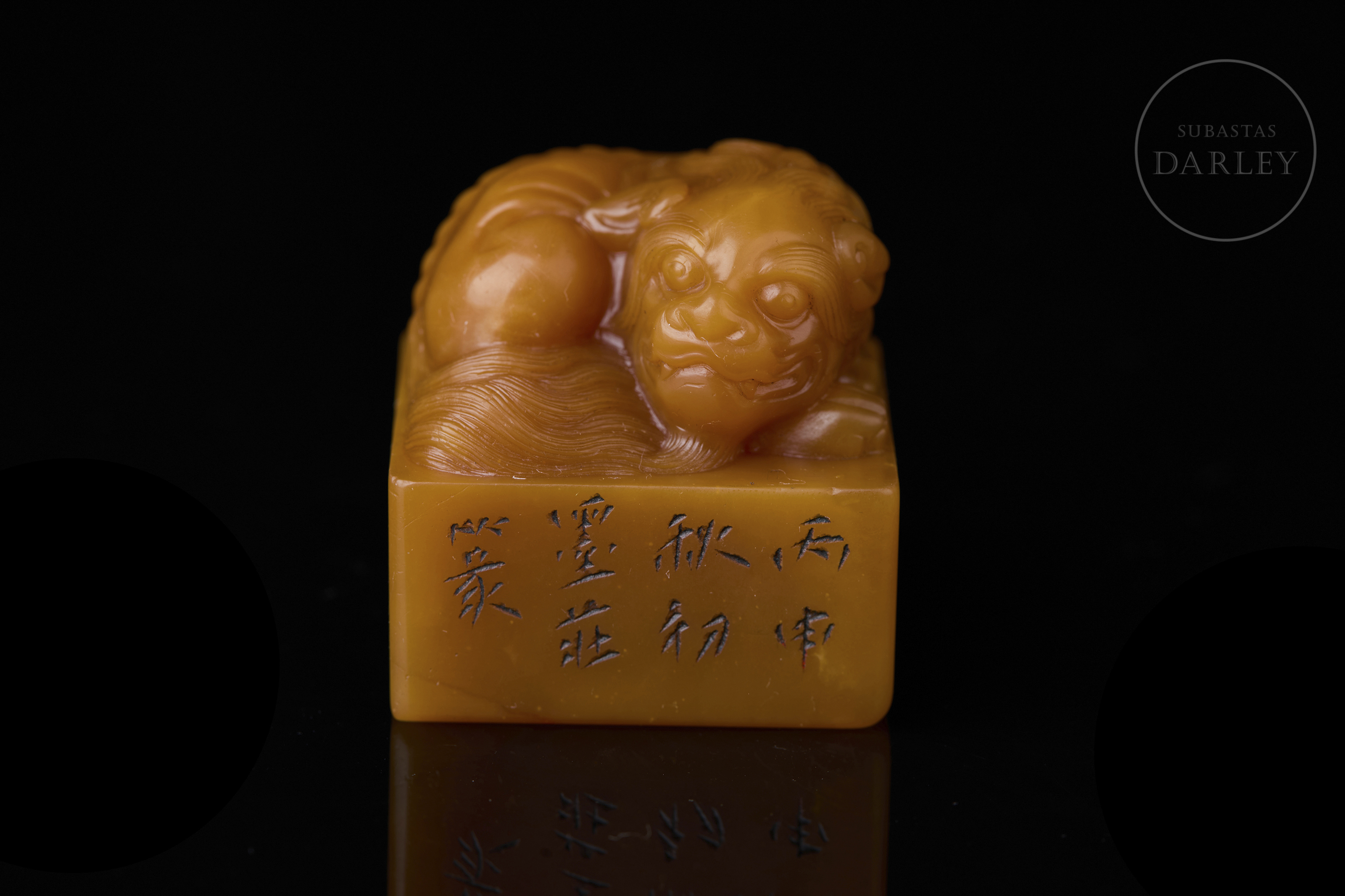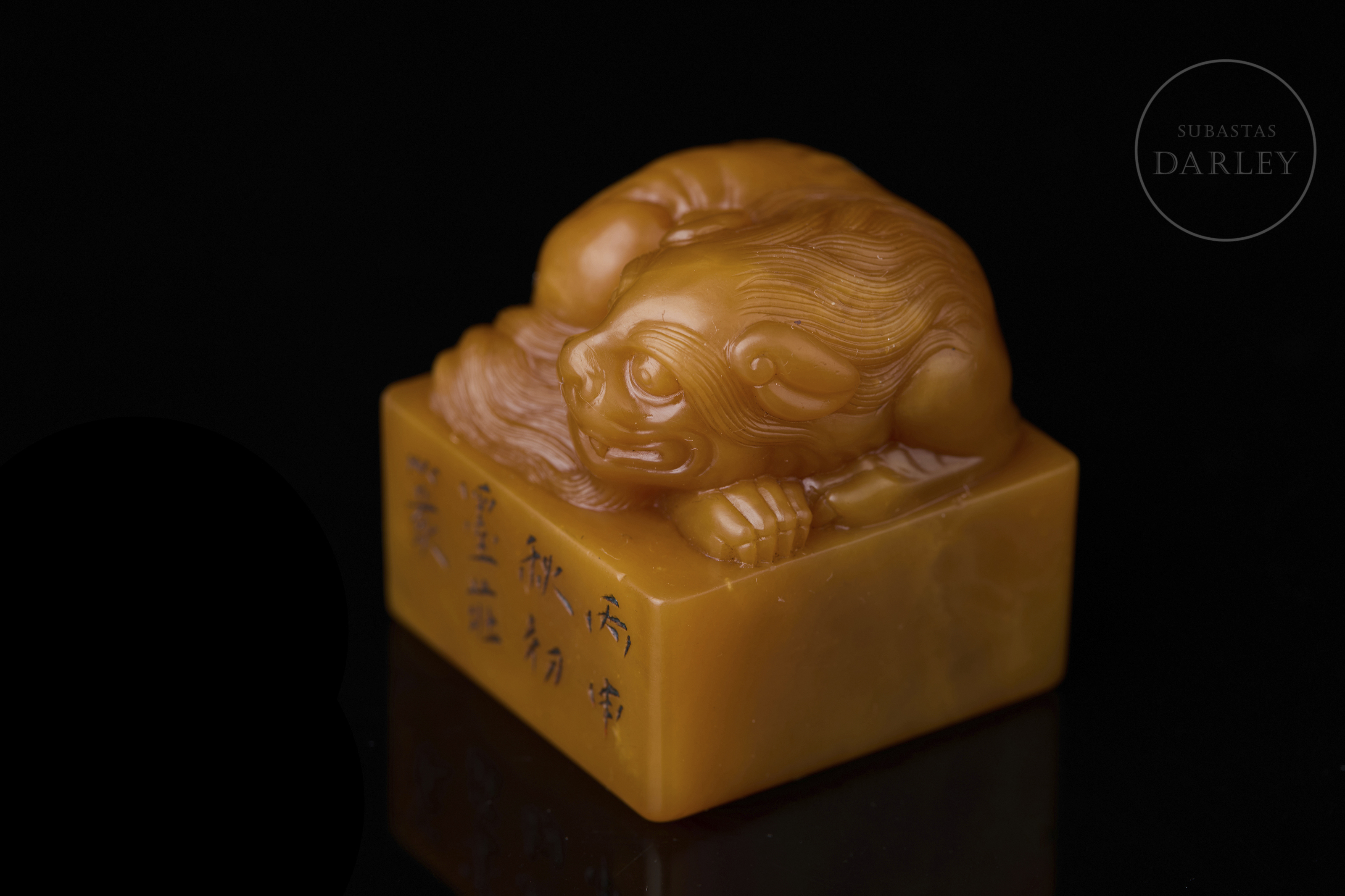 Sello de Shoushan de intensa tonalidad anaranjada. Posee una base cuadrangular rematada por un león místico recostado, con el cuerpo enroscado, la cabeza gacha y minuciosos detalles incisos que dibujan la melena rizada, la potente musculatura y la expresión serena. En una de las caras se aprecia una inscripción incisa. La base contiene una inscripción para estampado con restos de pigmento cinabrio. Con peana textil y caja a medida.