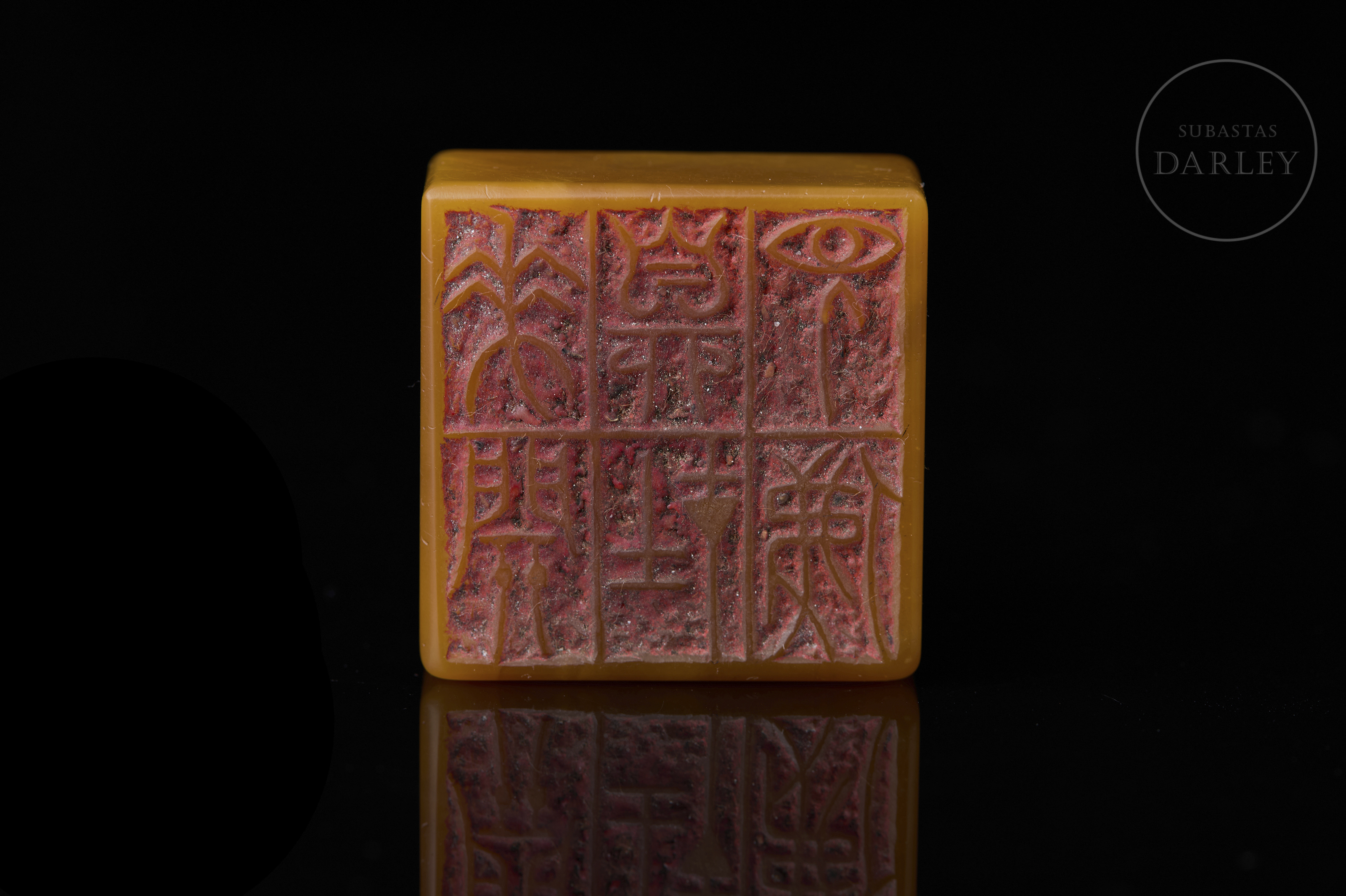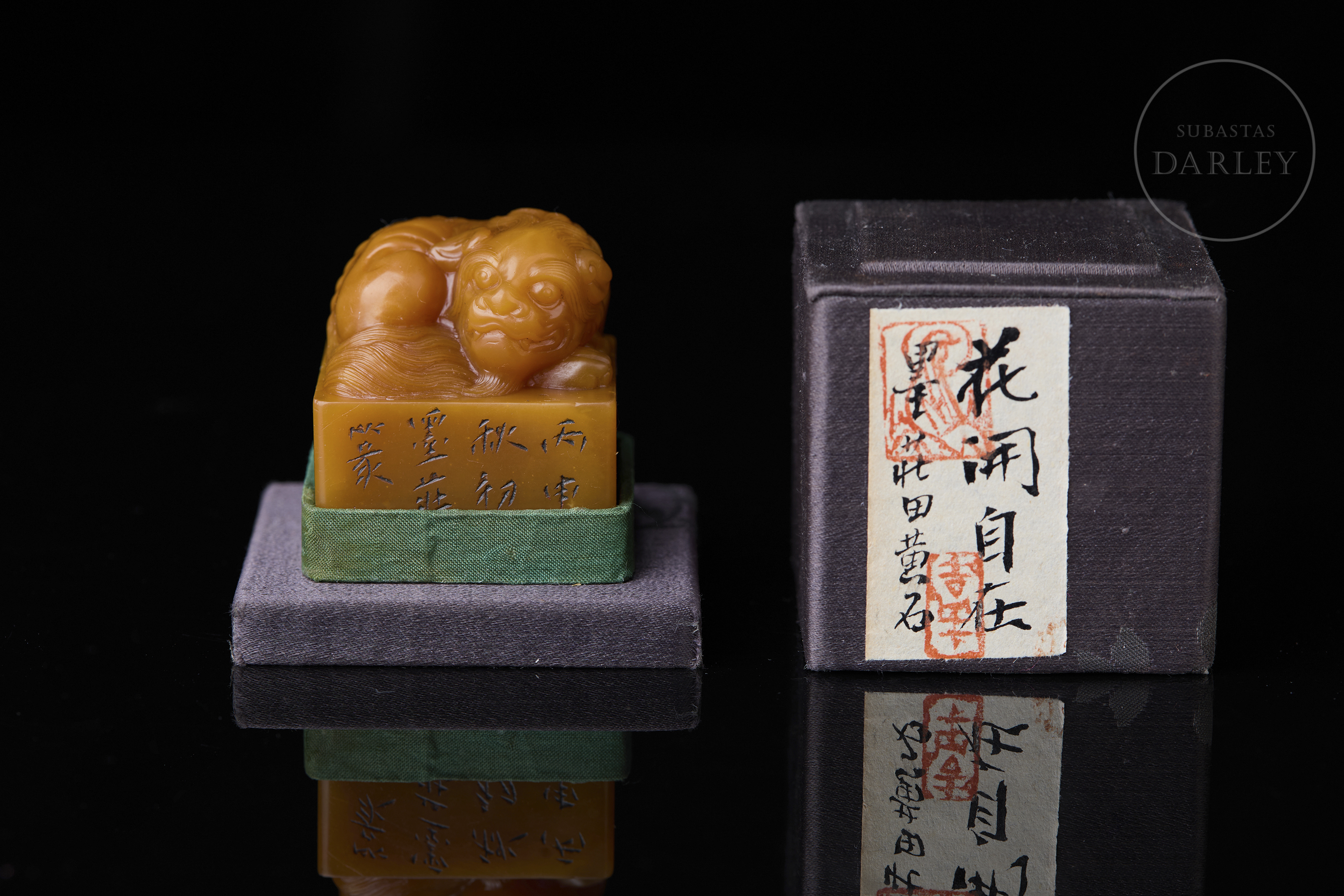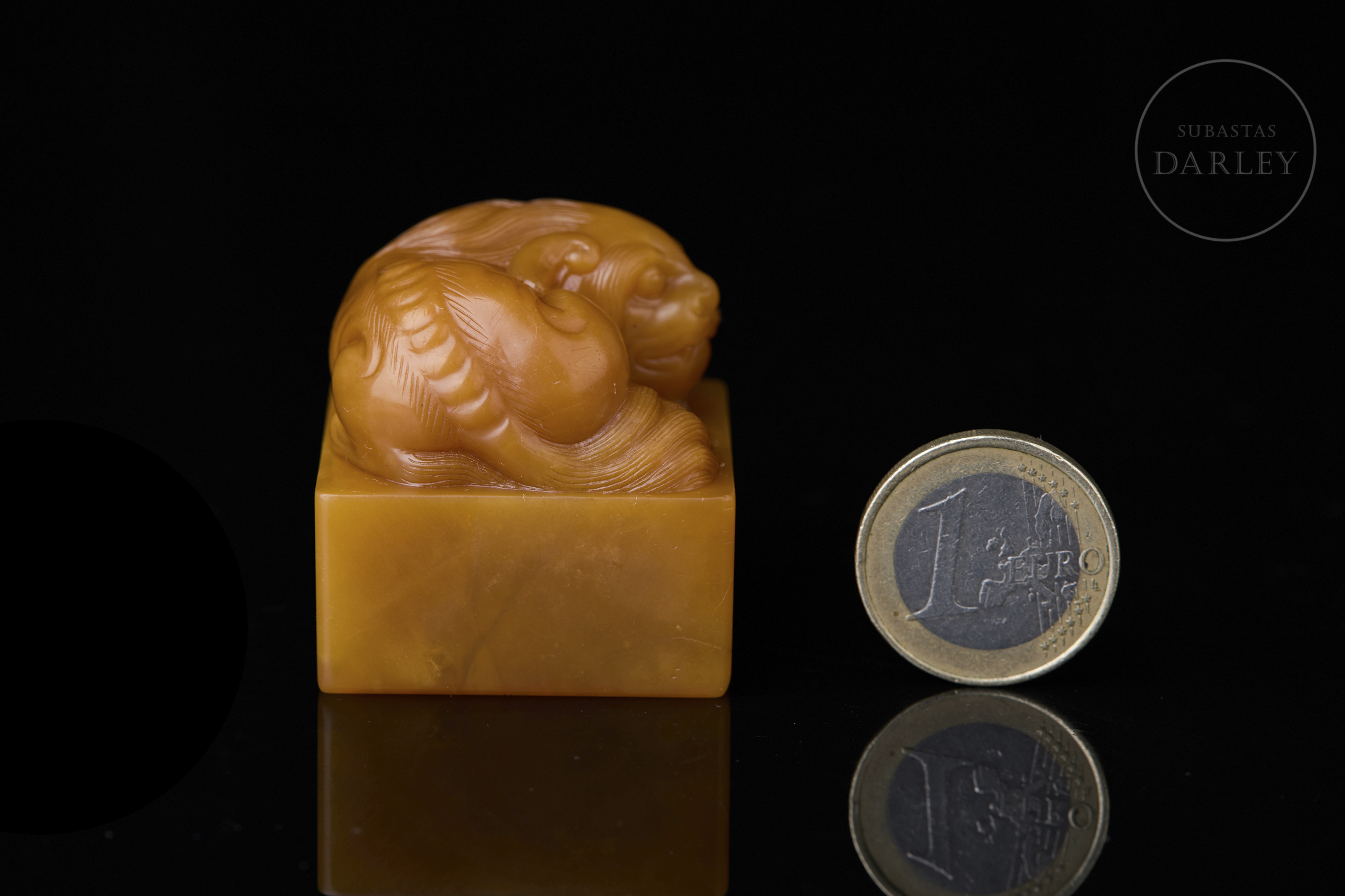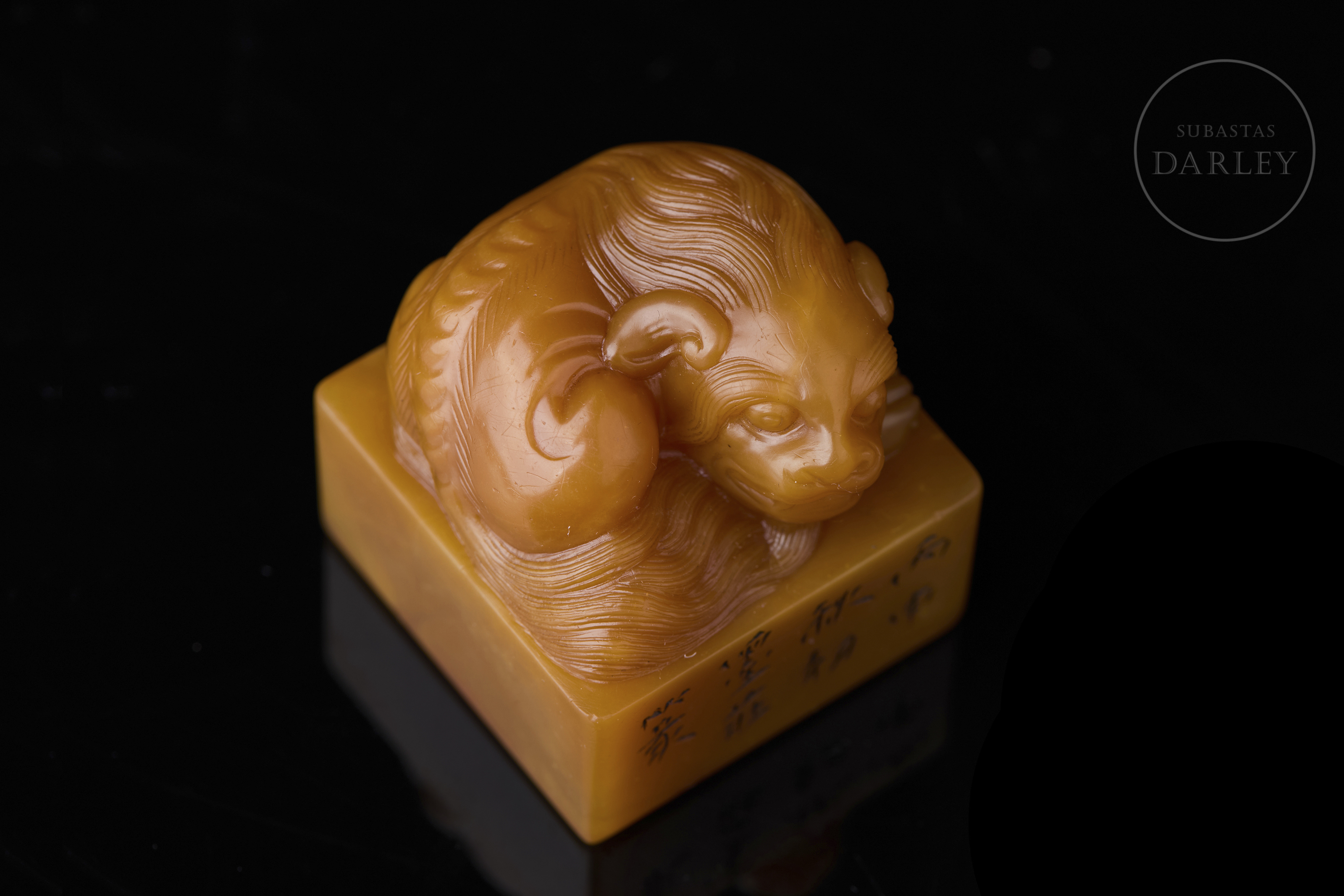 Sello de Shoushan de intensa tonalidad anaranjada. Posee una base cuadrangular rematada por un león místico recostado, con el cuerpo enroscado, la cabeza gacha y minuciosos detalles incisos que dibujan la melena rizada, la potente musculatura y la expresión serena. En una de las caras se aprecia una inscripción incisa. La base contiene una inscripción para estampado con restos de pigmento cinabrio. Con peana textil y caja a medida.