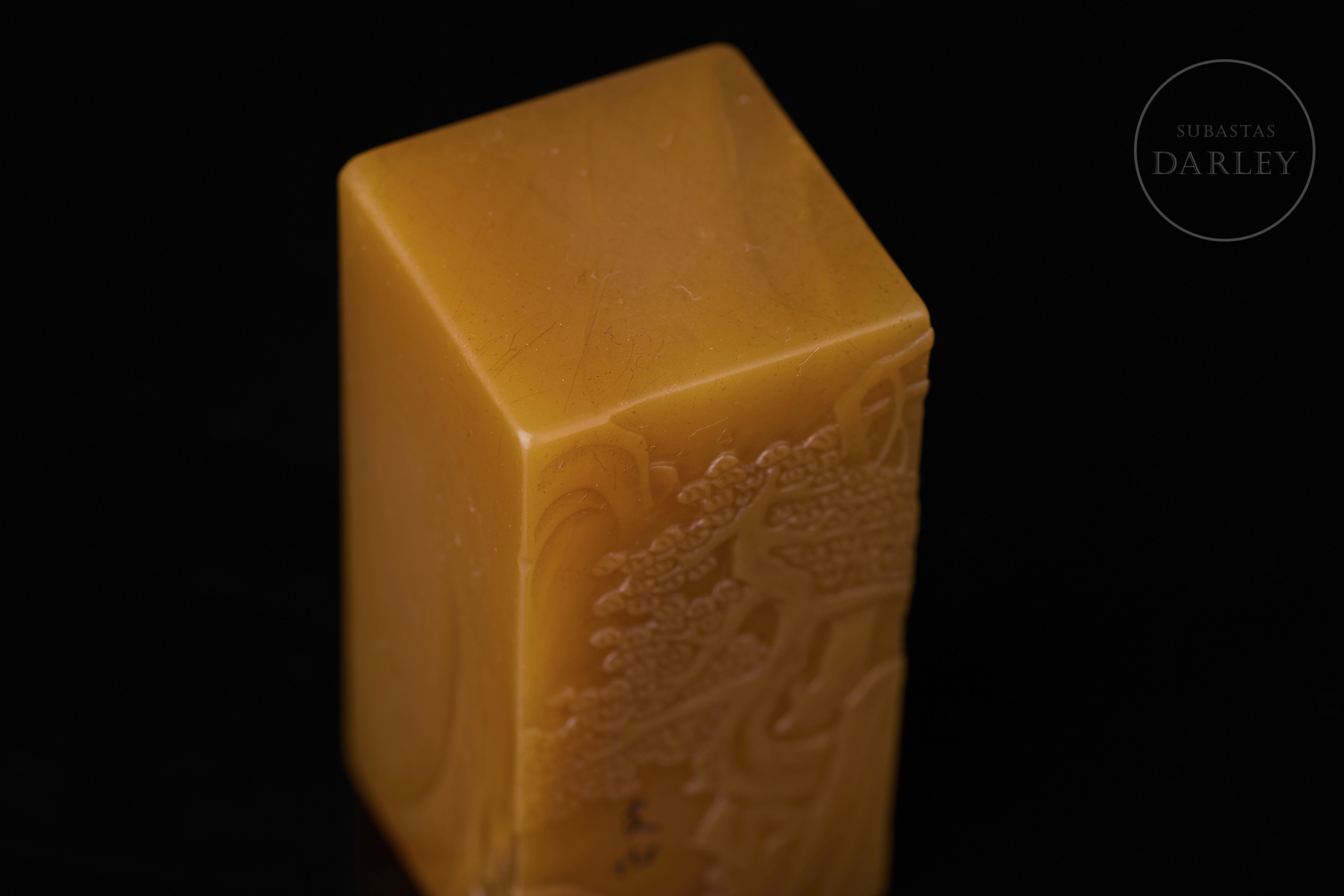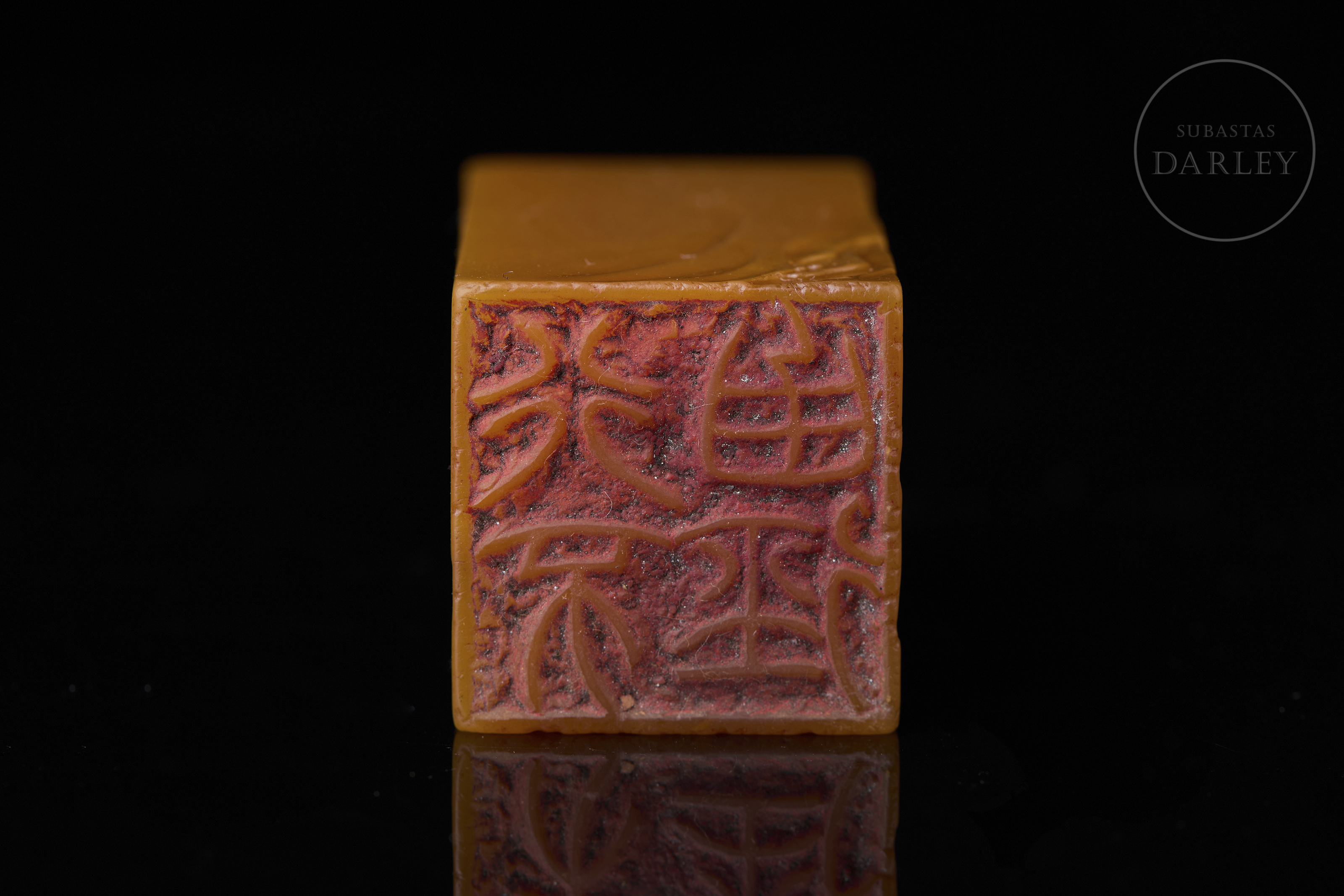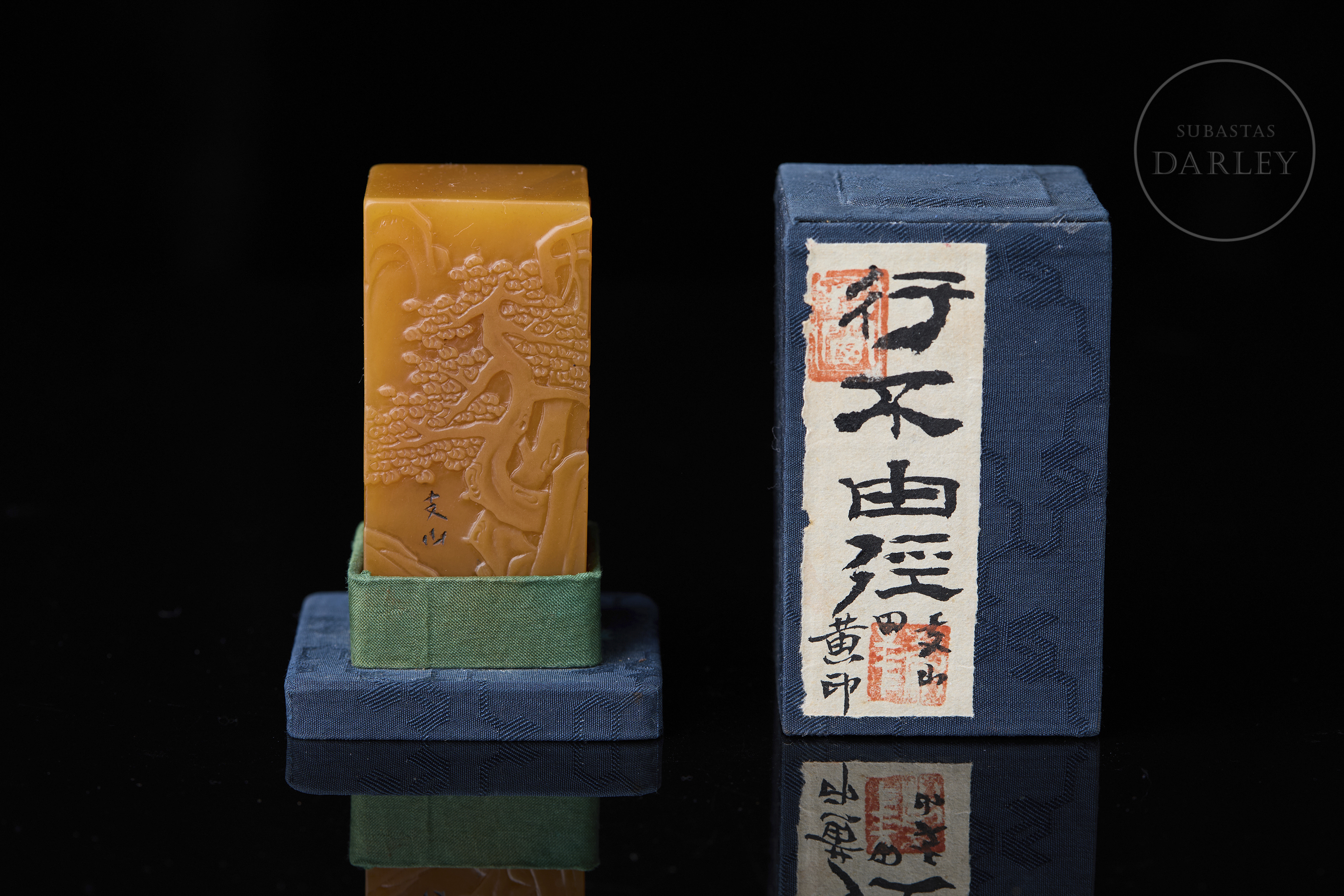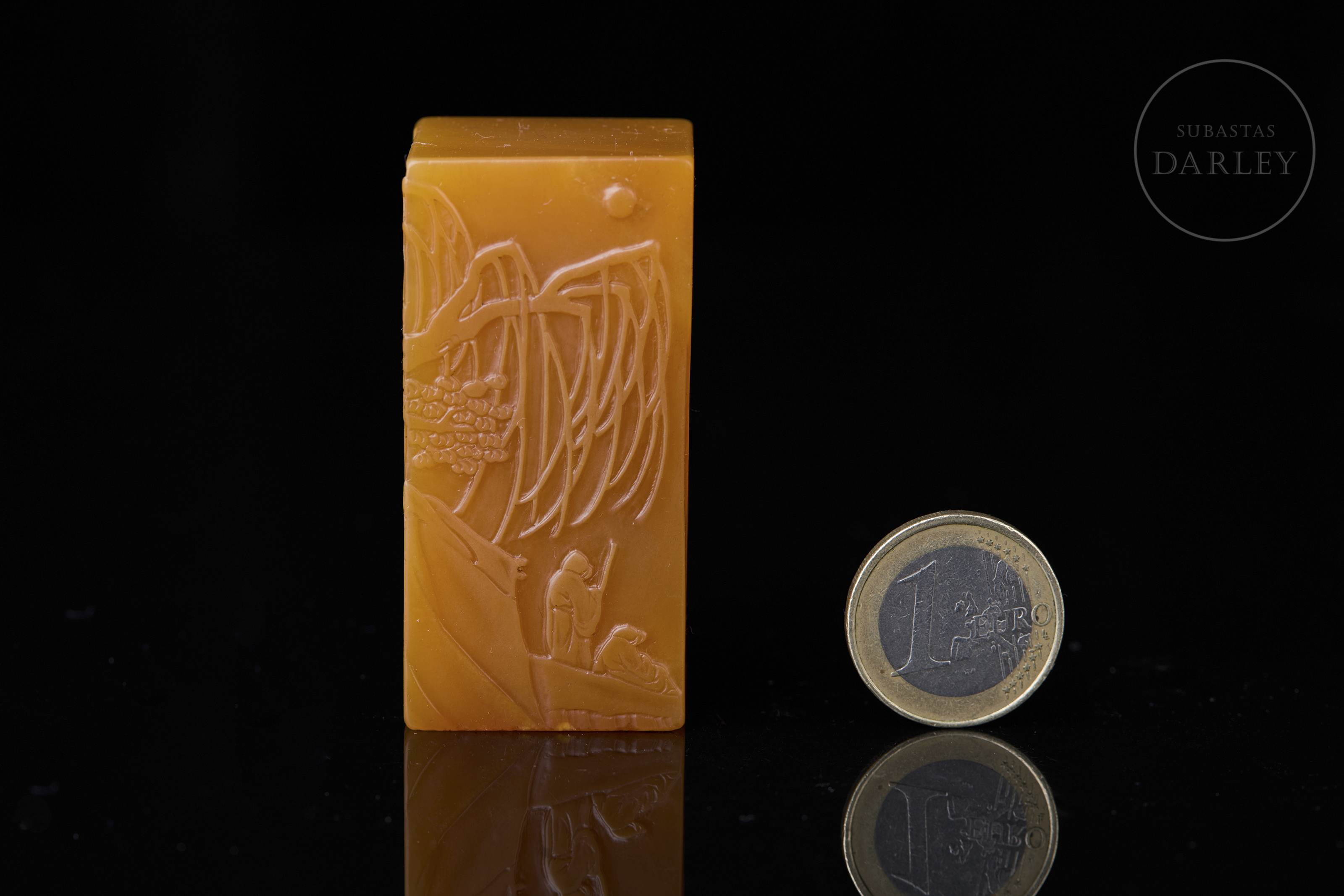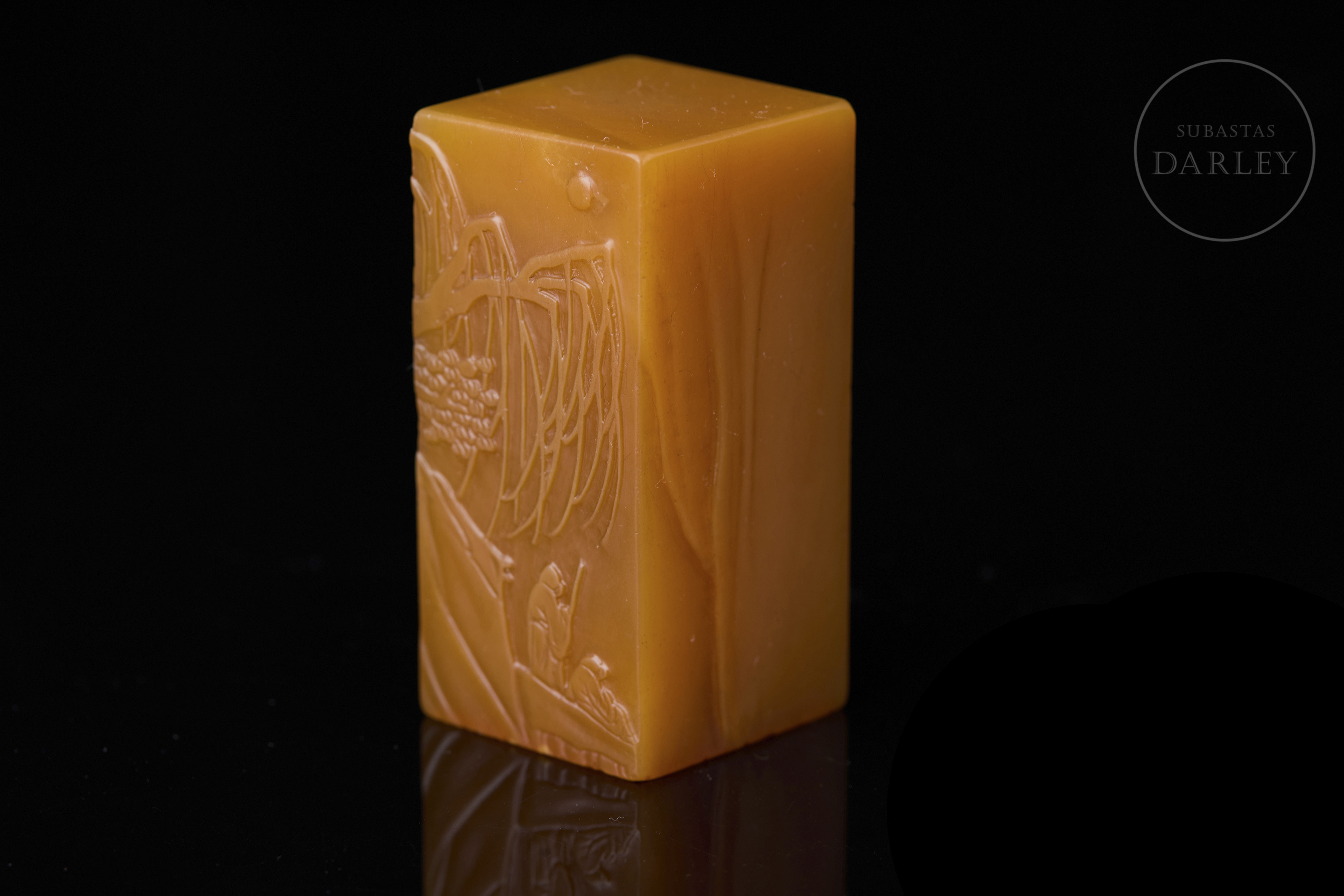 Sello de piedra Shoushan de una tonalidad anaranjada, tallada en un bloque rectangular de remate liso. Está decorada con bajorrelieves que muestran una escena paisajística donde dos sabios conversan bajo la sombra de un árbol, junto a montañas y aves en vuelo. En una de las caras se aprecia una inscripción incisa. La base contiene caracteres grabados con restos de pigmento. Se acompaña de una peana textil y una caja a medida con etiqueta identificativa.