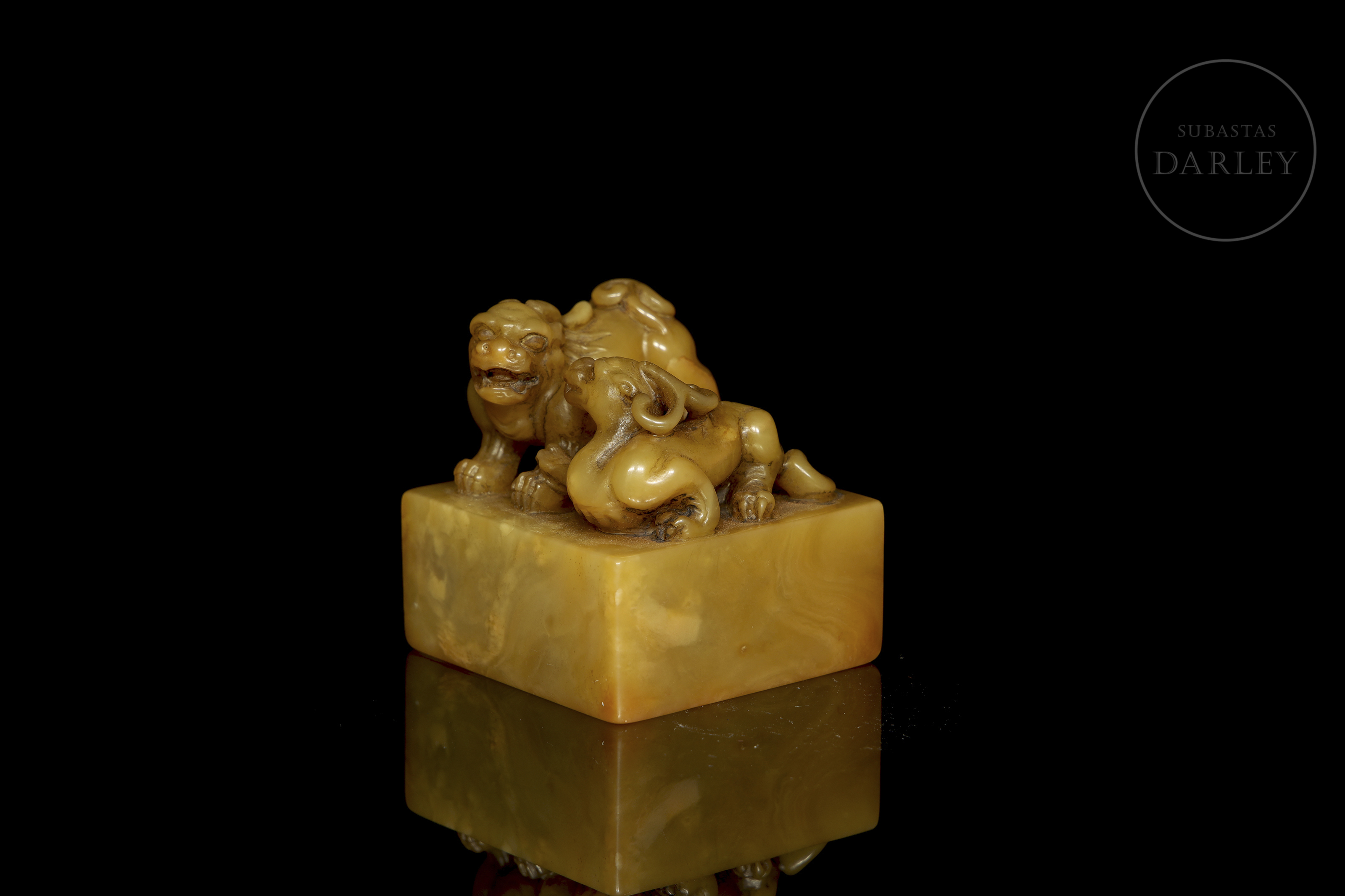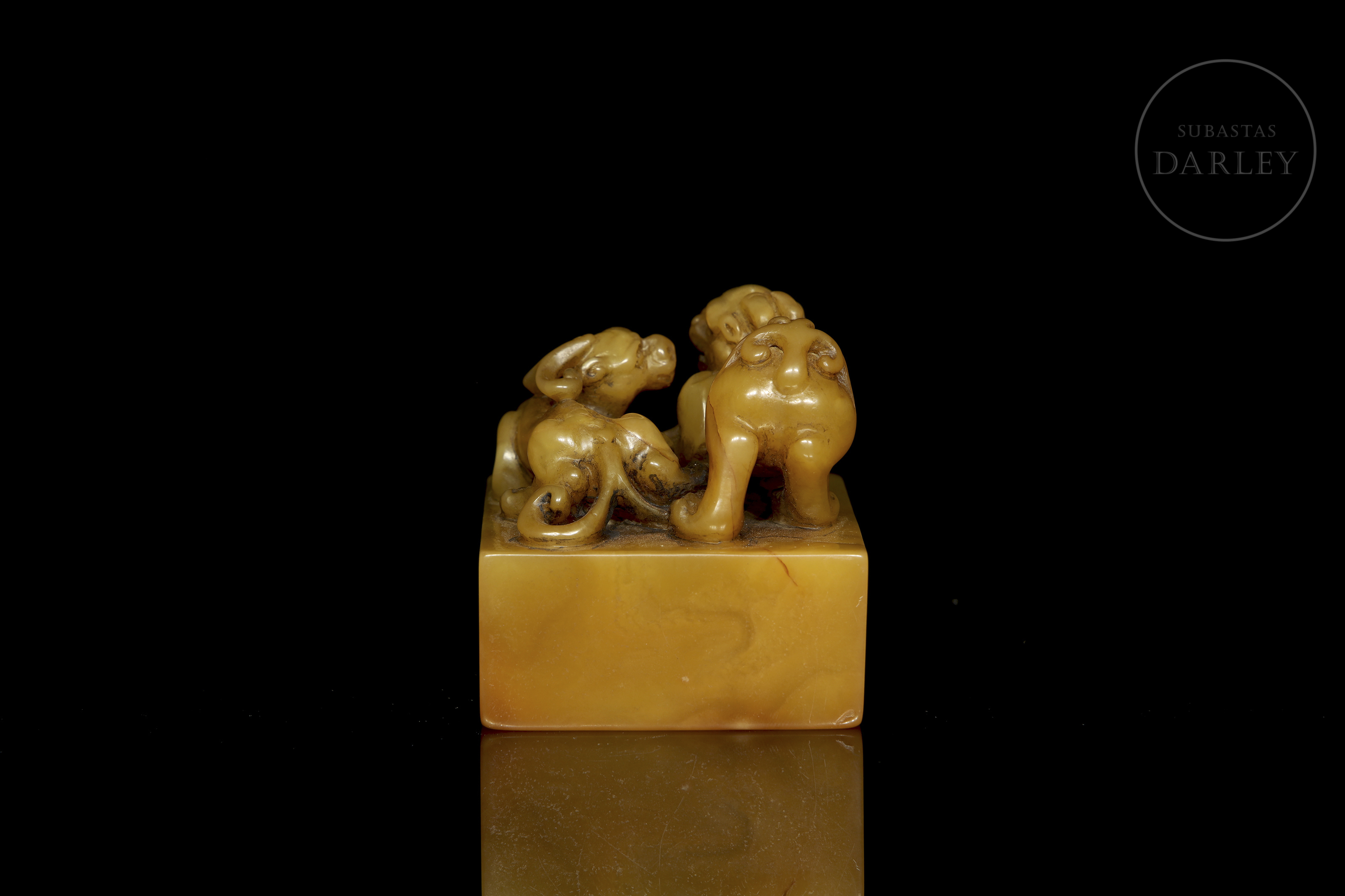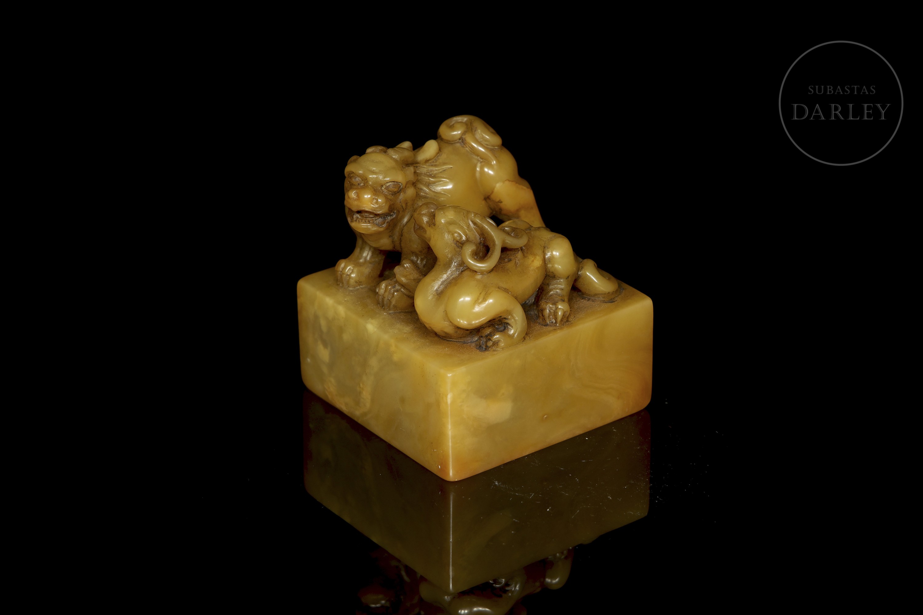 Shoushan de tonalidad ocre con variaciones cromática. Posee un formato cuadrangular de base ancha, rematado por una talla que representa dos bestias míticas en actitud de interacción. Ambas bestias muestran potentes musculaturas, alargadas cornamentas, afiladas garras y expresión feroz. La base contiene una inscripción grabada para su estampa, con restos de pigmento rojo. Dinastía Qing (1644–1912)