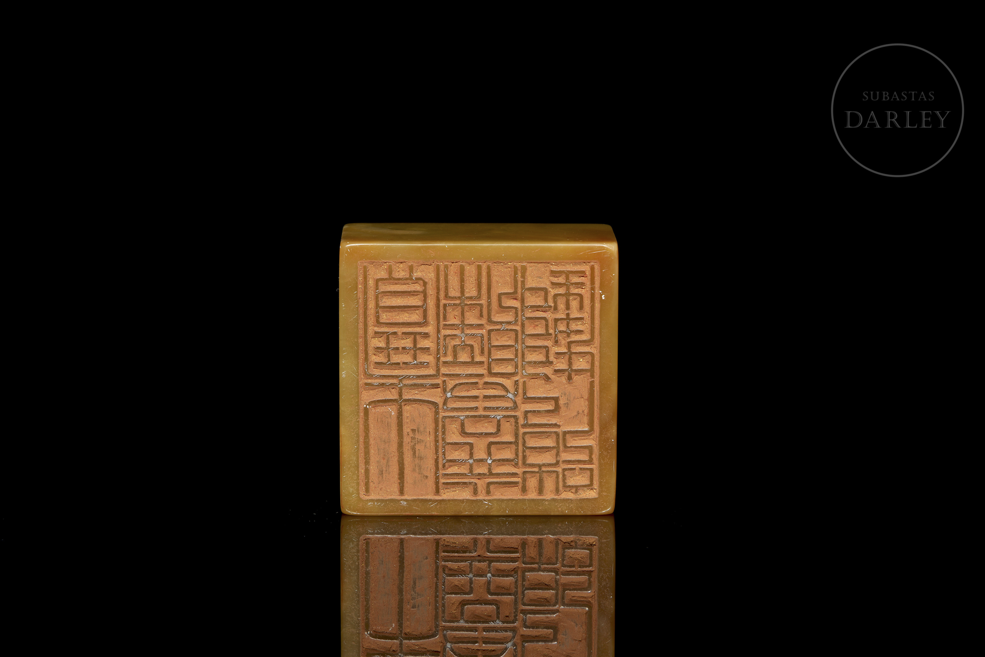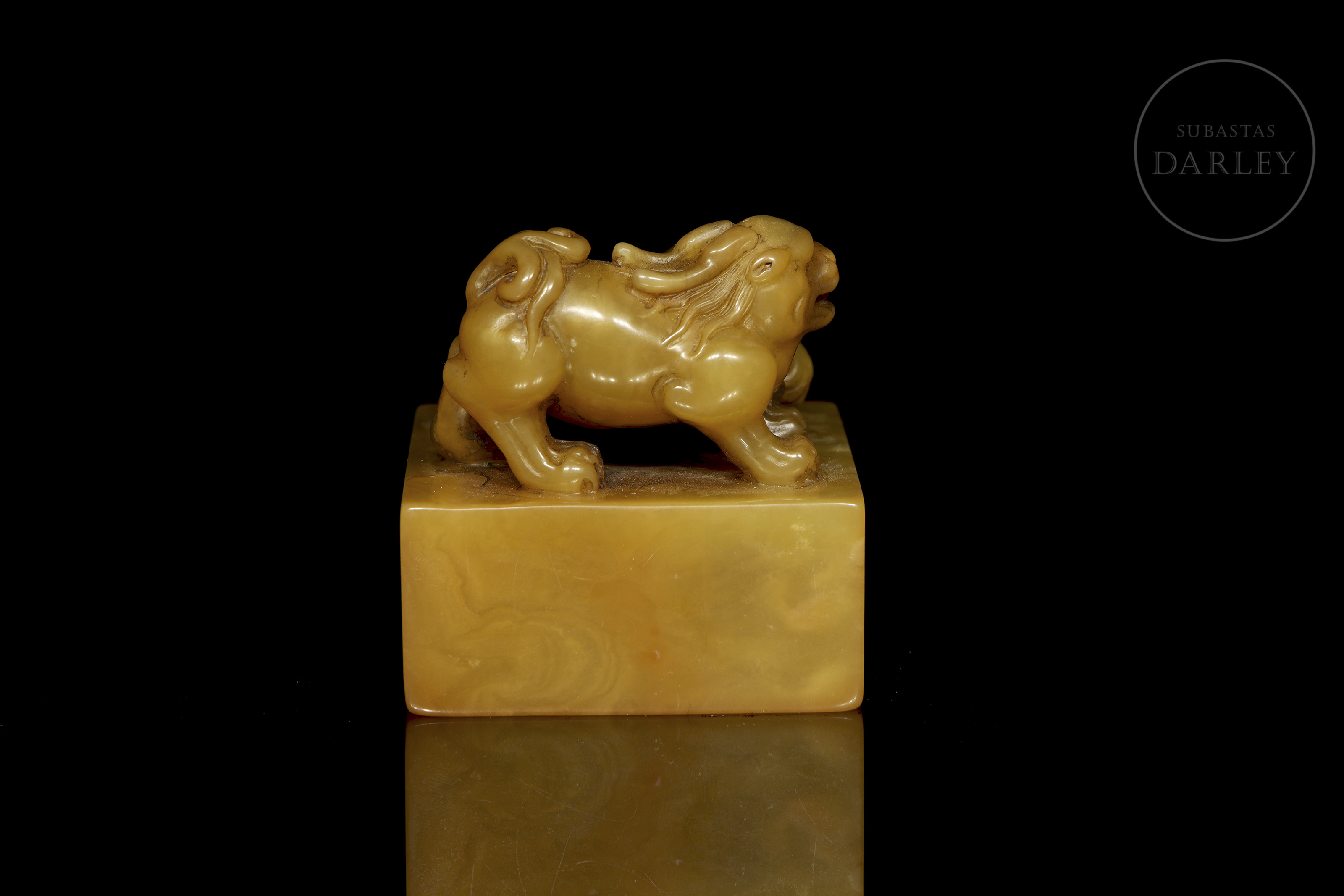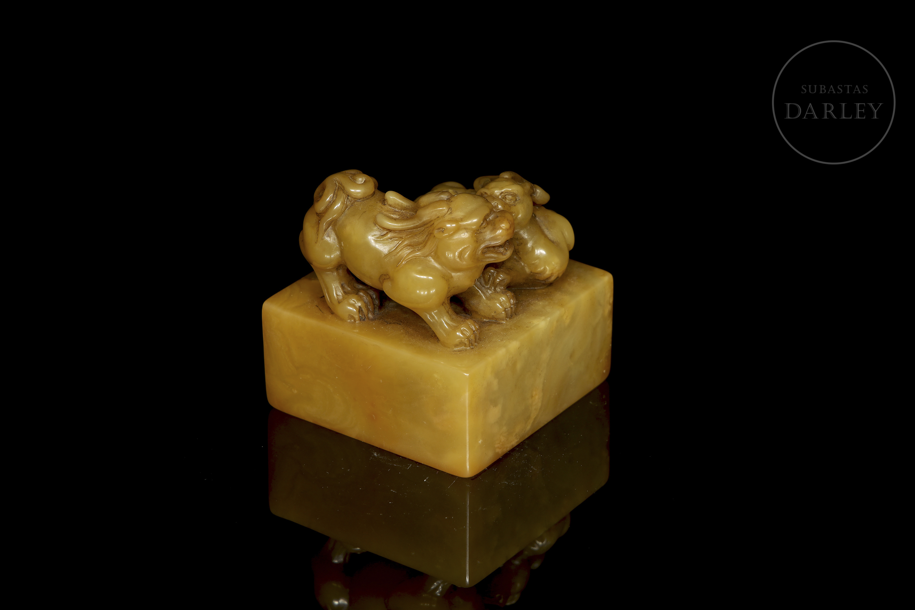 Shoushan de tonalidad ocre con variaciones cromática. Posee un formato cuadrangular de base ancha, rematado por una talla que representa dos bestias míticas en actitud de interacción. Ambas bestias muestran potentes musculaturas, alargadas cornamentas, afiladas garras y expresión feroz. La base contiene una inscripción grabada para su estampa, con restos de pigmento rojo. Dinastía Qing (1644–1912)