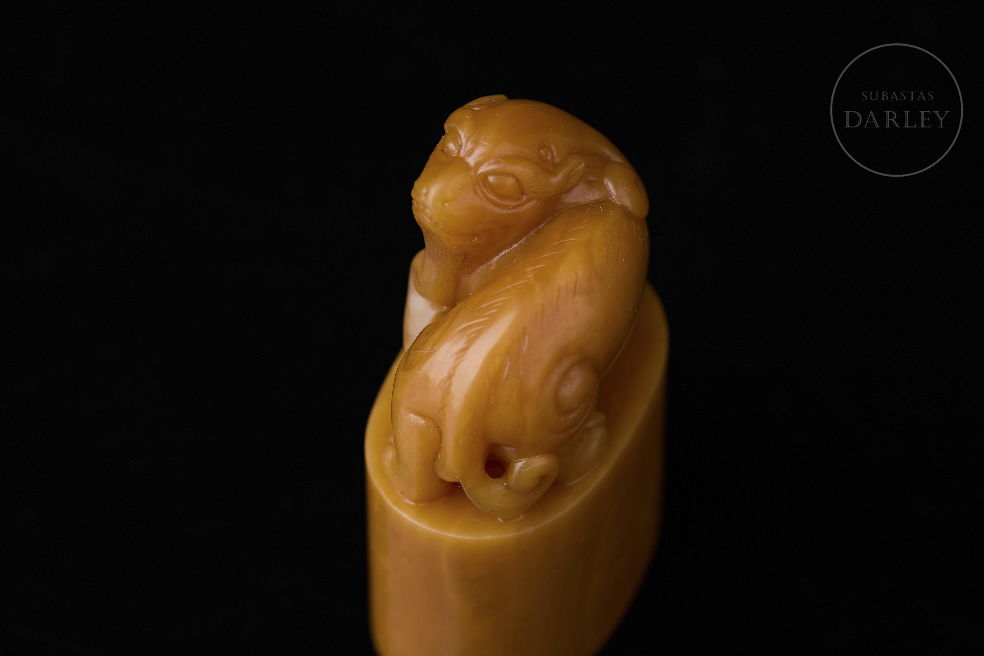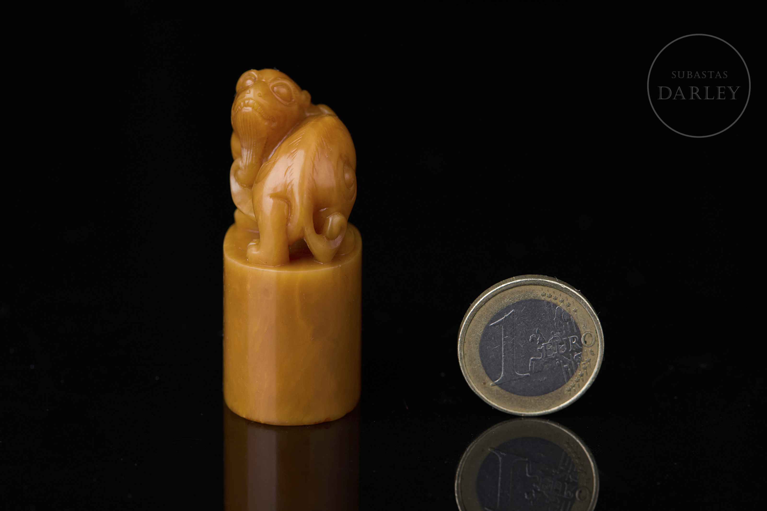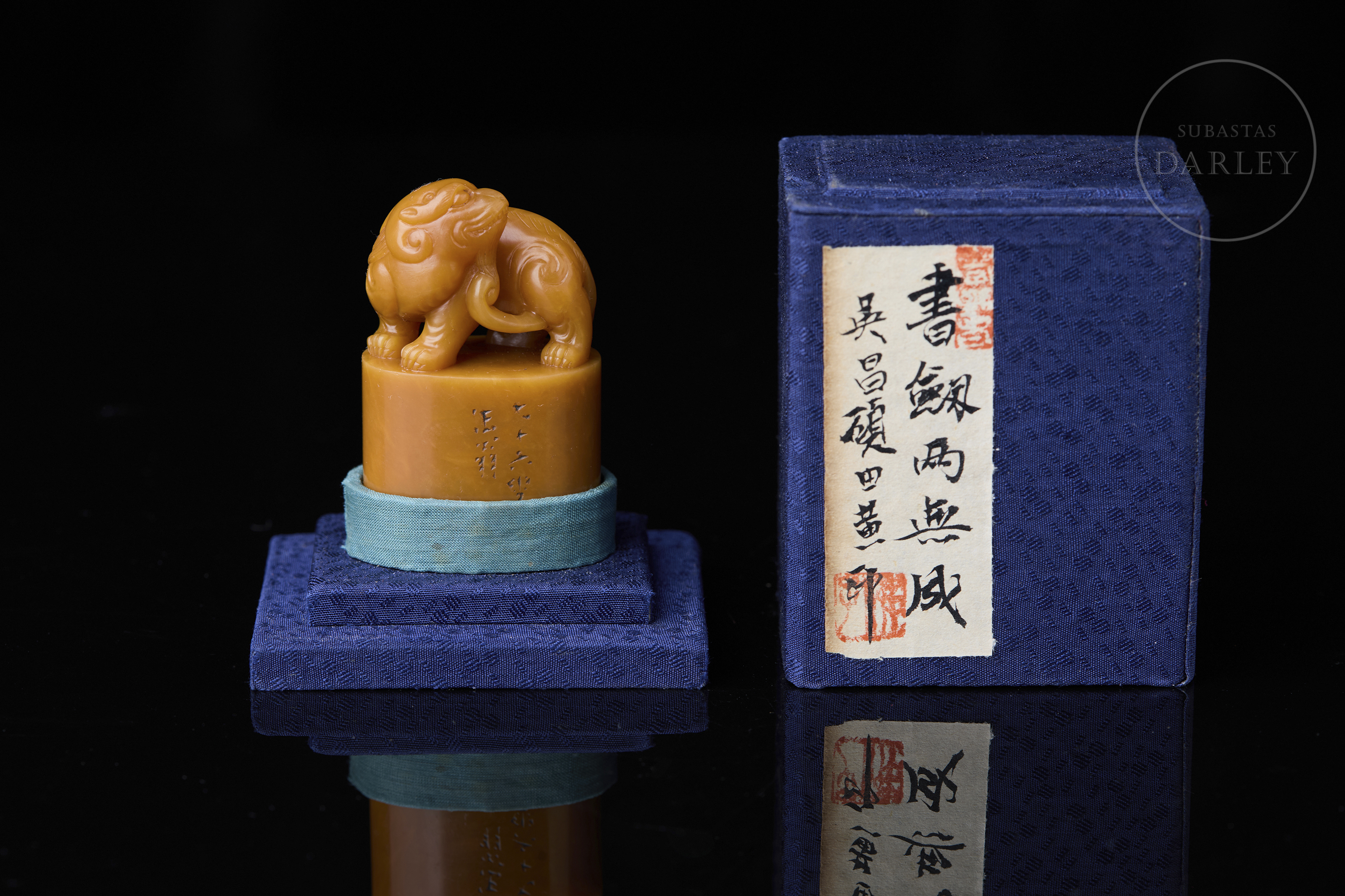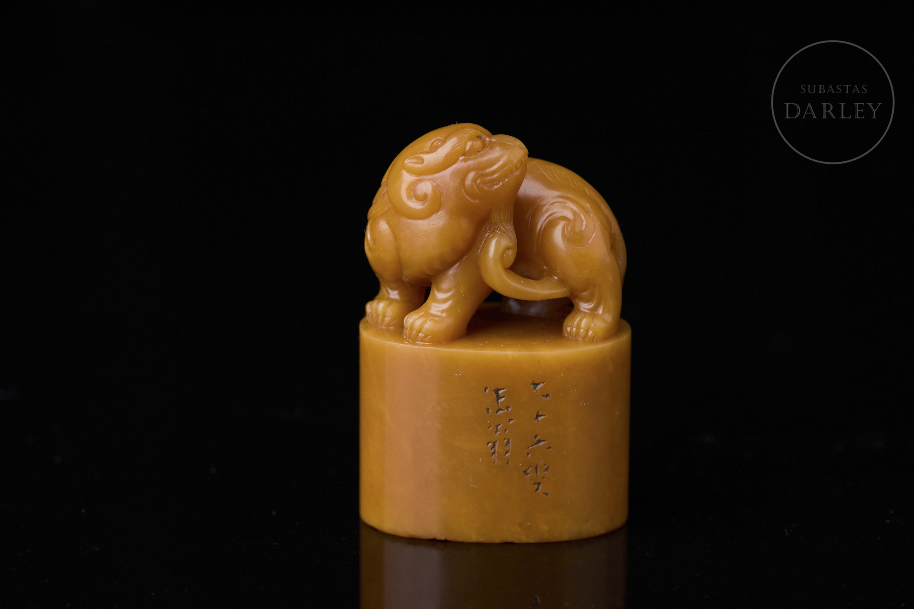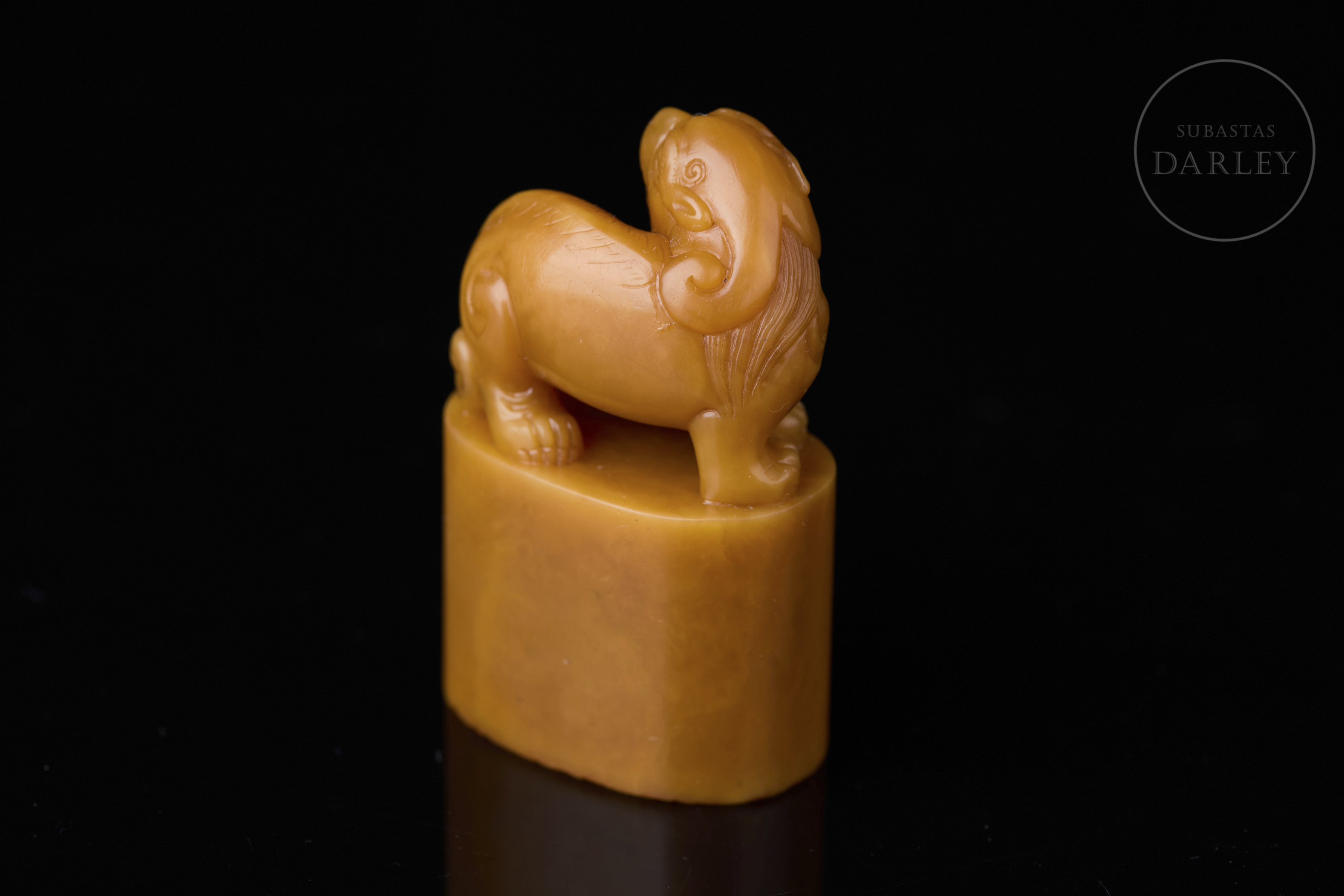 Piedra Shoushan de tonalidad amarillo miel. La base posee un perfil elíptico rematado por la figura de una bestia de carácter leonino con la cabeza vuelta. Muestra detalles minuciosos en la melena, cara y musculatura, definidos mediante incisiones. En la base se aprecia una inscripción incisa y entintada. La base contiene caracteres en relieve para su estampado. Con peana textil y caja a medida. Dinastía Qing (1644–1912).