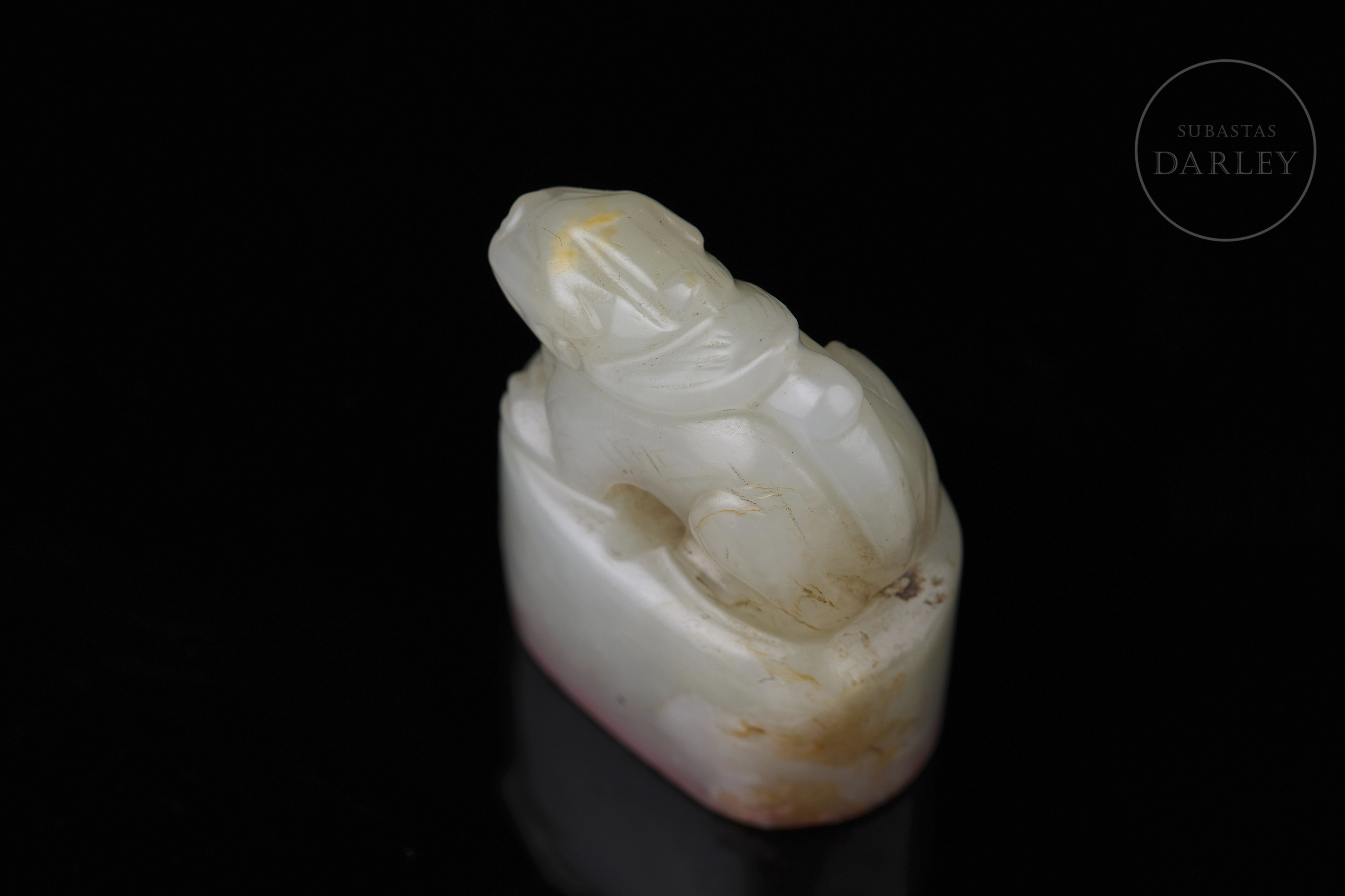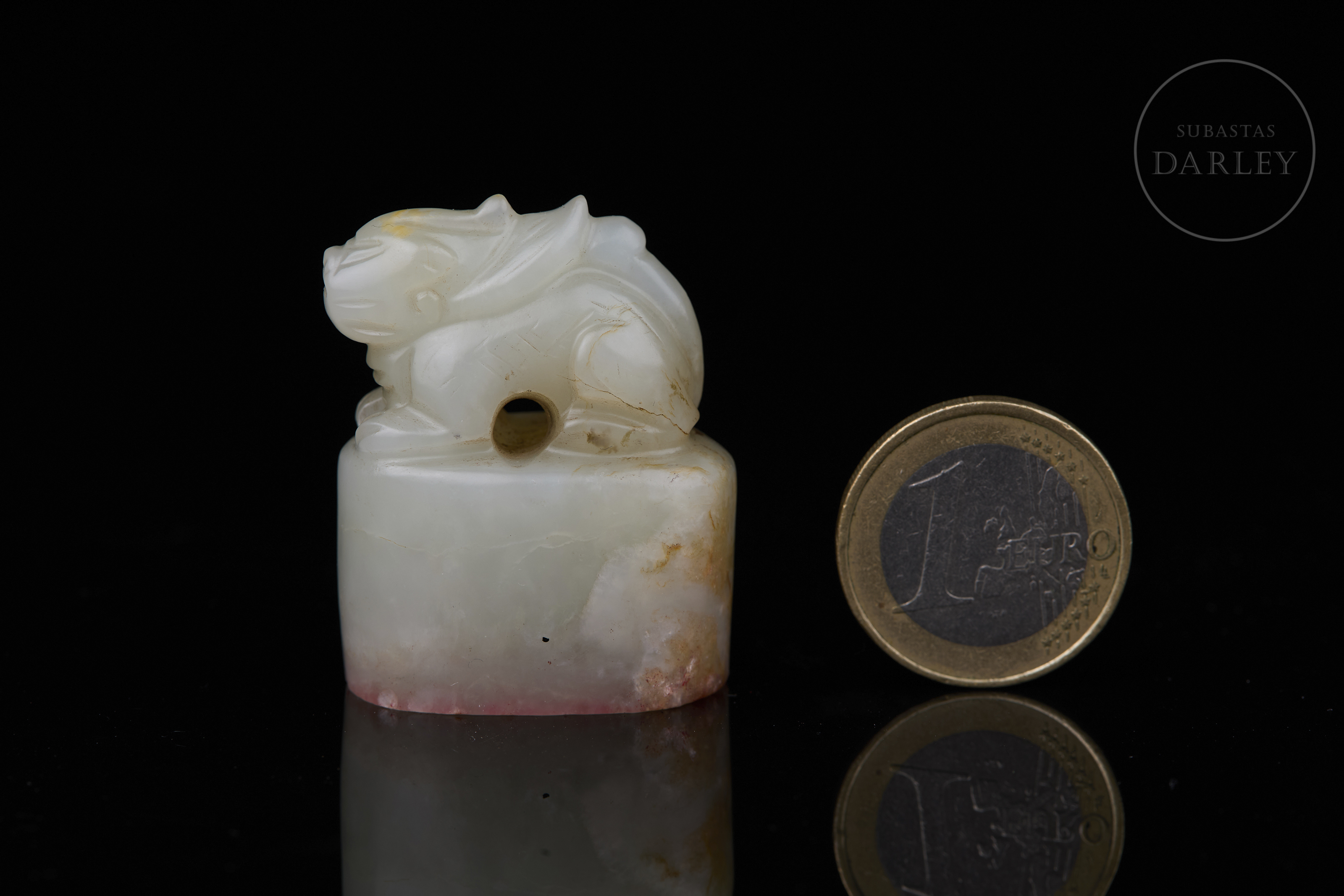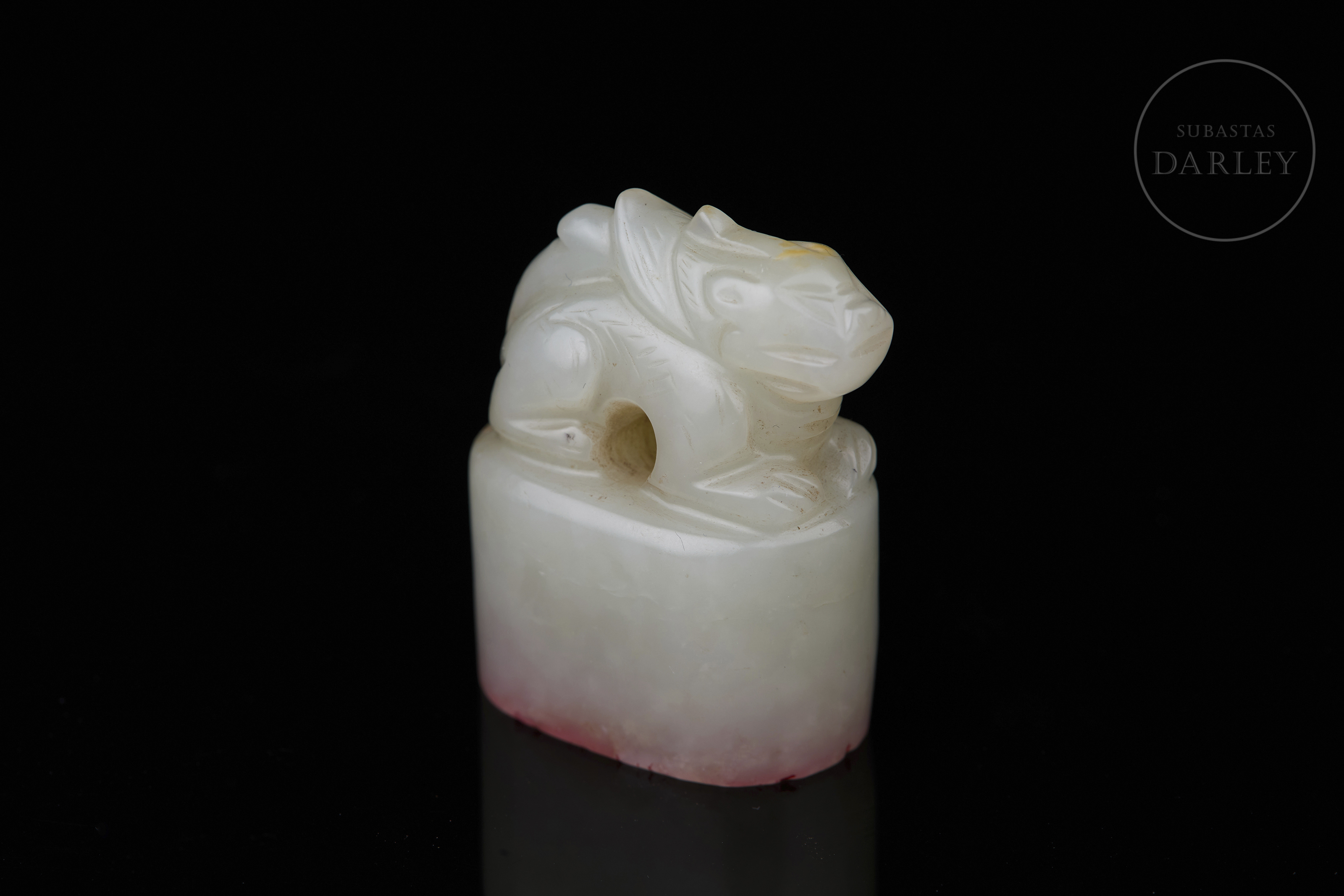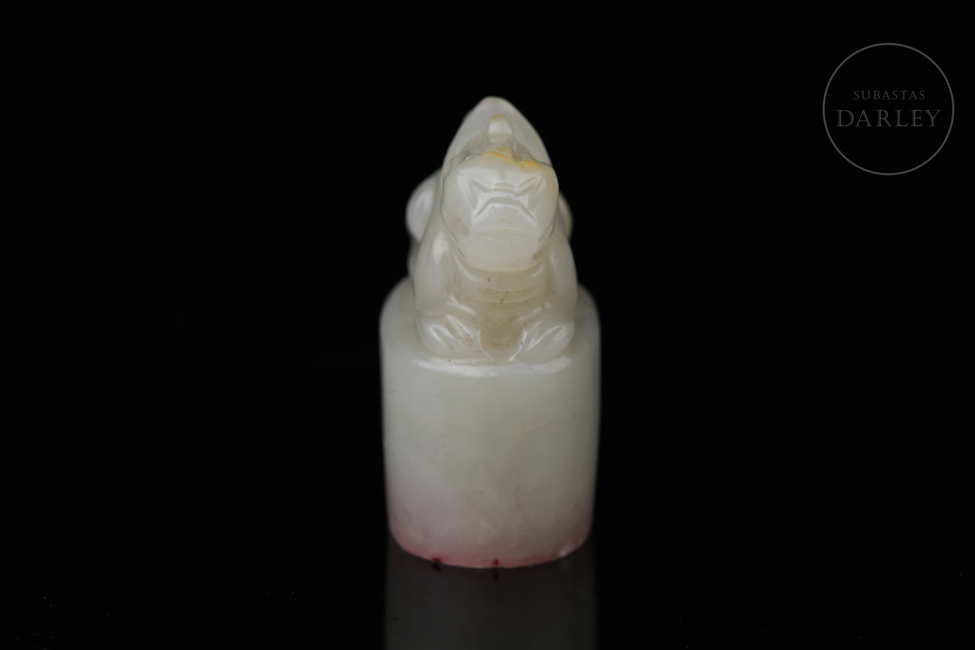 Sello oval de jade blanco de Hetian "Bestia", dinastía Qing